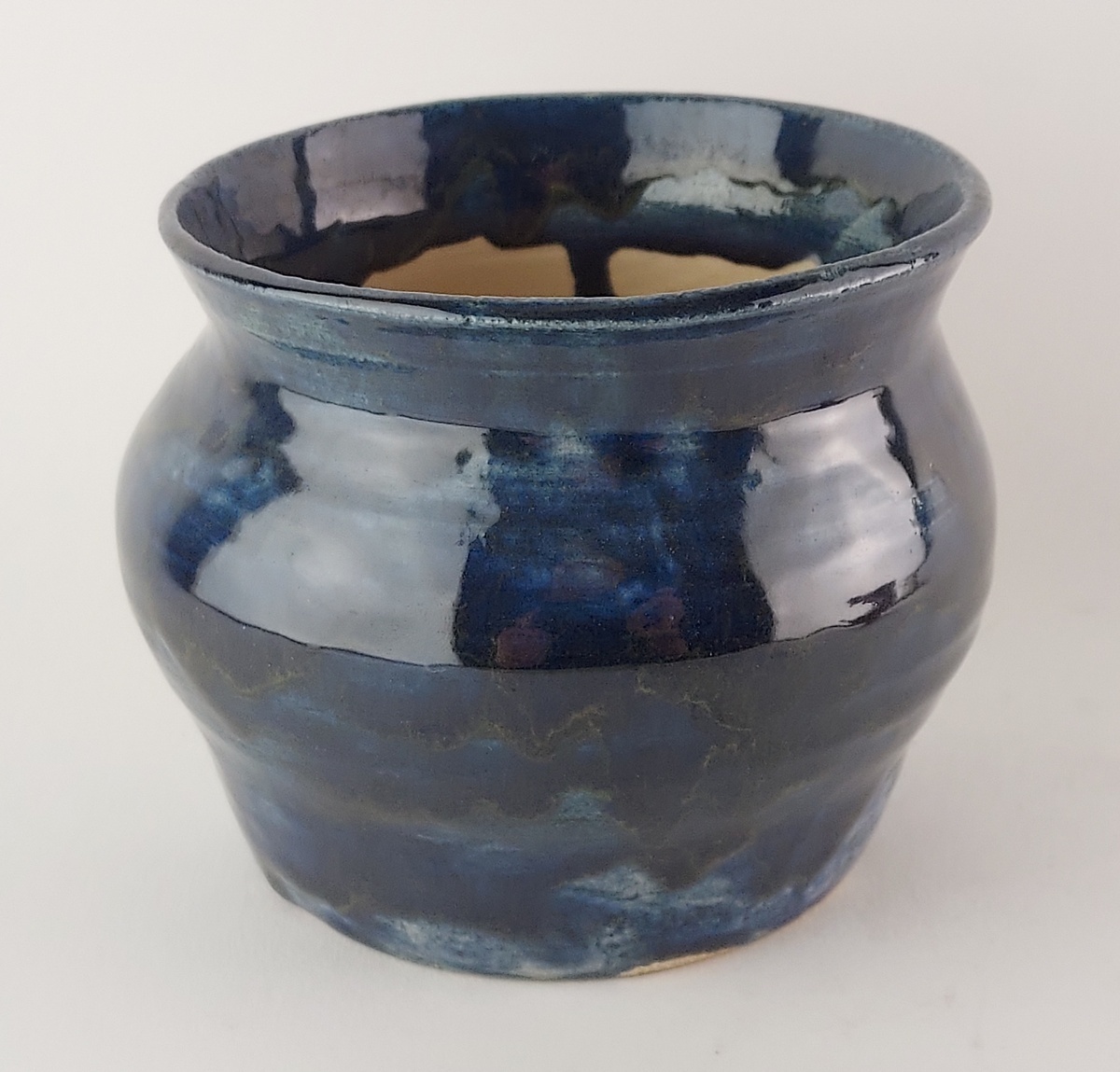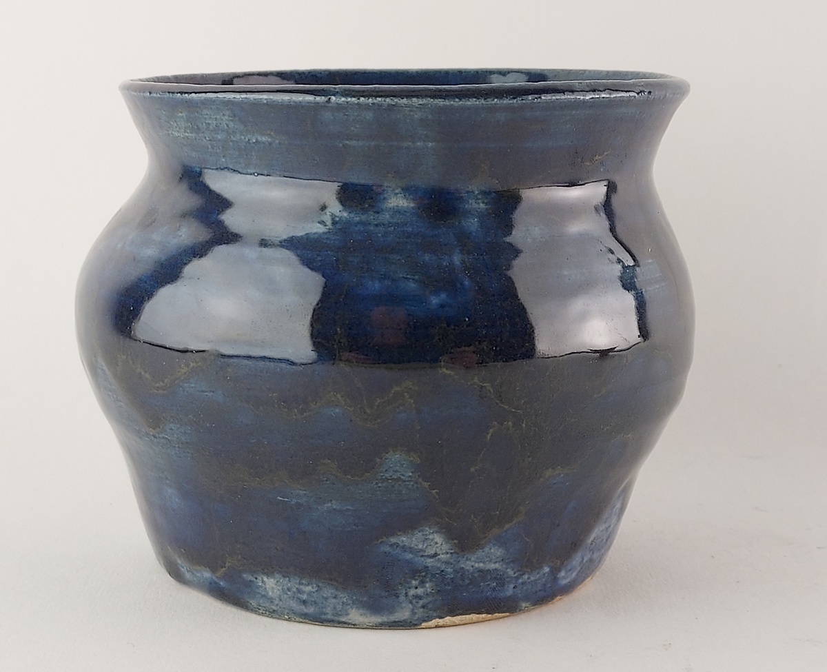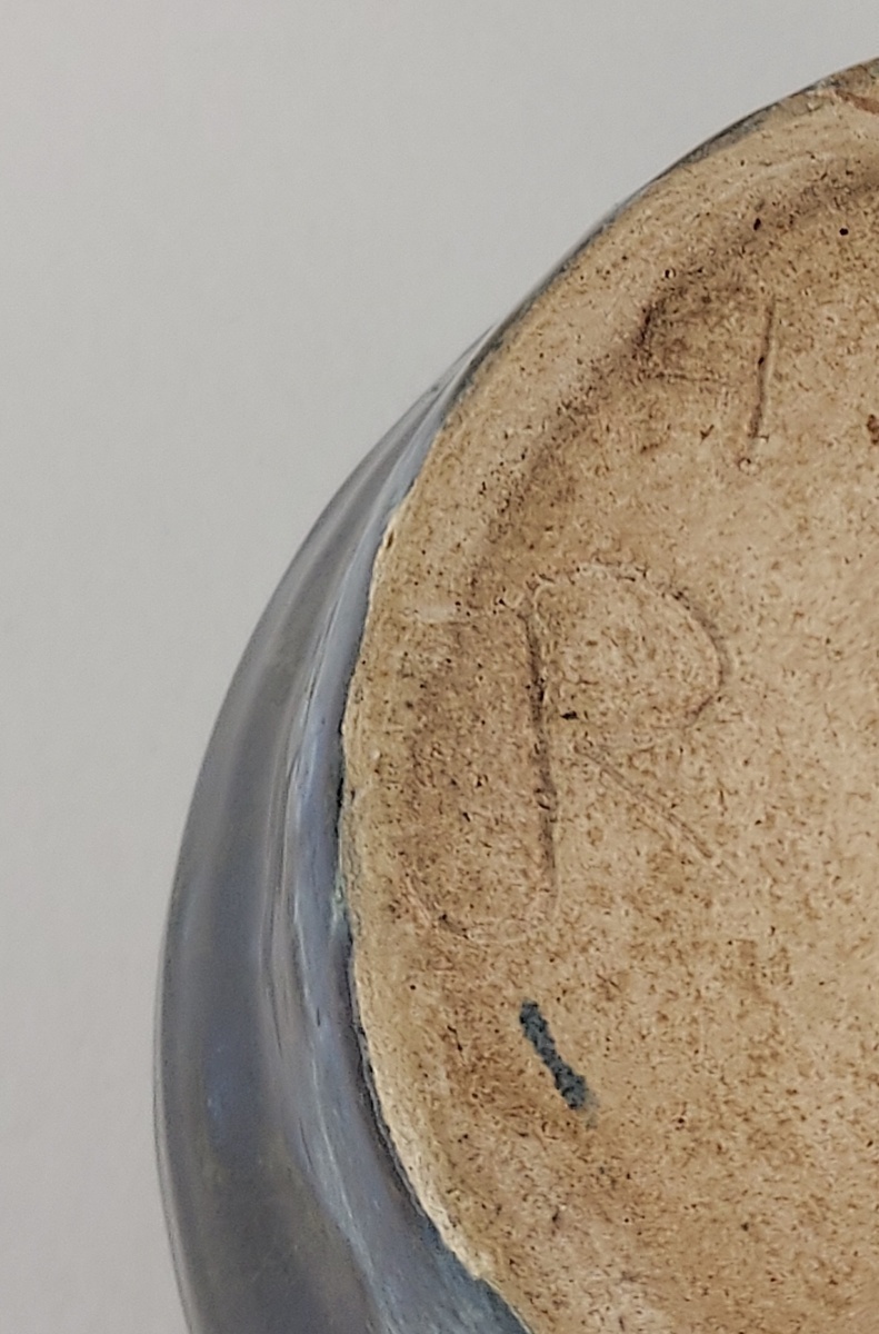 Met donkerblauwe glazuur. Onderzijde met ingekrast monogram.