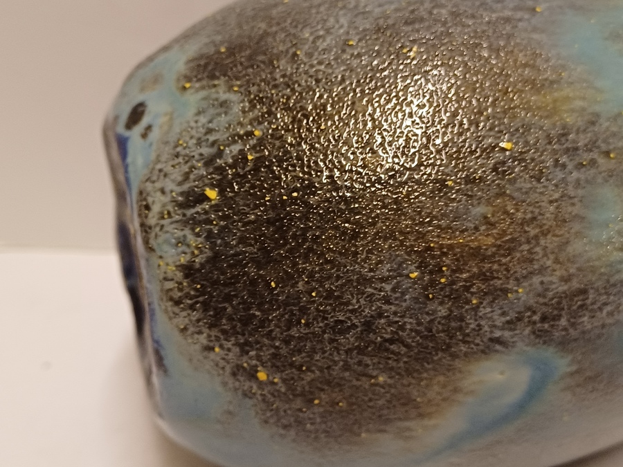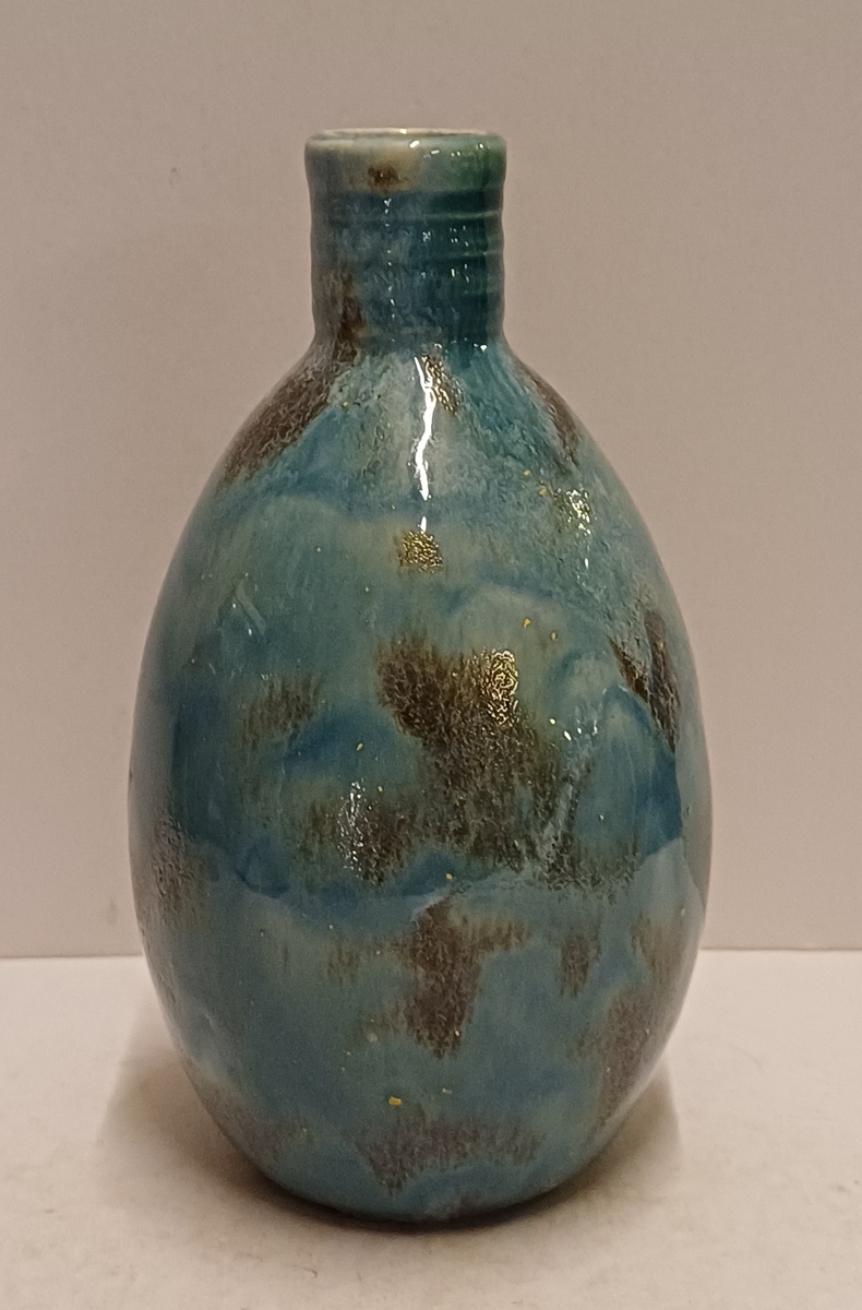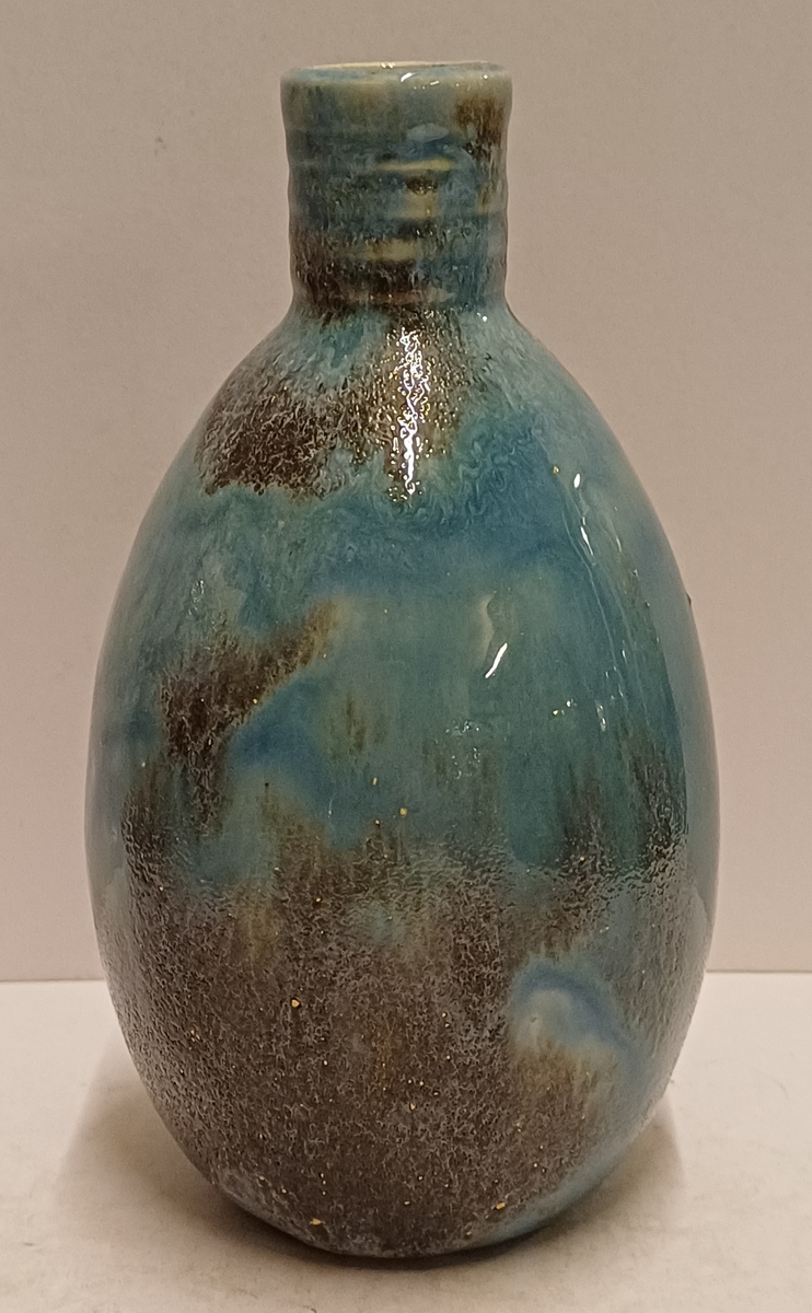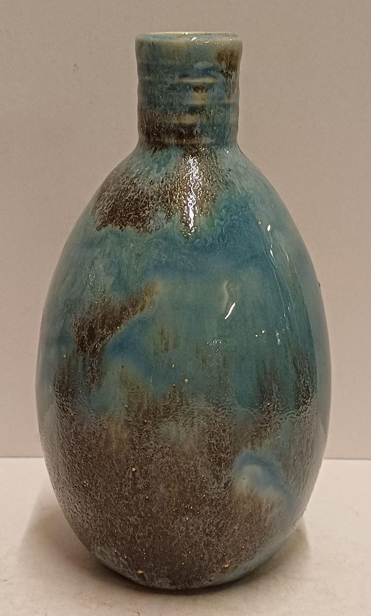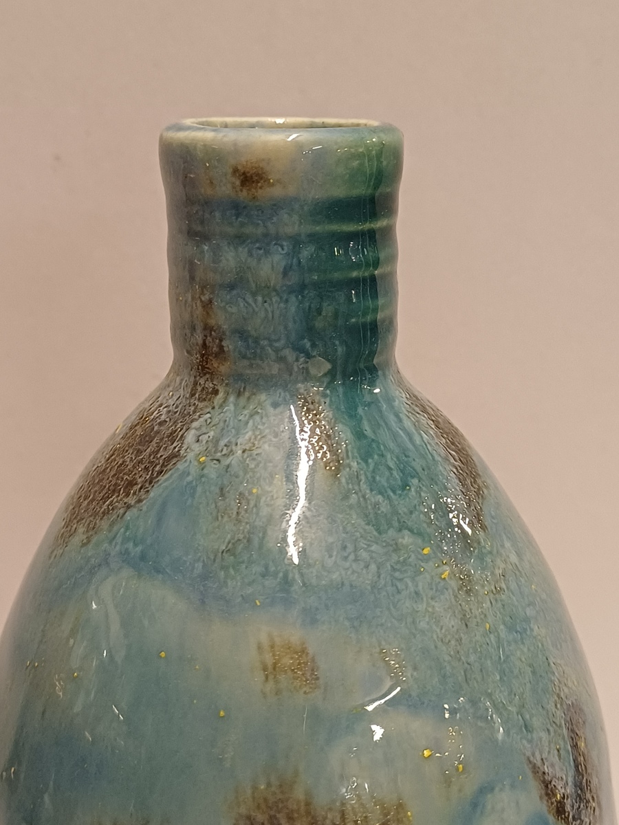 Aardewerken hand gedraaide vaas met blauw gewolkte glazuur met donkere vlekken, de hals met 3x minimale insoering. Onderzijde met vroeg label en zwarte signatuur.