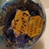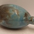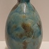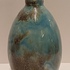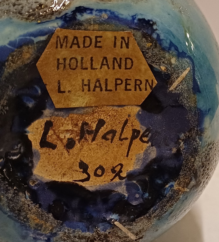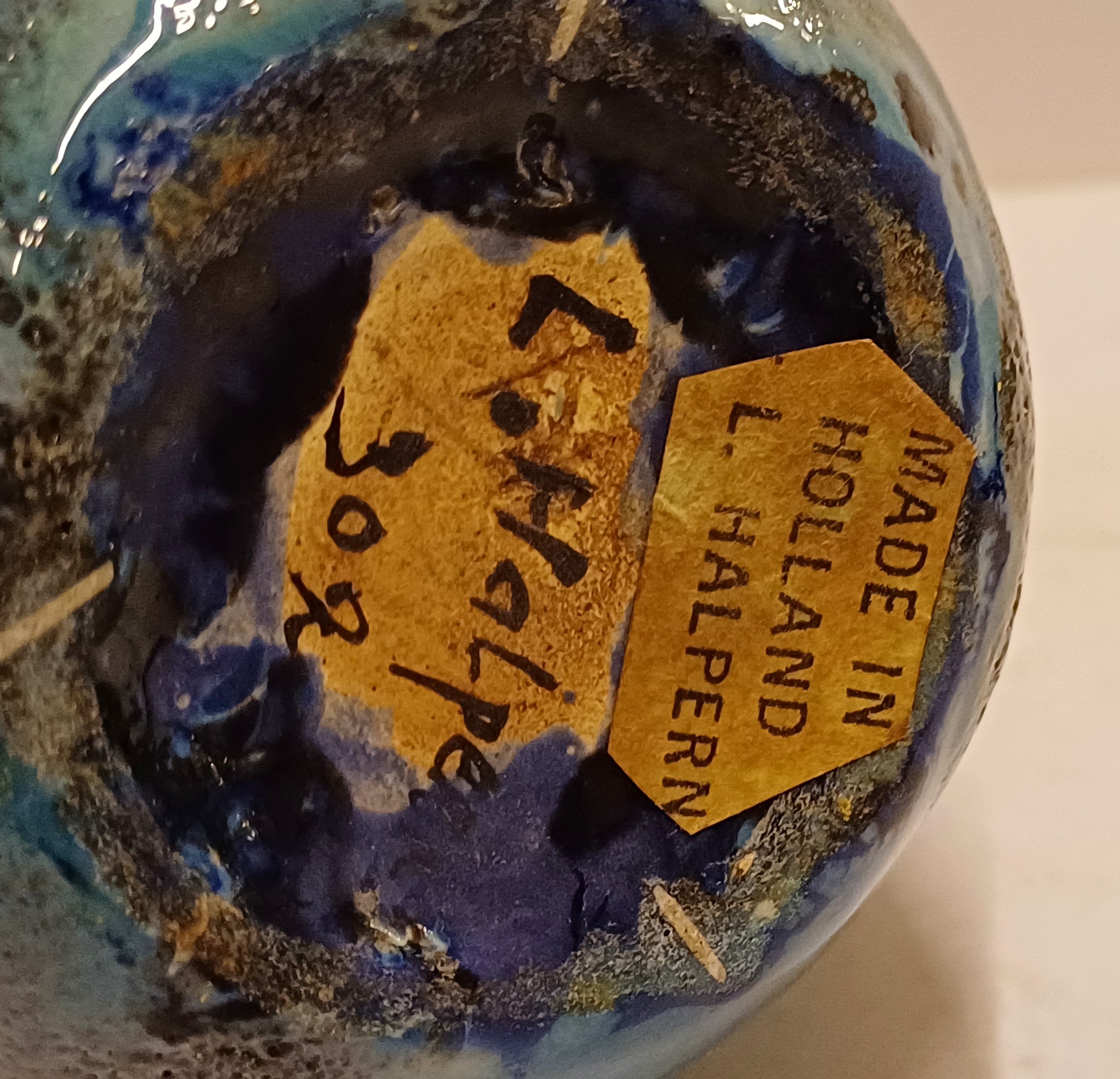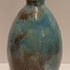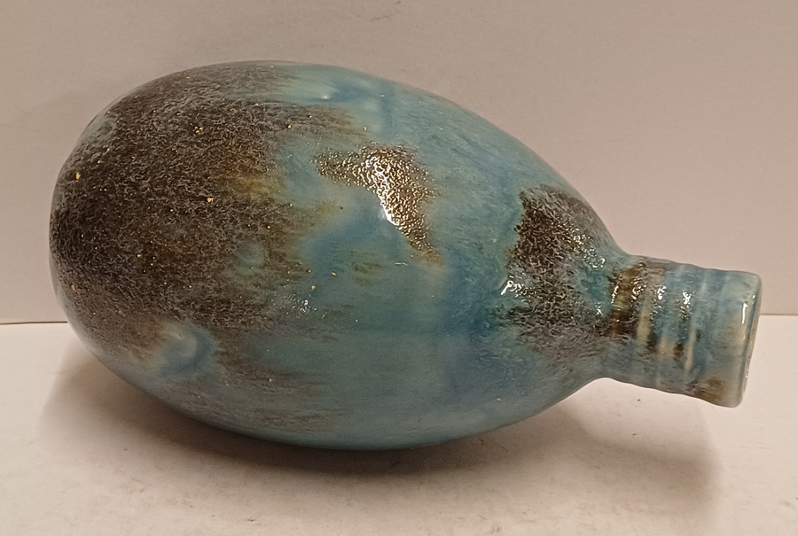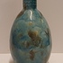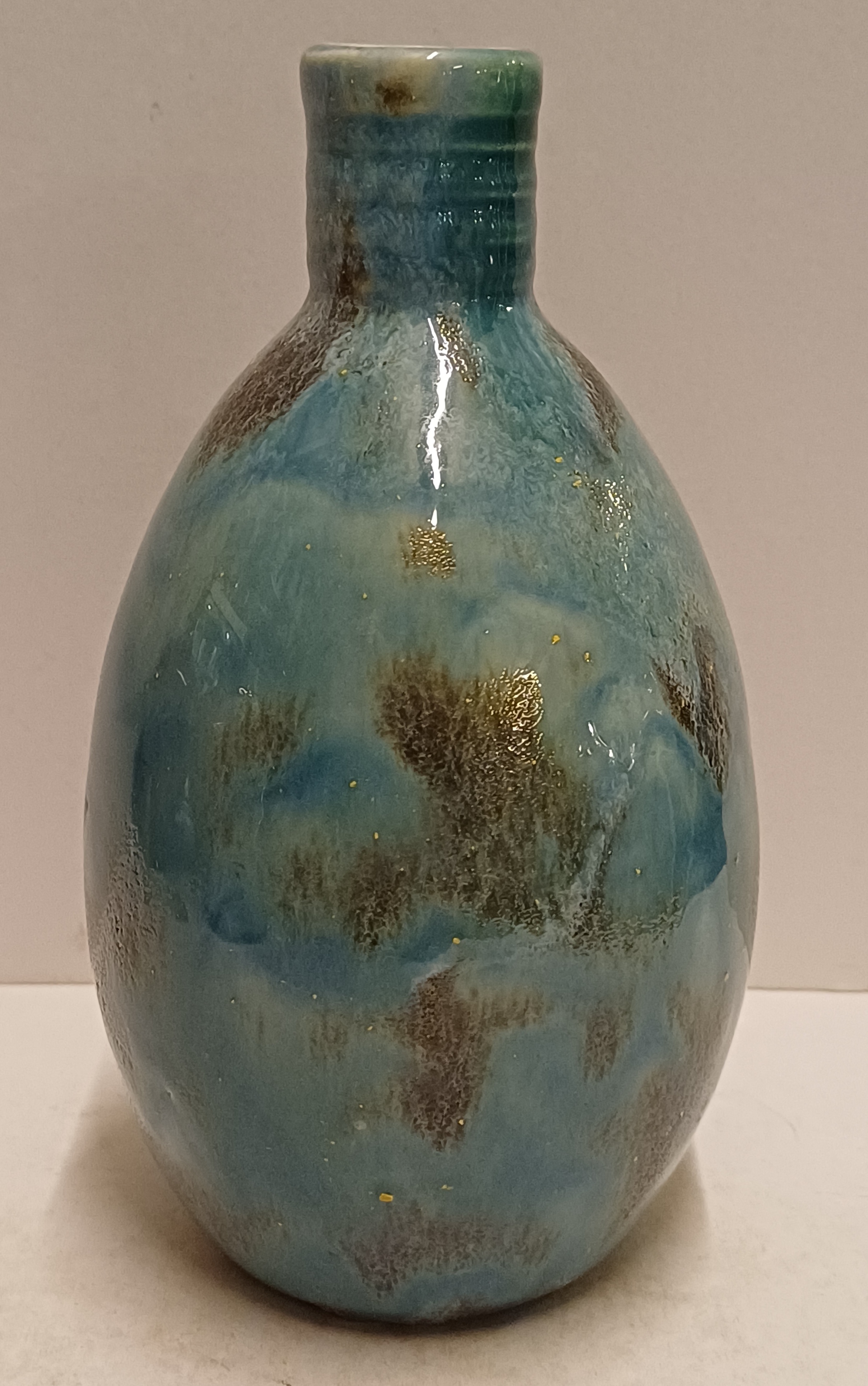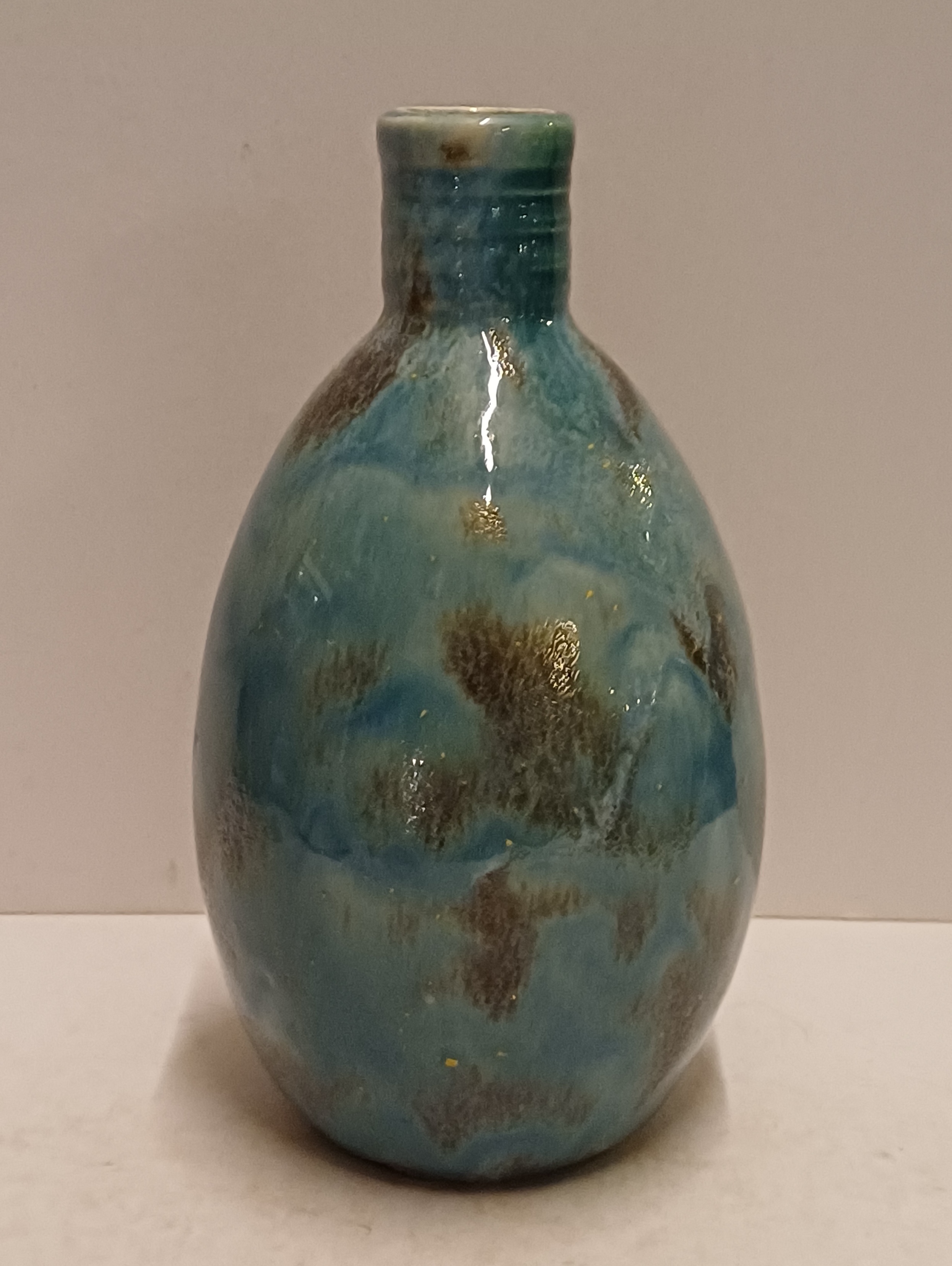 Aardewerken hand gedraaide vaas met blauw gewolkte glazuur met donkere vlekken, de hals met 3x minimale insoering. Onderzijde met vroeg label en zwarte signatuur.