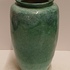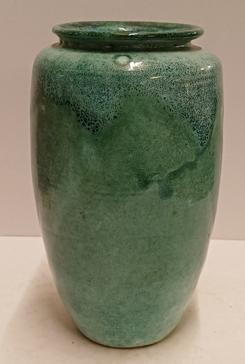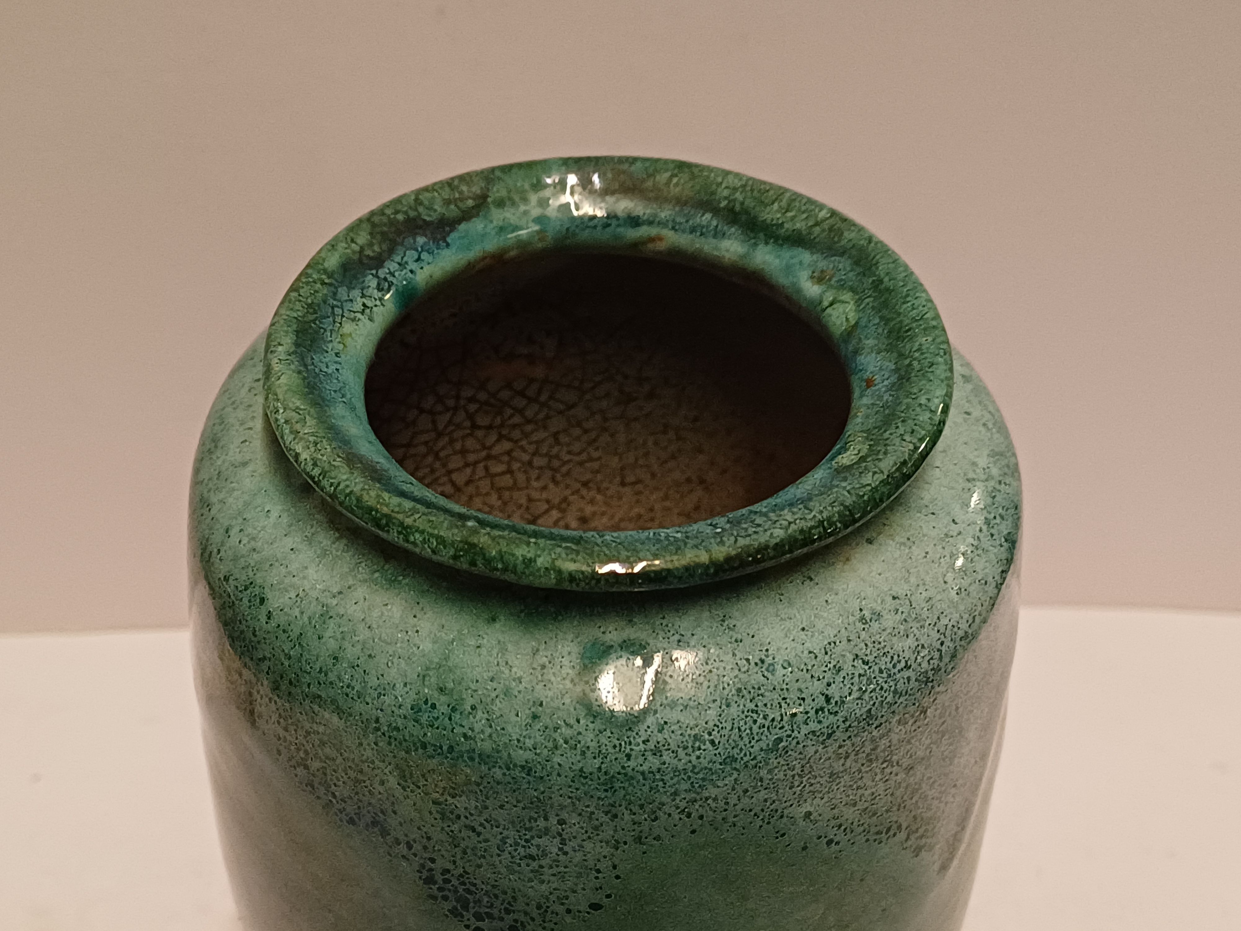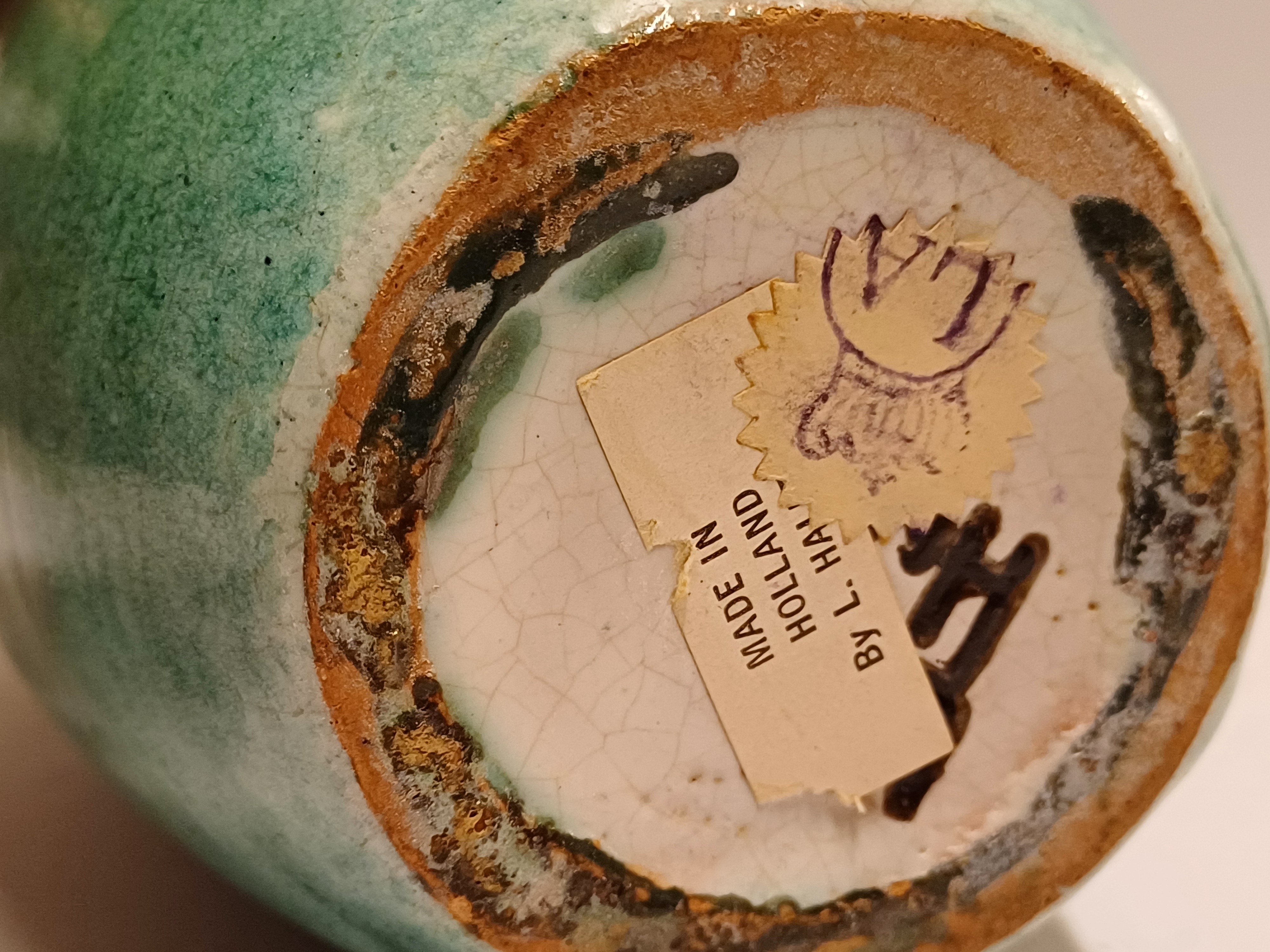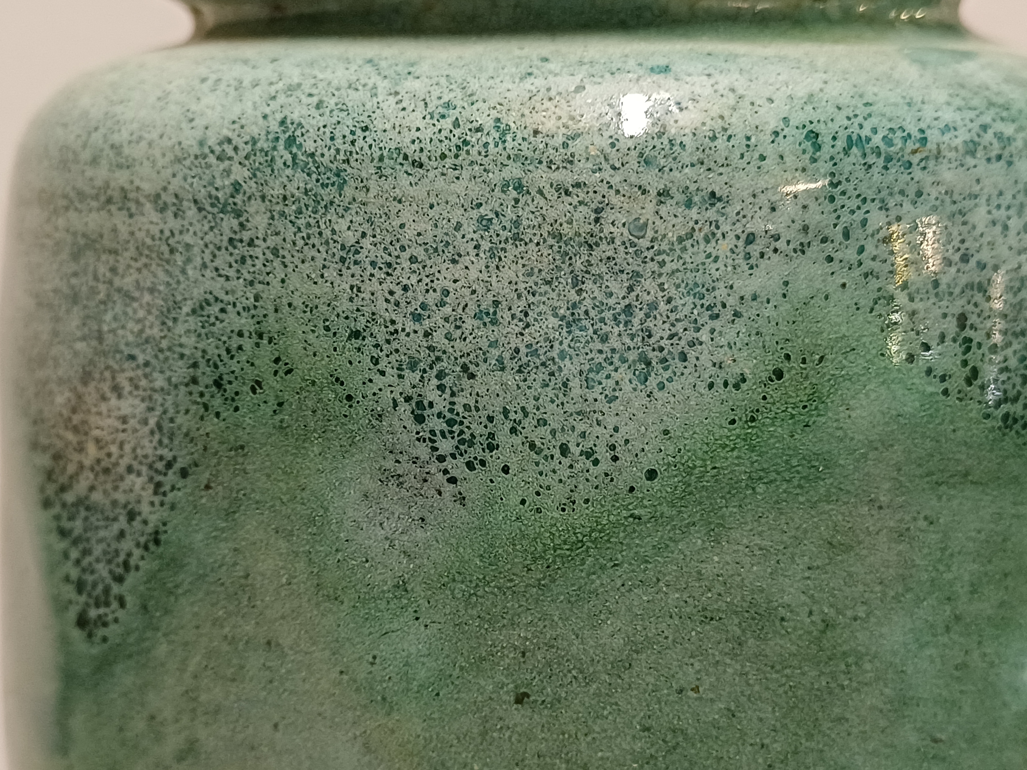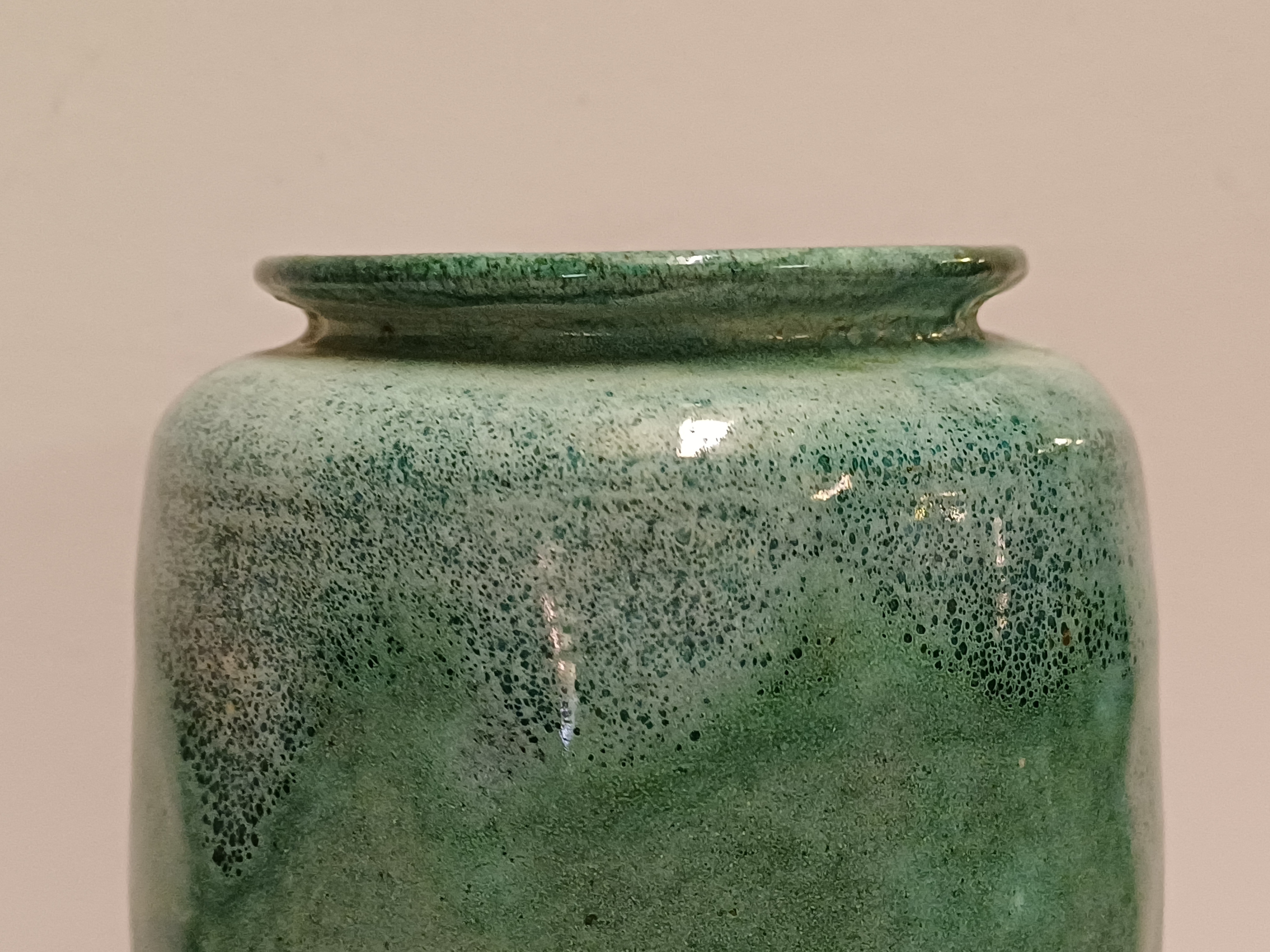 Aardewerken vaas met groene gewolkte glazuur met witte accenten. Onderzijde met etiket en signatuur in zwart.