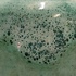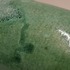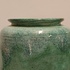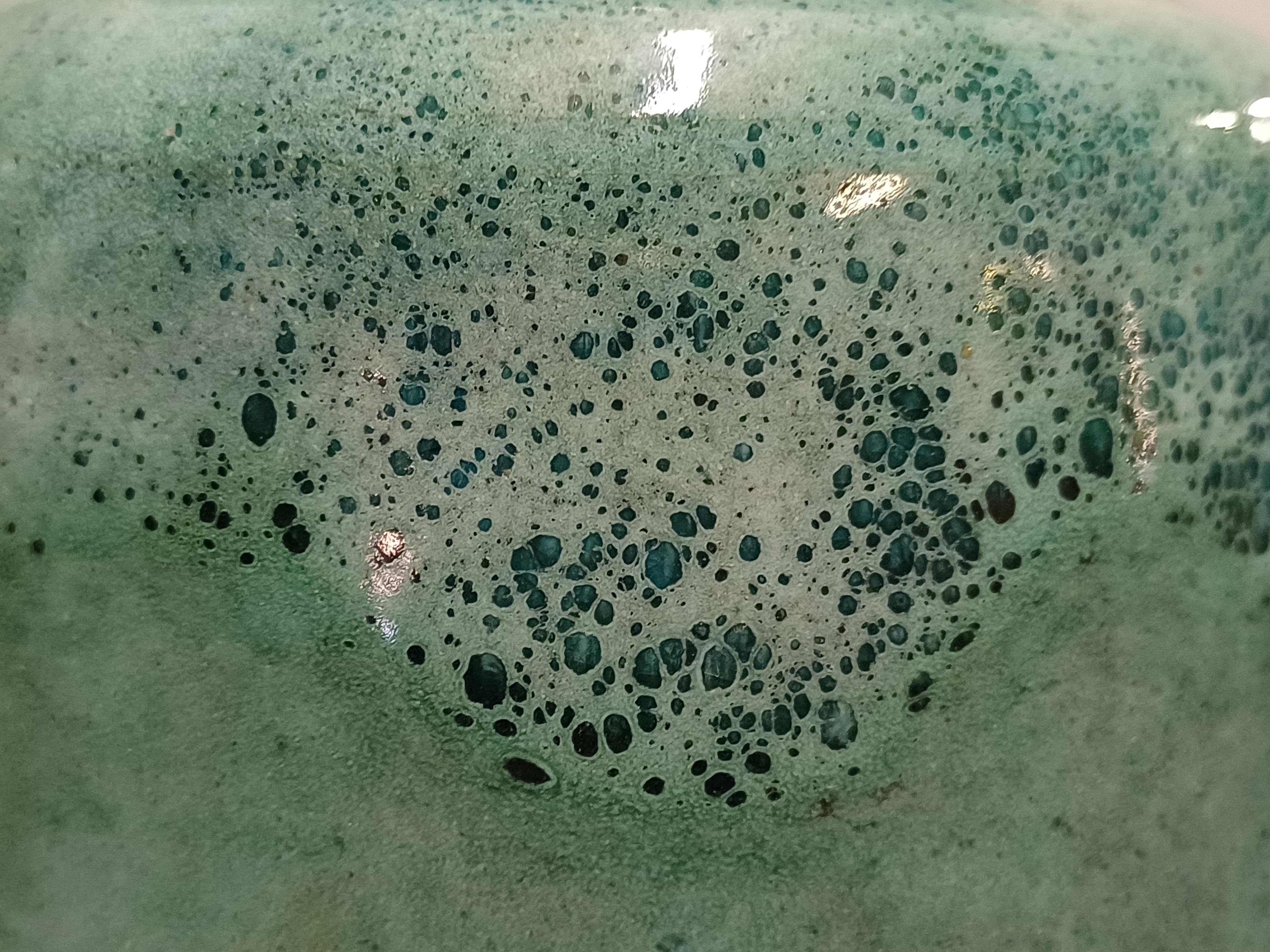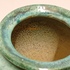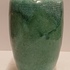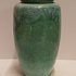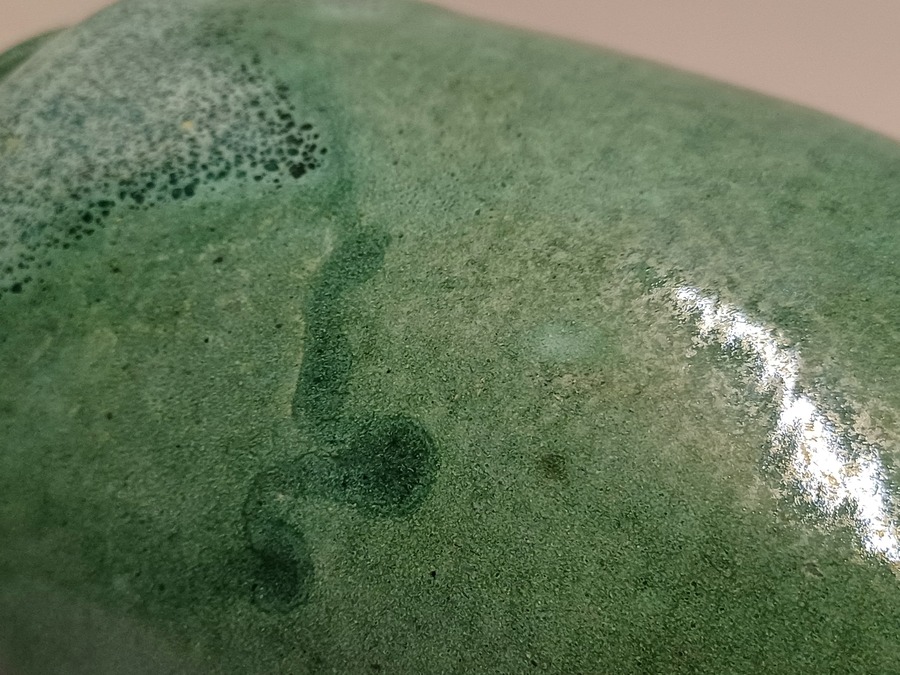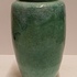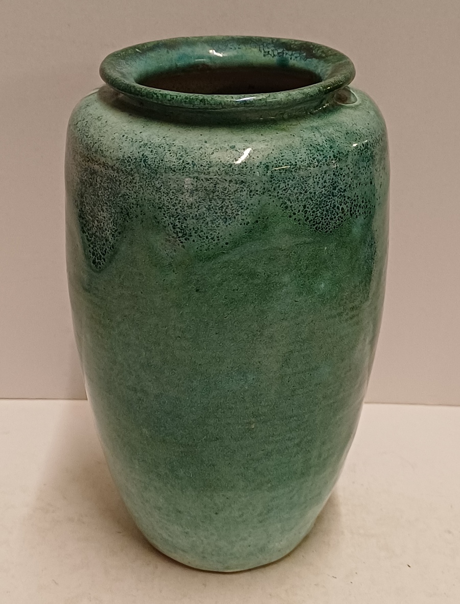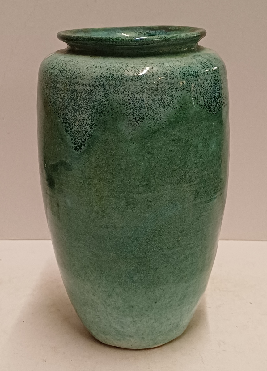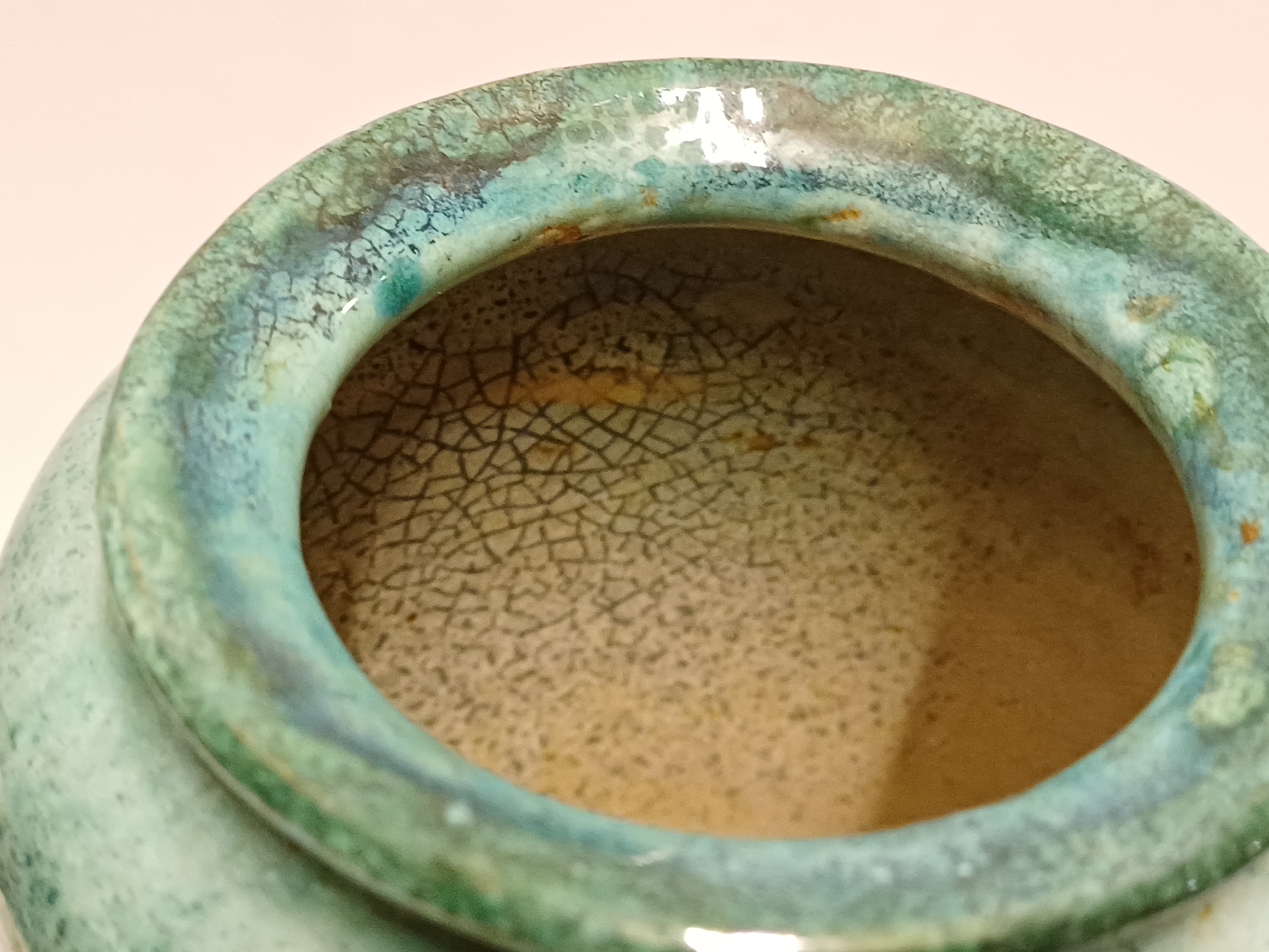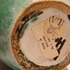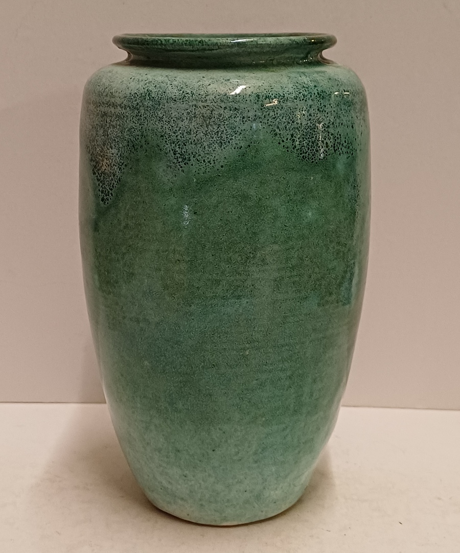 Aardewerken vaas met groene gewolkte glazuur met witte accenten. Onderzijde met etiket en signatuur in zwart.
