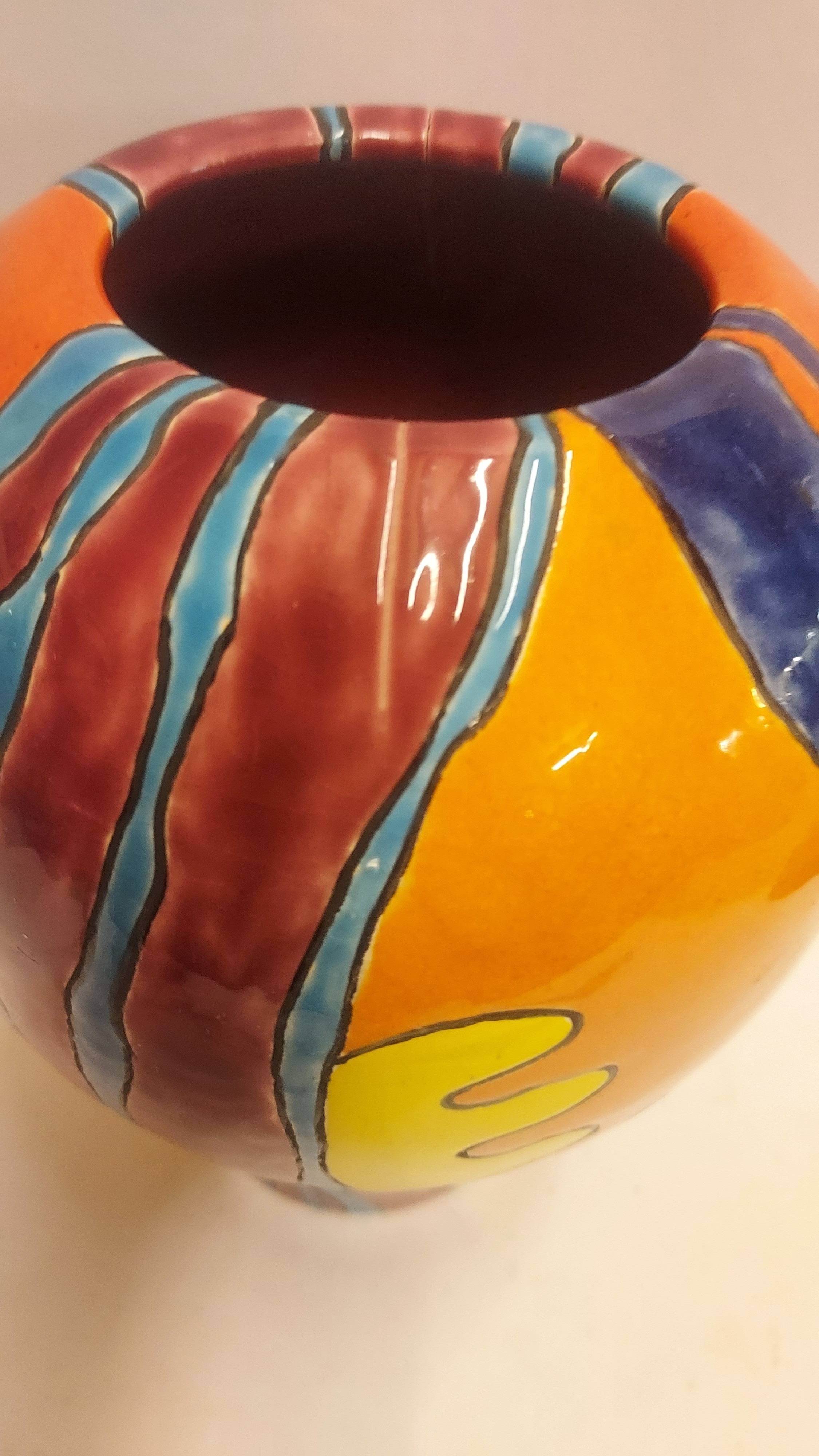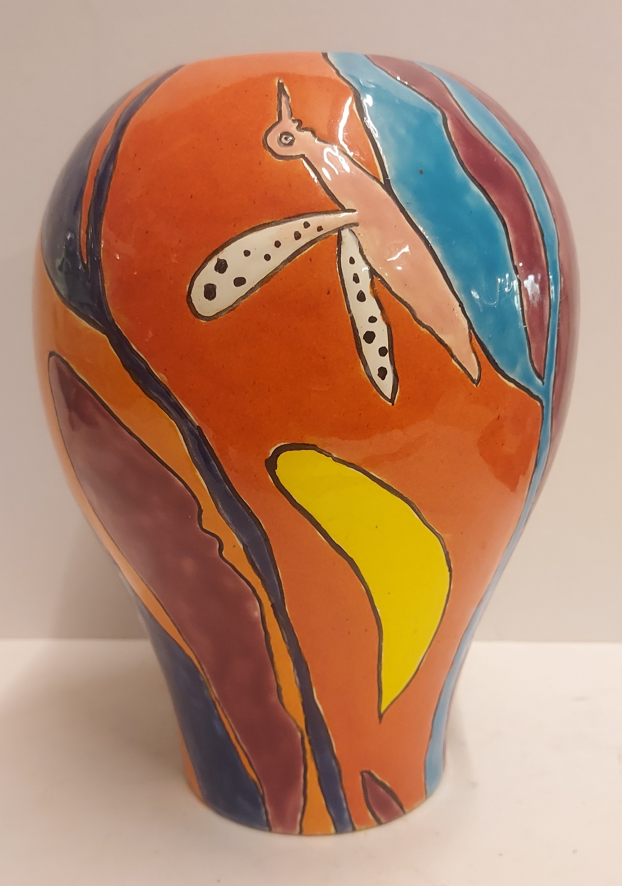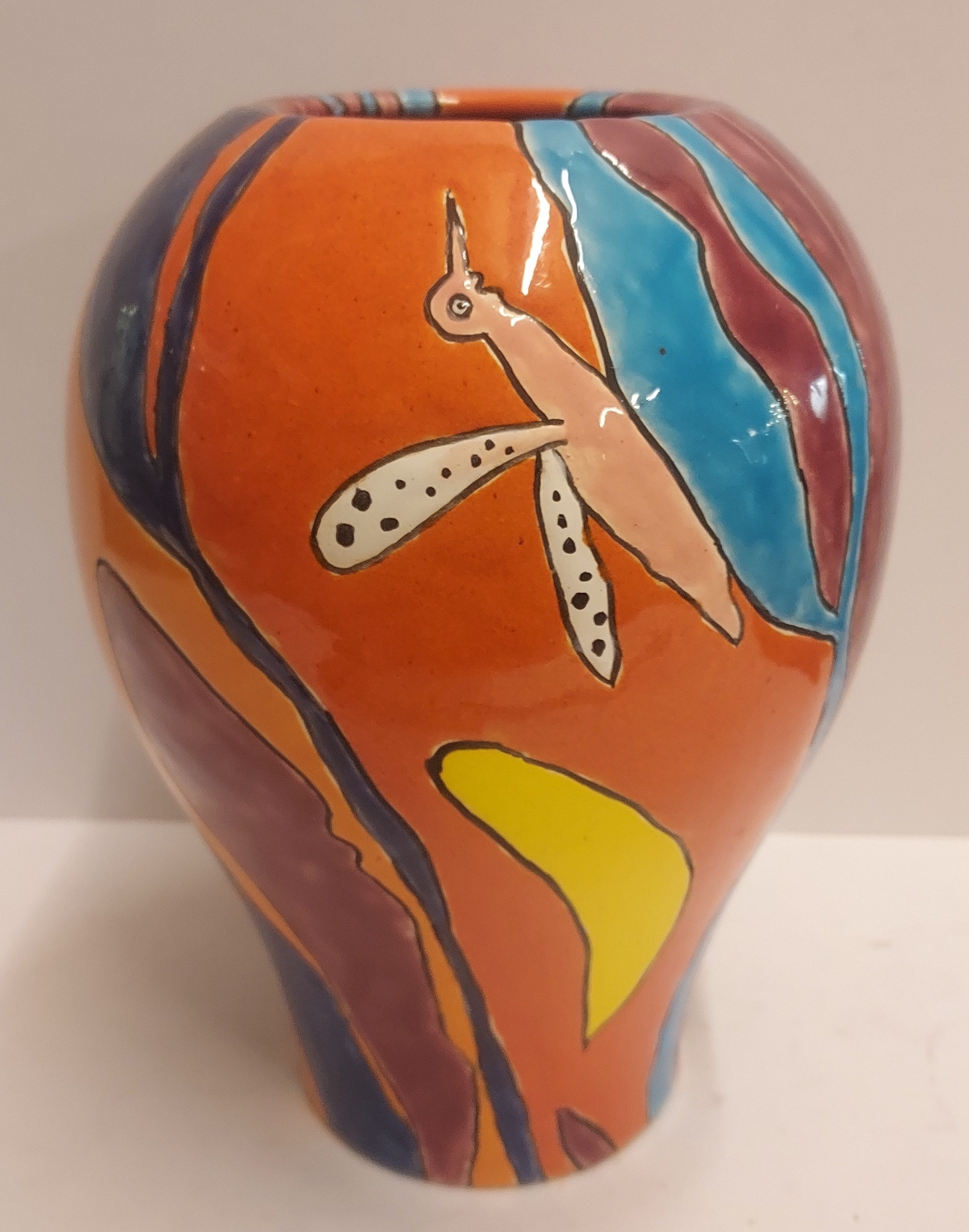 Aardewerken vaas met veelkleurige decoratie met insect. Onderzijde voluit gesigneerd en gedateerd 1995 en nr 1083.
