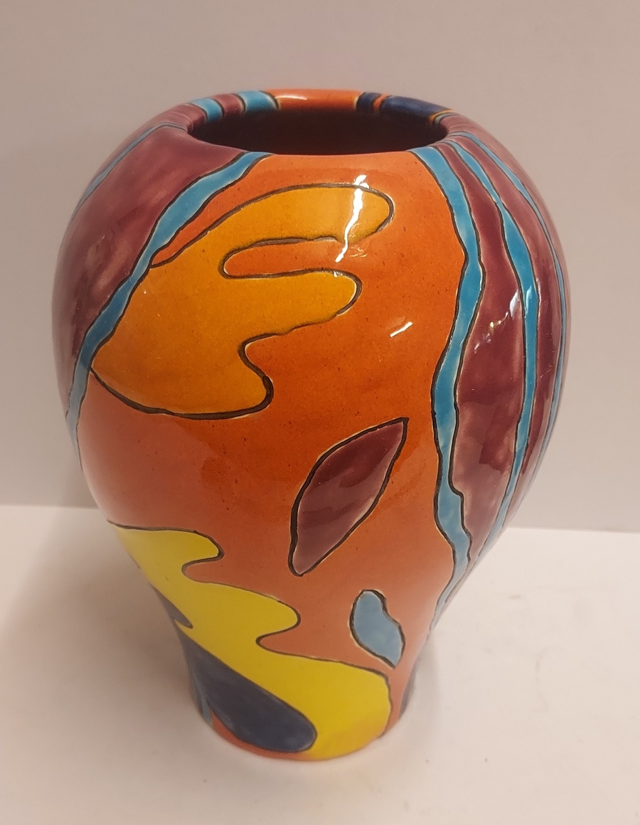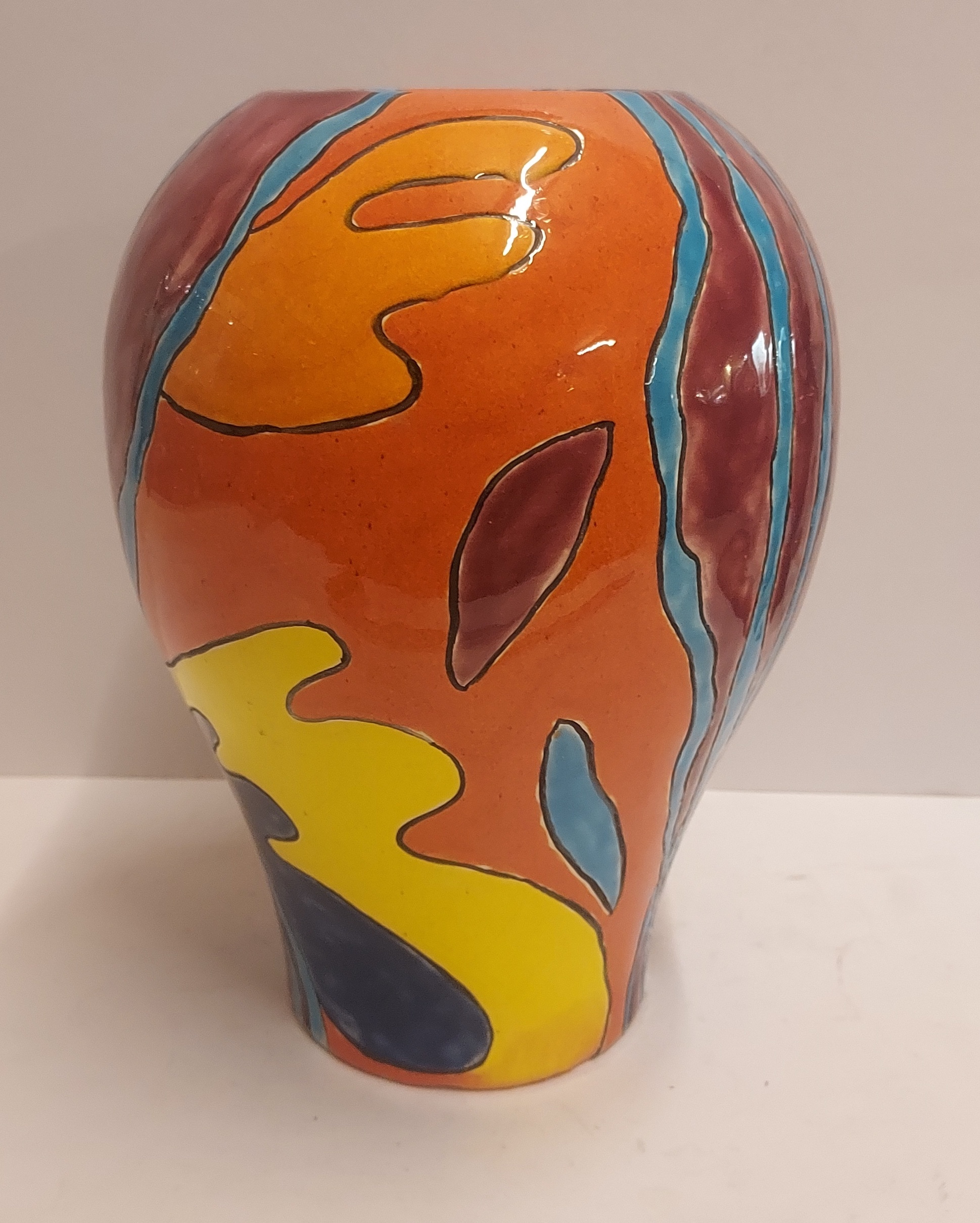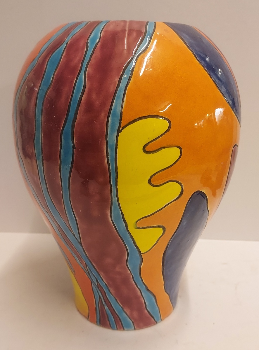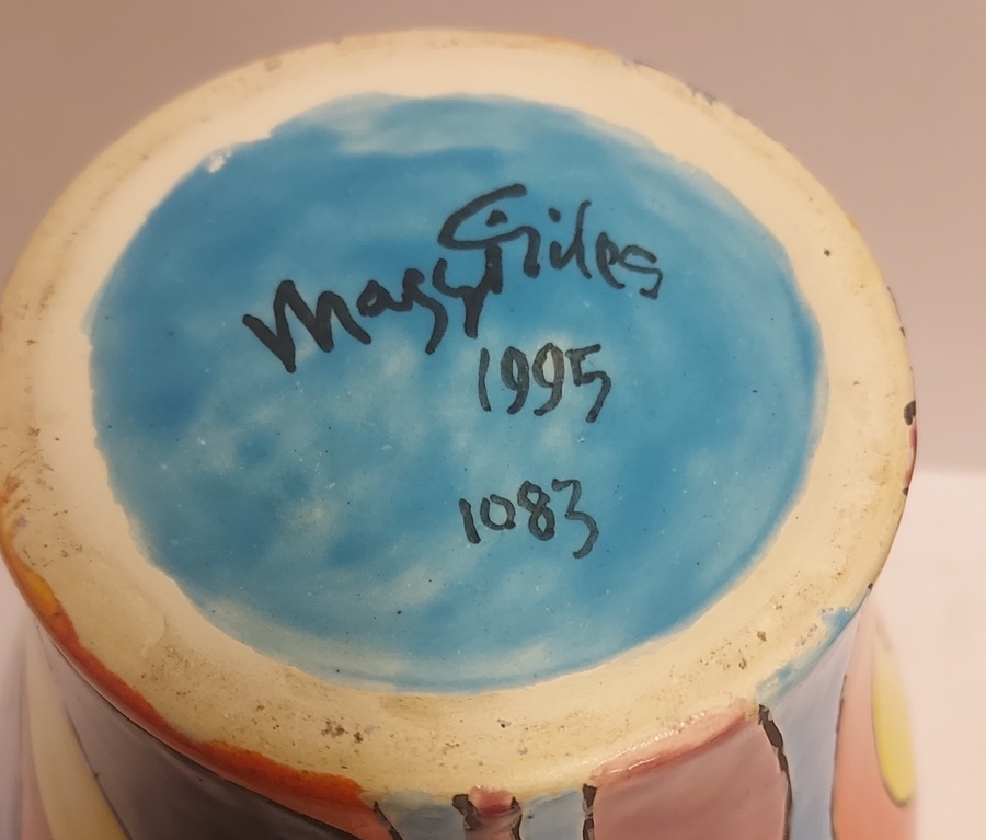 Aardewerken vaas met veelkleurige decoratie met insect. Onderzijde voluit gesigneerd en gedateerd 1995 en nr 1083.