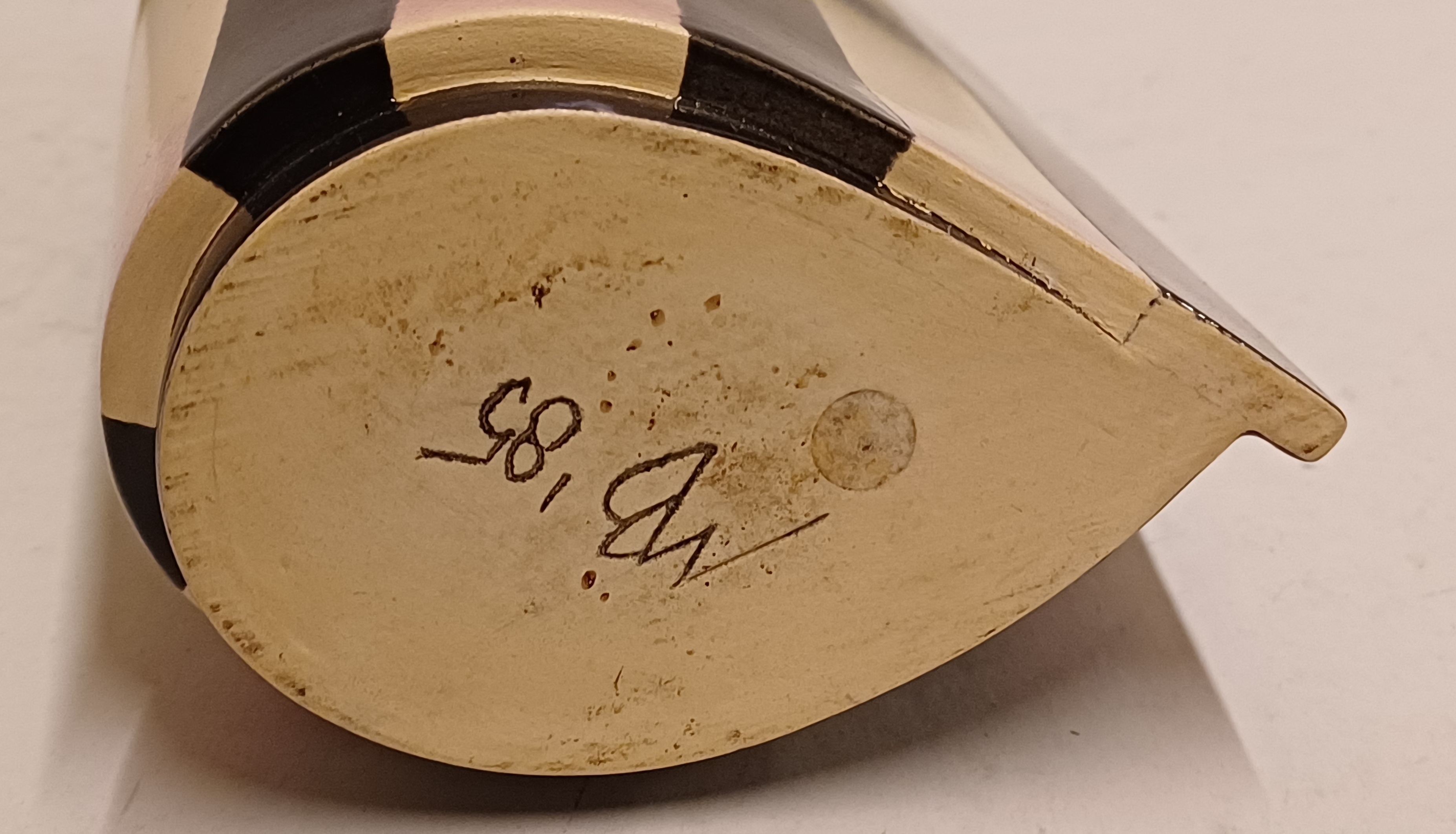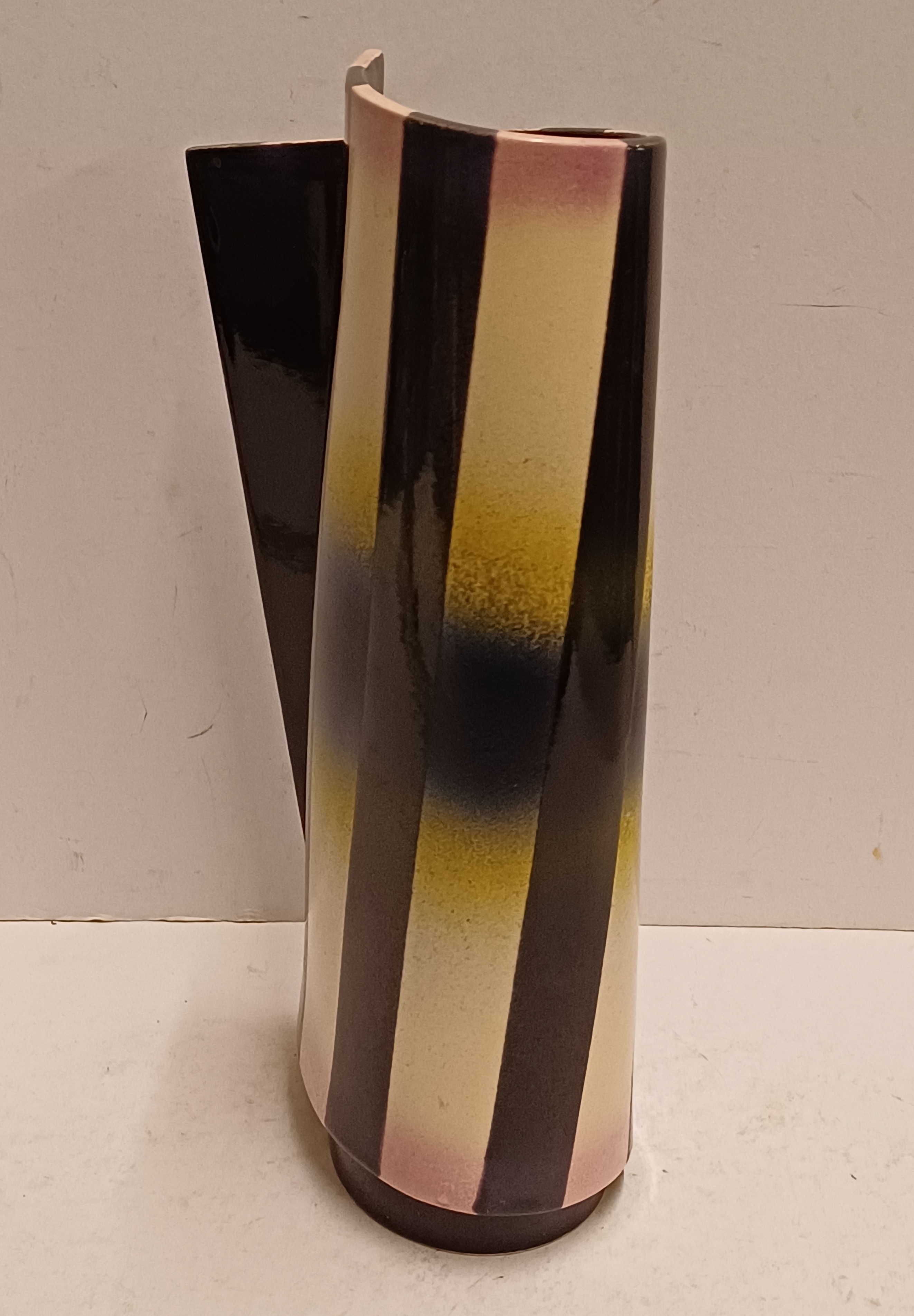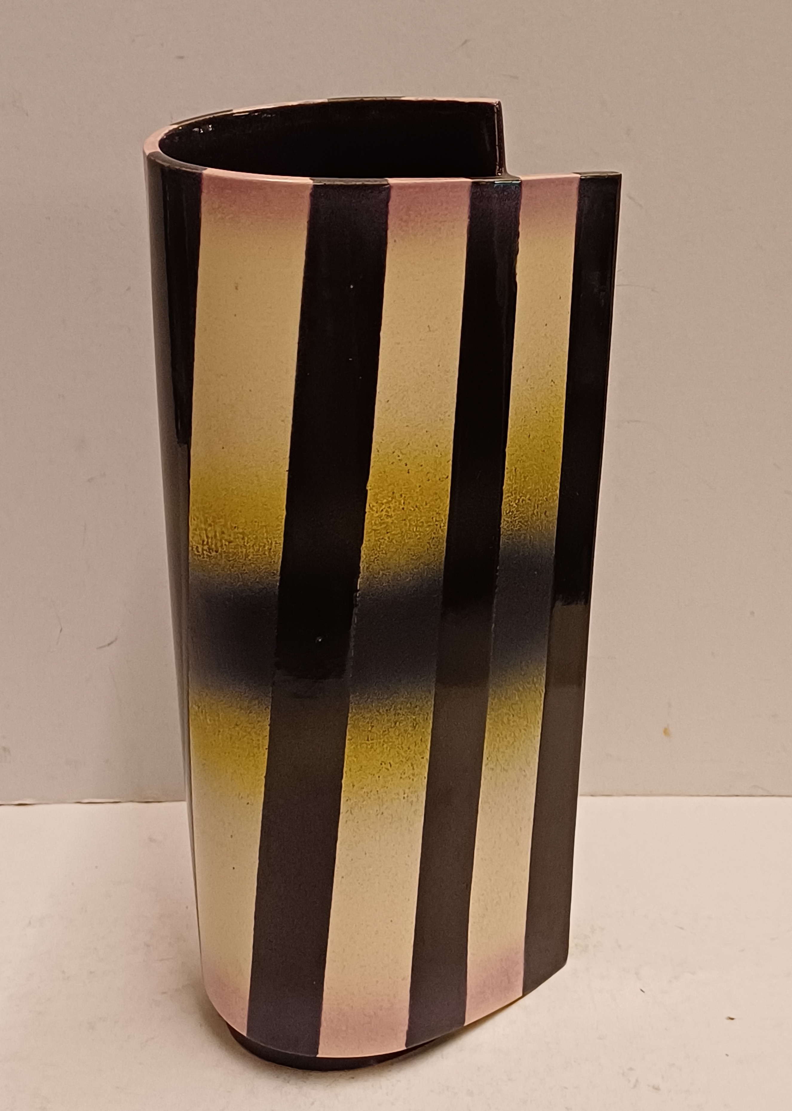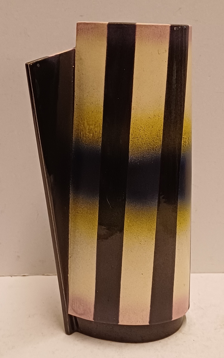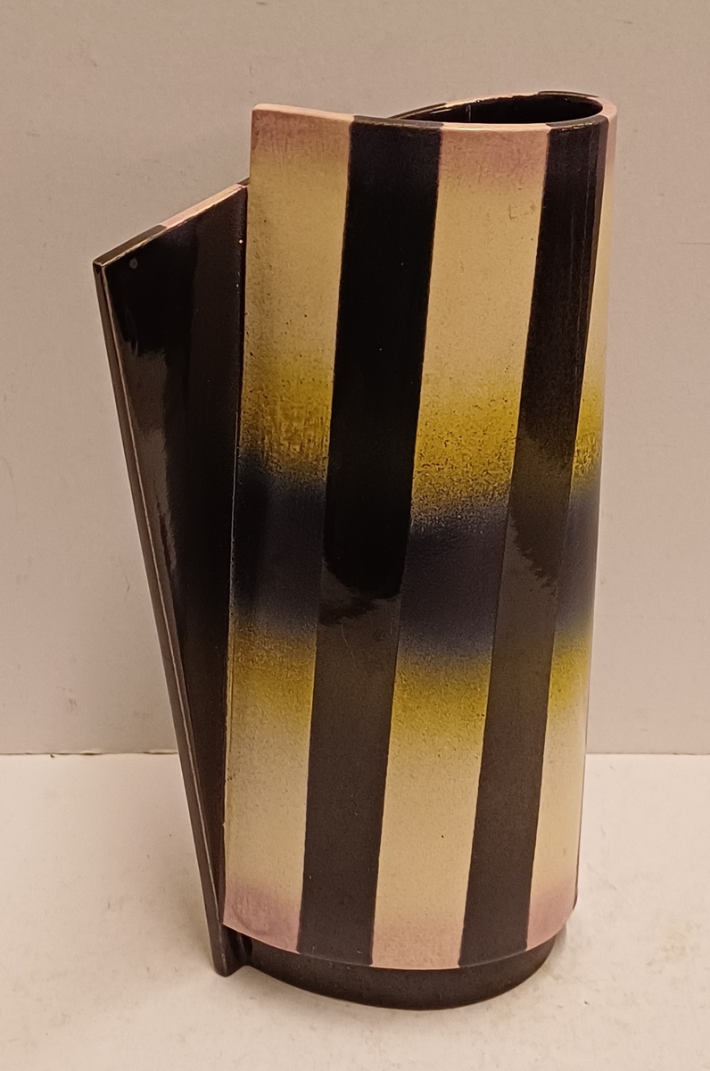 Aardewerken gevouwen vaas met streepdecor. Onderzijde met monogram en datering '85.