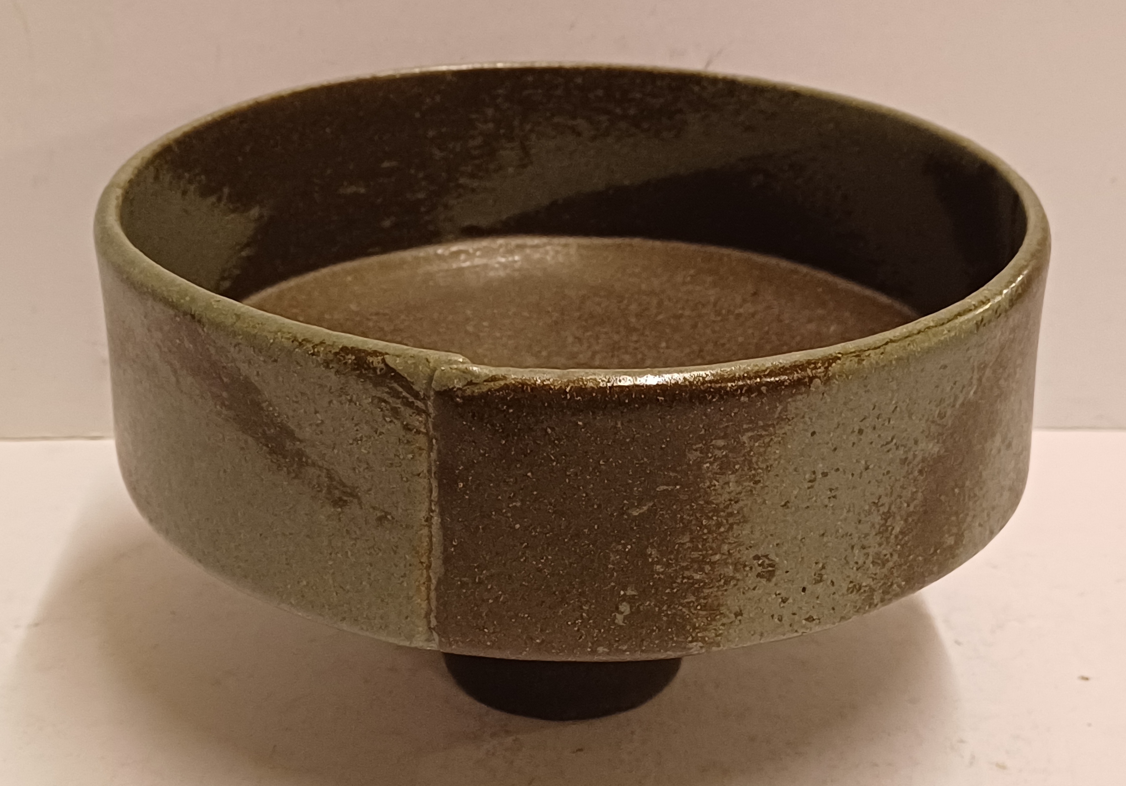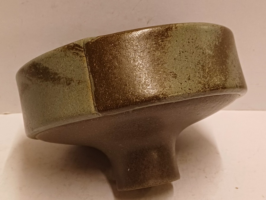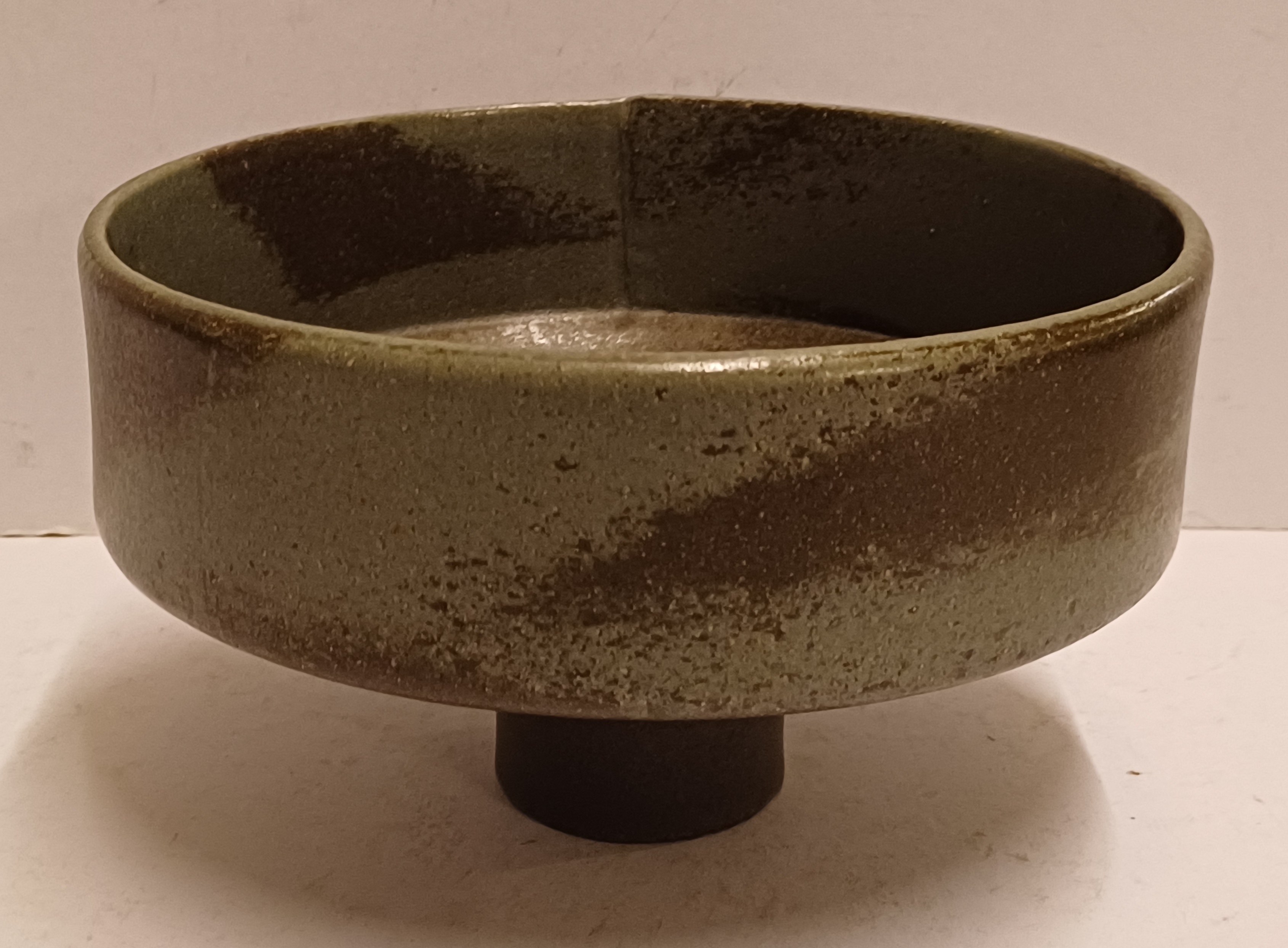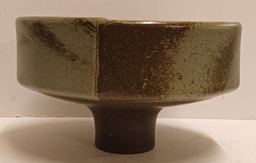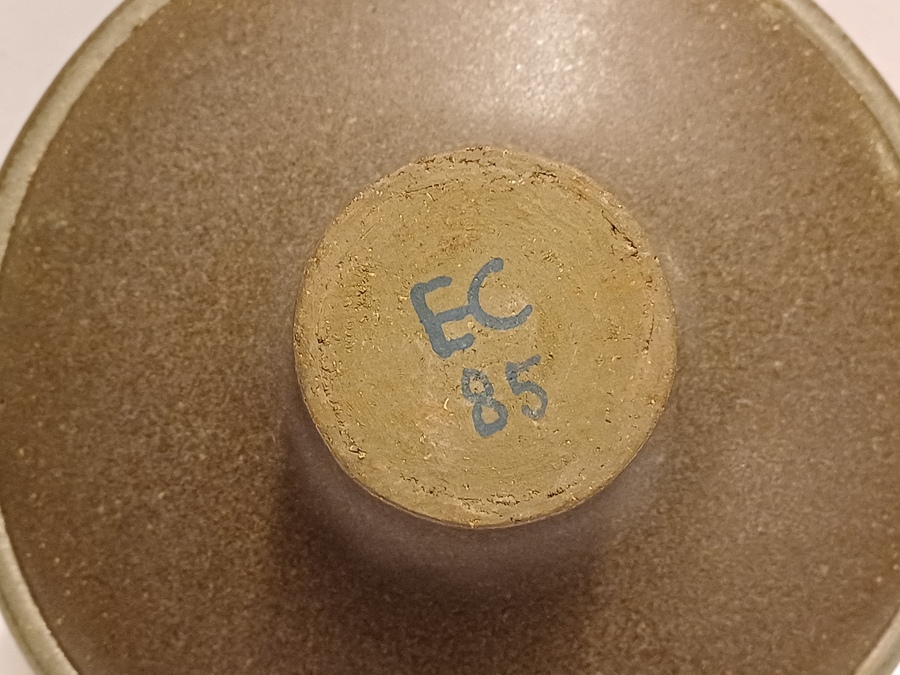 Aardewerken vaas met groen zwarte gespoten galzuur. Onderzijde met monogram en datering '85.