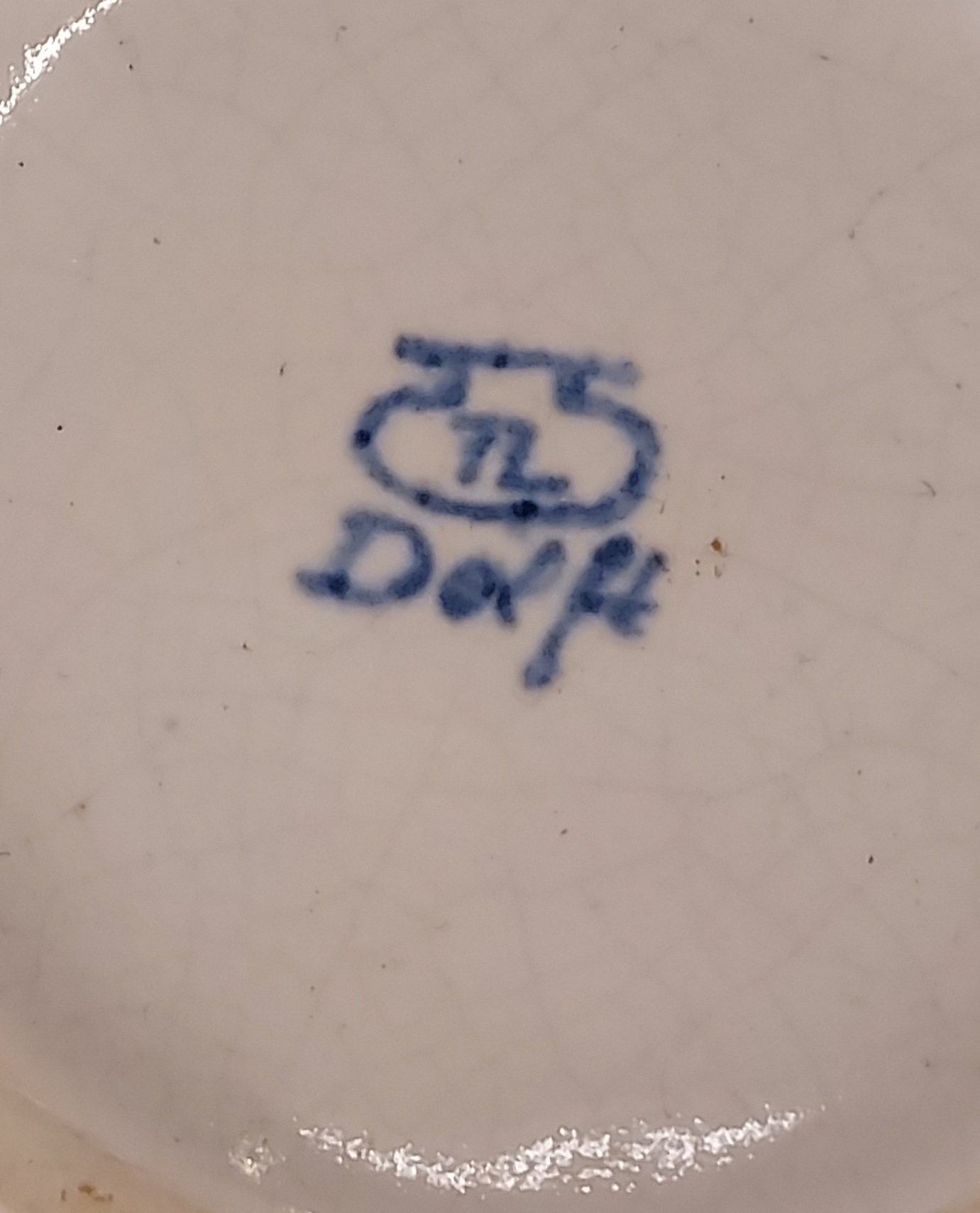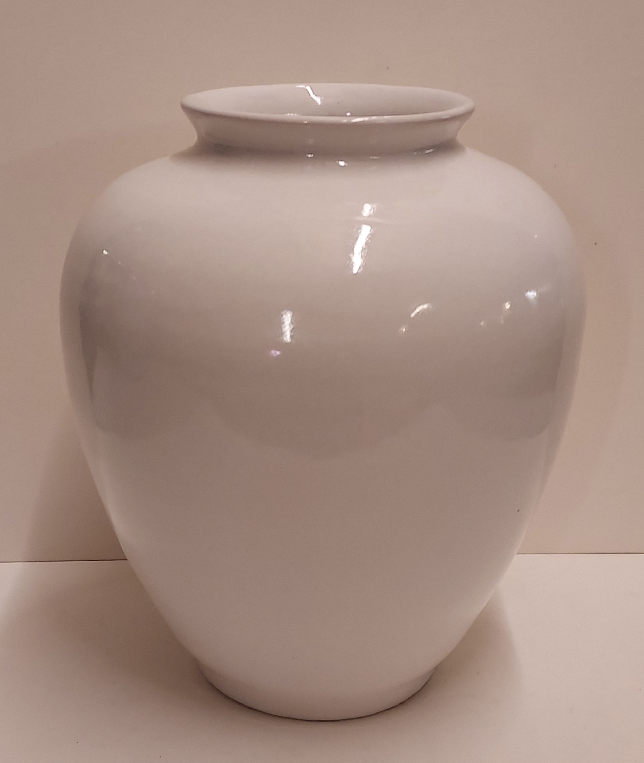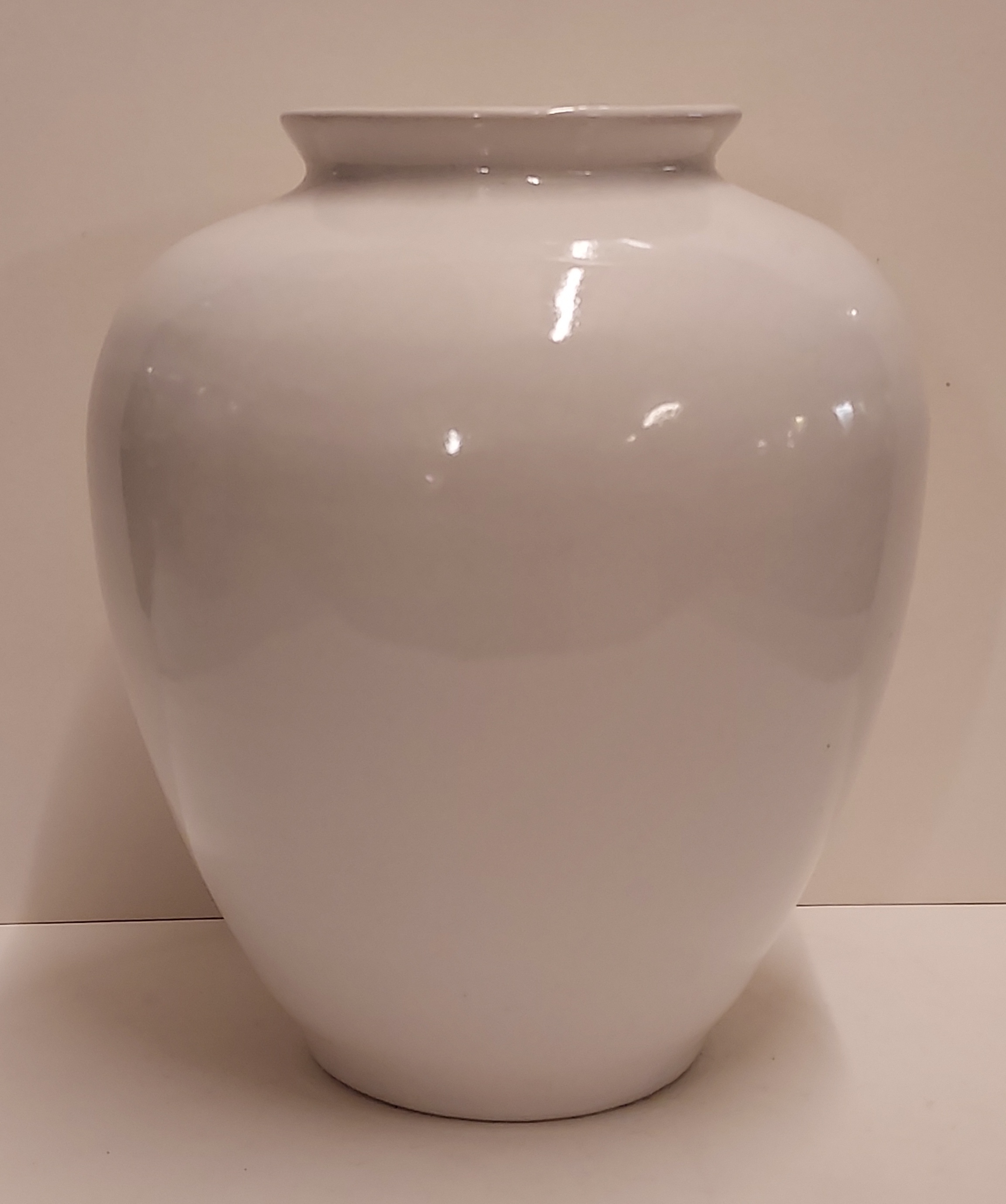 Handgedraaide vaas met witte glazuur. Onderzijde met blauw fabrieksmerk.