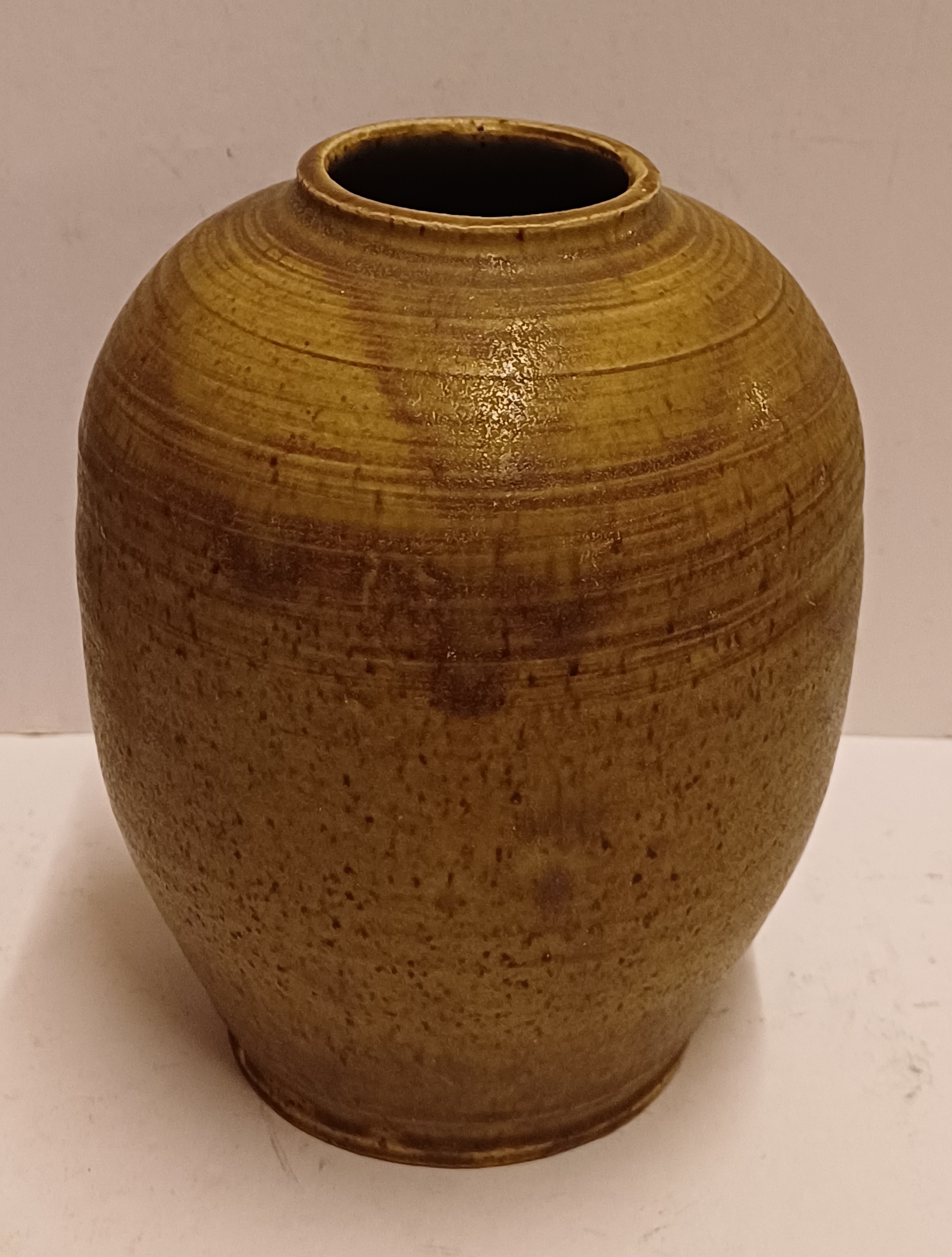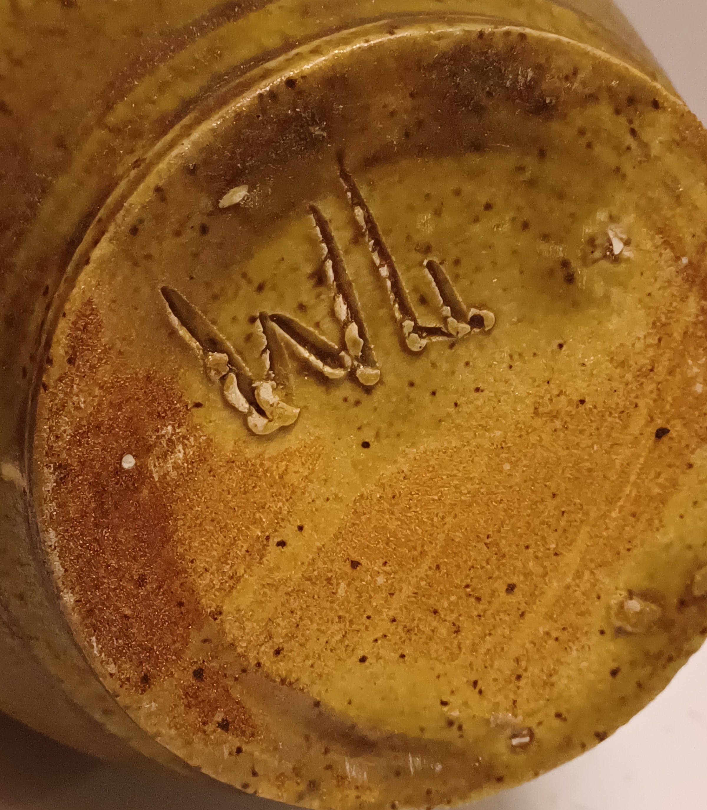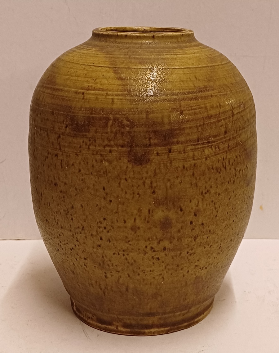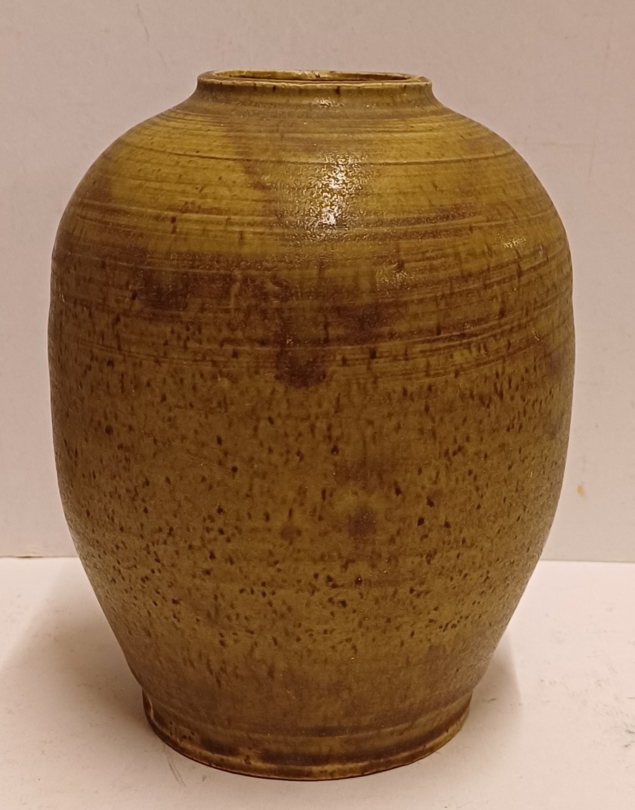 Aardewerken vaas met groene glazuur. Onderzijde met monogram.