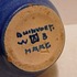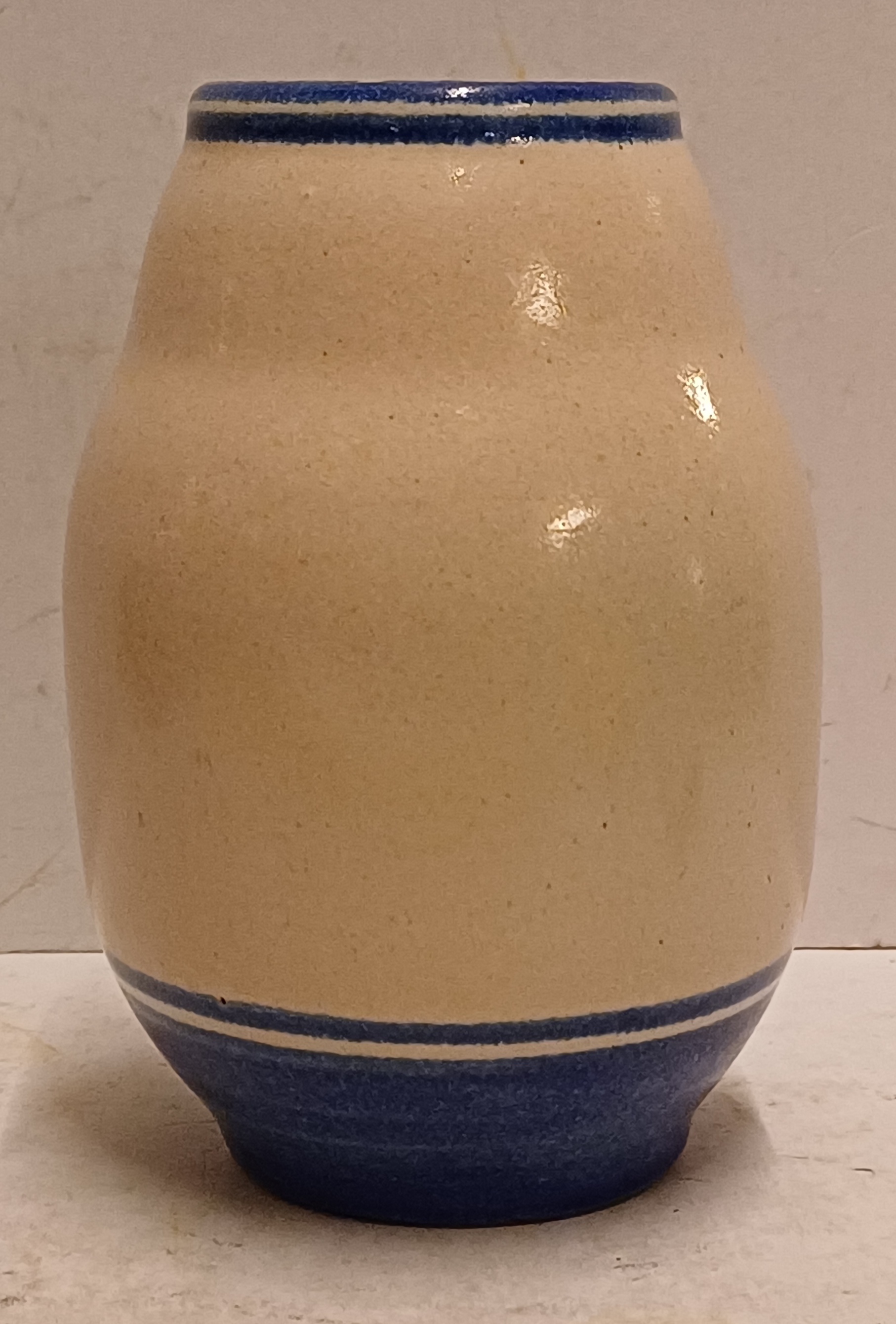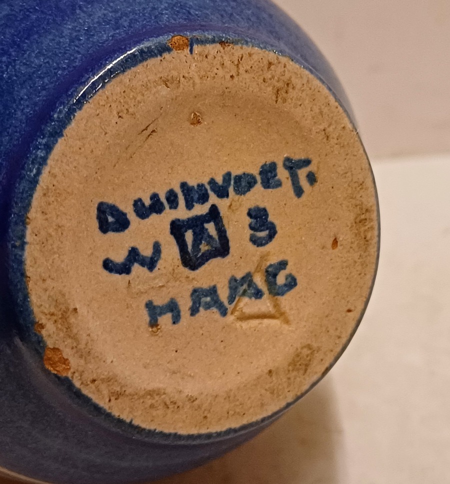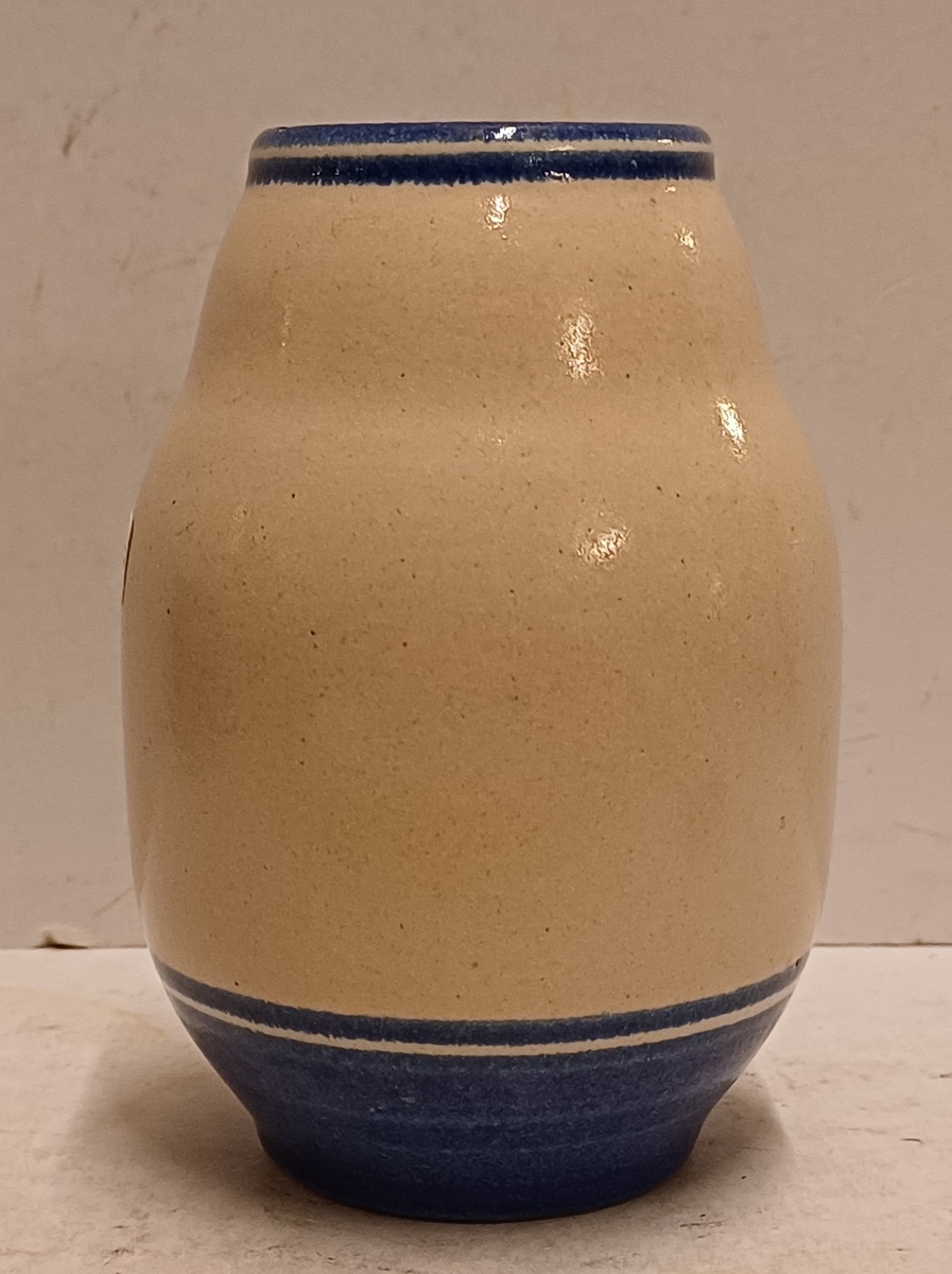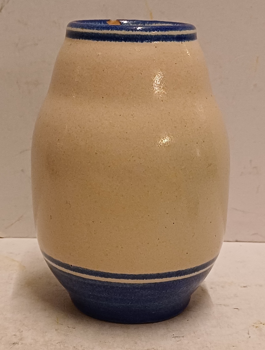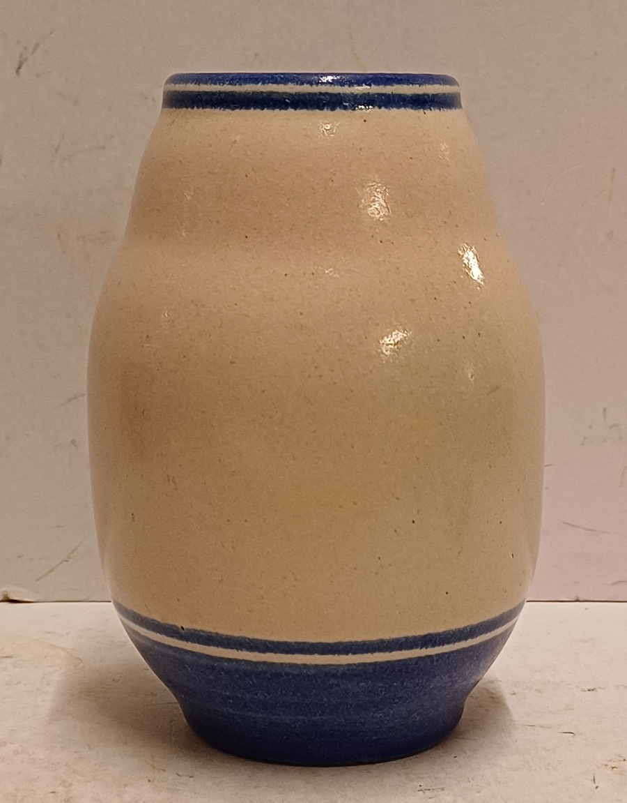 Aardewerken vaas met grijze huid met blauwe band decoratie. Ontwerp Cor Alons, uitvoering Duinvoet Den Haag . Periode 1923-27.