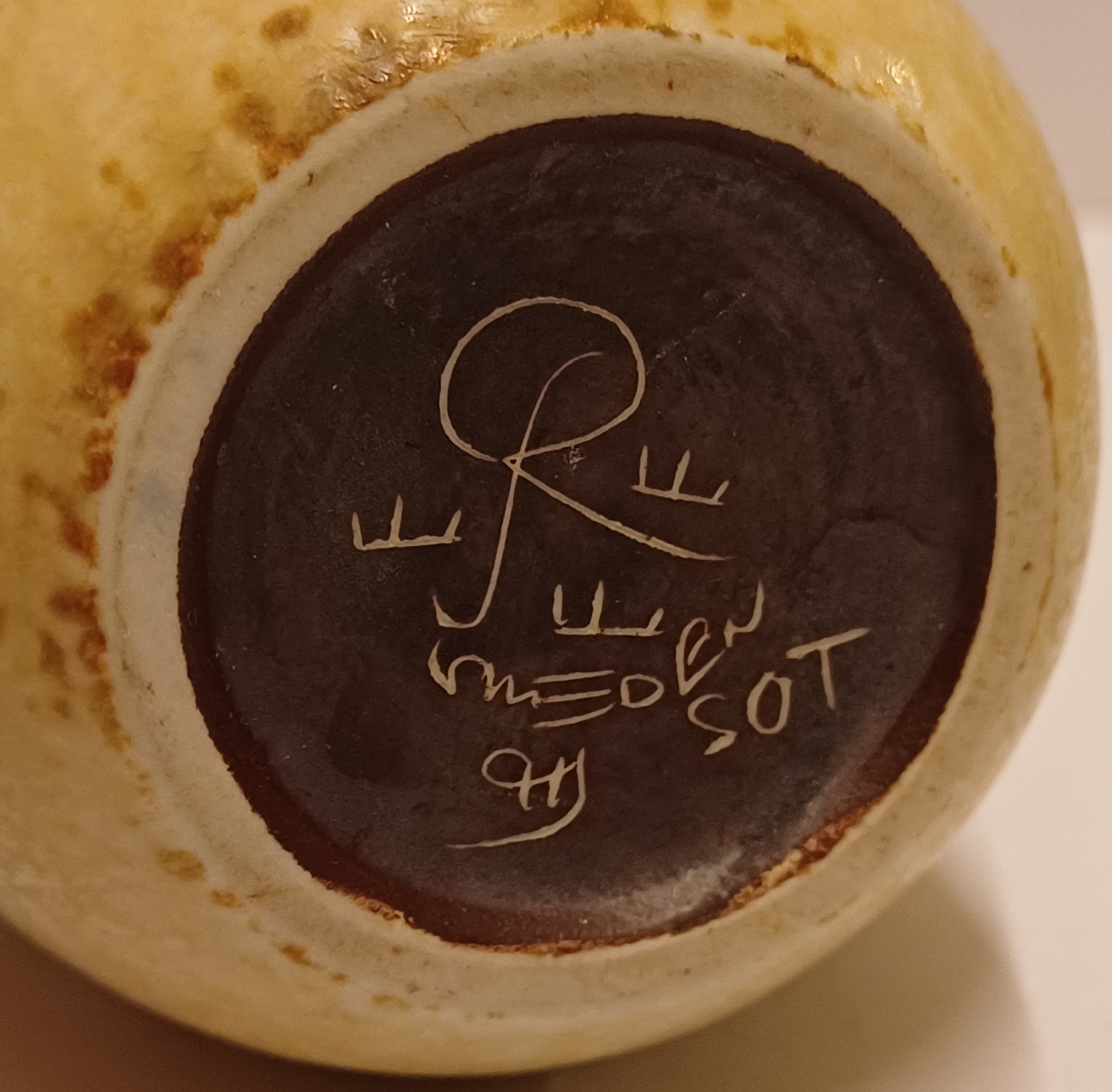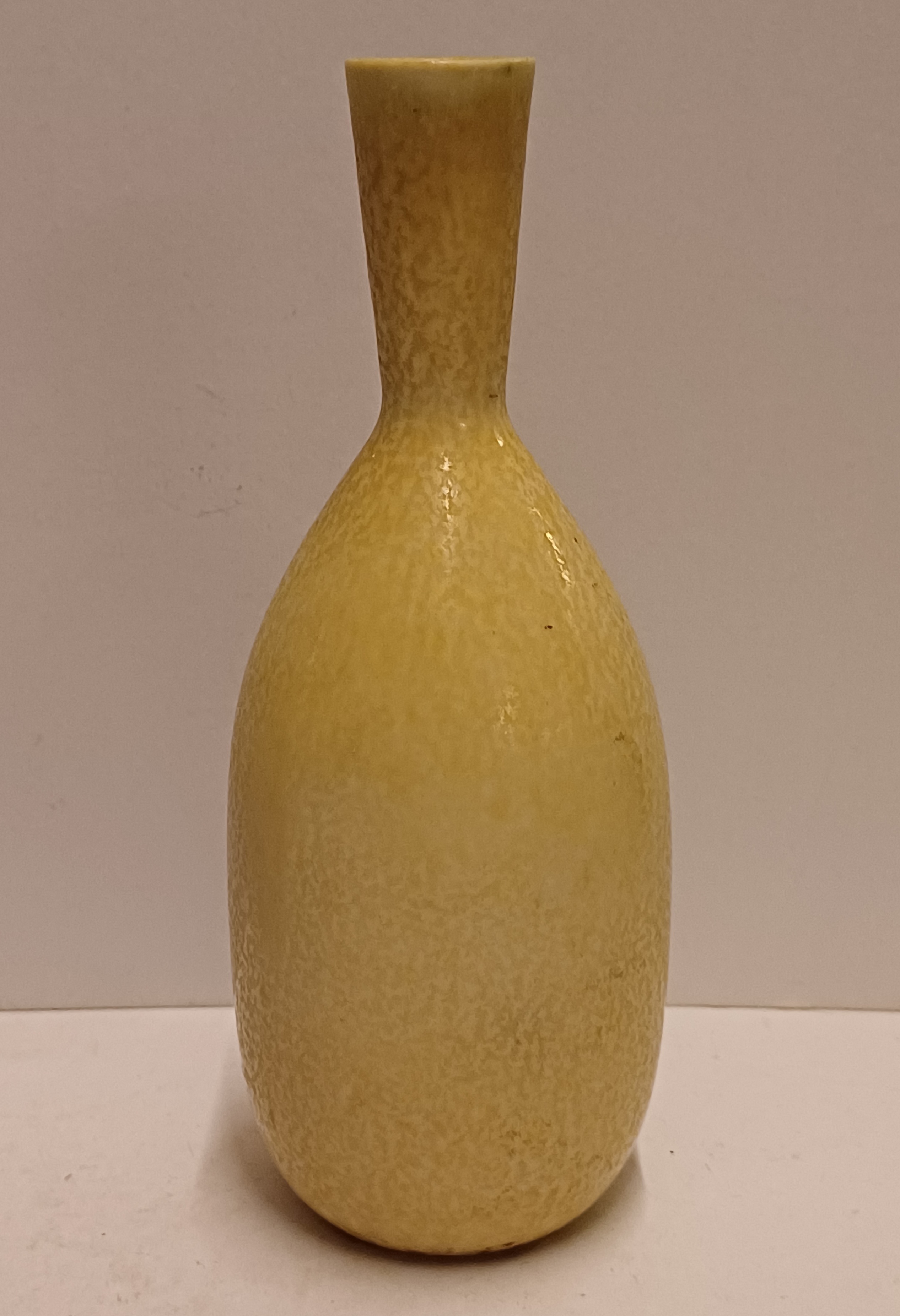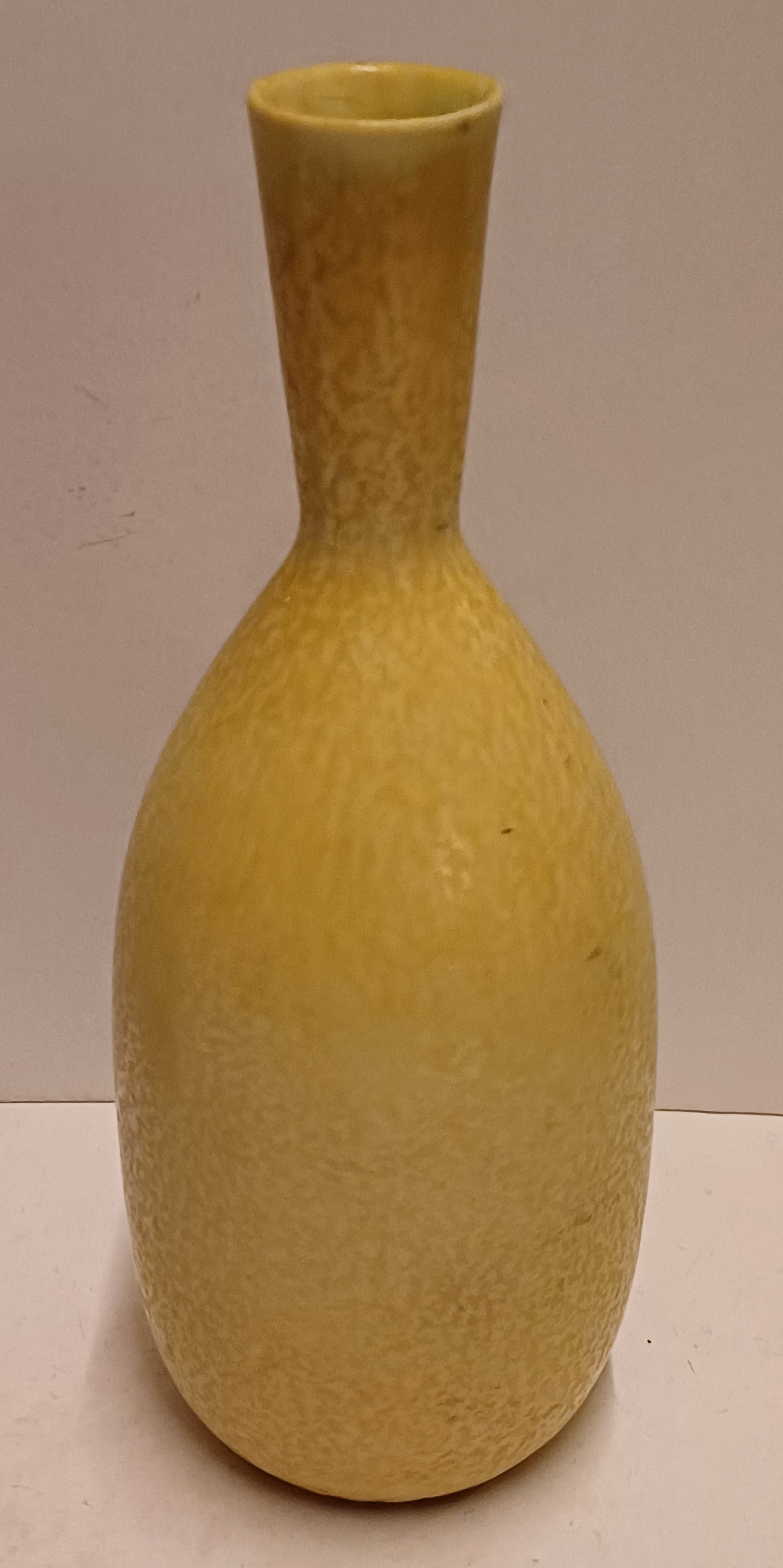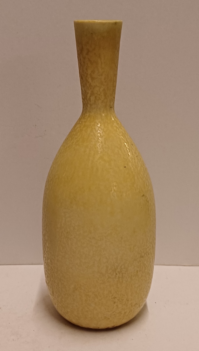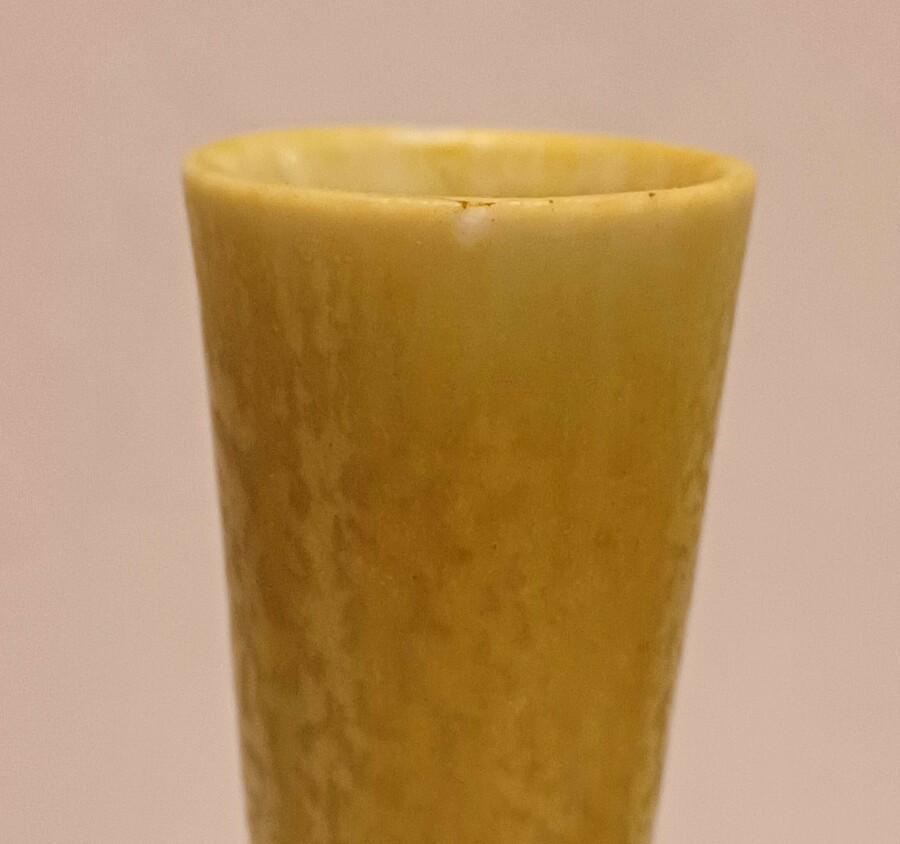 Aardewerken vaasje met gele glazuur. Ontwerp Gunnar Nylund voor Rorstrand Sweden.