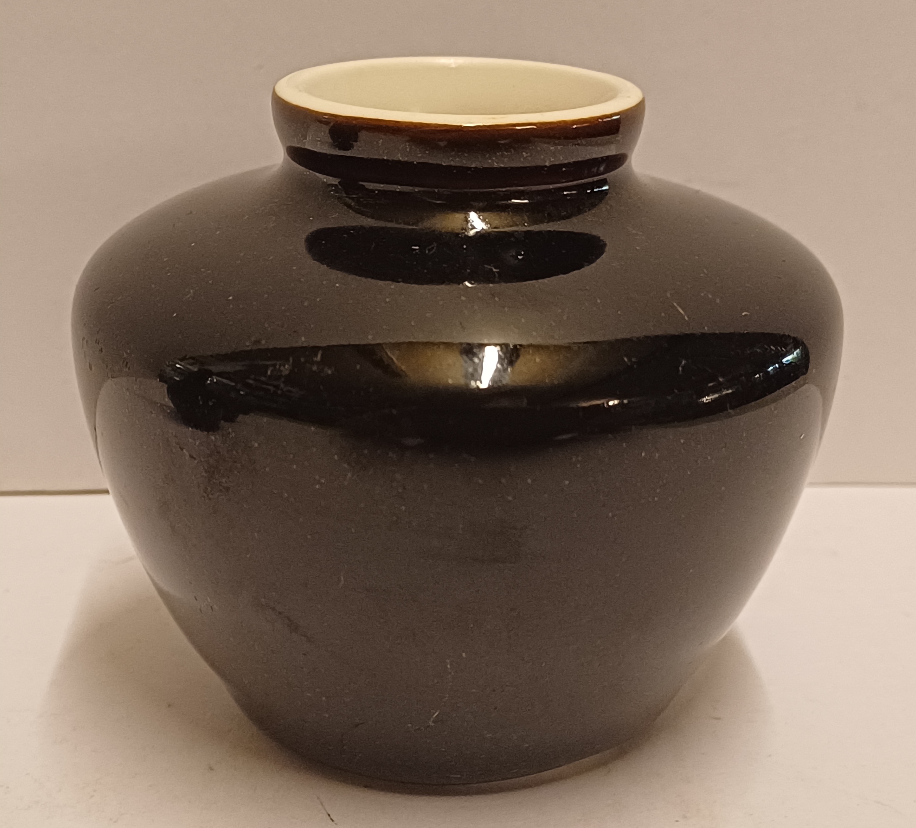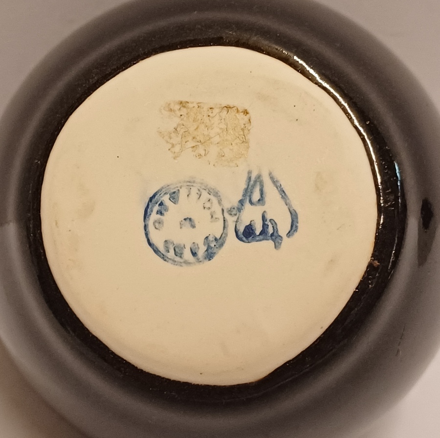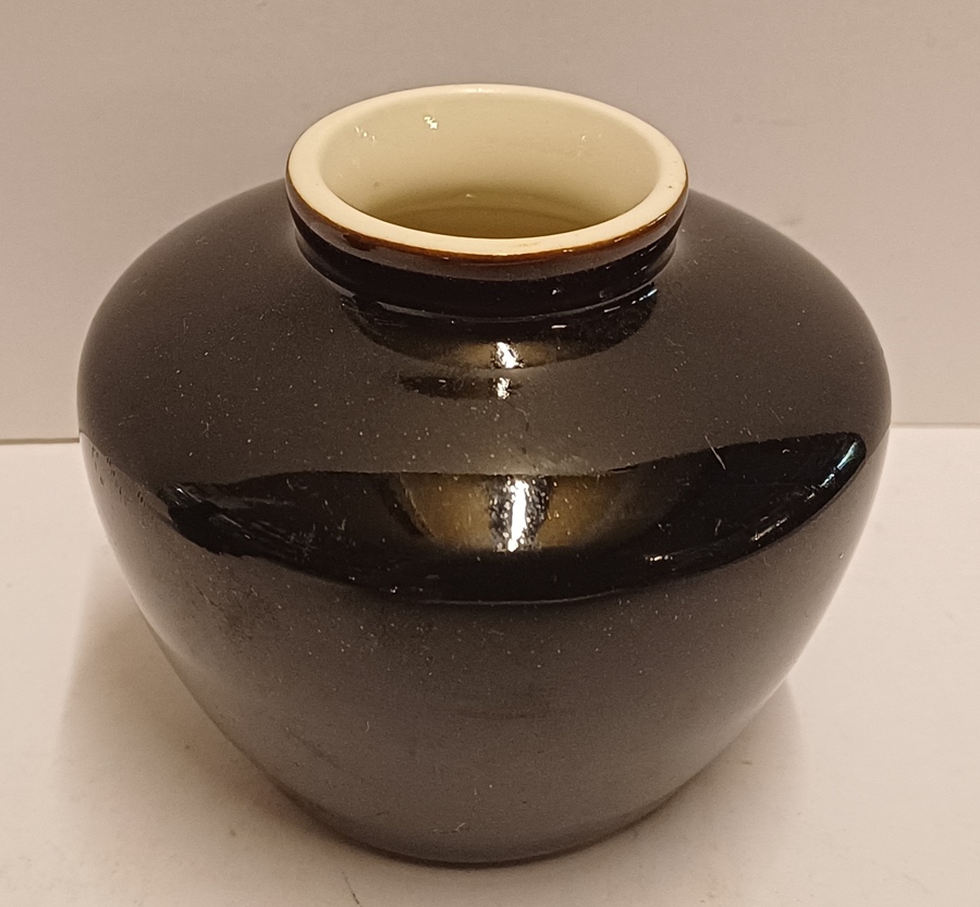 Wit porseleinen vaasje met bruine tenmoku glazuur. Ontwerp Han Knaap. Onderzijde met fabrieksmerk.