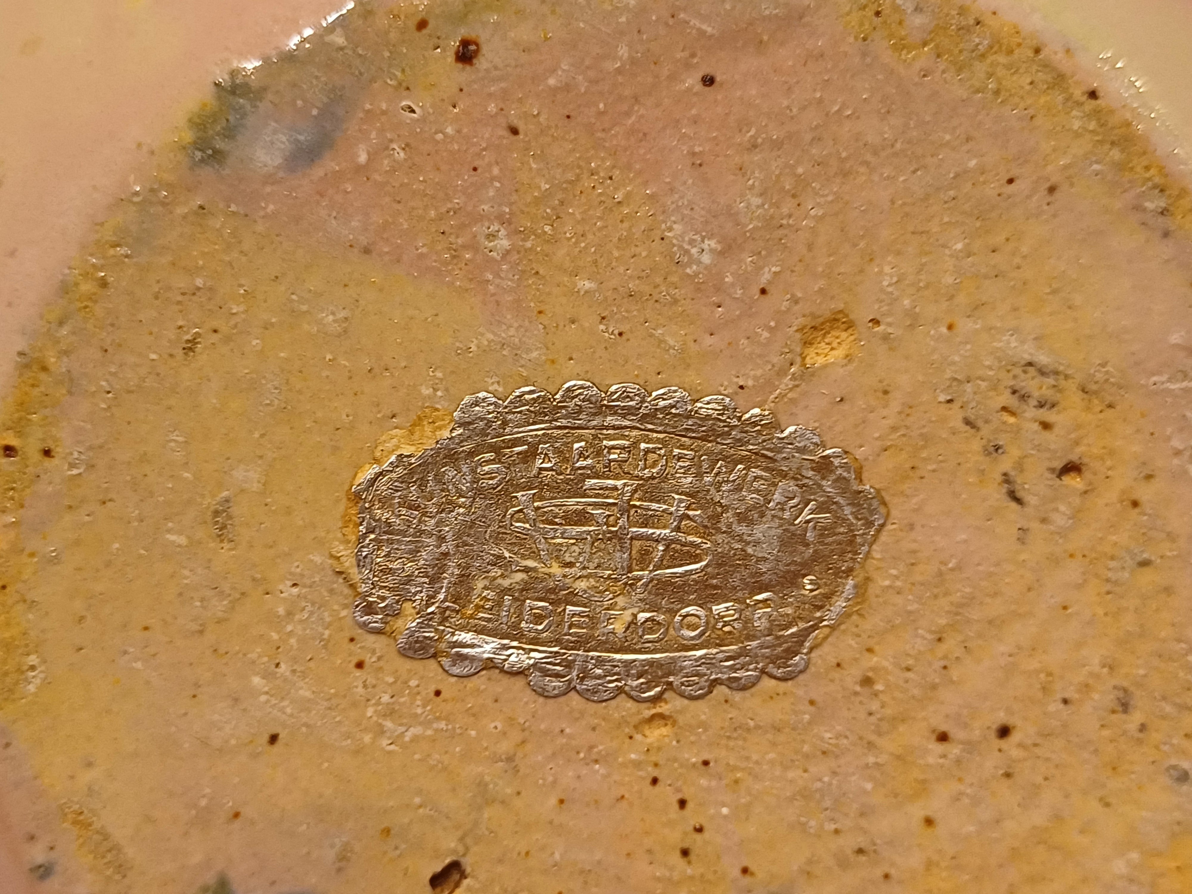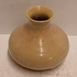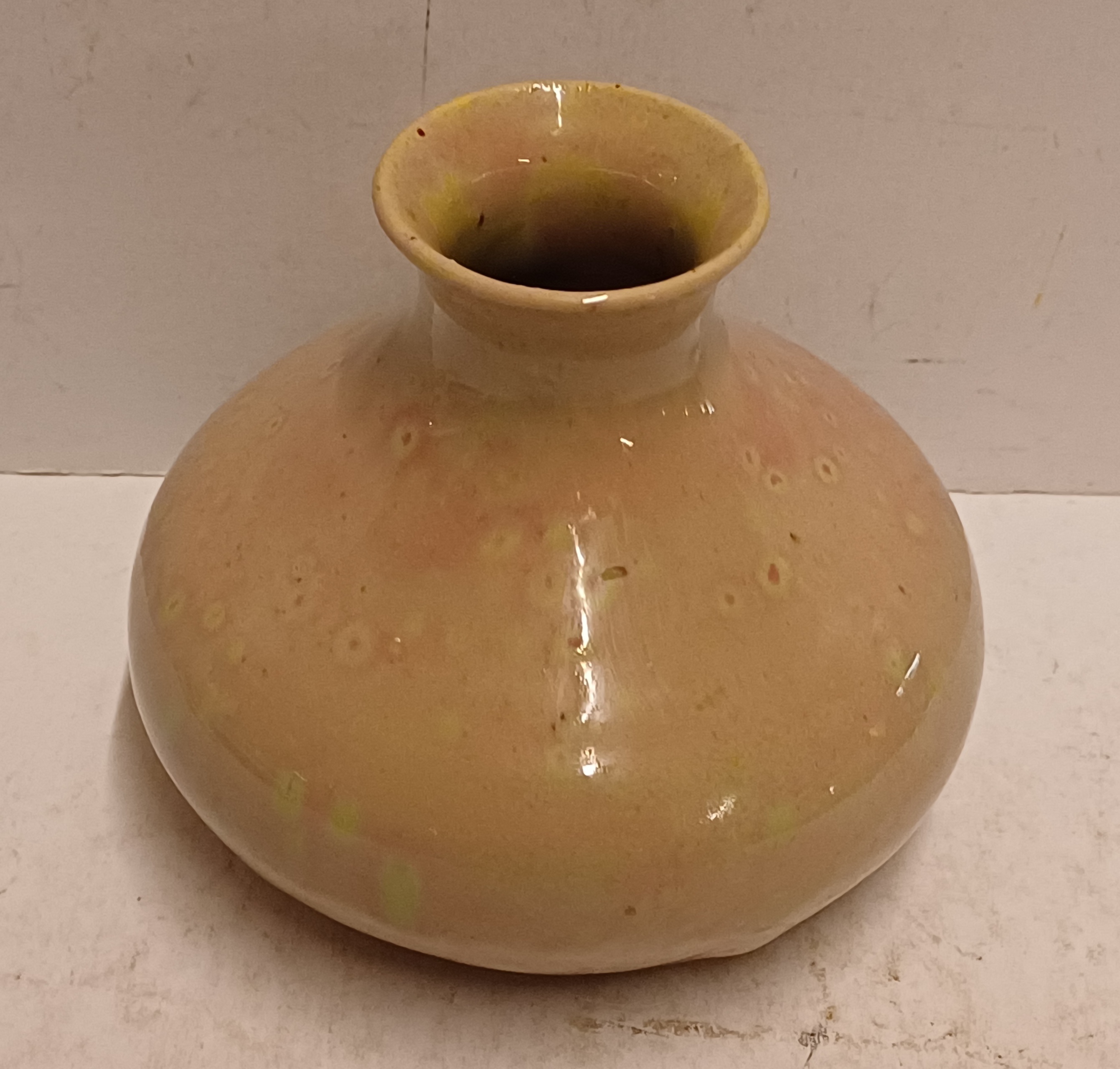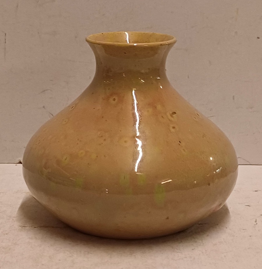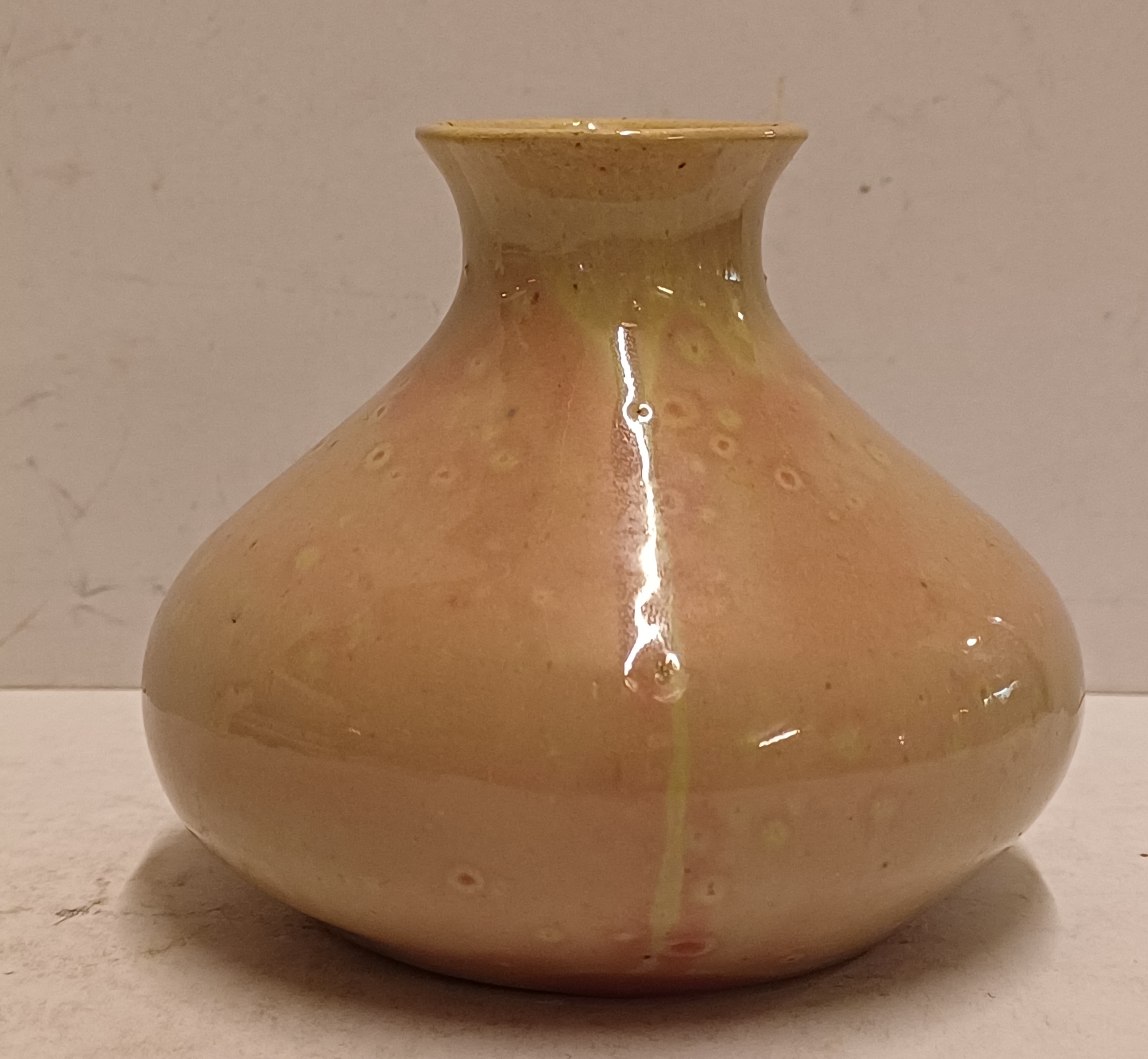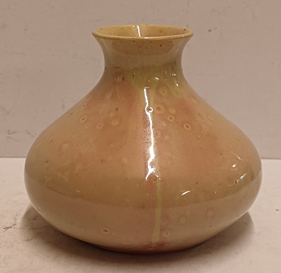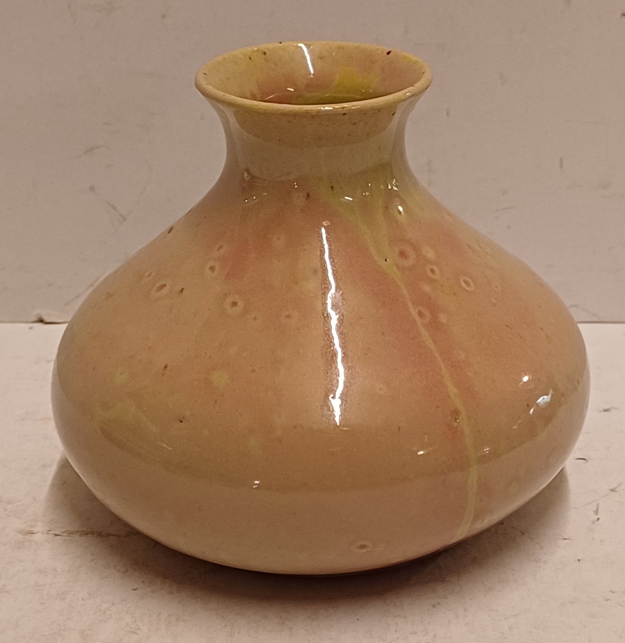 Aardewerken vaasje met rozige glazuur op creme fond. Onderzijde gemerkt met etiket Kunstaardewerk WJS Leiderdorp. Periode 1909-1916
