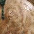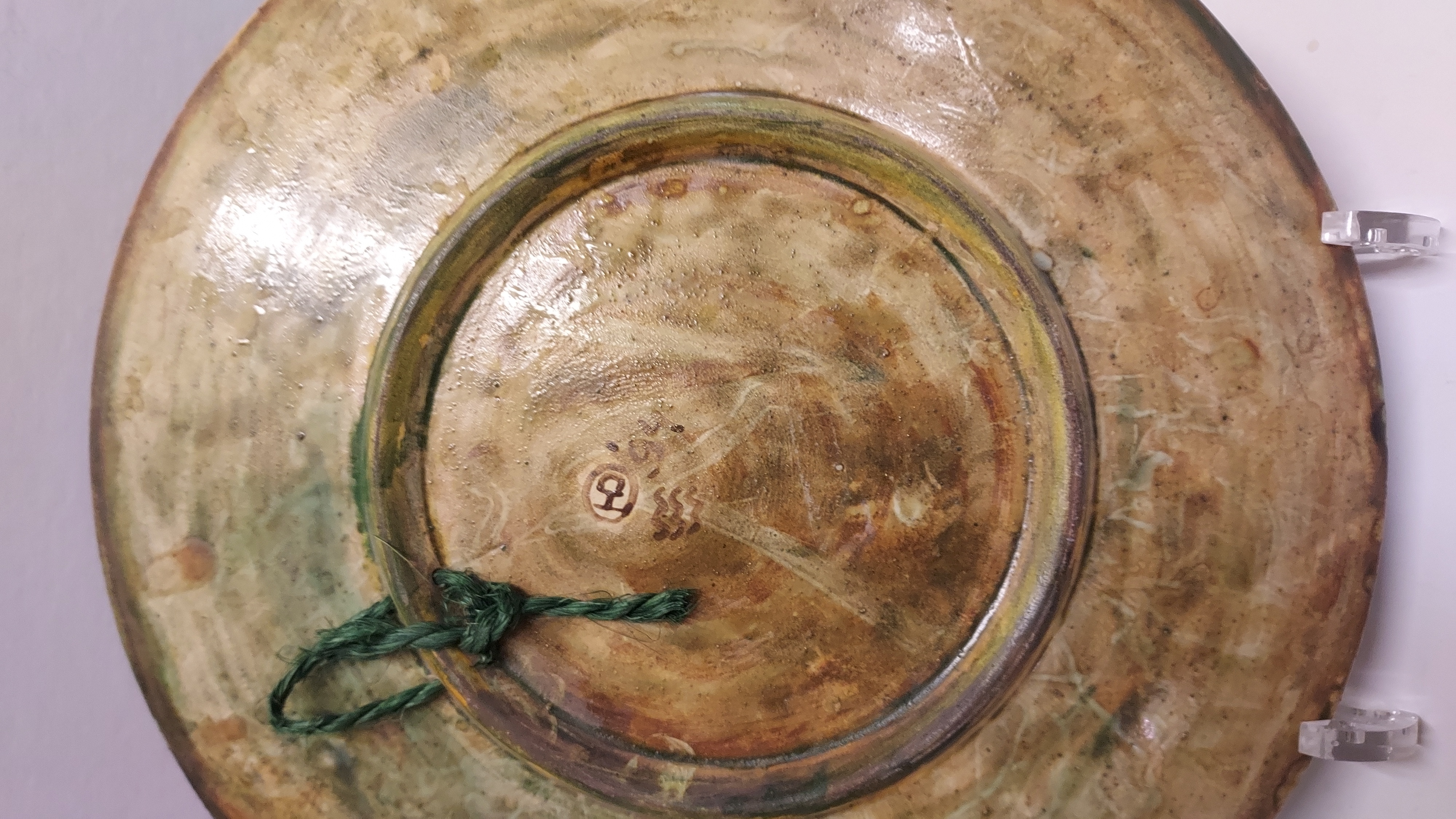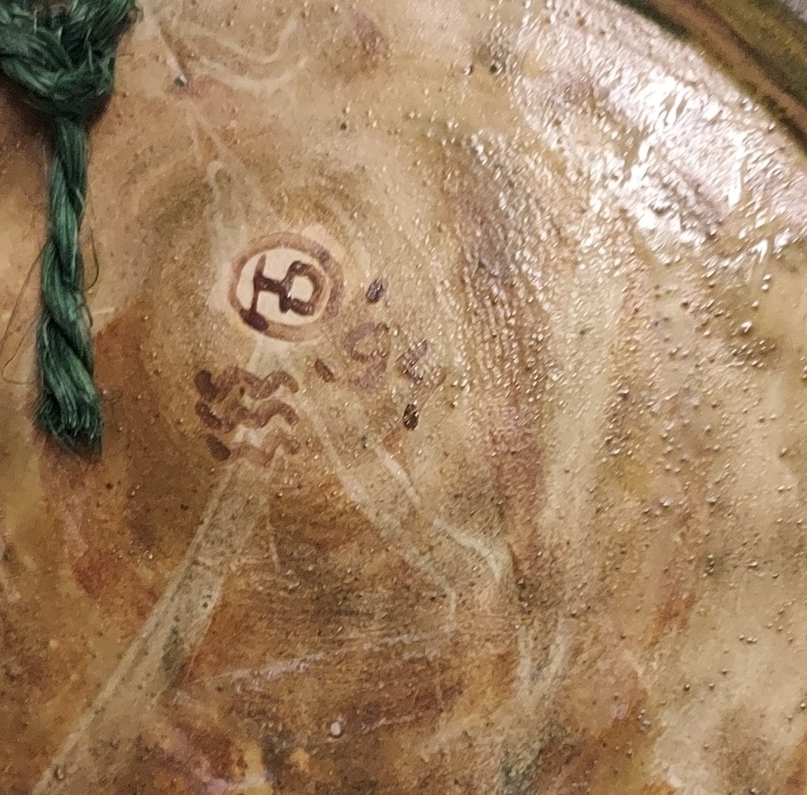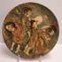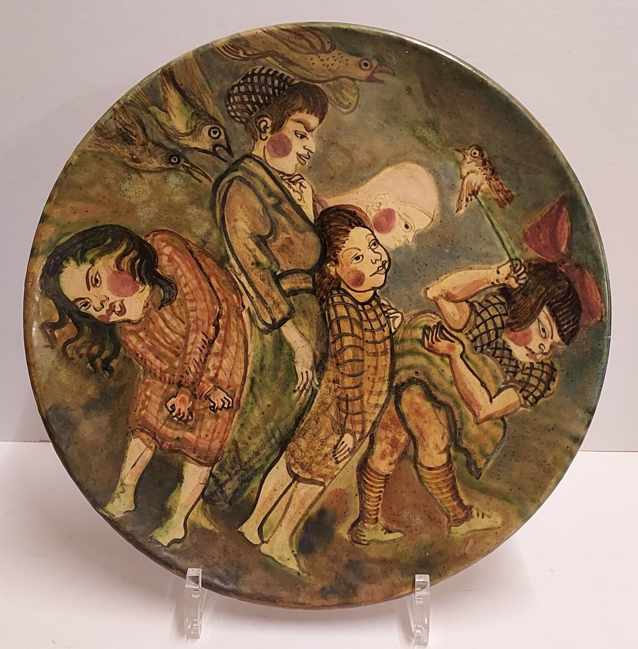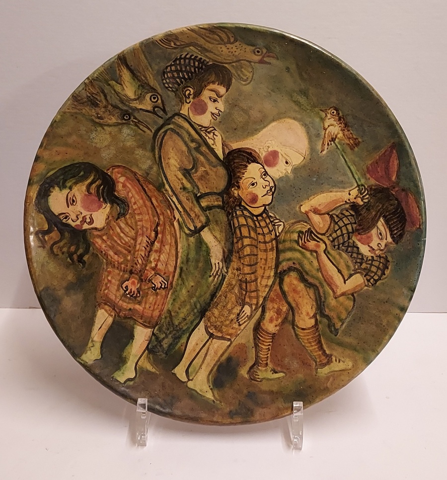 Een handgeschilderd bord met voorstelling van 4 figuren. Achterzijde met signatuur en datering '94.