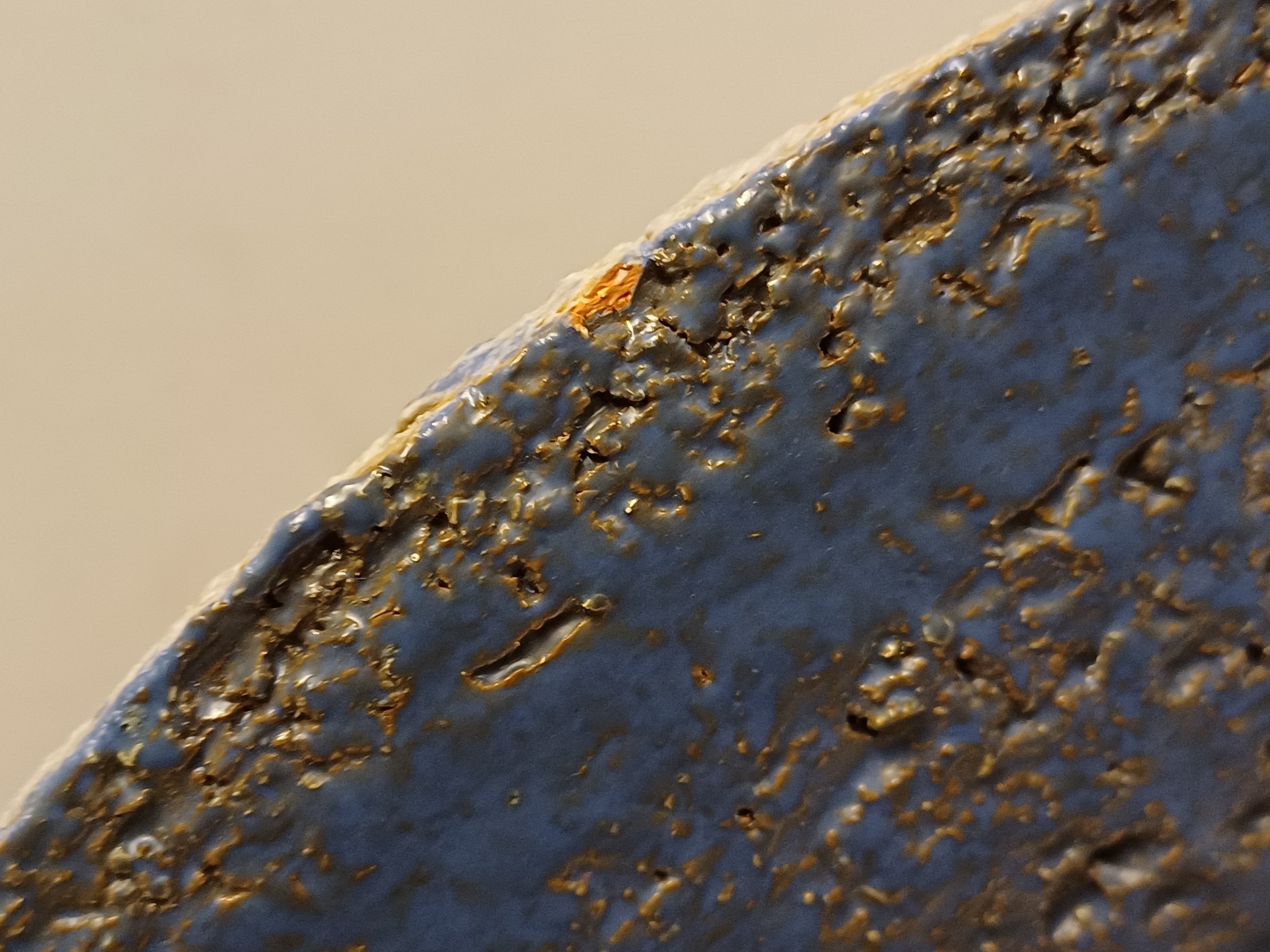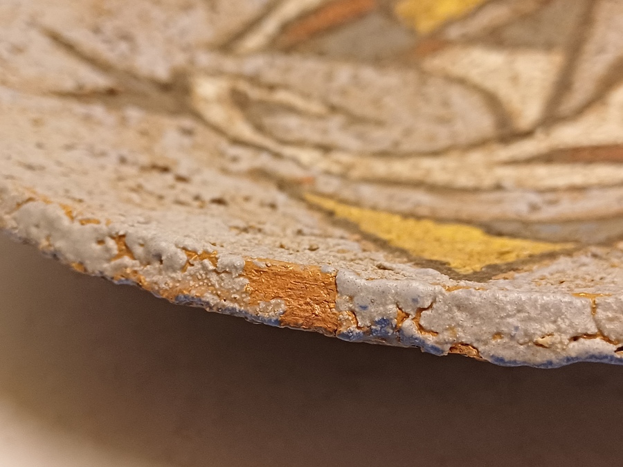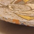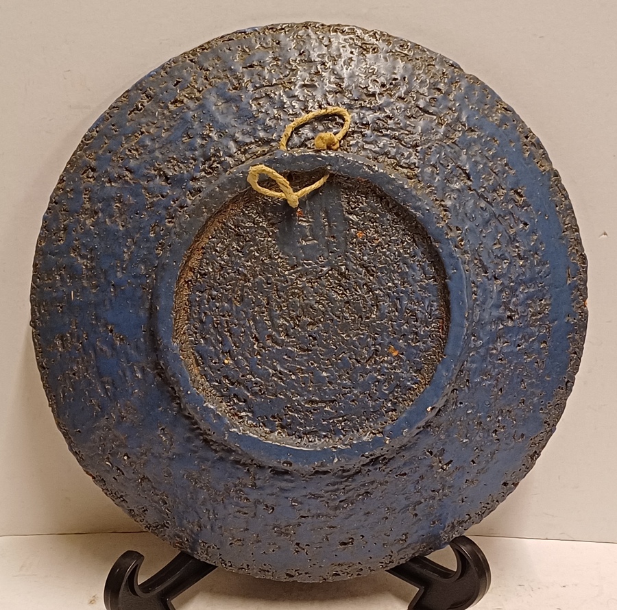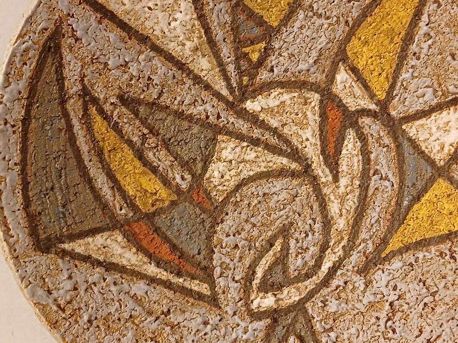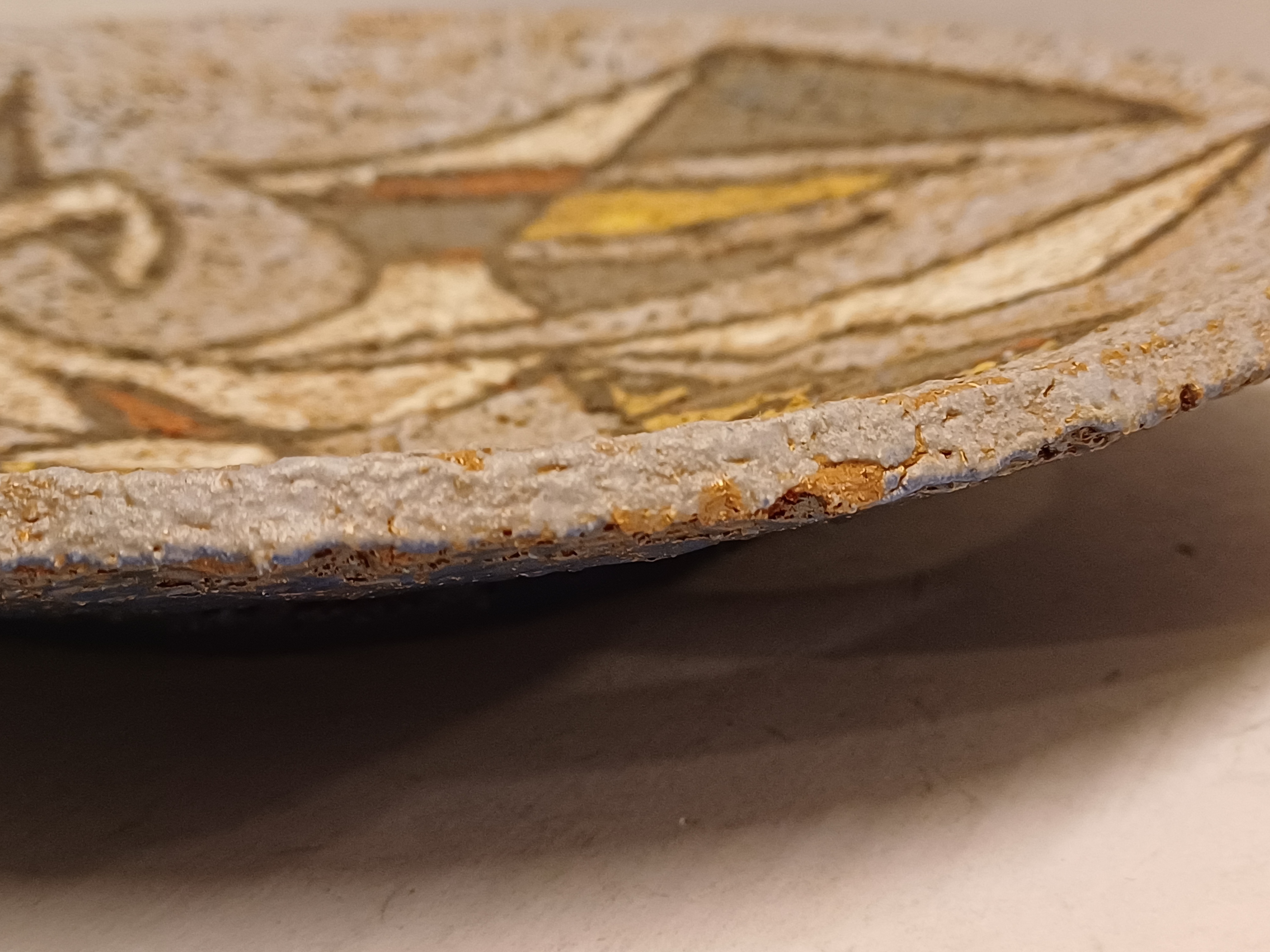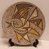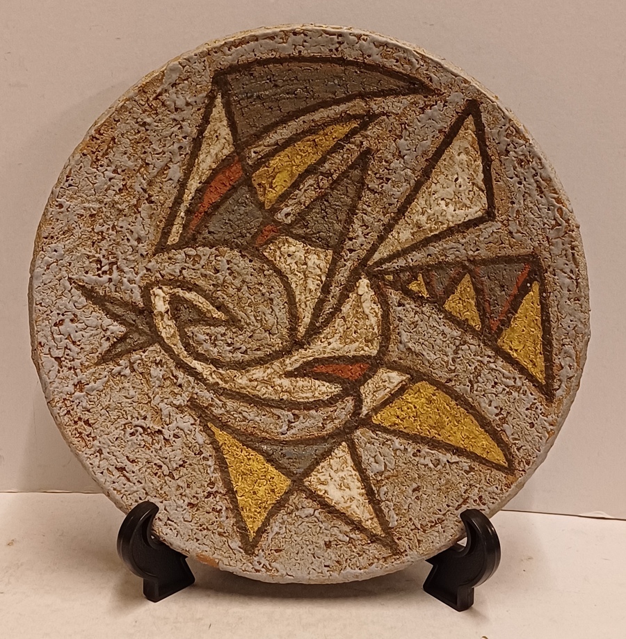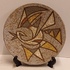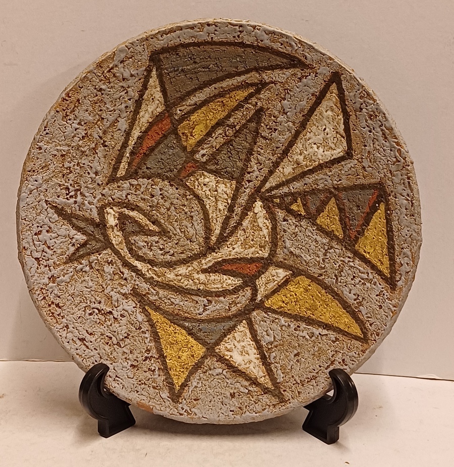 Aardewerken bord met uitgekerfde decoratie van een gestileerde vogel. Niet gesigneerd.