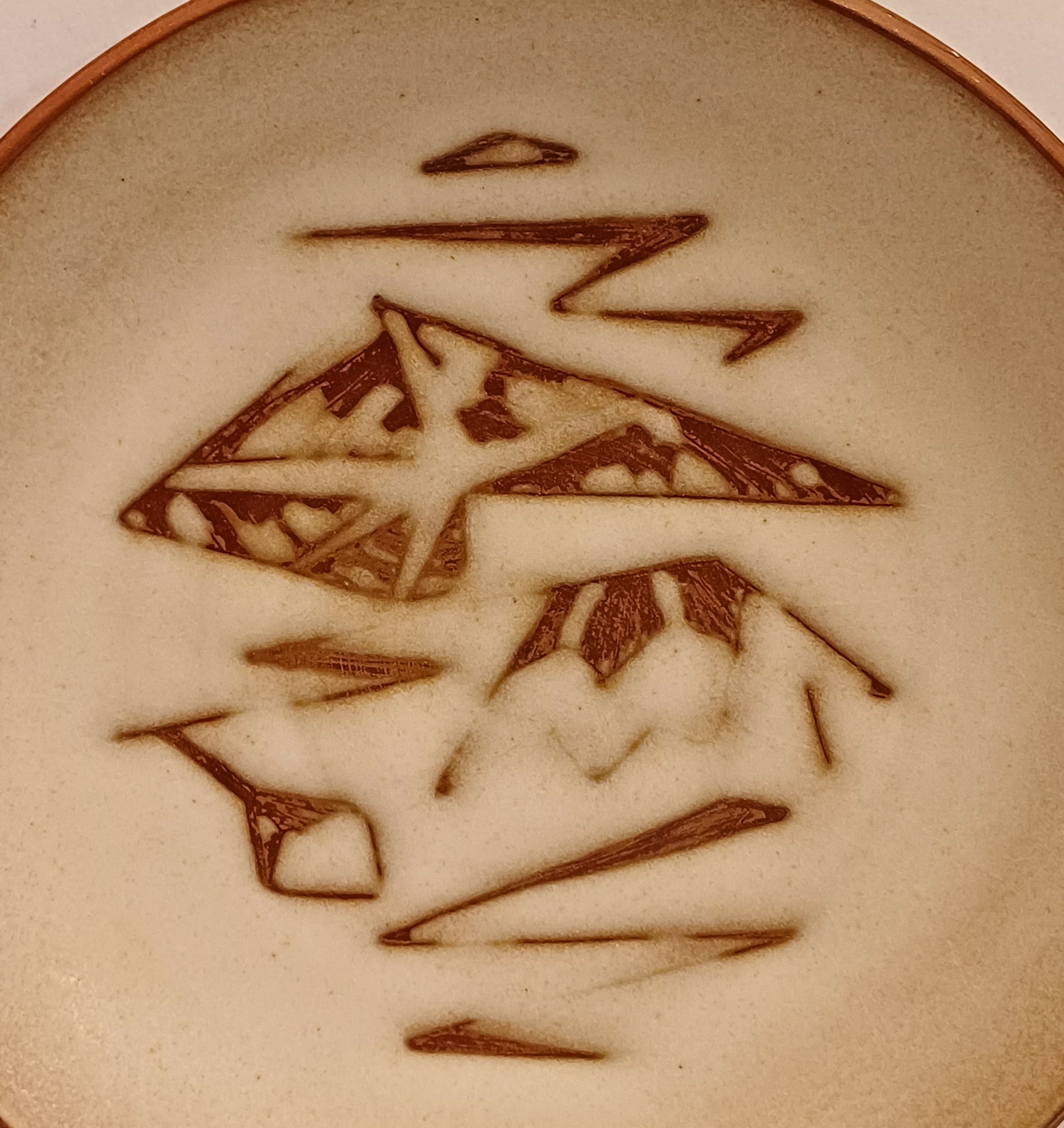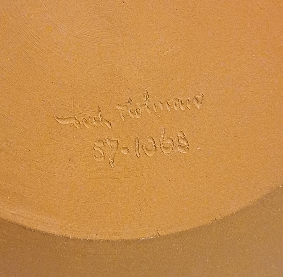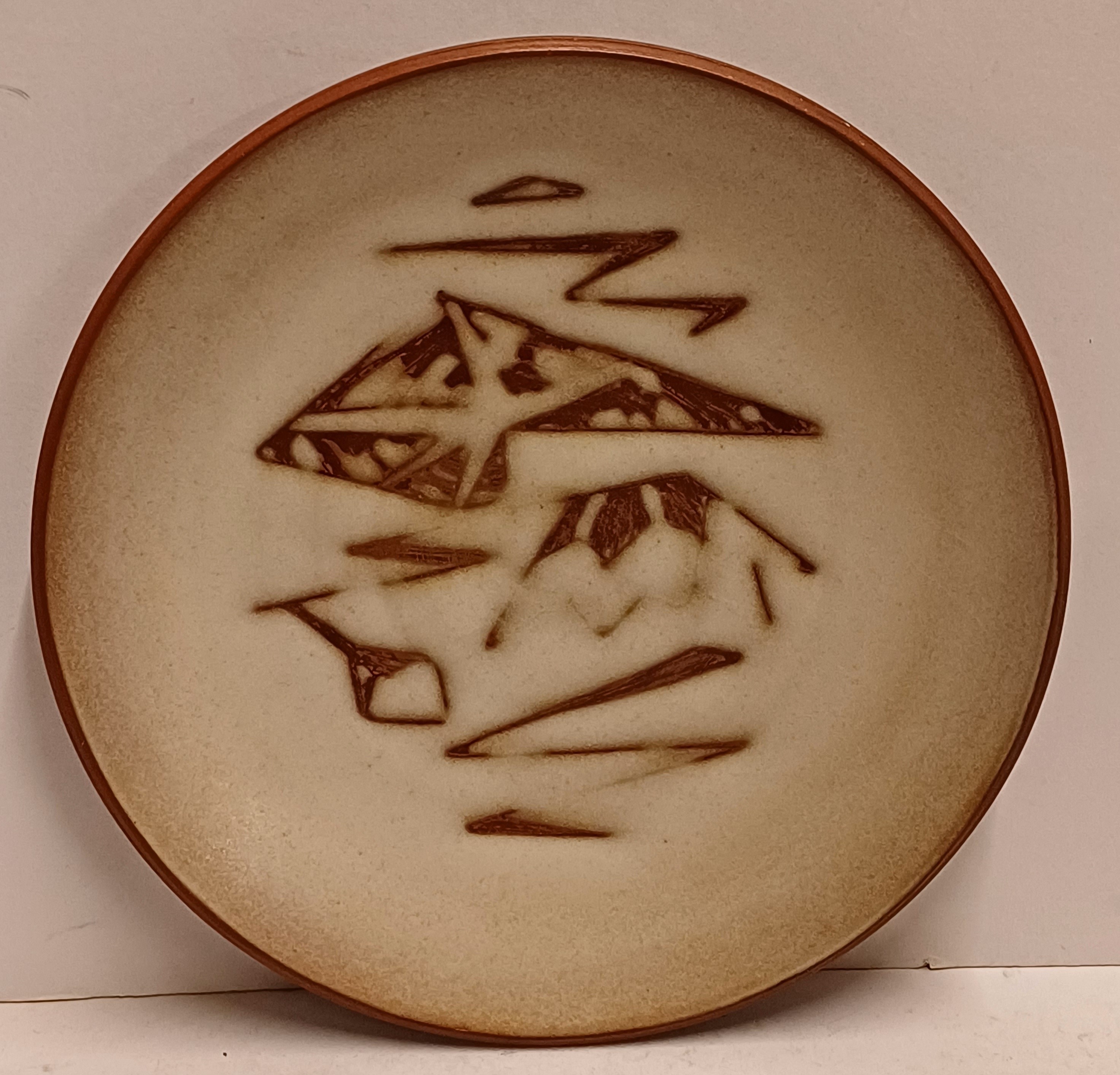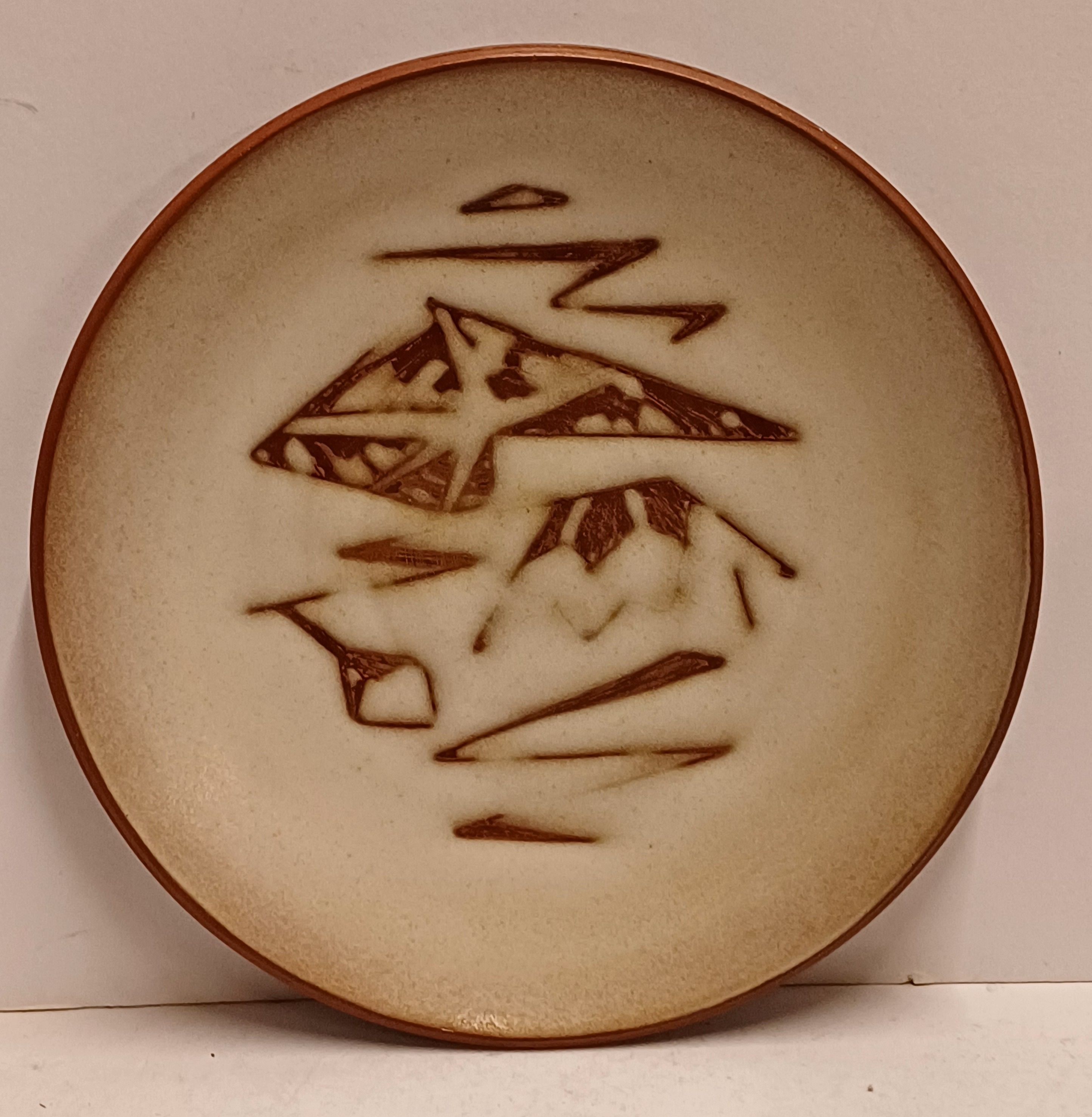 陶土盘,涂有白色釉,抽象装饰。背面签名1957年。
