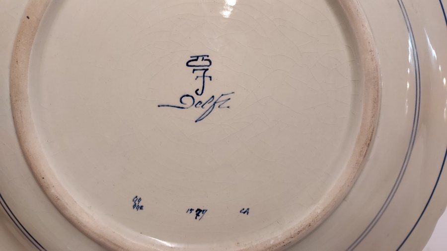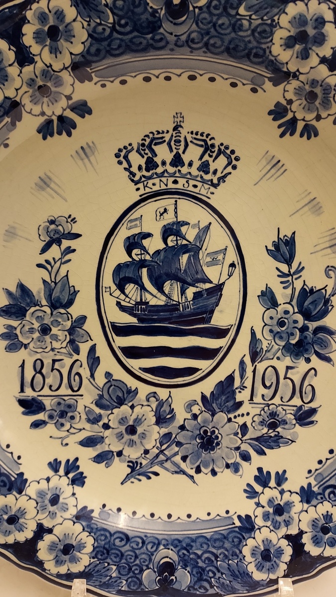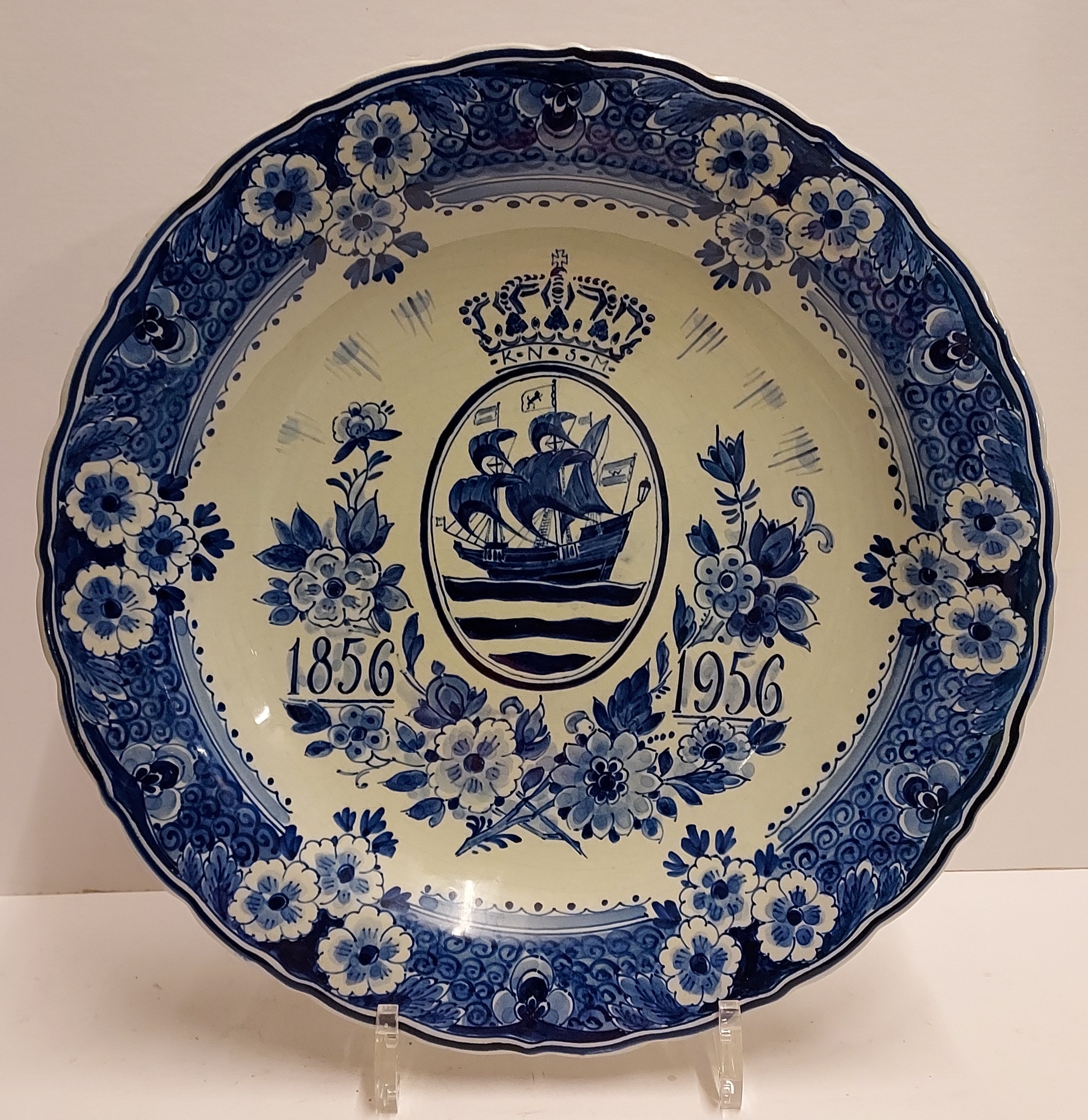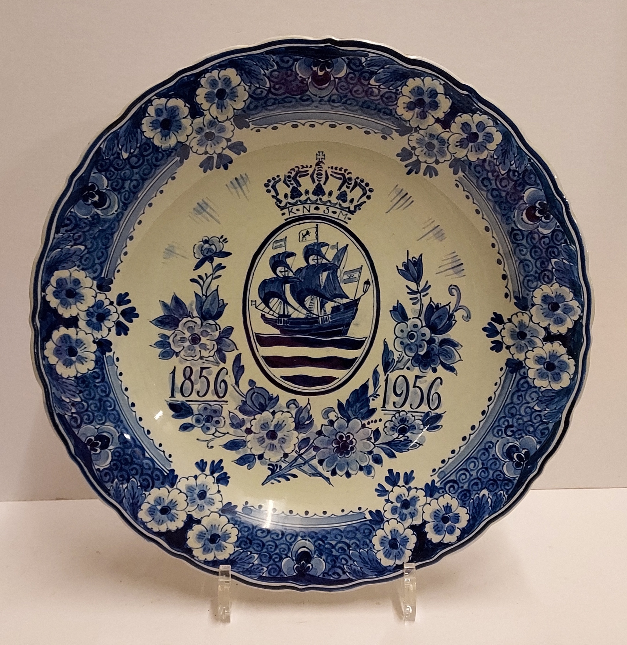 代尔夫特蓝色挂盘,装饰有 KNSM 标志和 1856-1956 年日期。背面带有工厂标志、年份字母和画家签名。