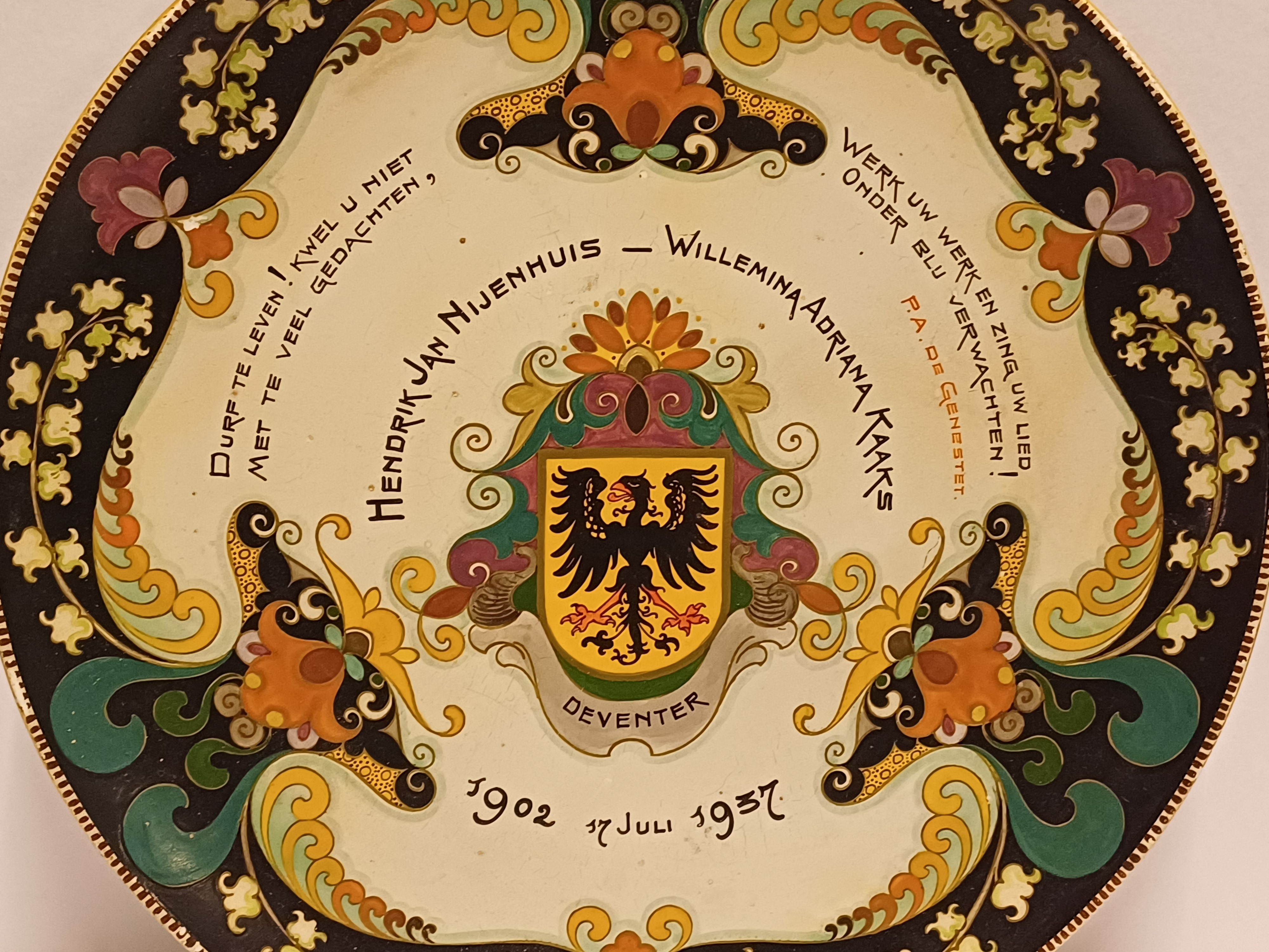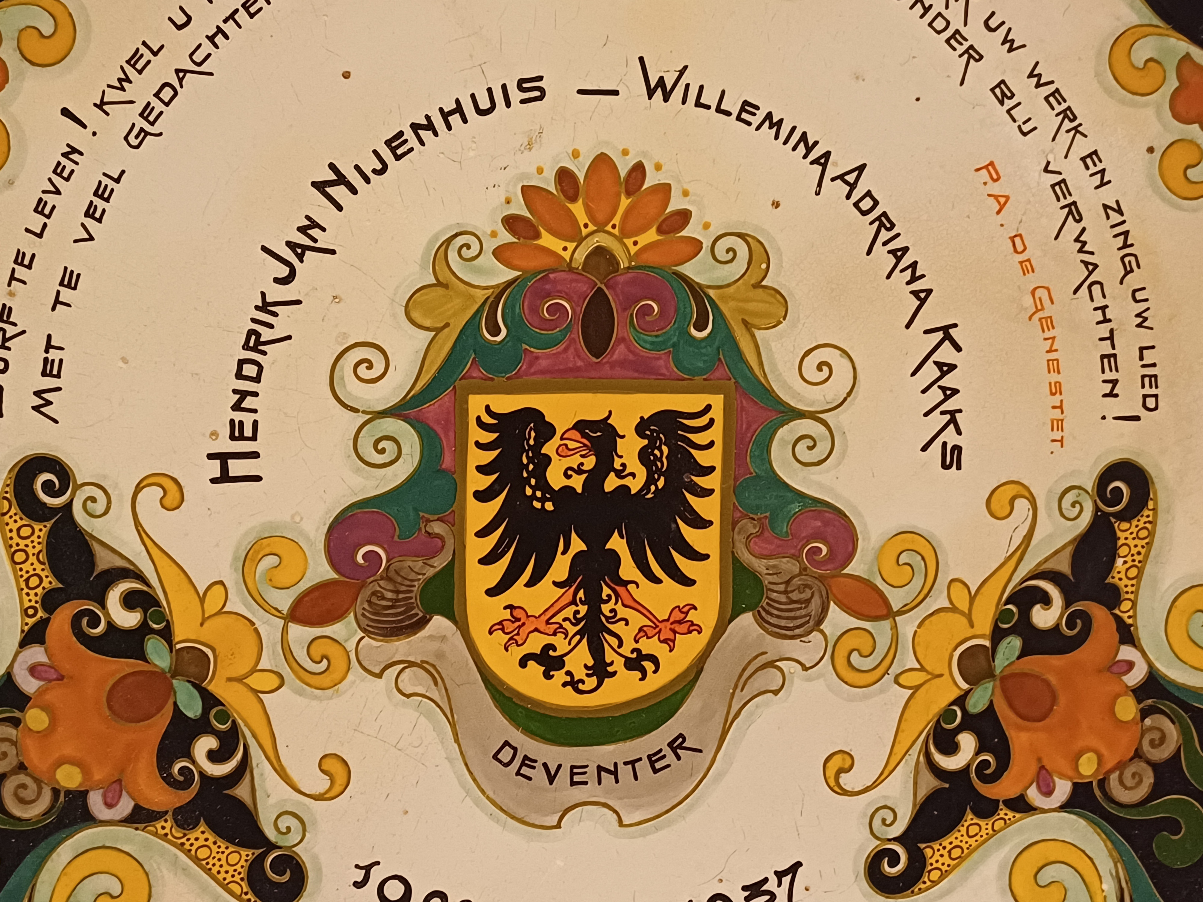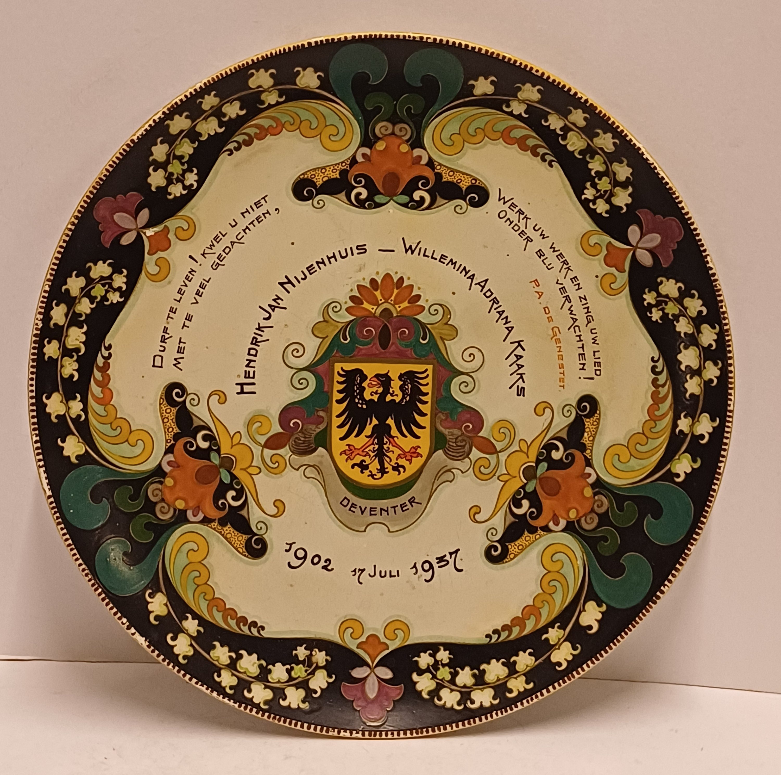 Platelenbord met koudlak beschildering, 35 jarig huwelijksbordHendrik Jan Nijenhuis & Wilhelmina Adriana Kaaks in 1937. Achterzijde gesmerkt