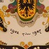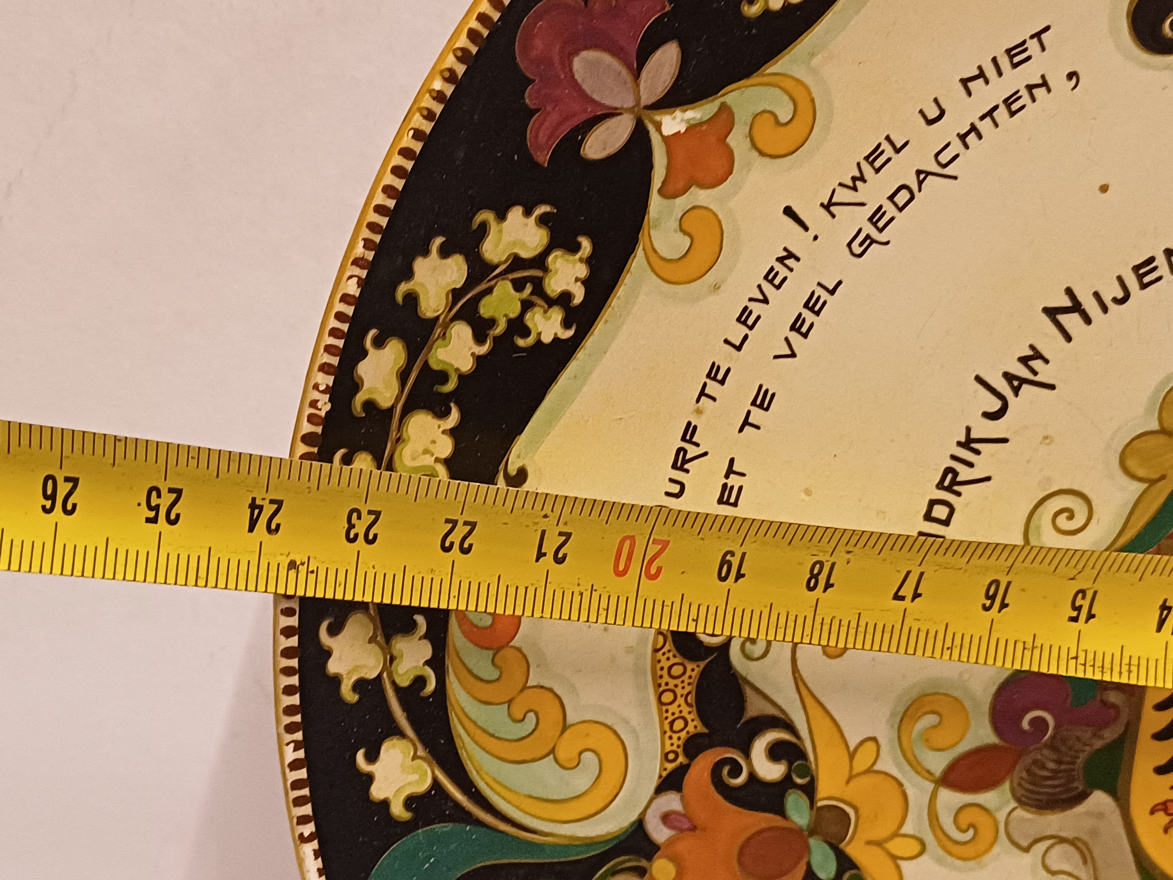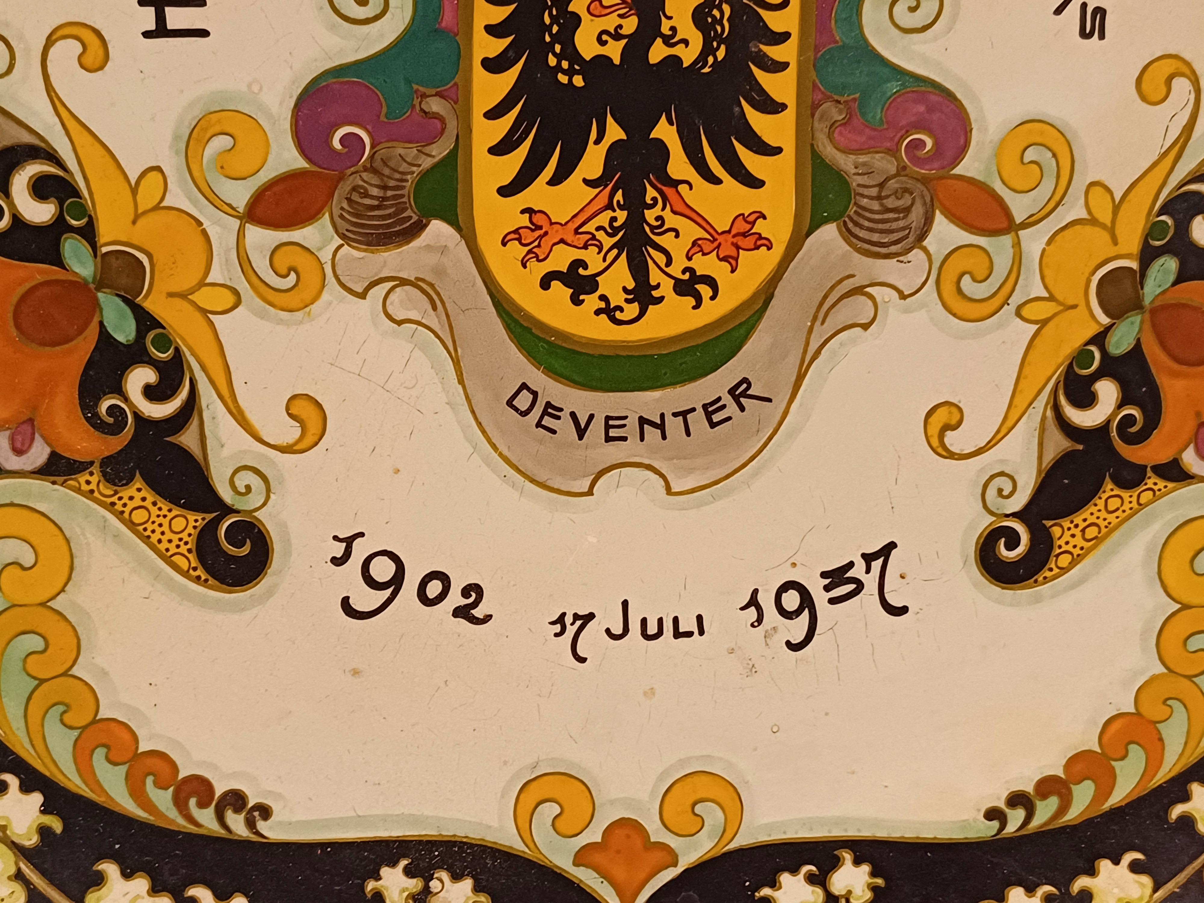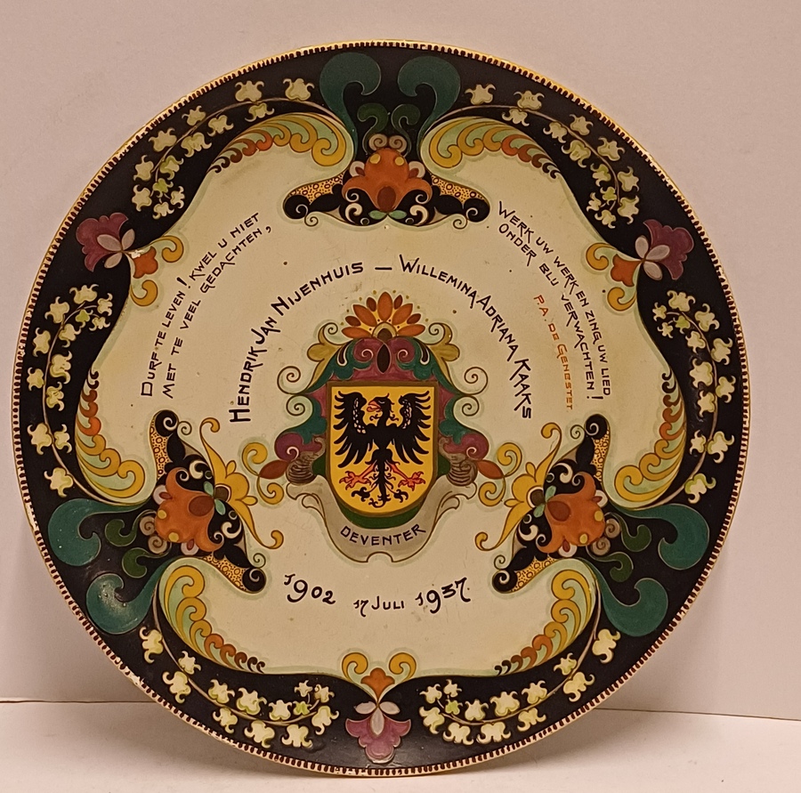 Platelenbord met koudlak beschildering, 35 jarig huwelijksbordHendrik Jan Nijenhuis & Wilhelmina Adriana Kaaks in 1937. Achterzijde gesmerkt