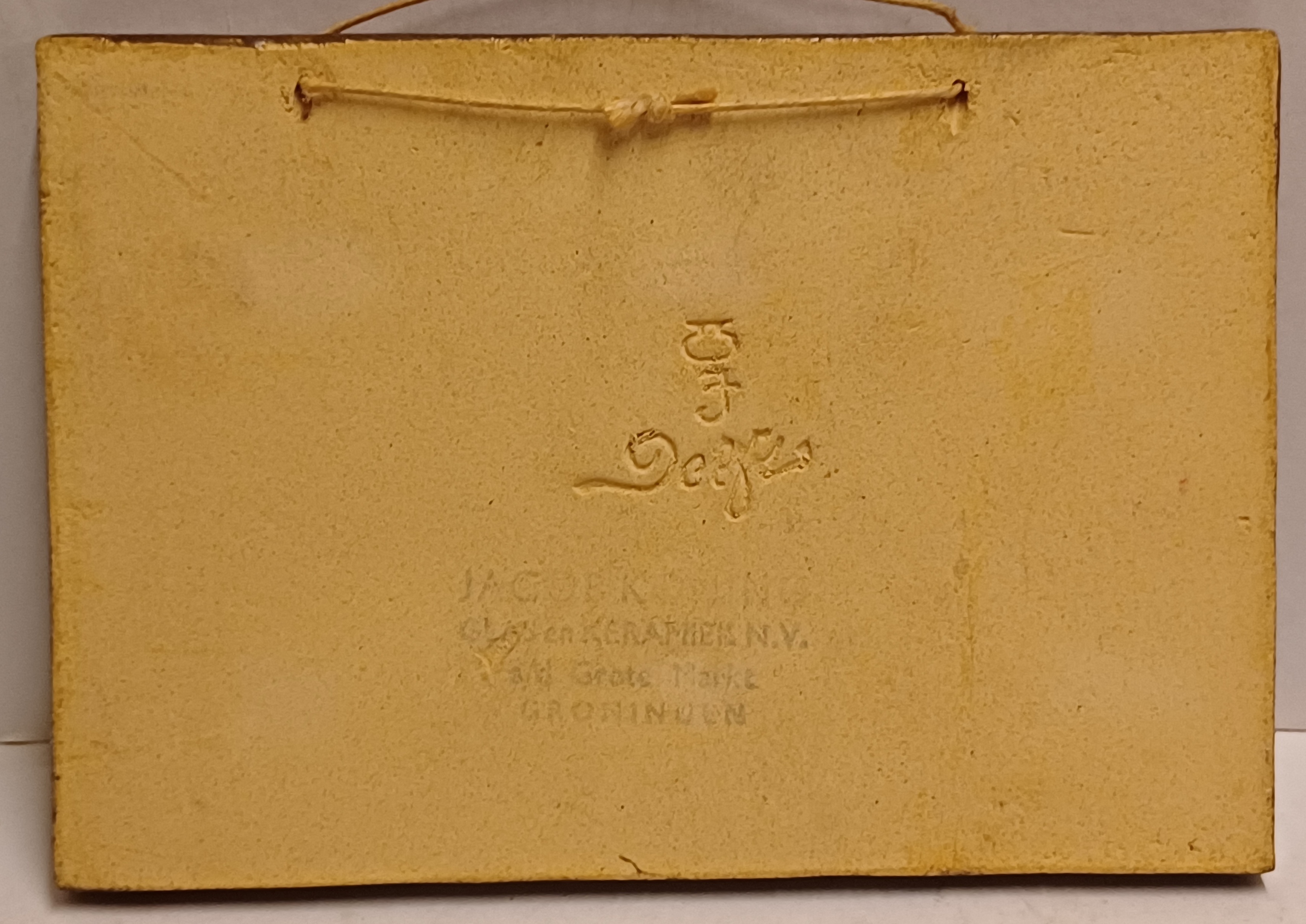 景泰蓝瓷砖,带有 Grote Markt 老建筑的图案。背面带有工厂标志。