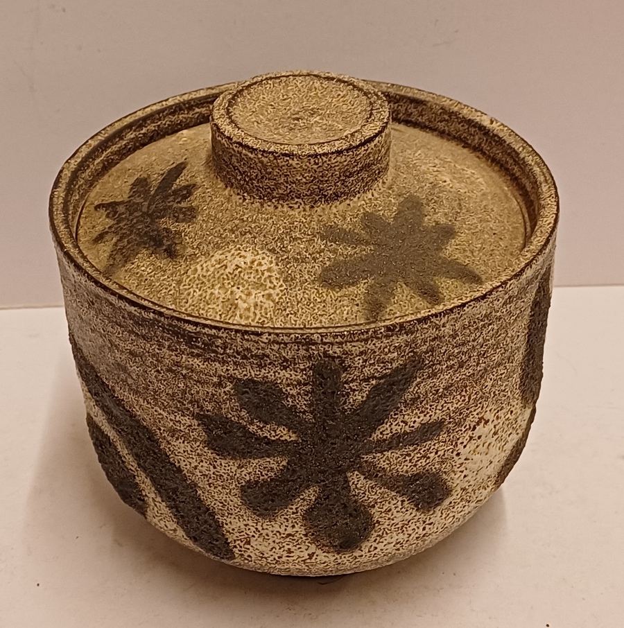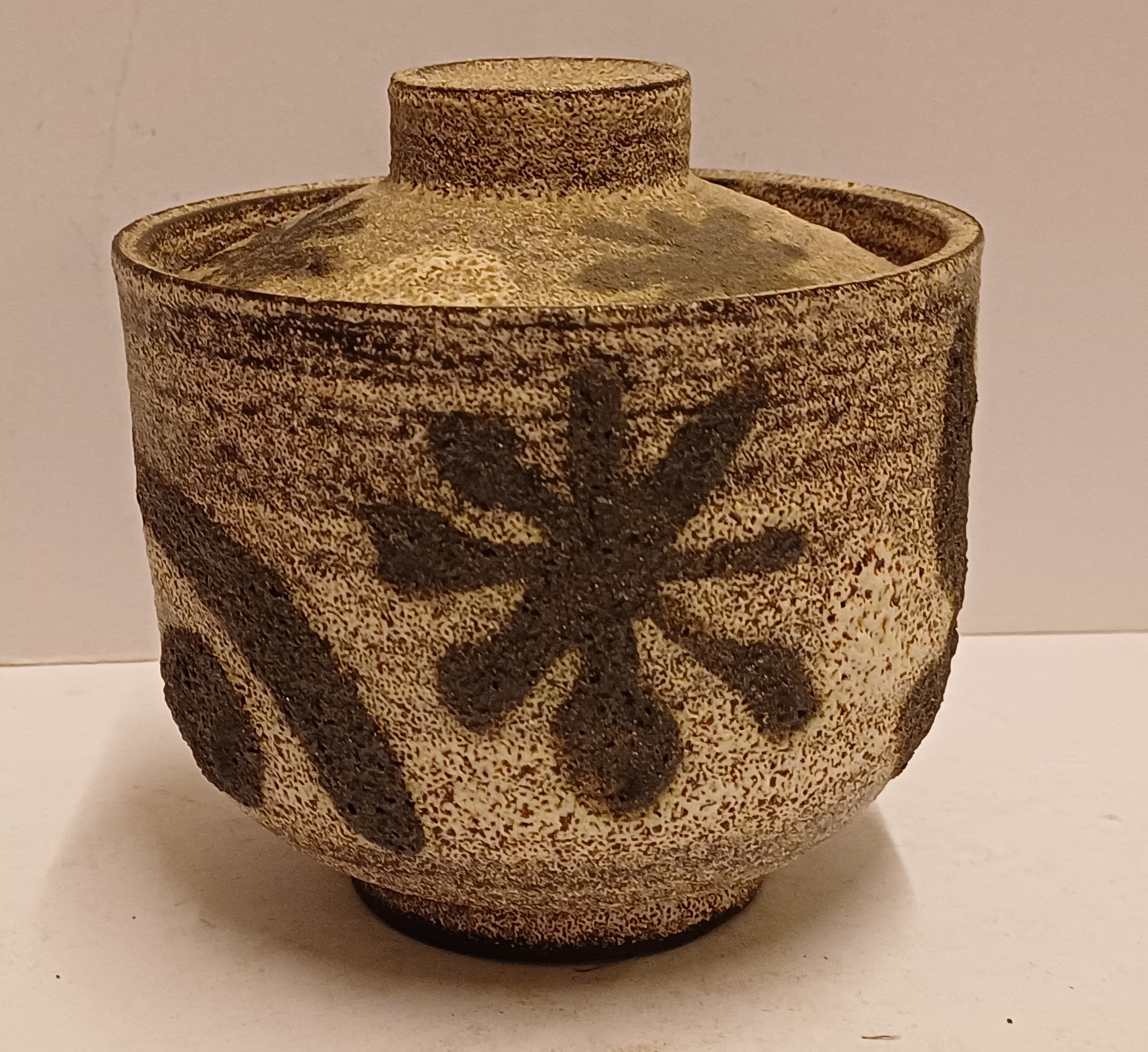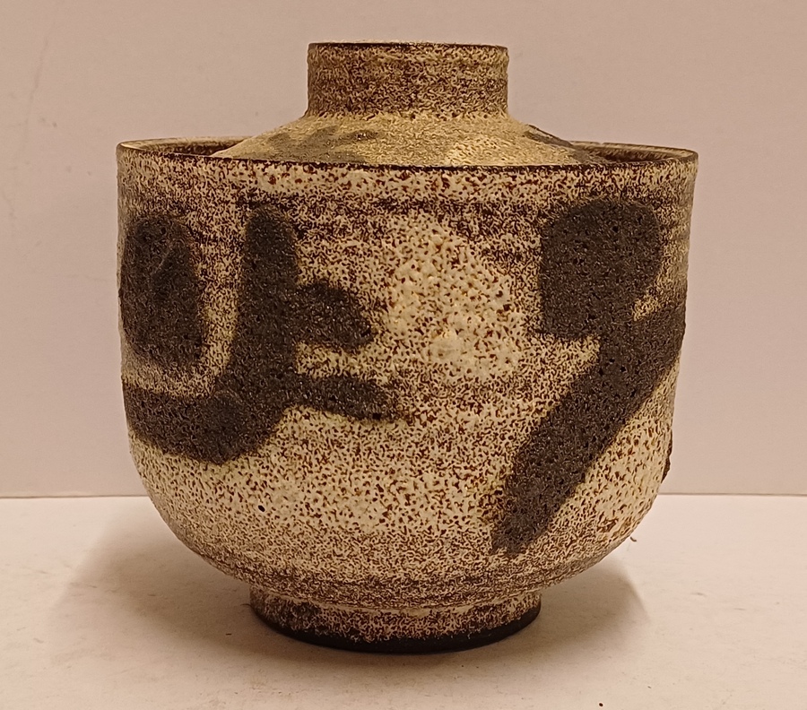 Dekselpot met abstracte decoratie in witte en zwarte bruis glazuur. Onderzijde gesigneerd.