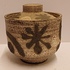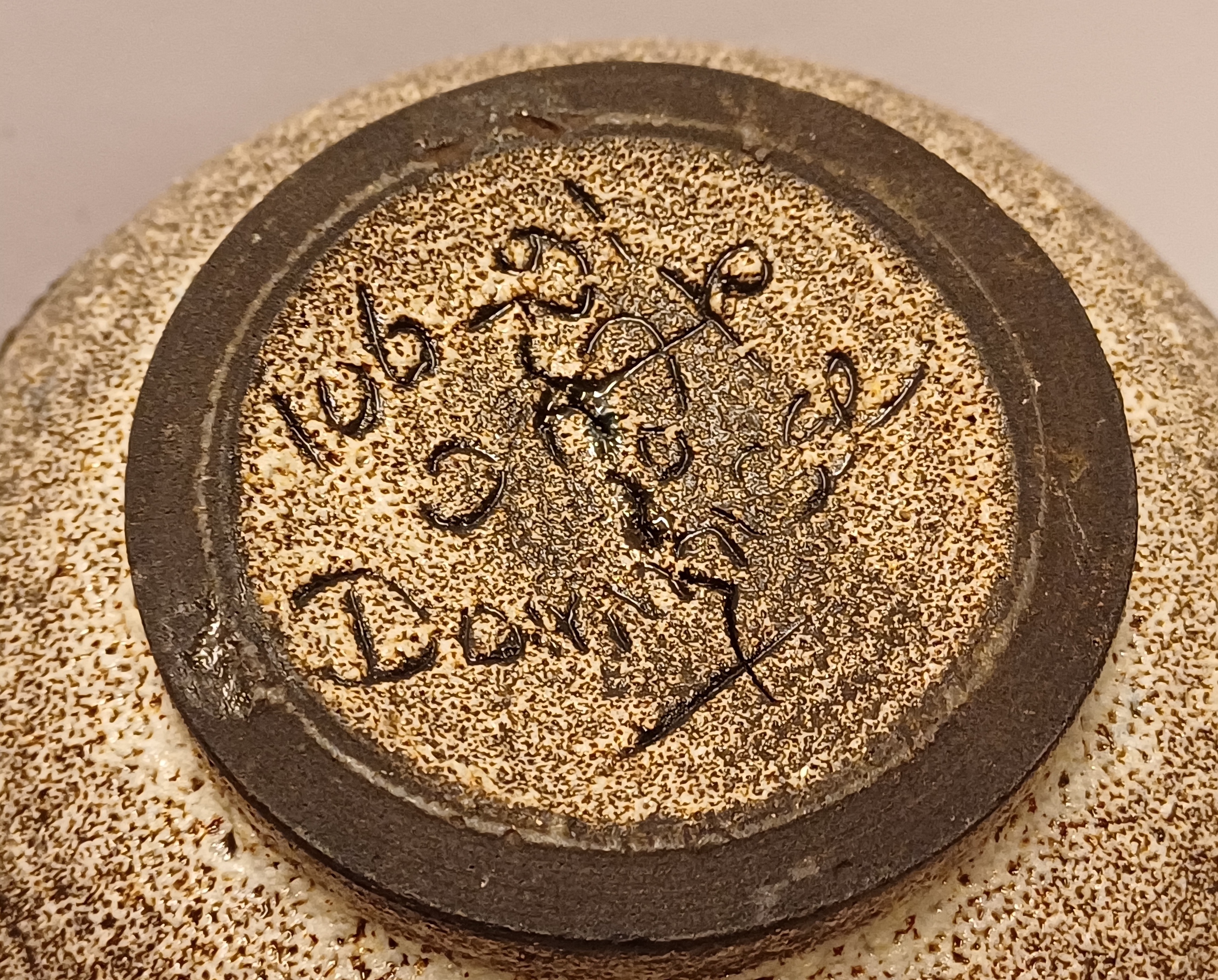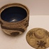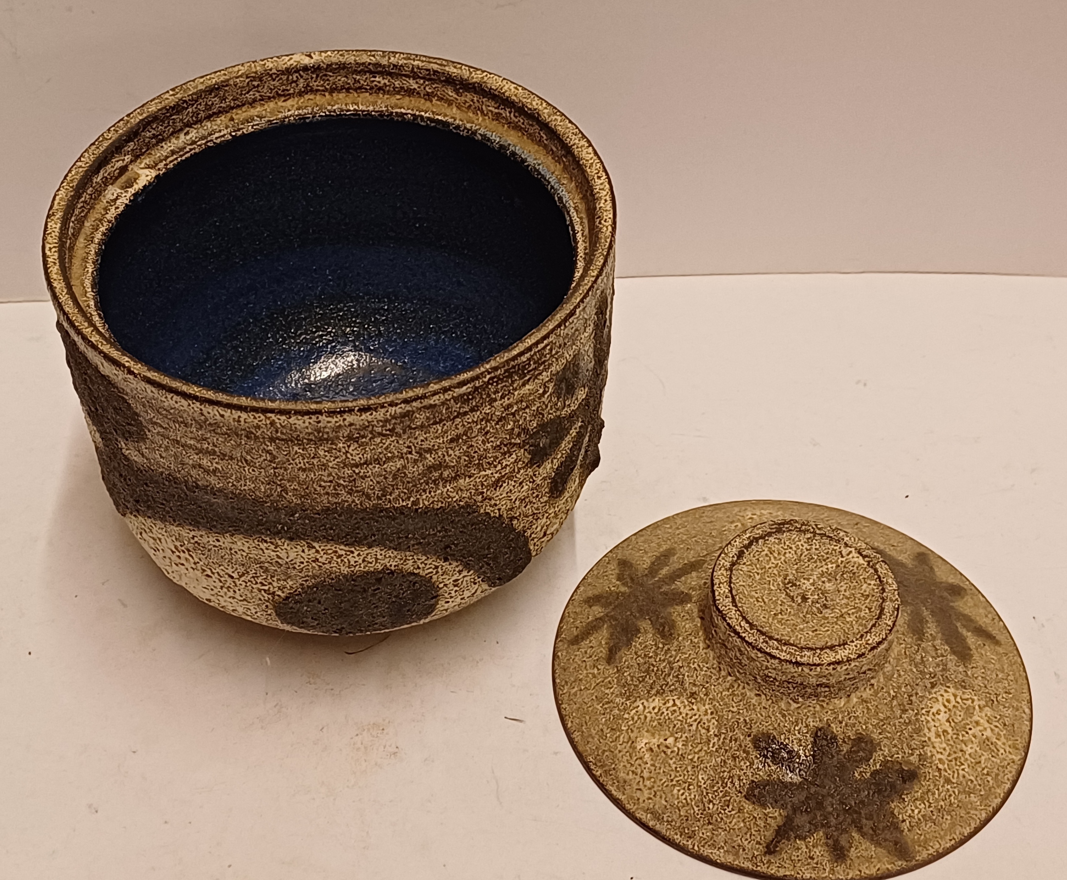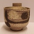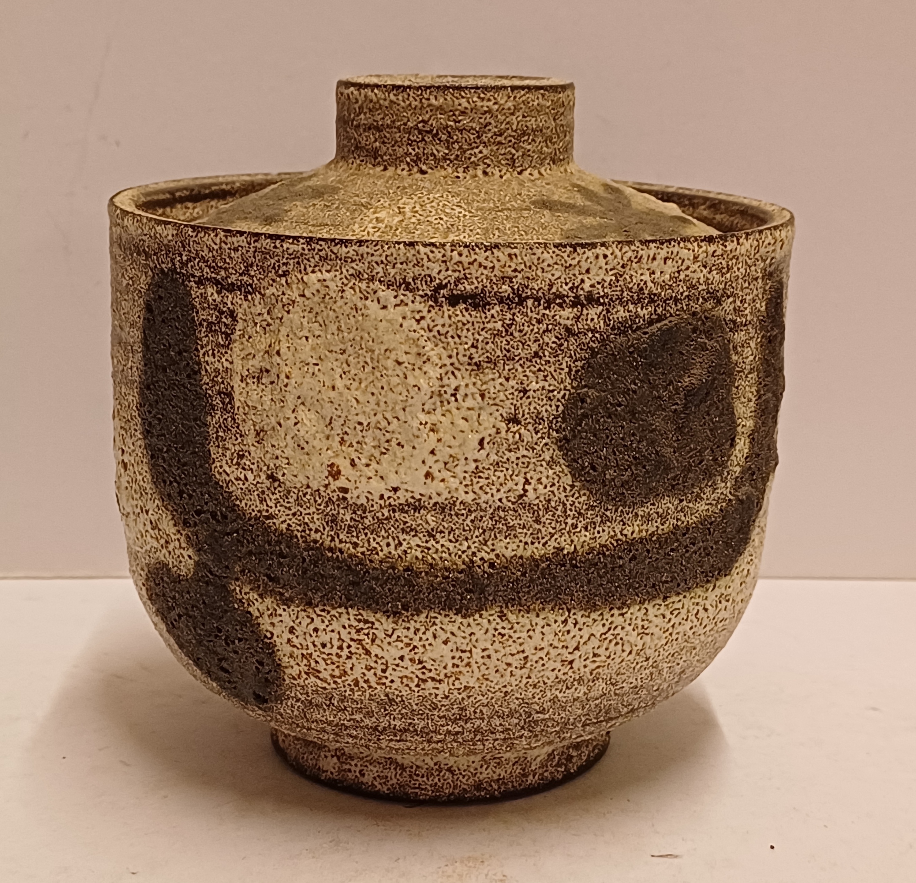 Dekselpot met abstracte decoratie in witte en zwarte bruis glazuur. Onderzijde gesigneerd.