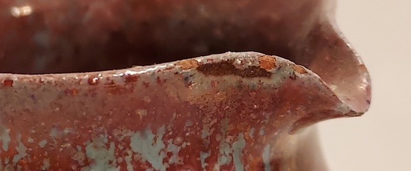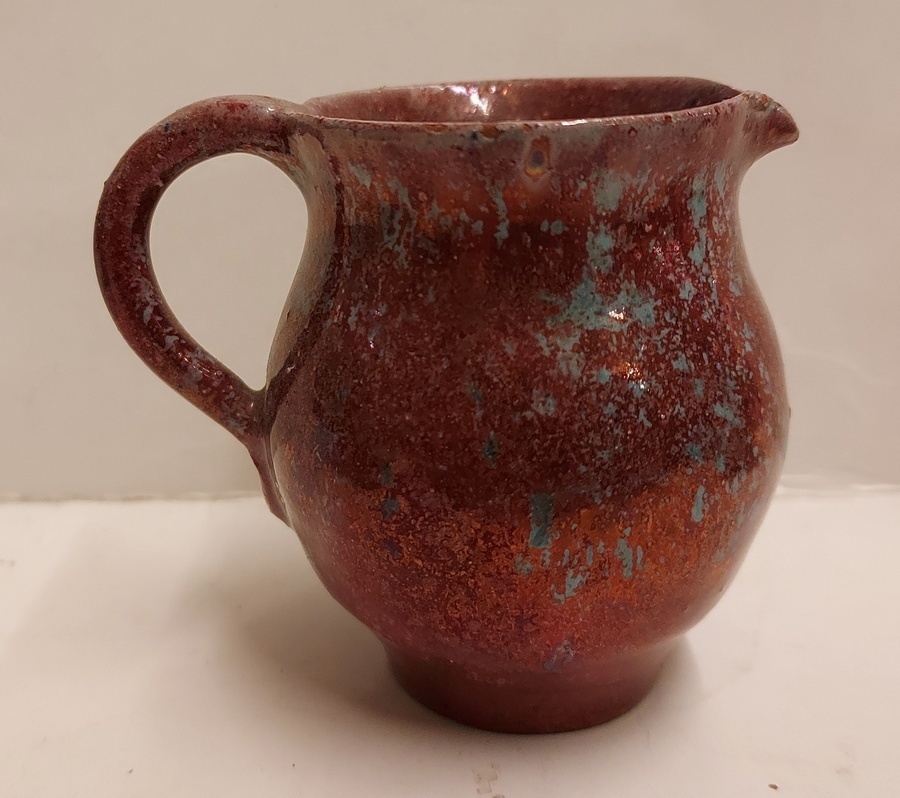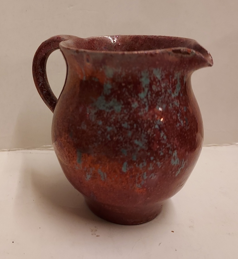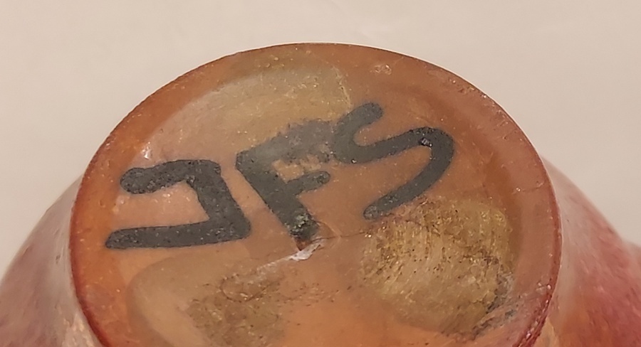 带有珠光釉的小倒水壶。底部签名为 JFS