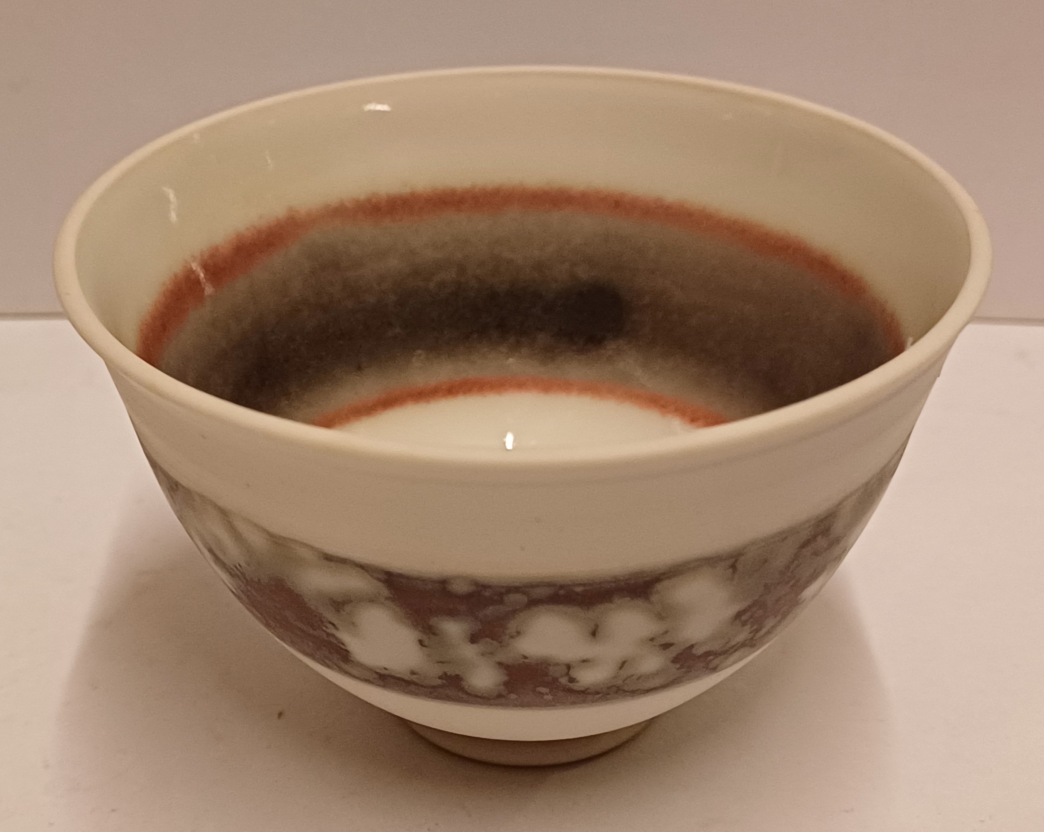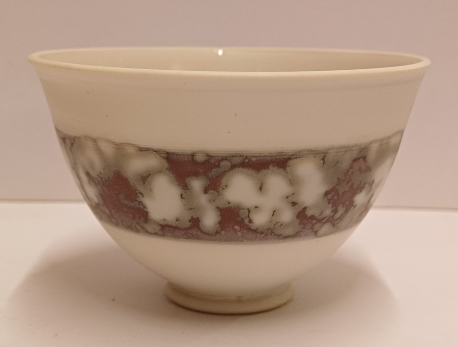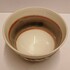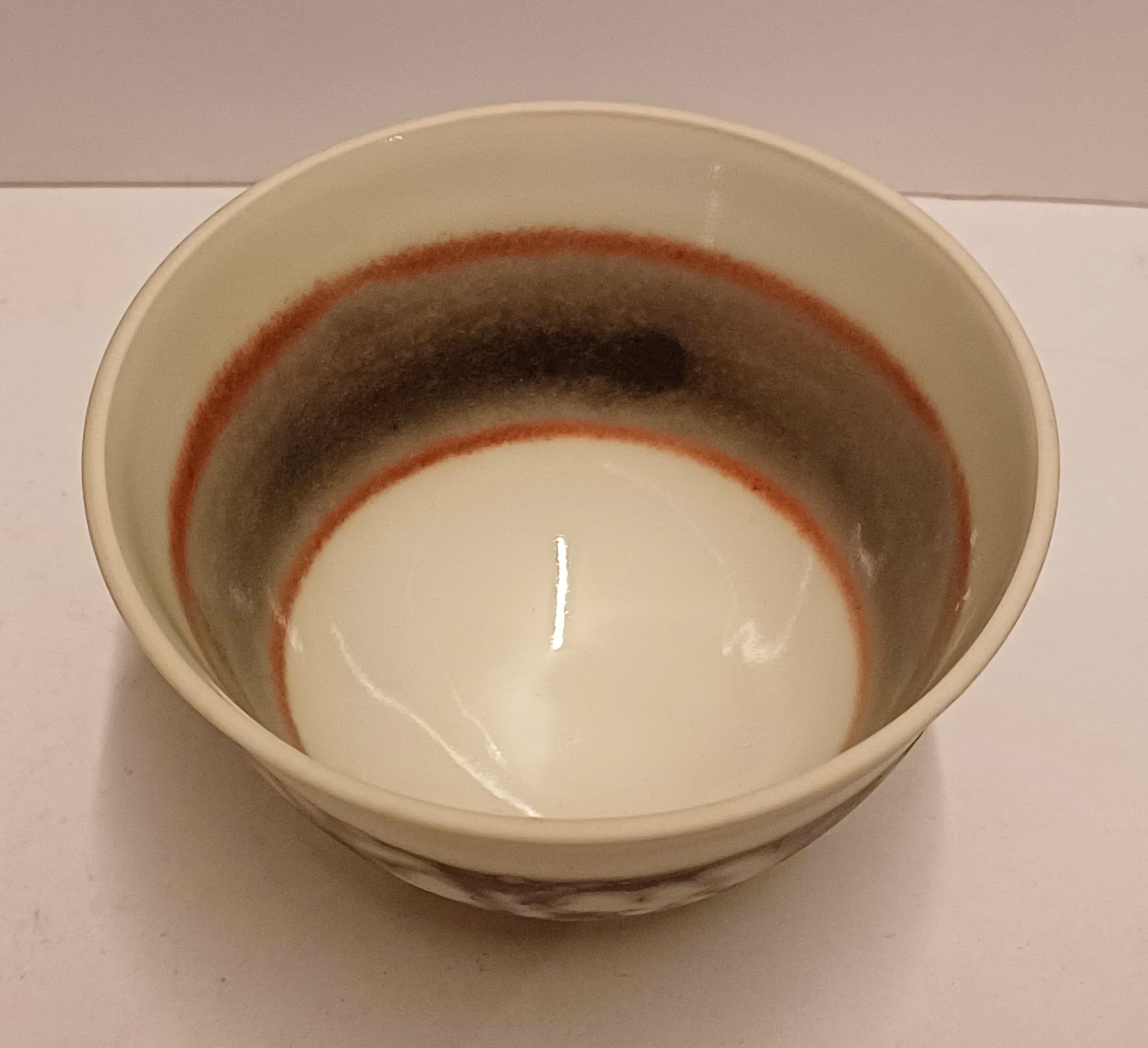 Steengoed kom met band decor in grijs roze tinten. Onderzijde gesigneerd met kunstenaars merk.