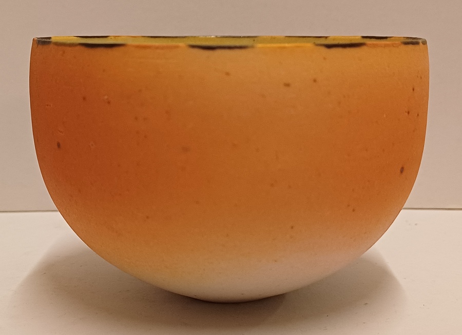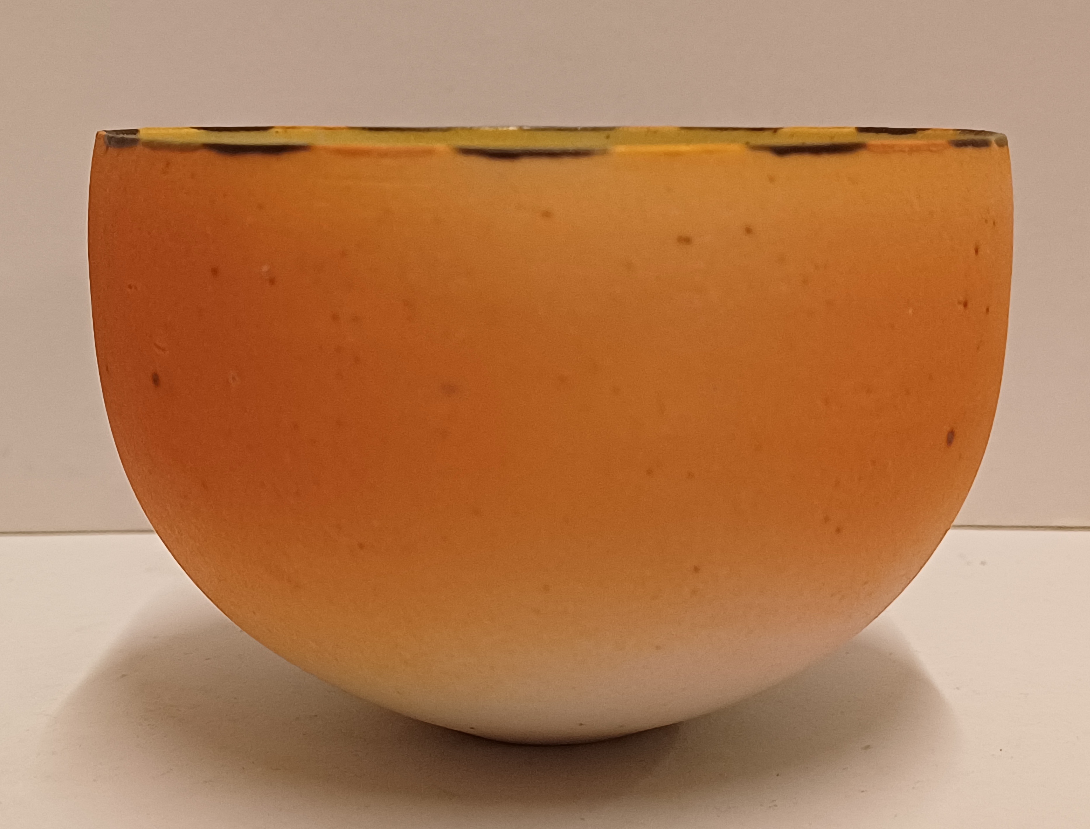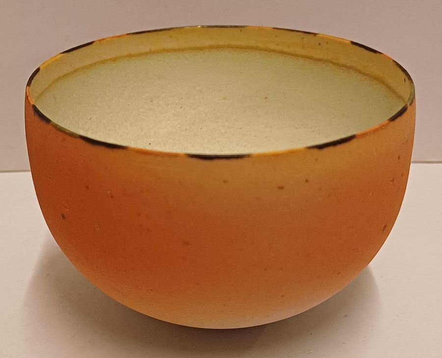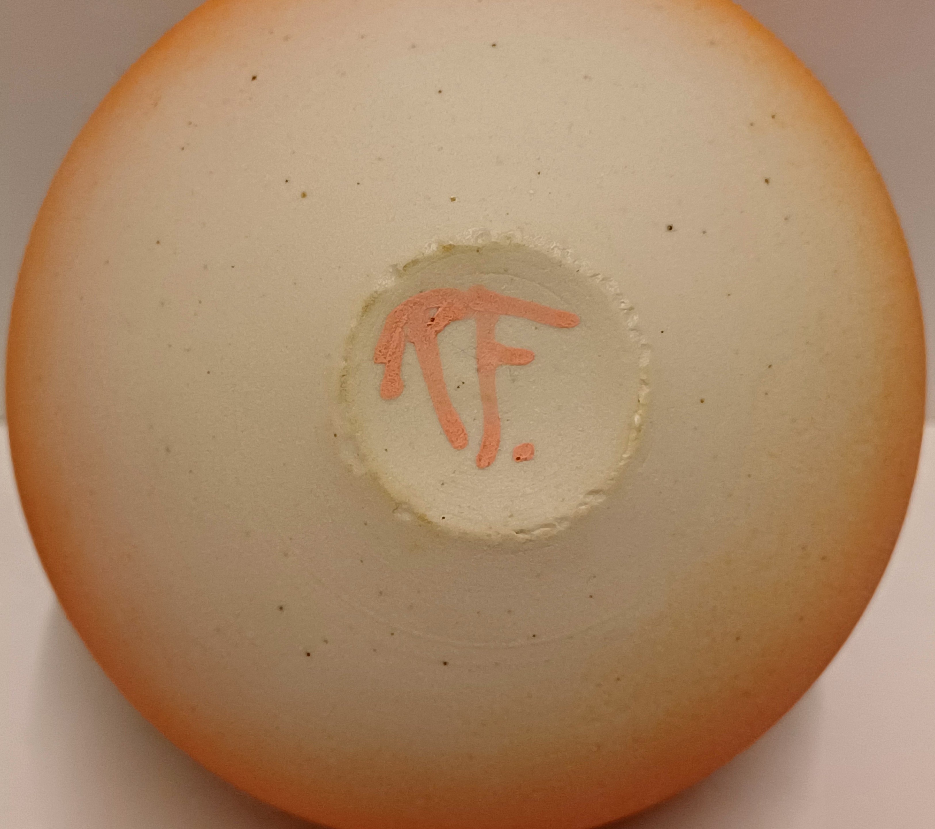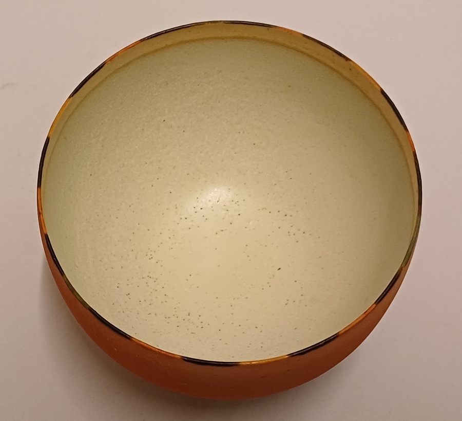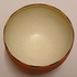 Kleine komvorm met mat roze glazuur en gestippelde lijn op de rand. Onderzijde met monogram RF.