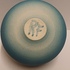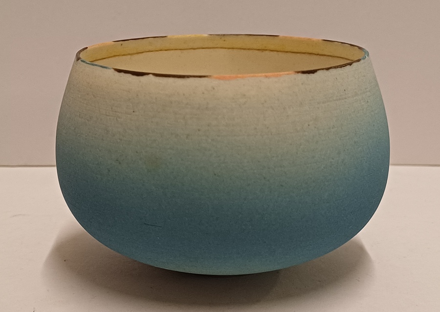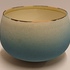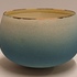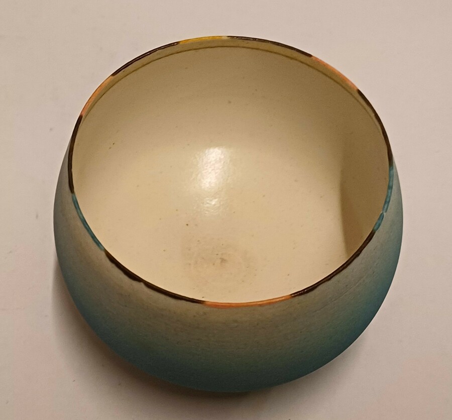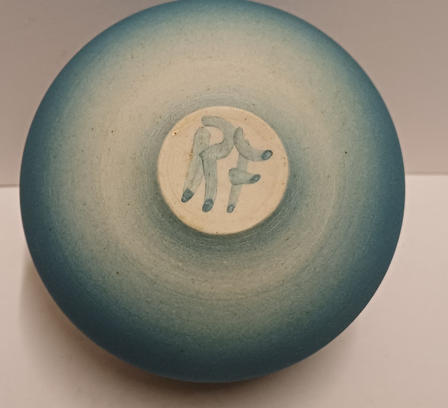 Kleine komvorm met mat blauwe glazuur en gestippelde lijn op de rand. Onderzijde met monogram RF.