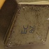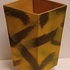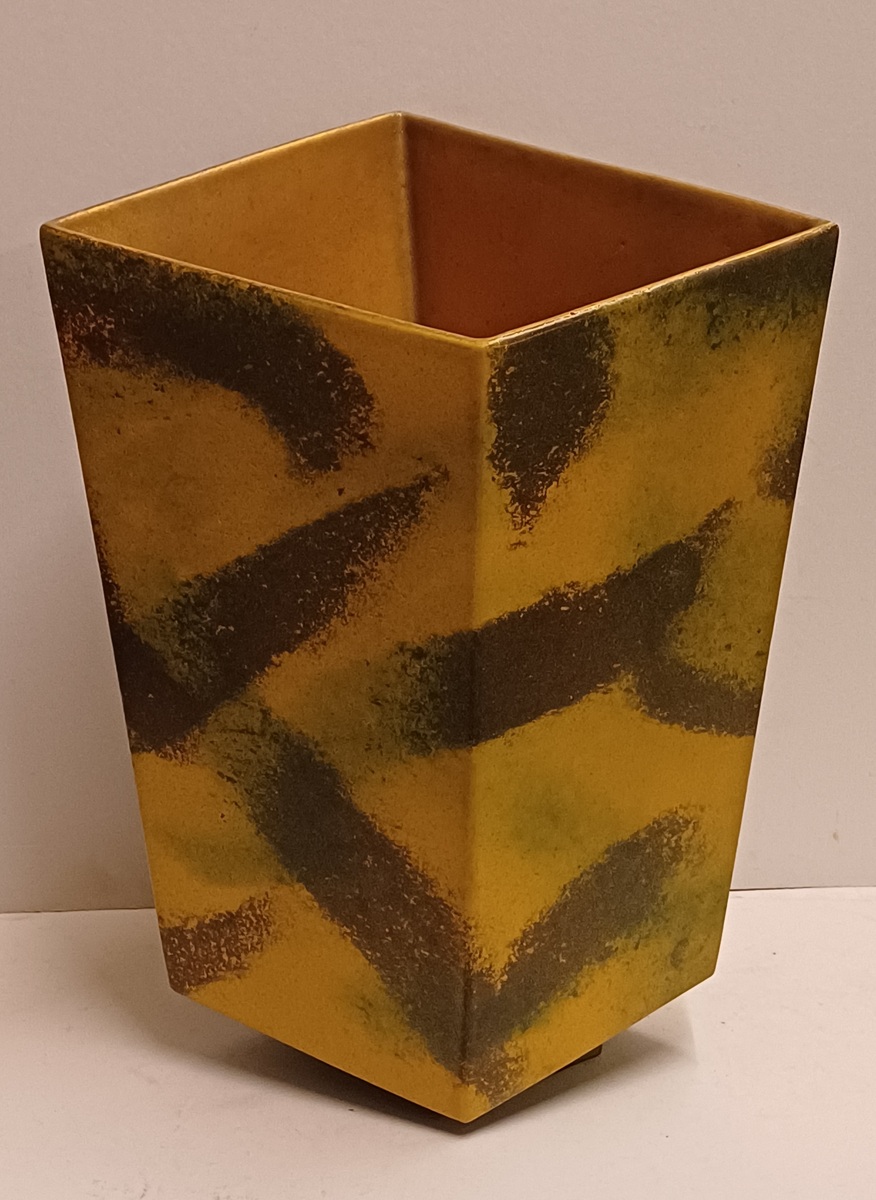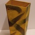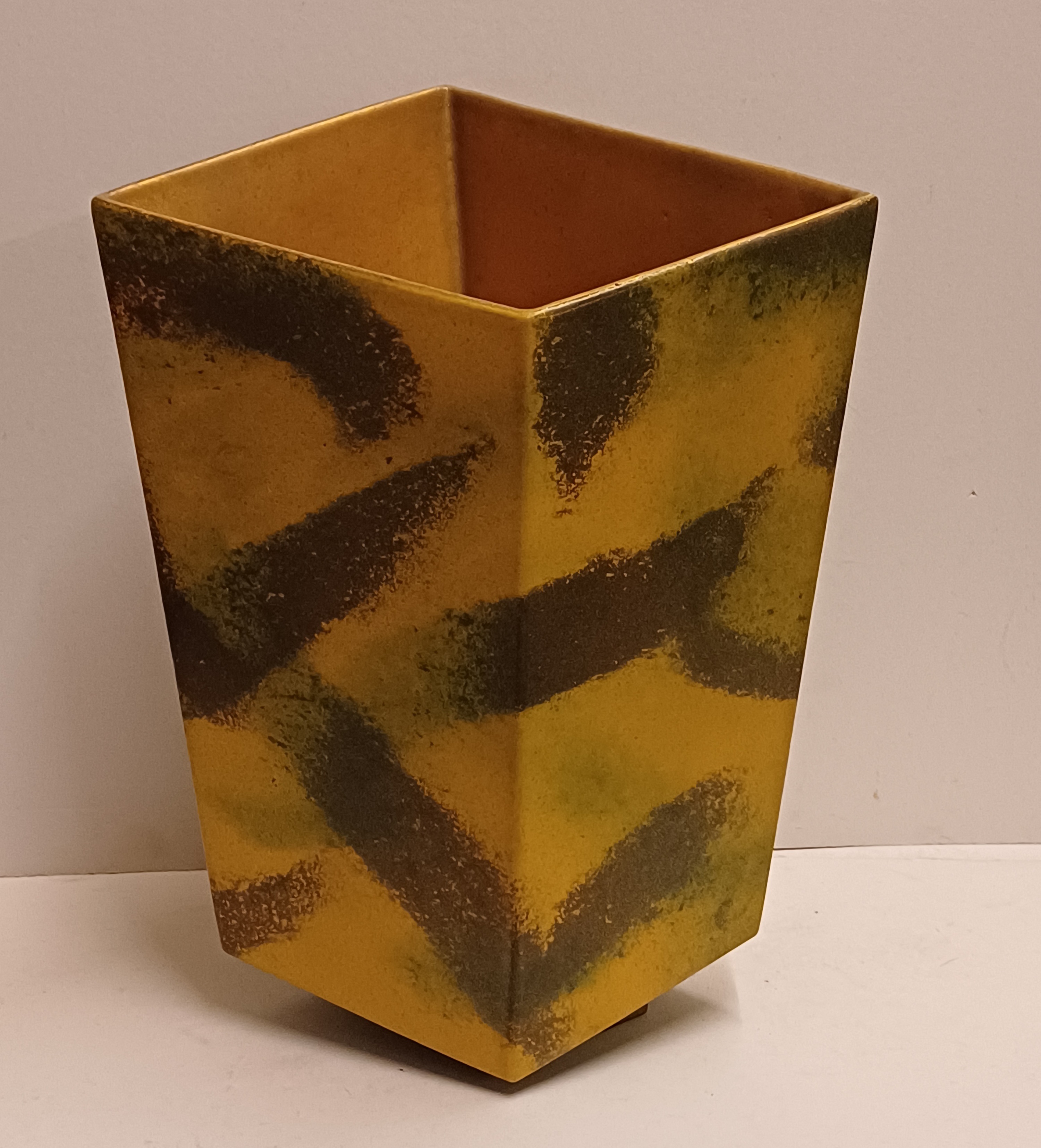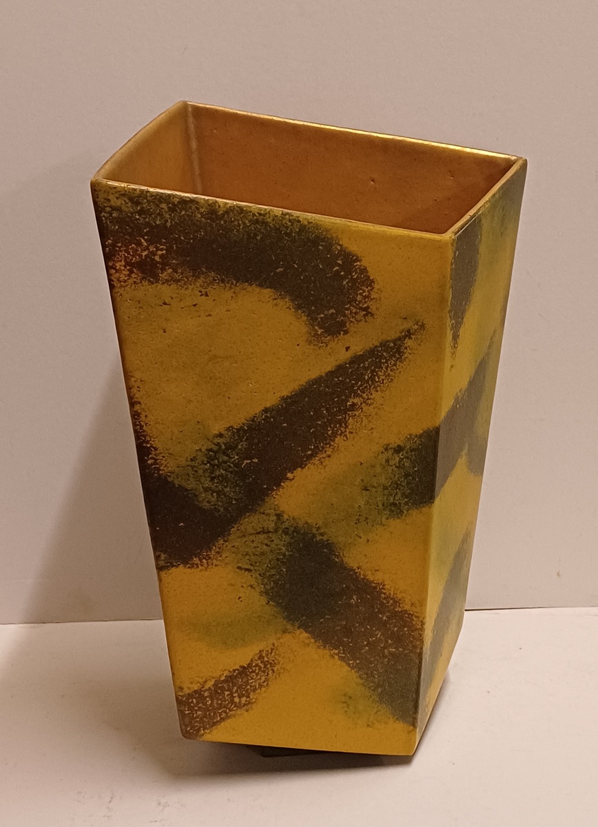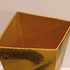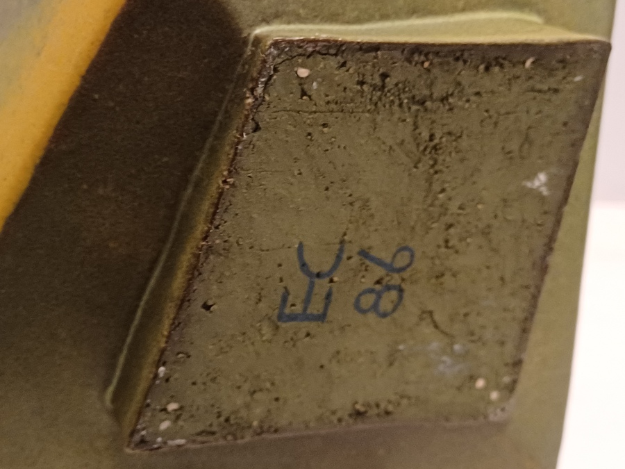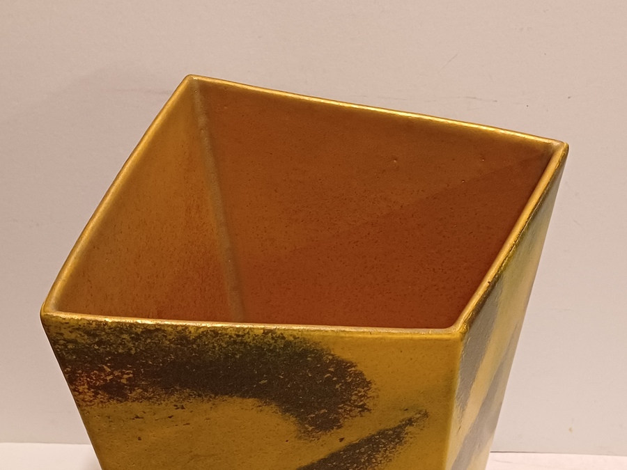 黄色与绿色菱形石器罐,四方形底座,内部为金色光泽。标记并注明 1986 年。