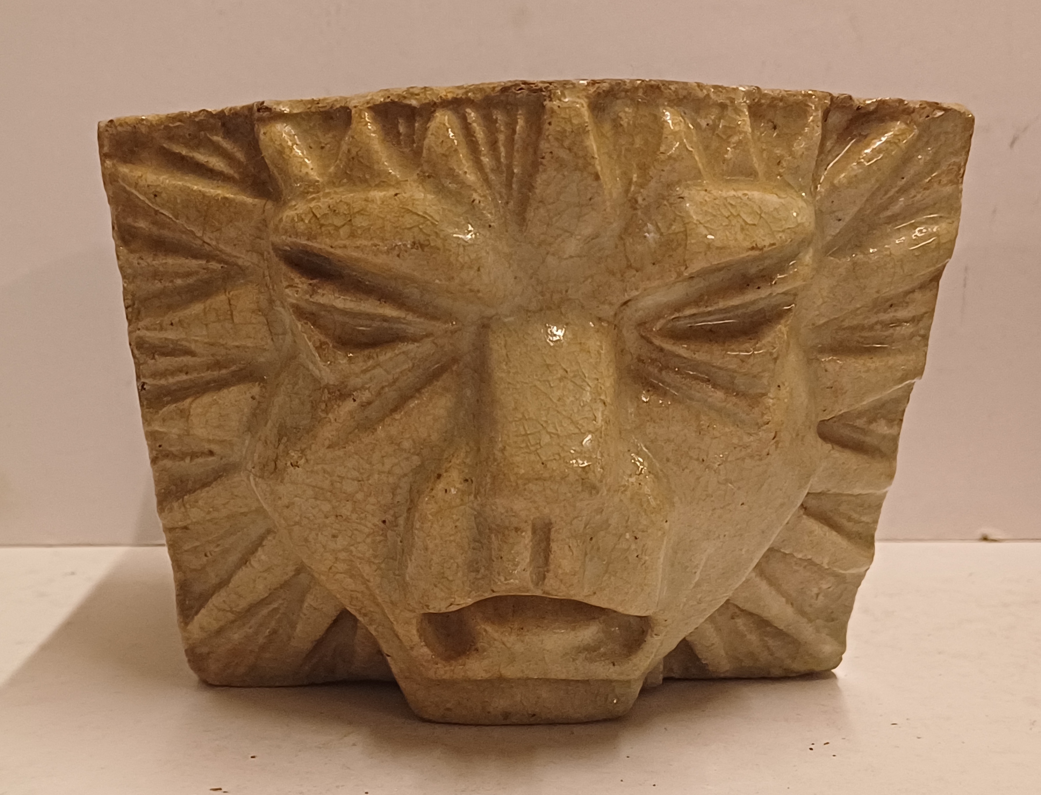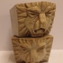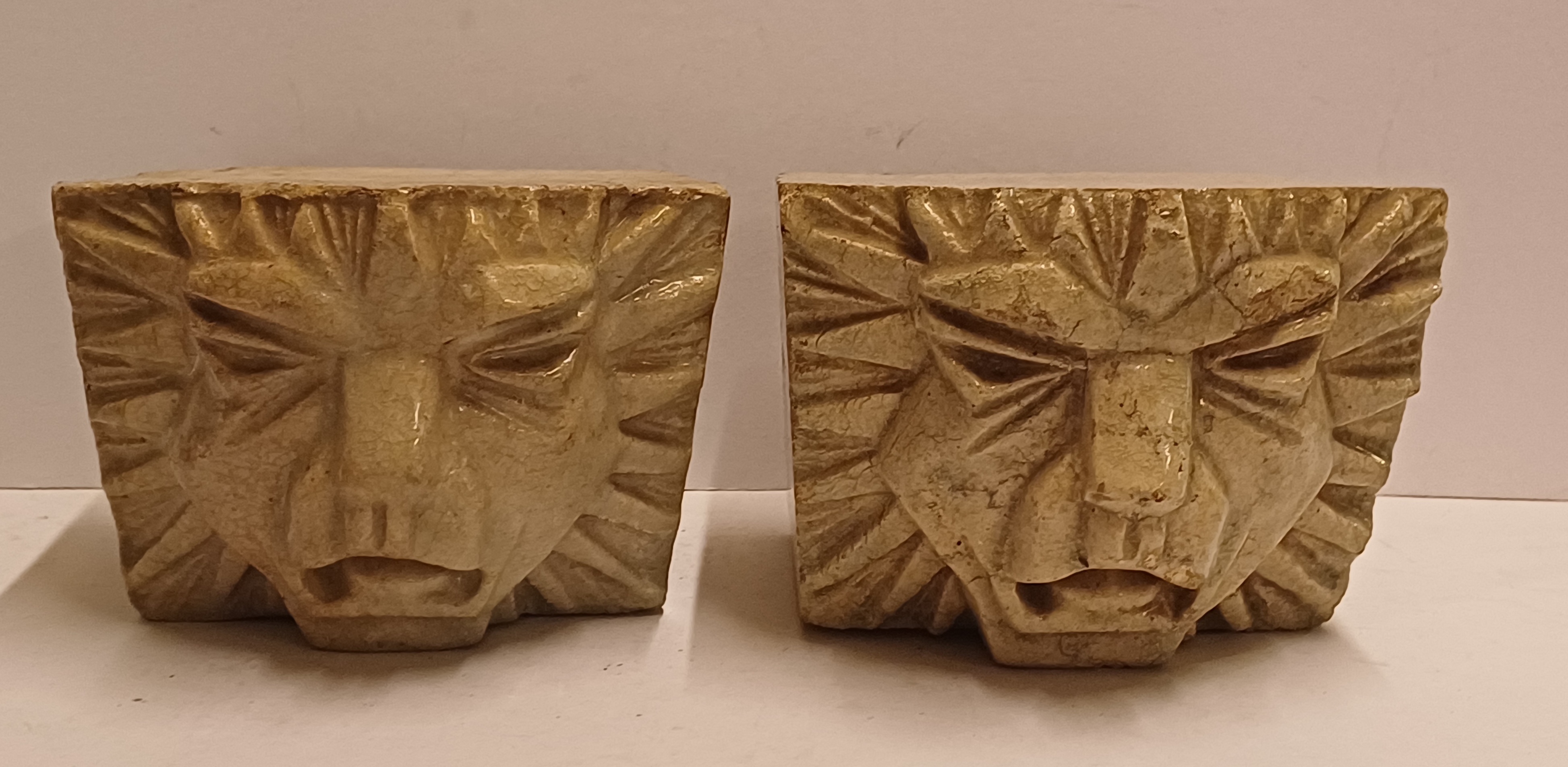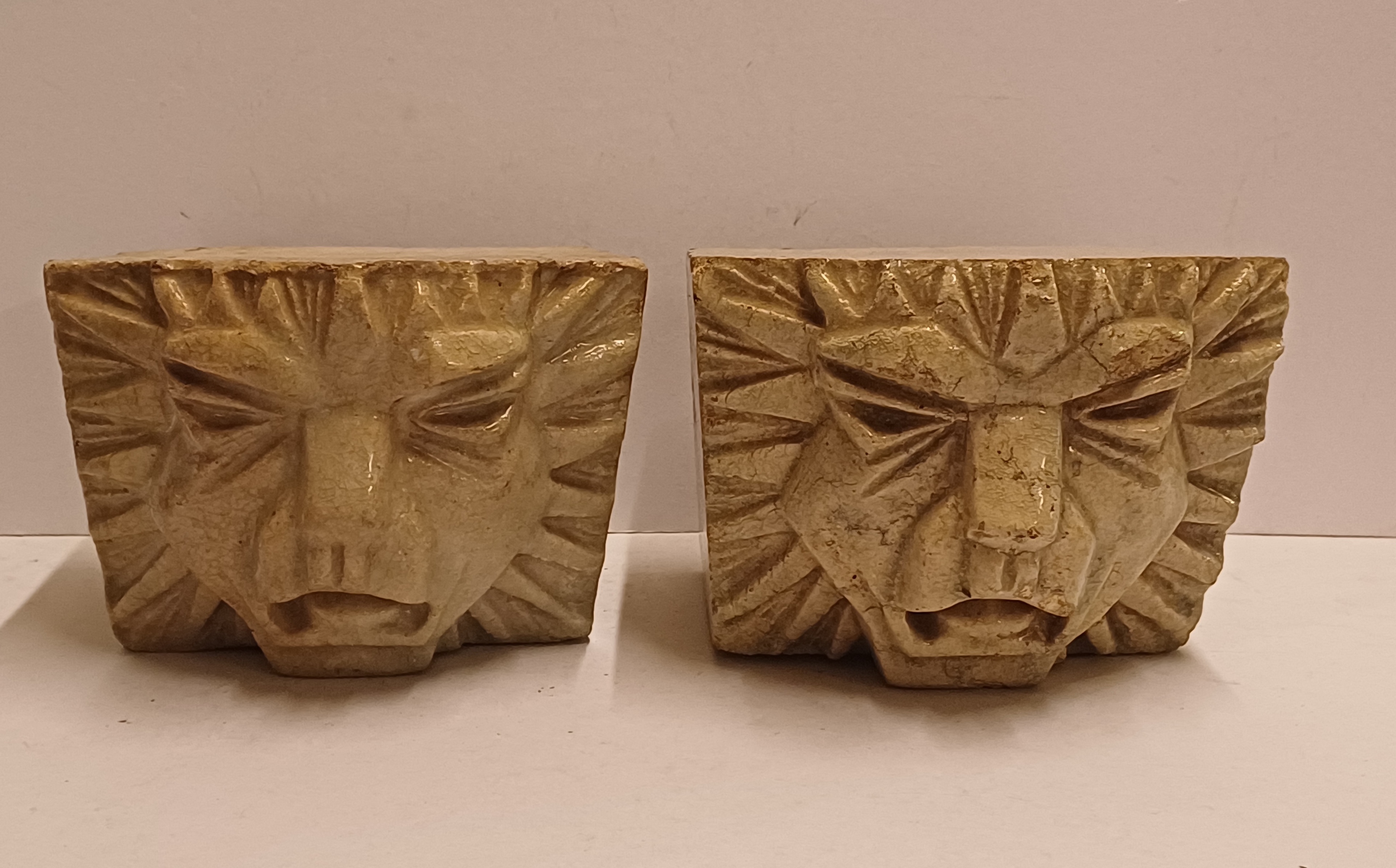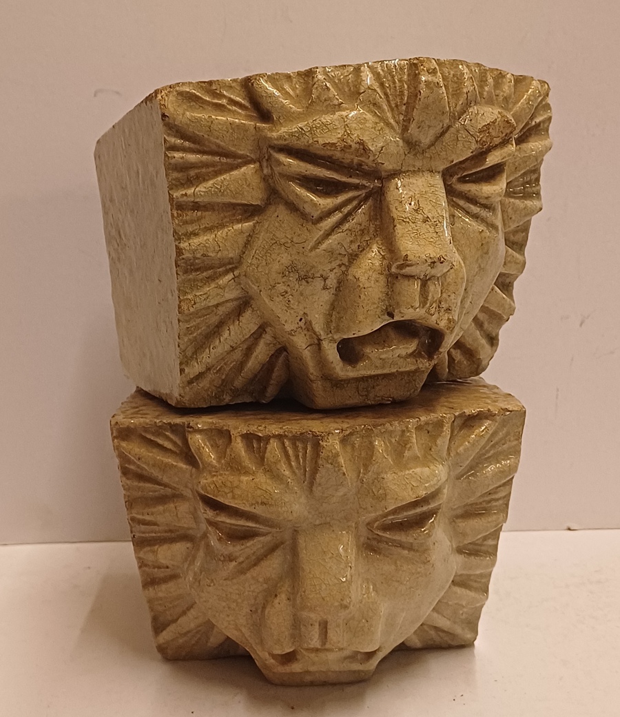 两个釉面浅奶油色的石器风格化狮子头。未签名。