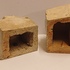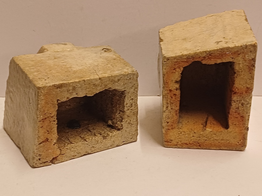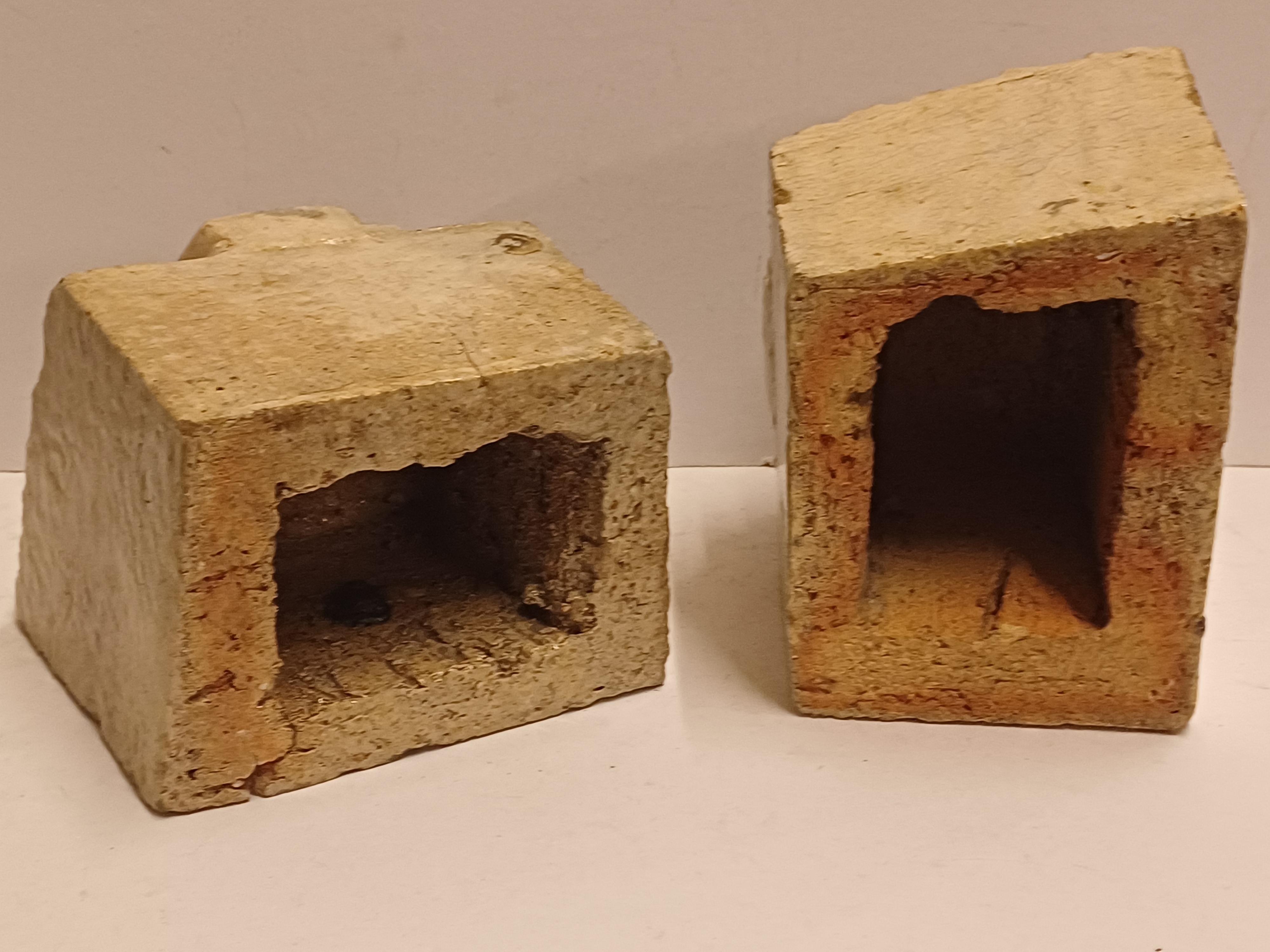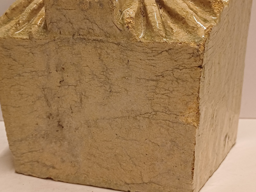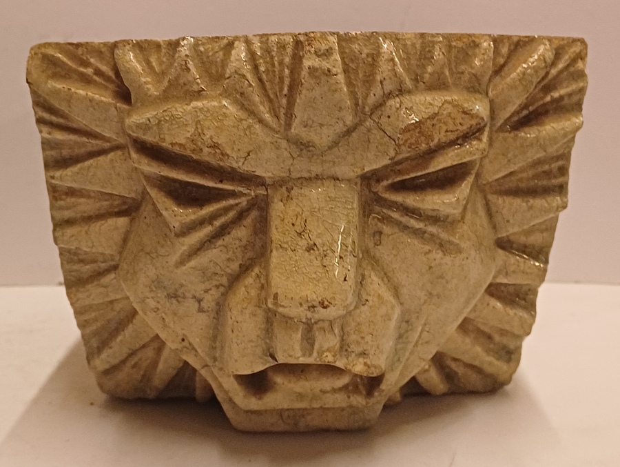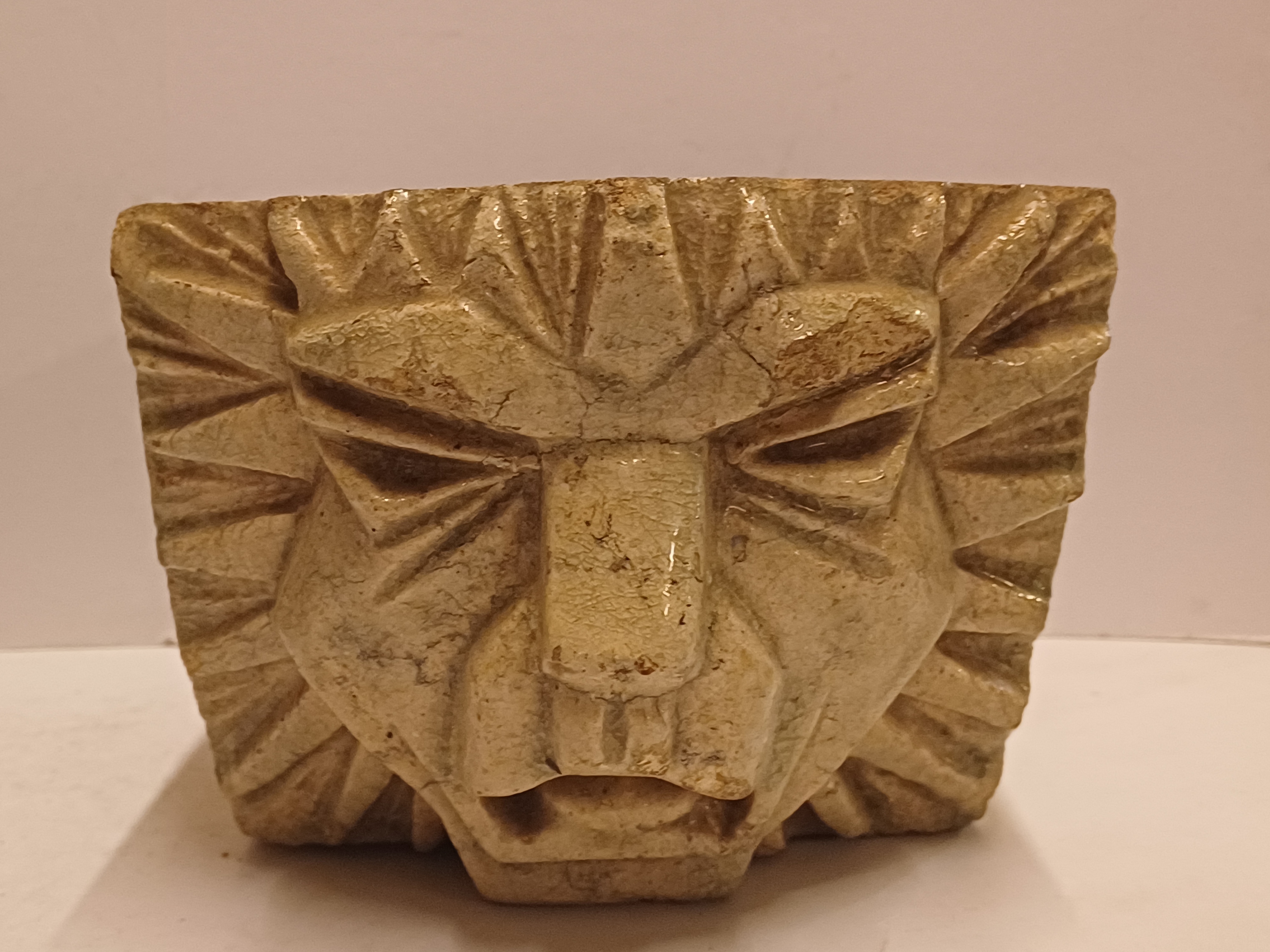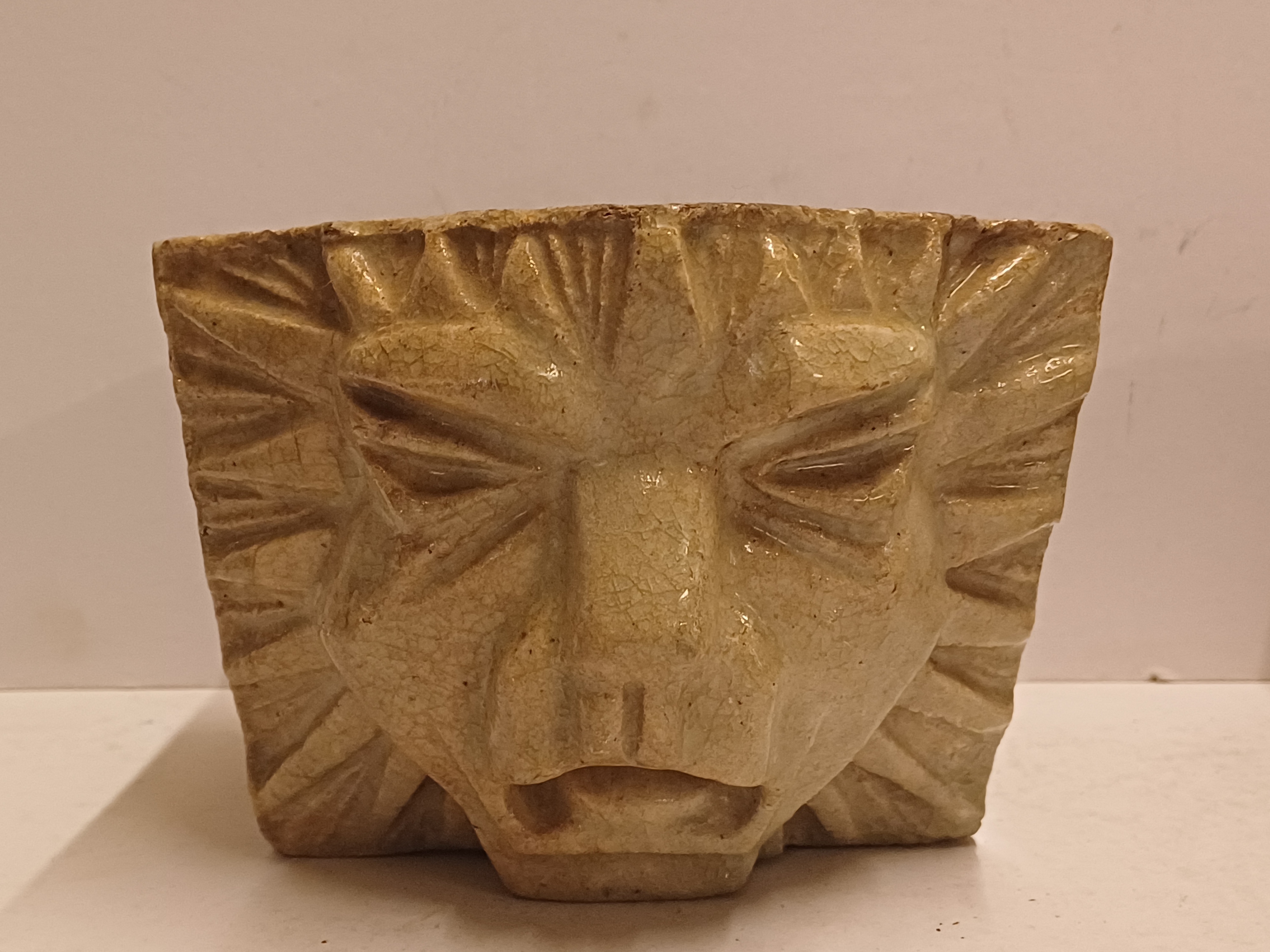 两个釉面浅奶油色的石器风格化狮子头。未签名。