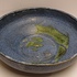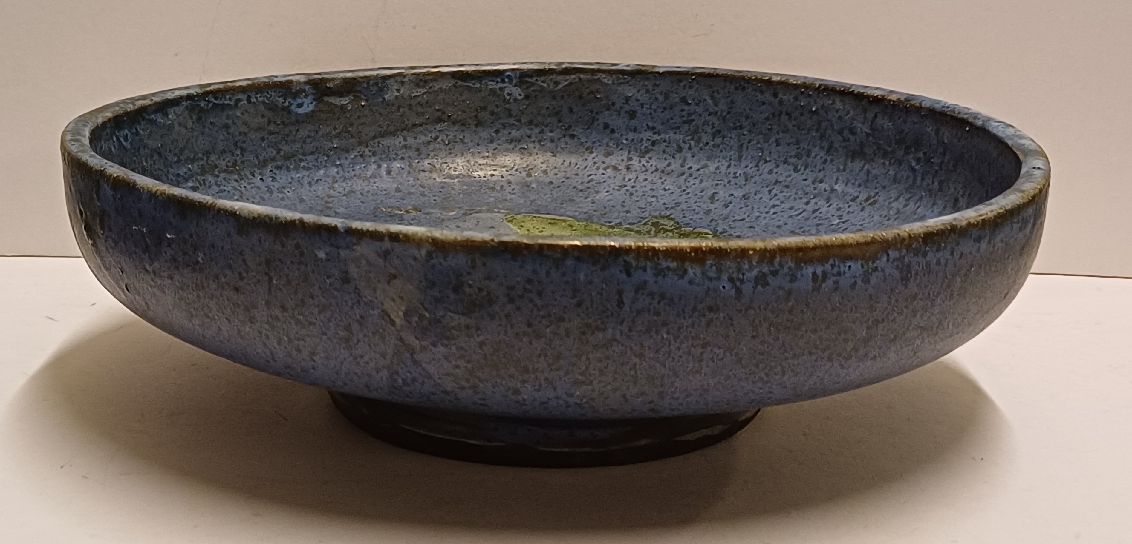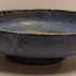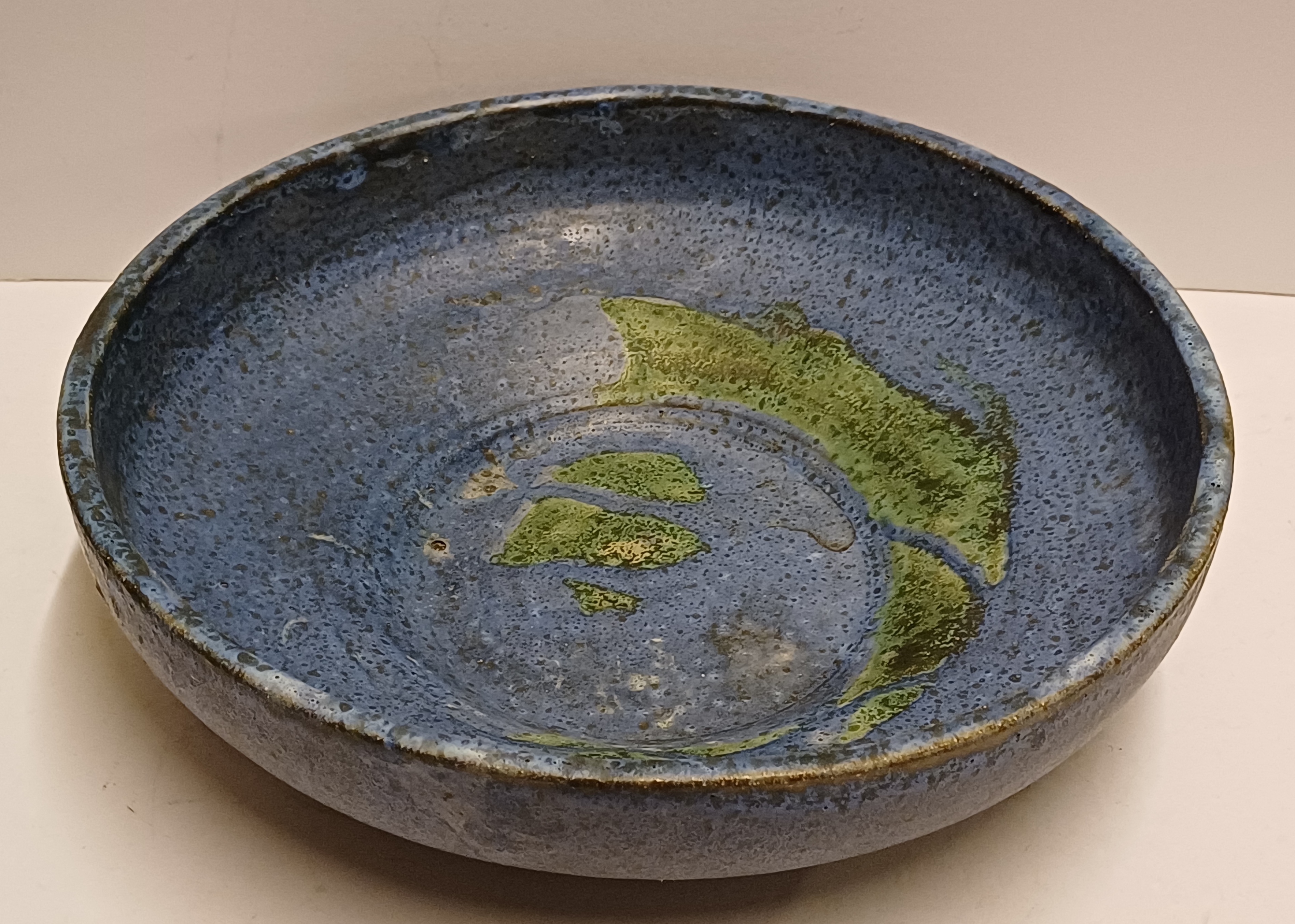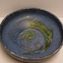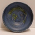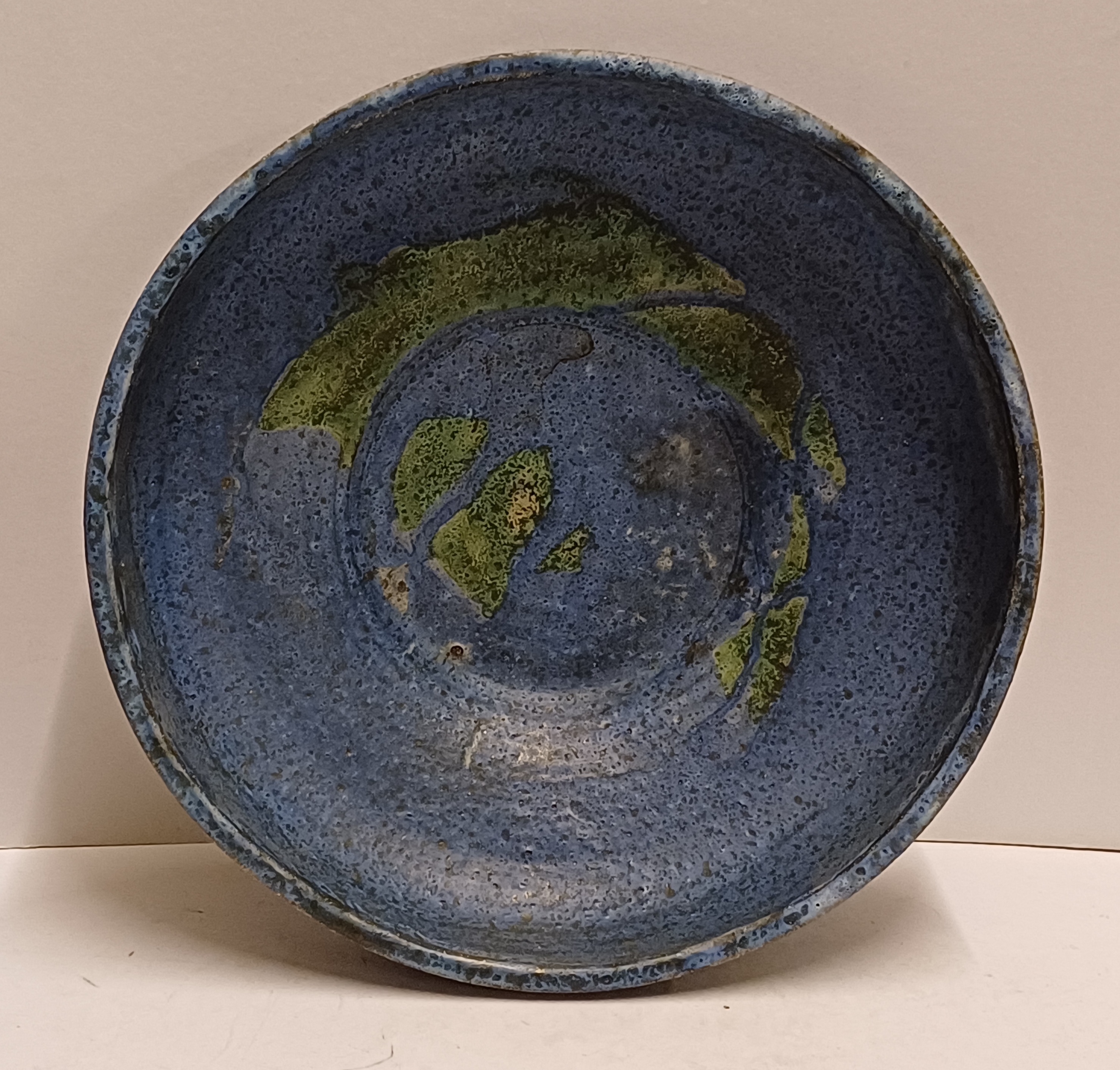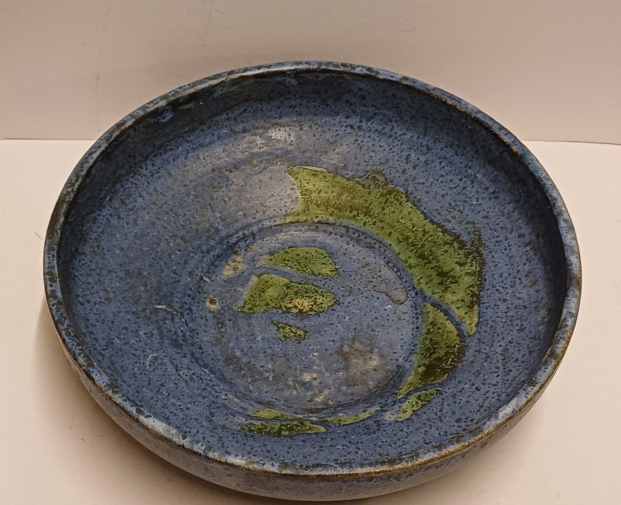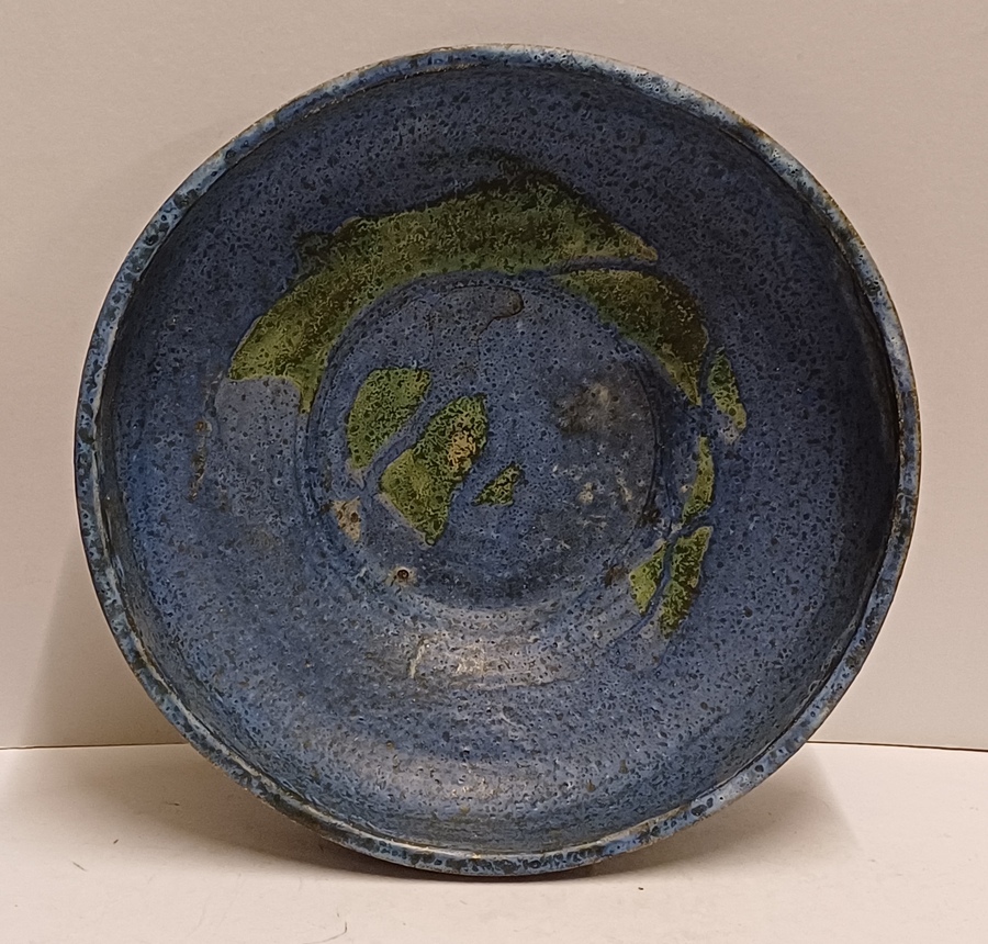 Diepe schaal met blauwe glazuur en groene splash op het plat. Onderzijde gesigneerd.