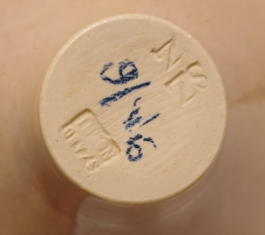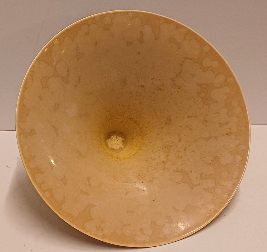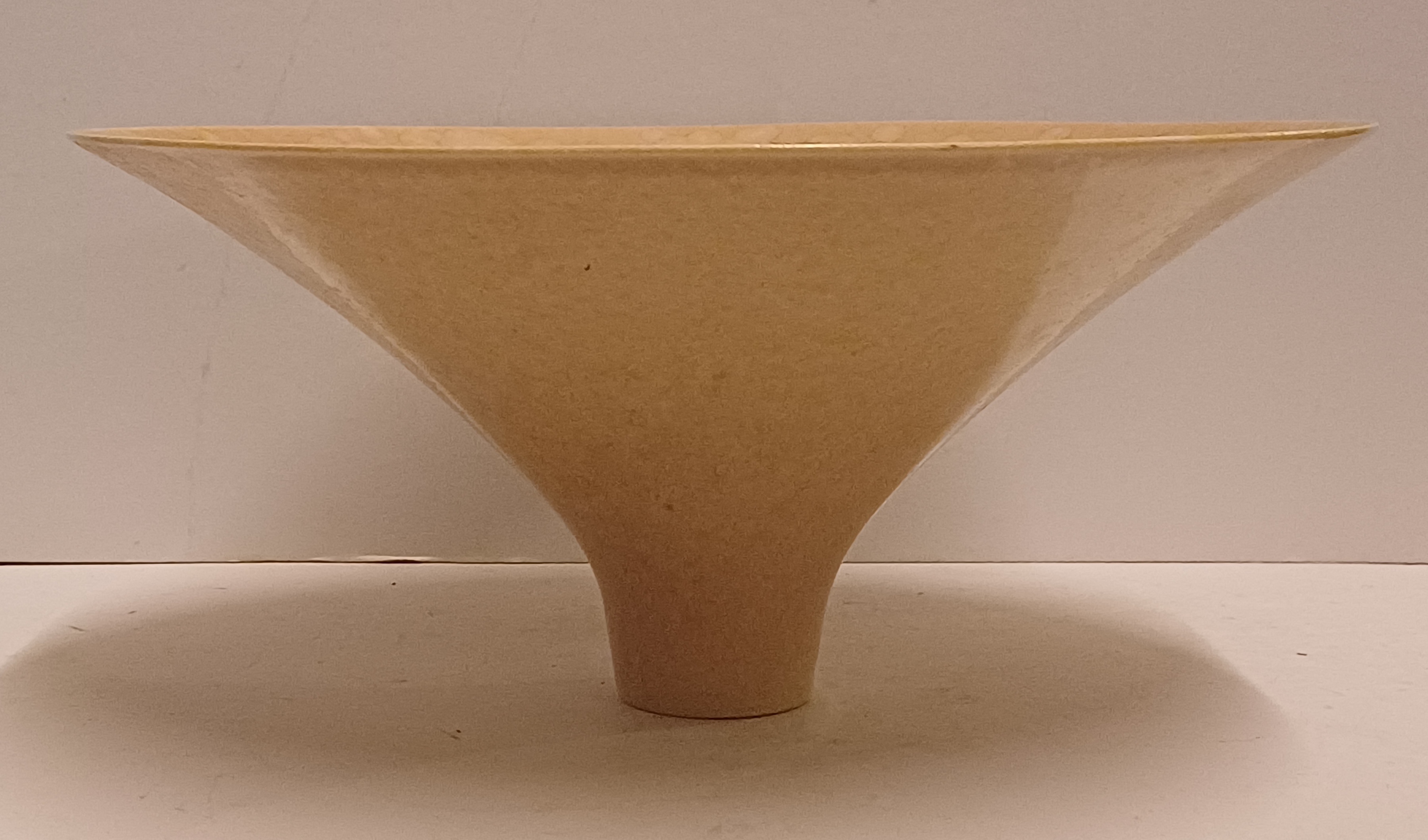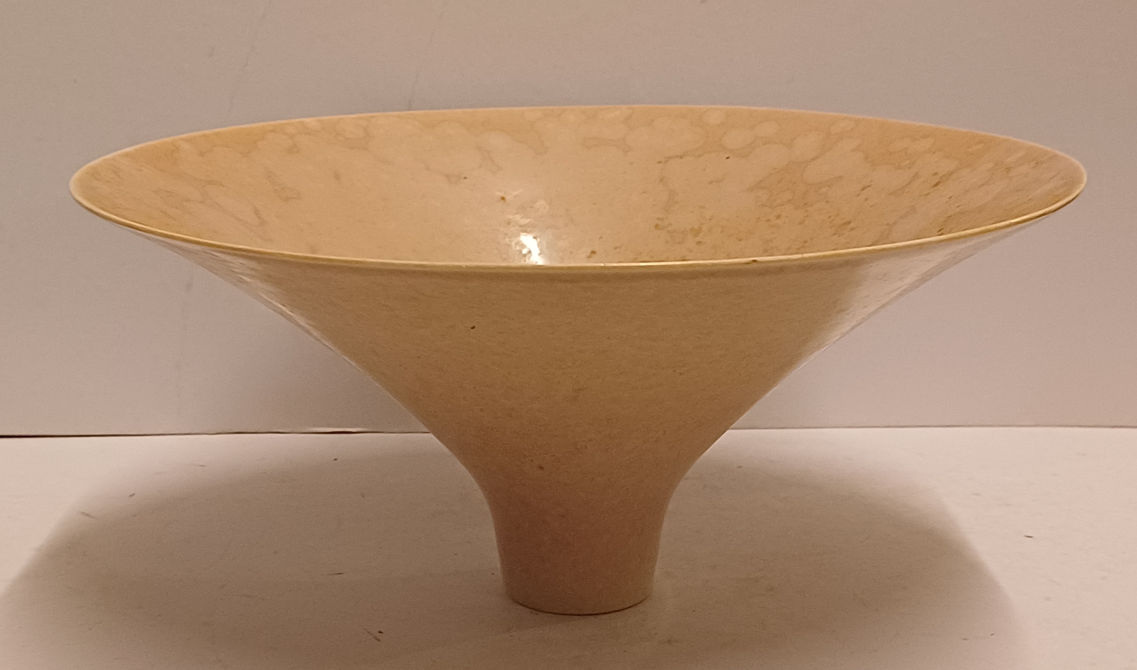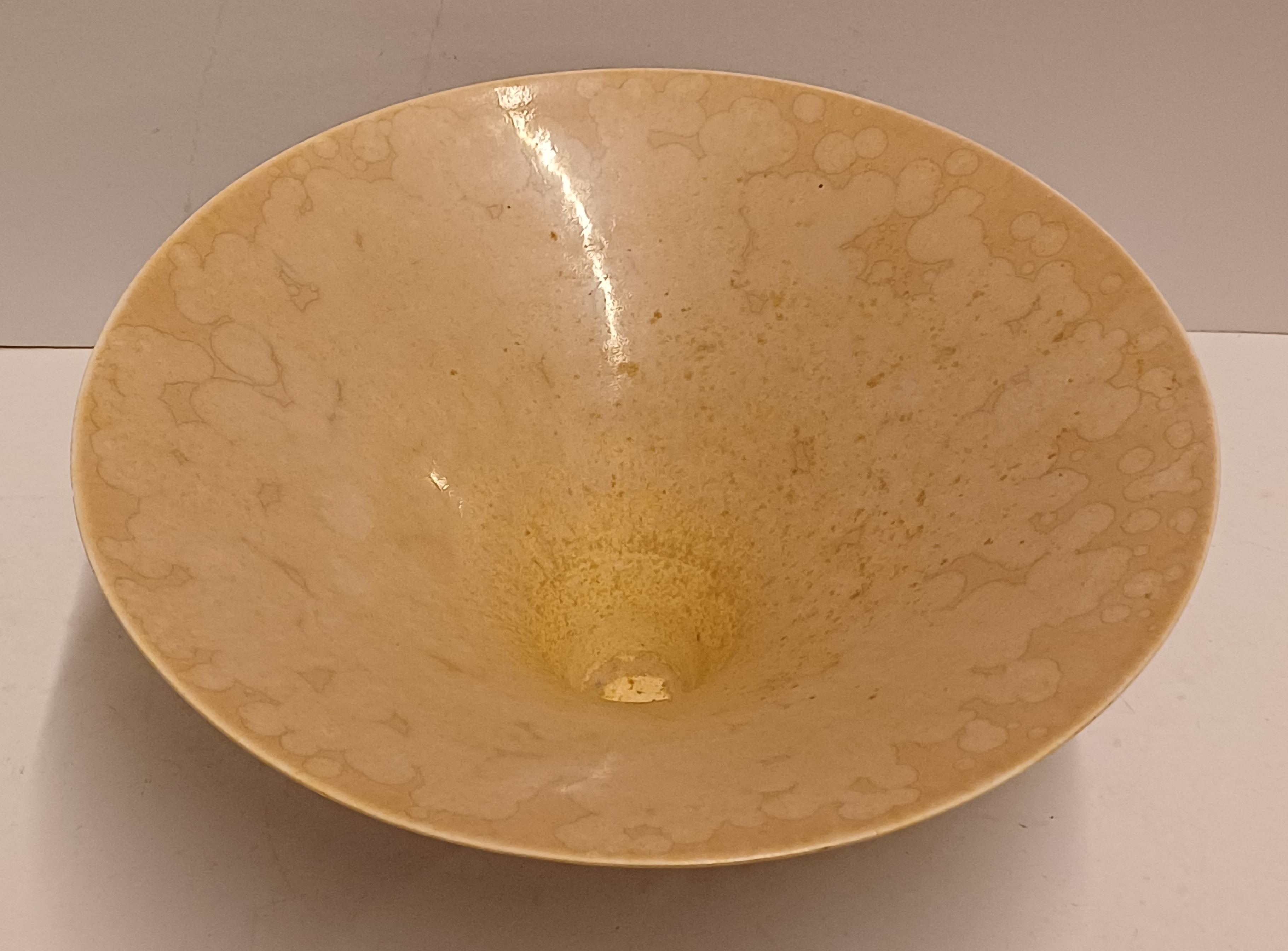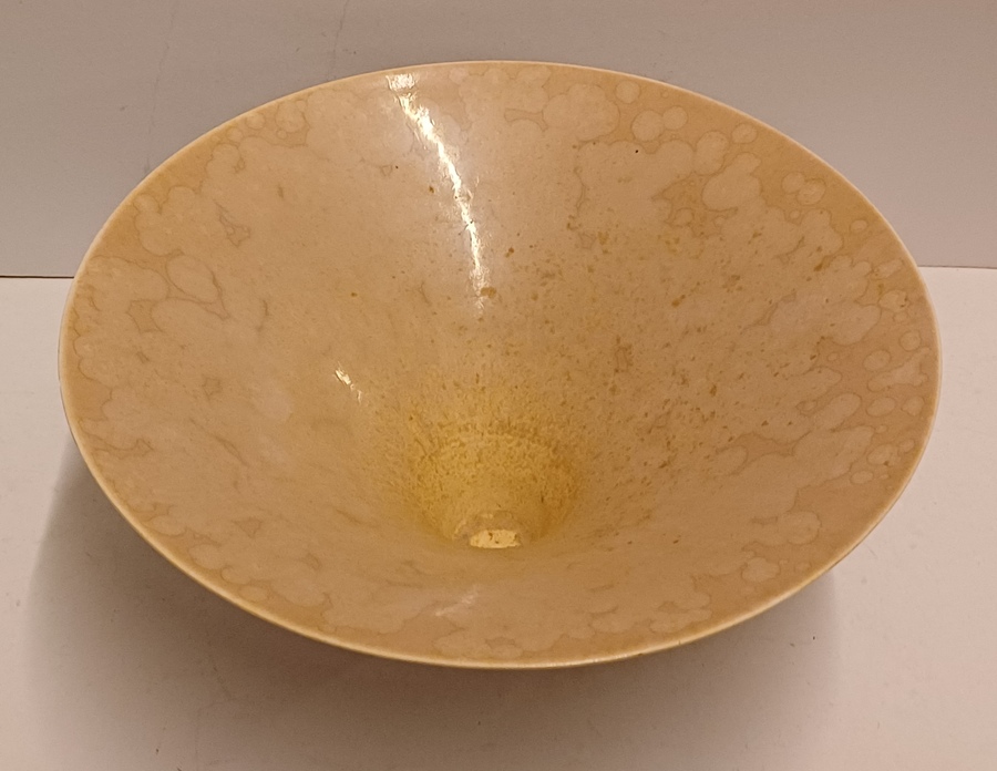Aardewerken schaal met gewolkte creme kleurige glazuur. Onderzijde met kunstenaars monogram.