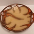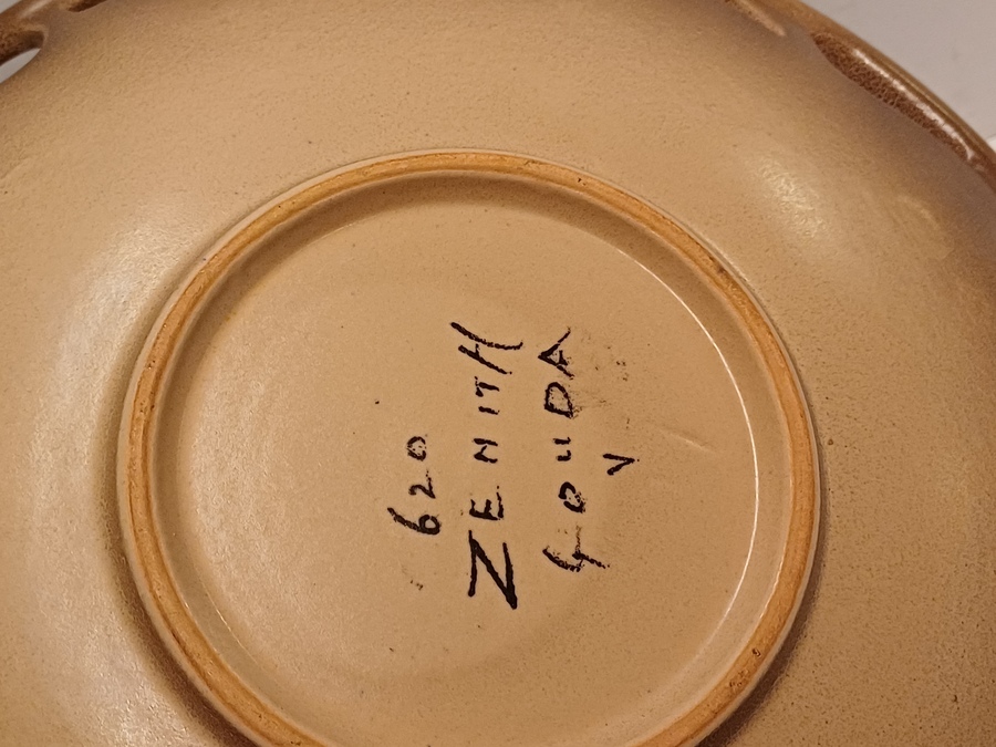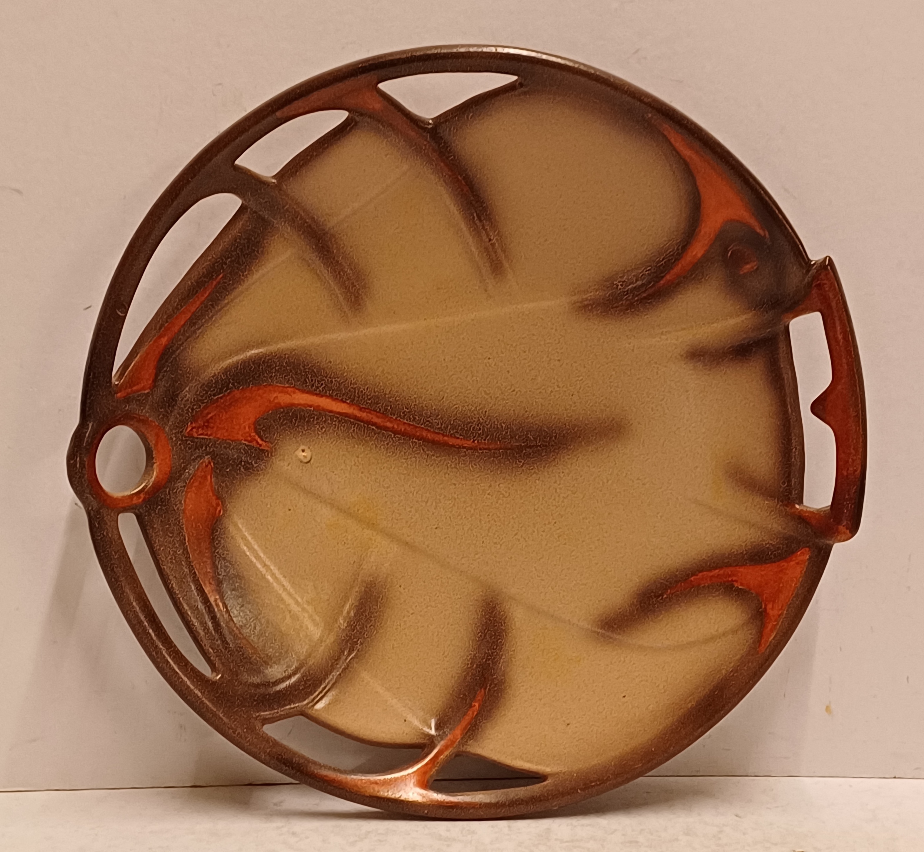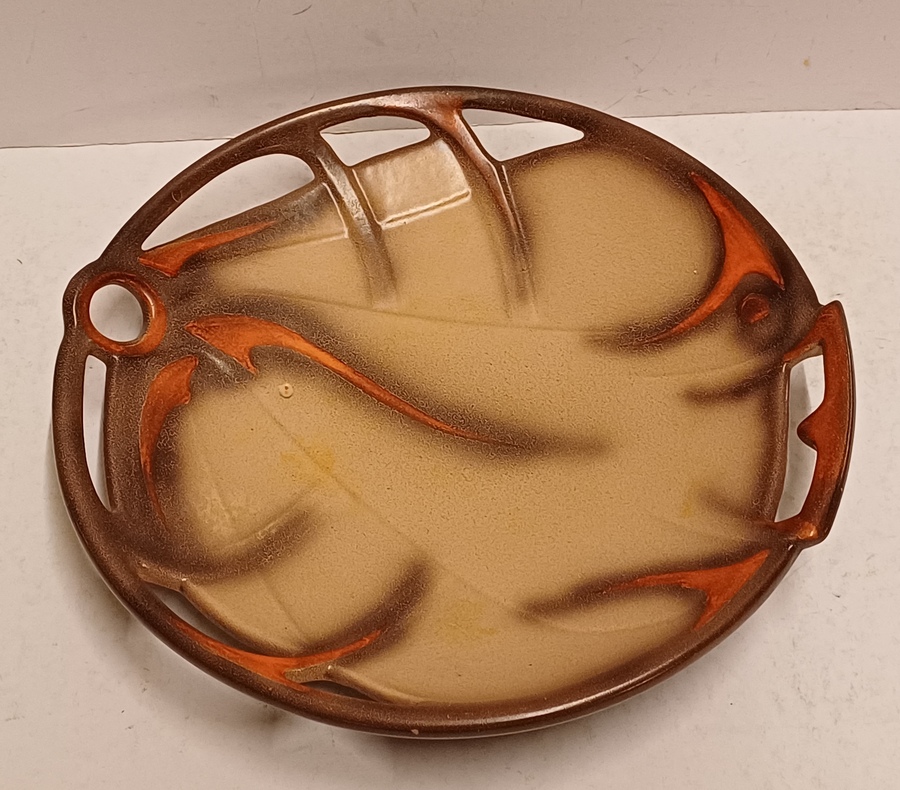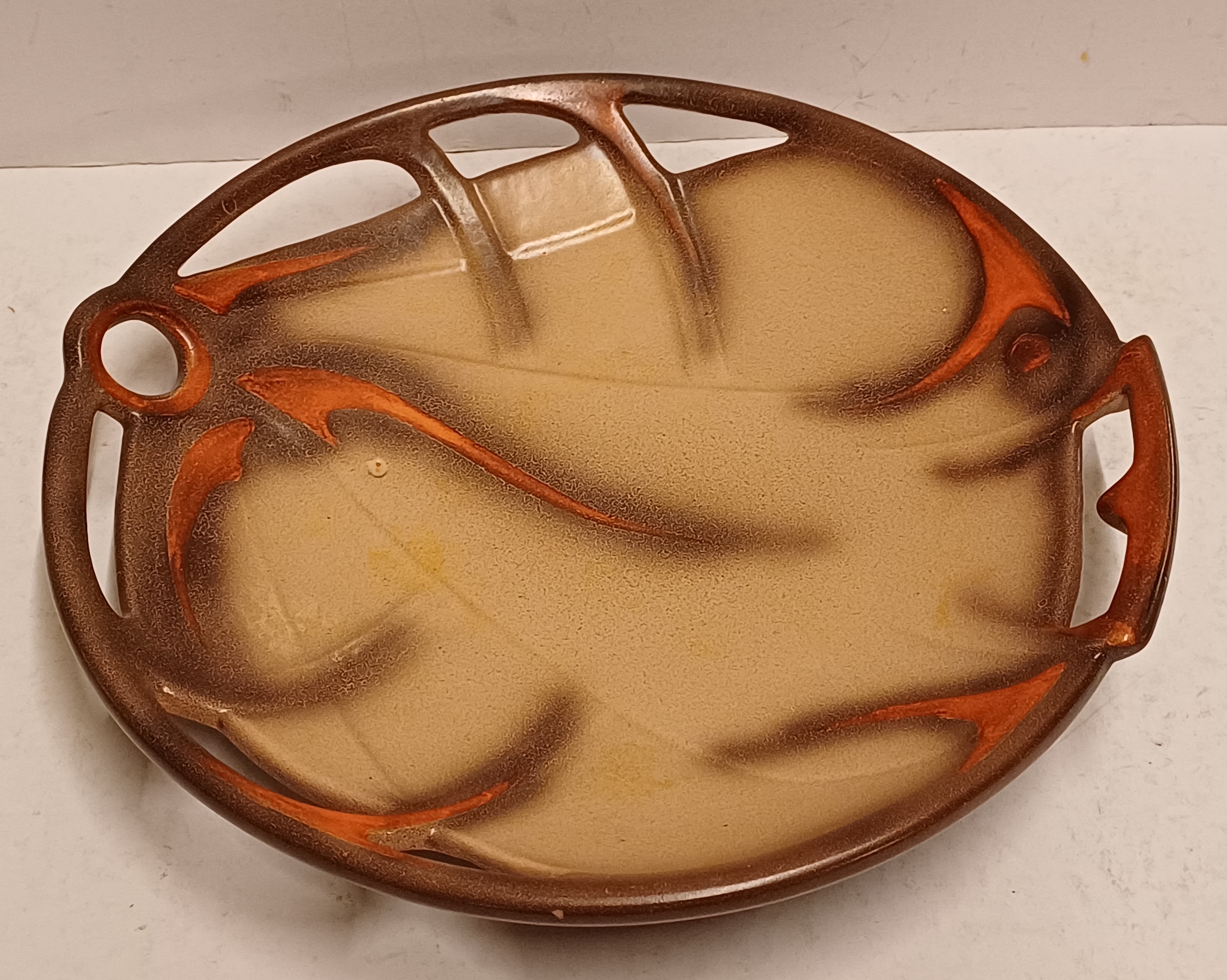 Platelen schaal met opengewerkte rand en decor in bruin oranje opcreme fond. Ontwerp Willem Stuurman voor Zenith Gouda. Onderzijde gemerkt.