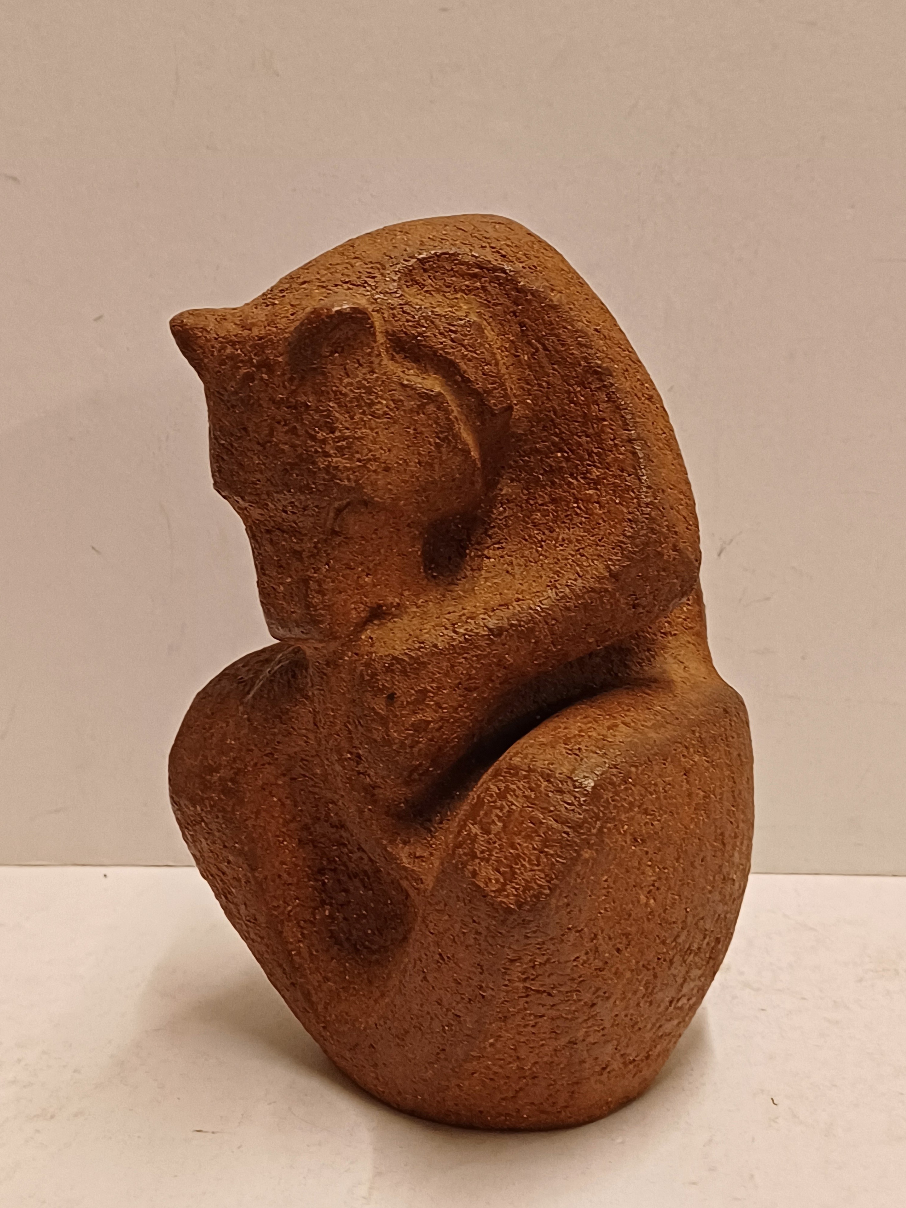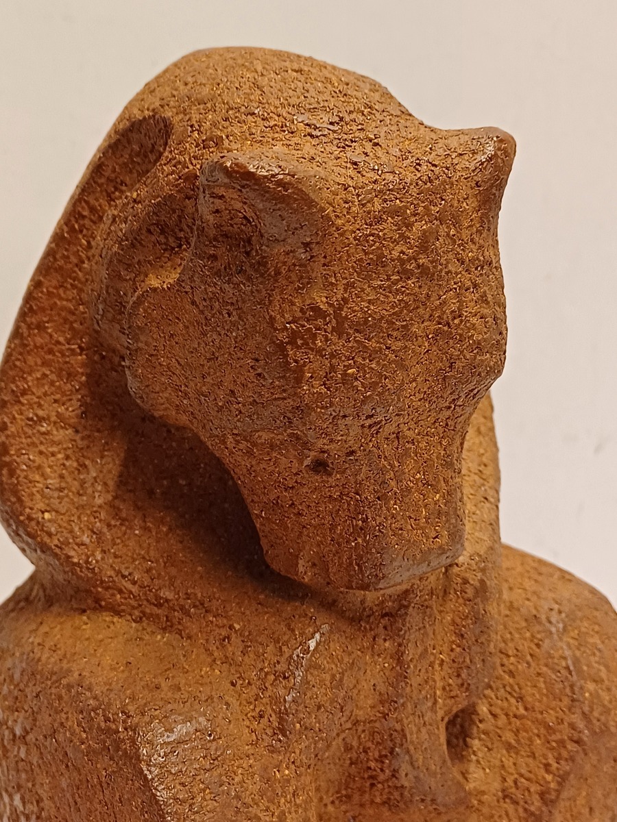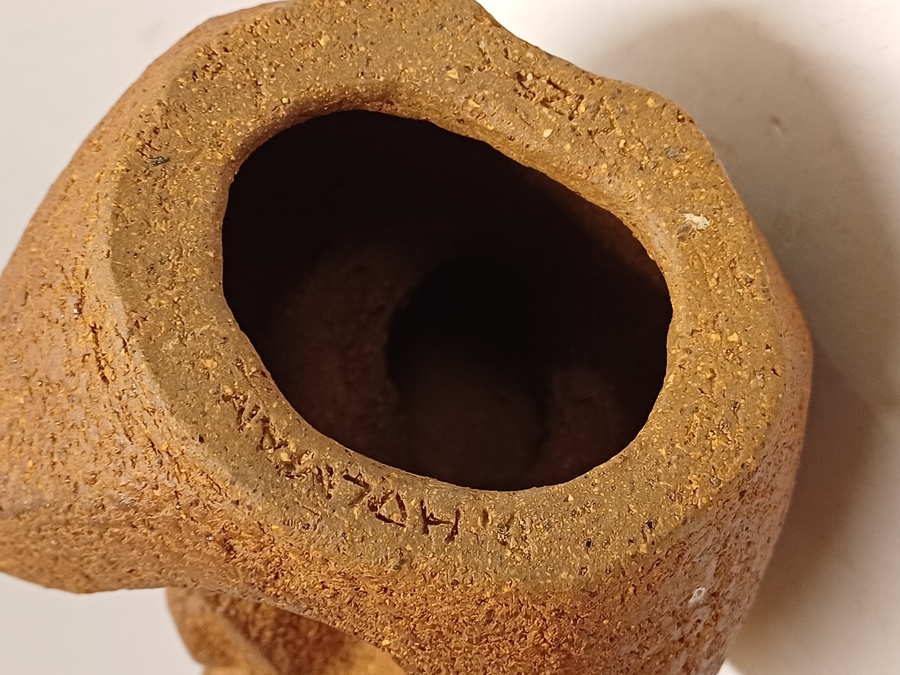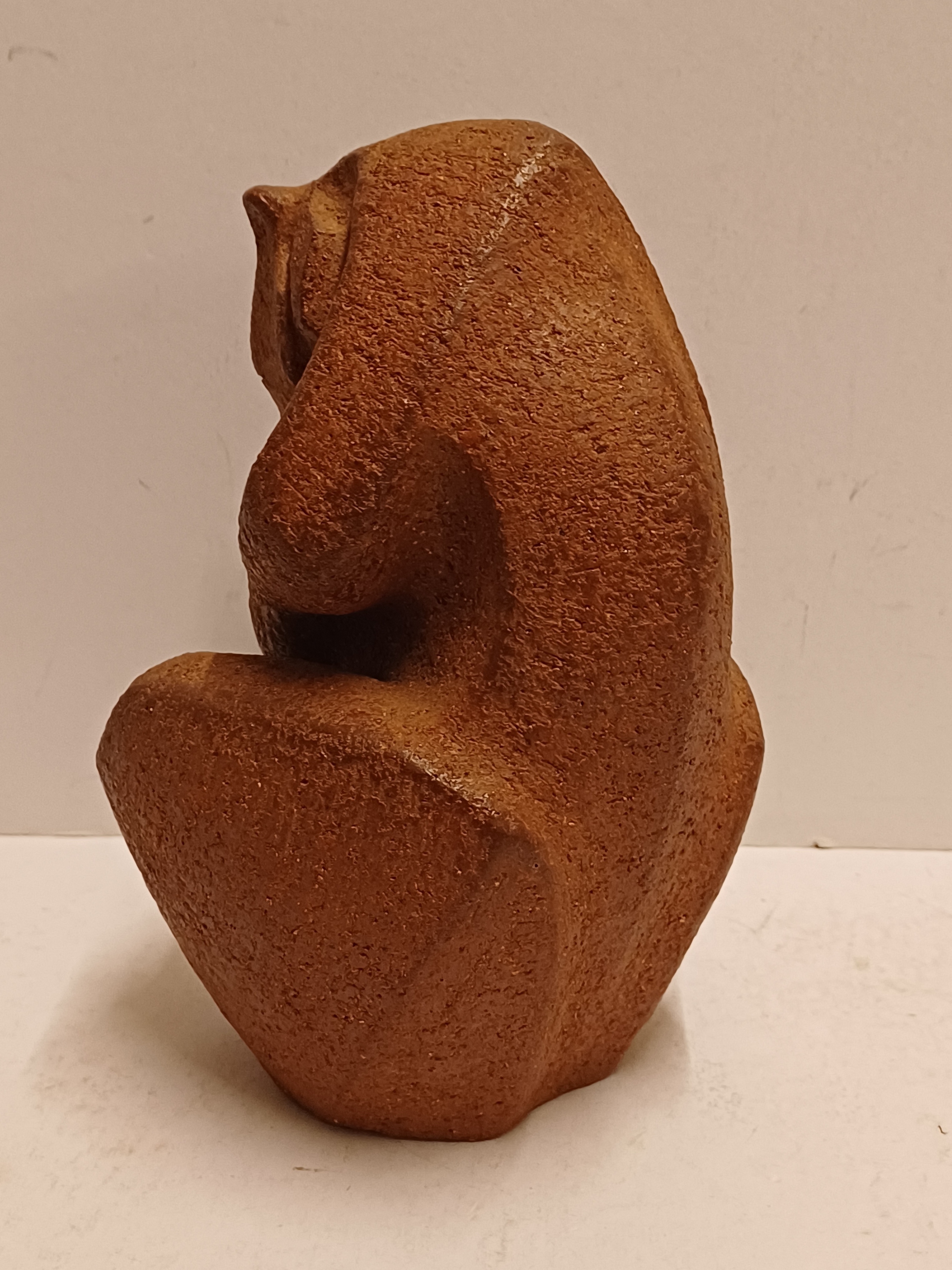 陶瓷石器手工制作的坐式熊。底部有标记和编号。