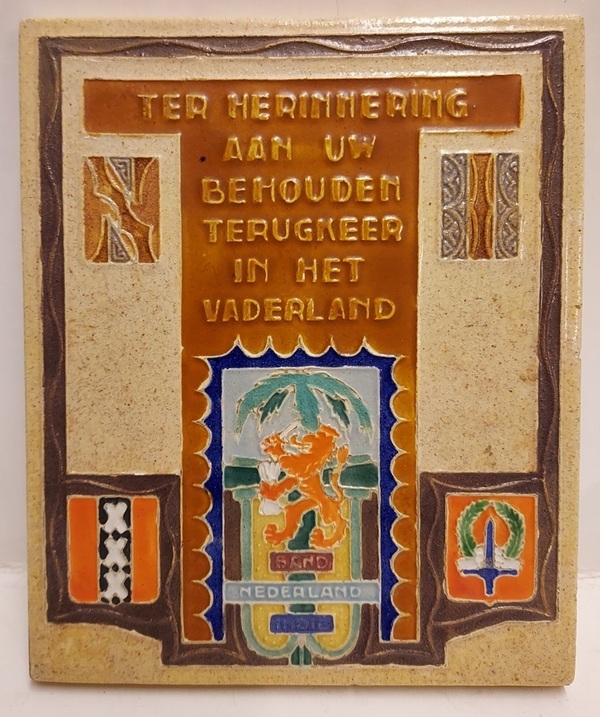 这块瓷砖展示了荷兰狮立于棕榈树下,下方是“Band Nederland Indie”文字。左下角是阿姆斯特丹的盾徽,右下角是巴达维亚的盾徽。这块瓷砖是为了纪念荷兰军人在印度尼西亚的警察行动(1947-1949)中的投入。