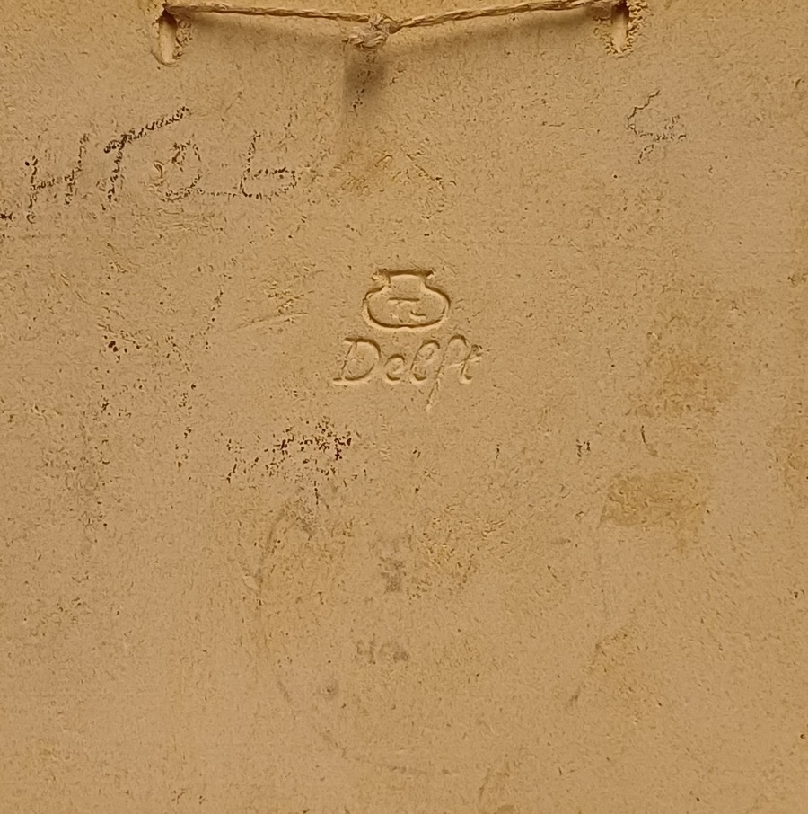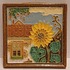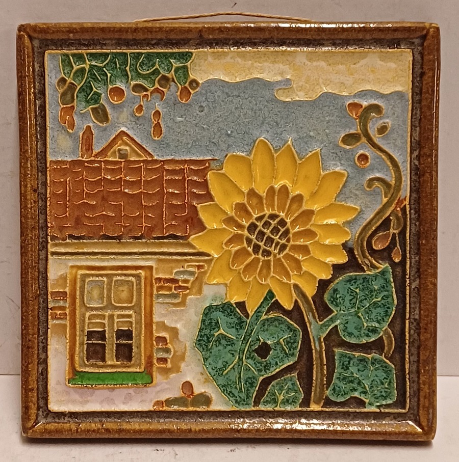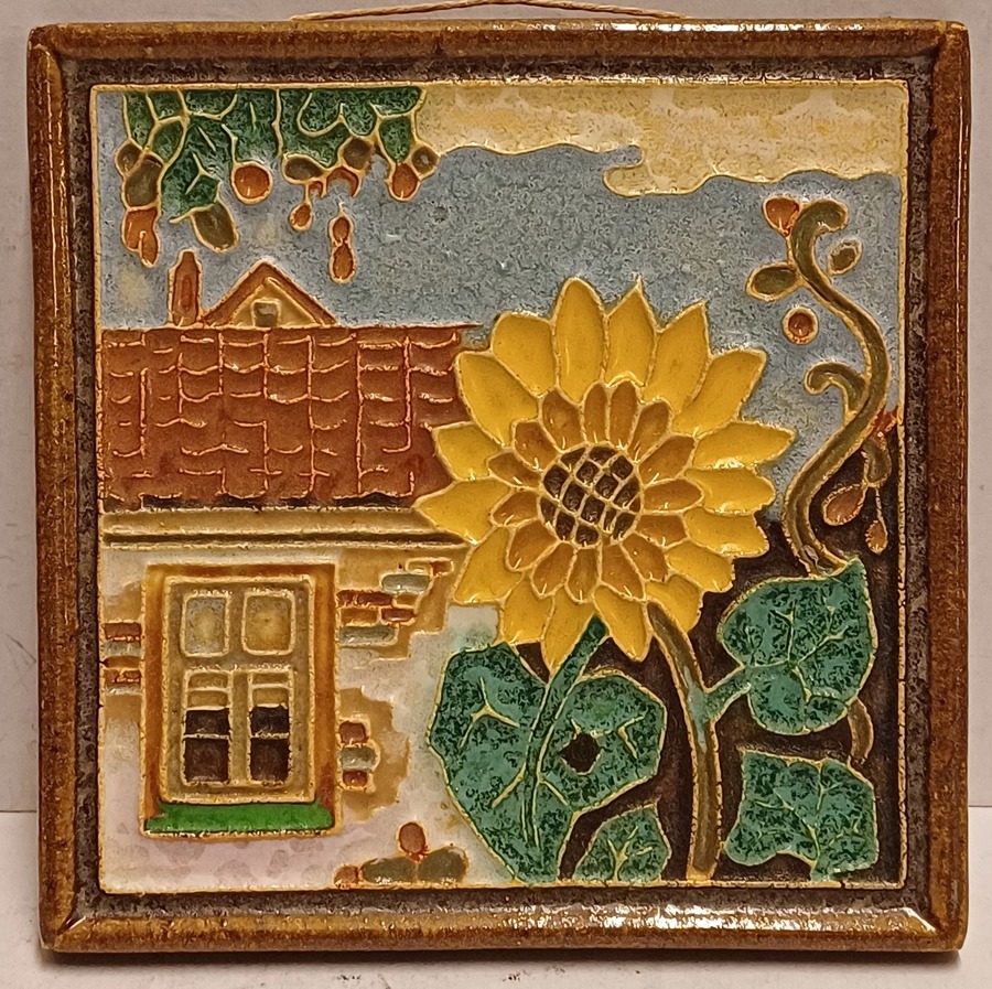 Aardewerken cloisonne tegel huis met zonnebloem. Achterzijde met fabrieksmerk.