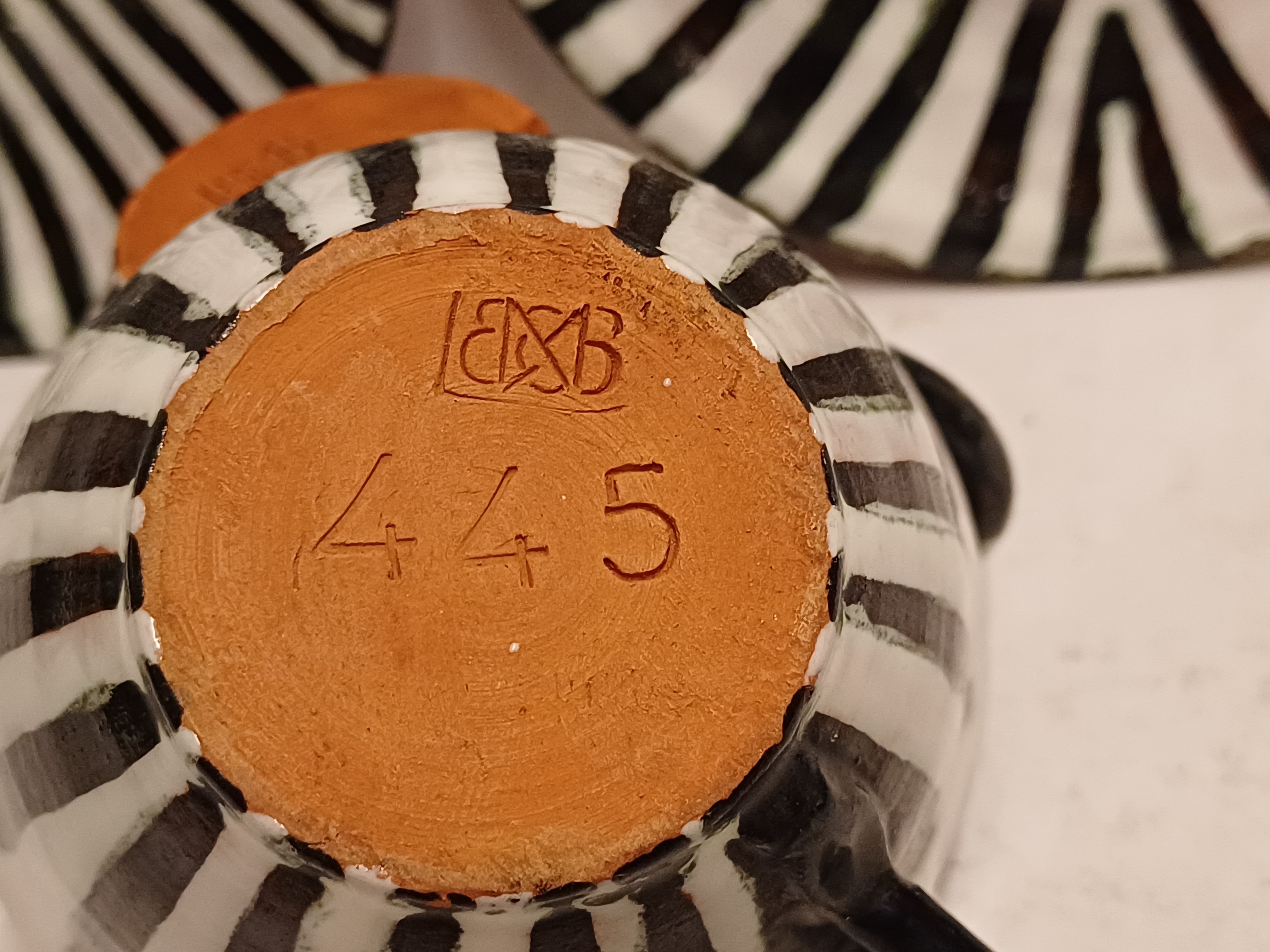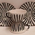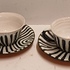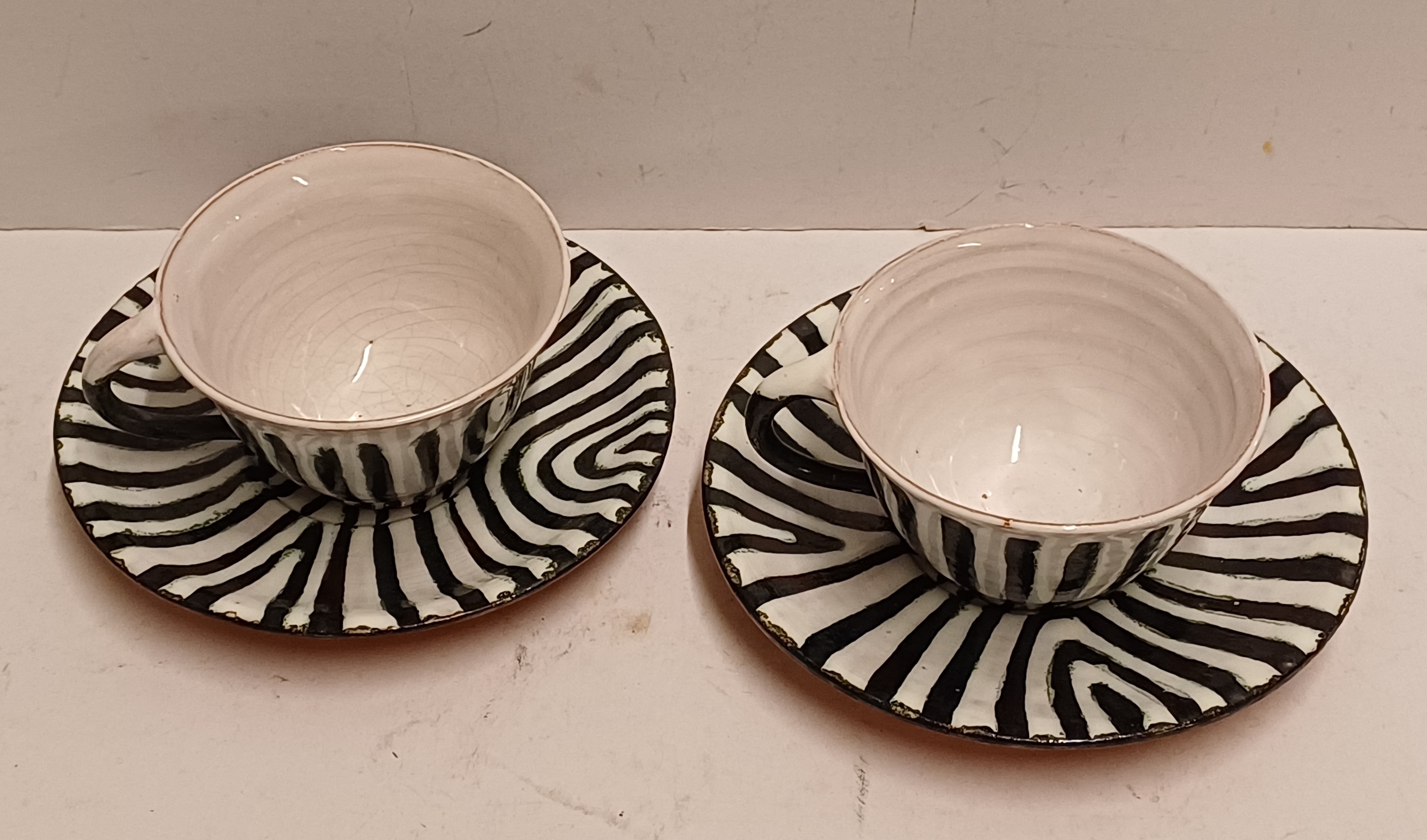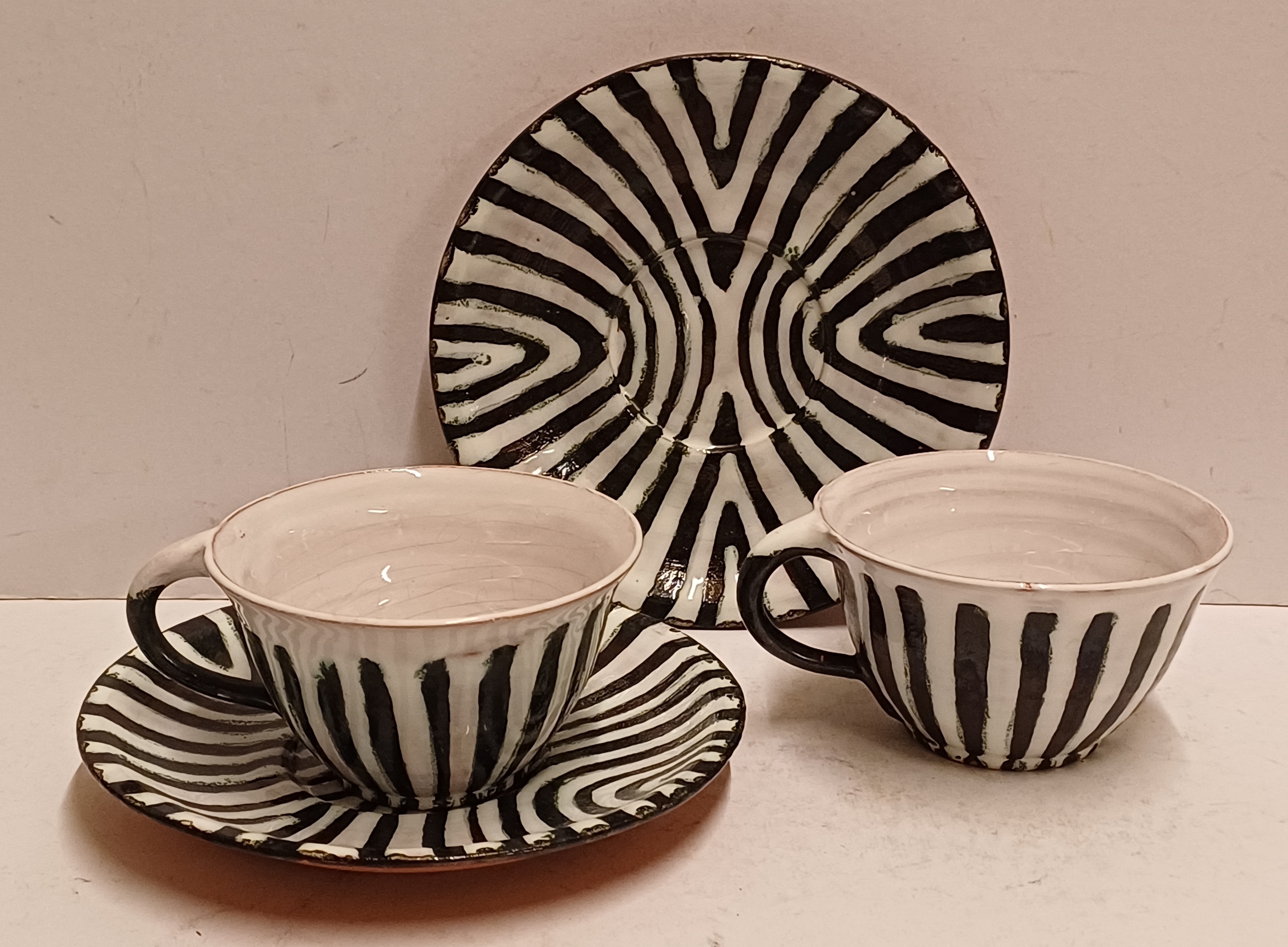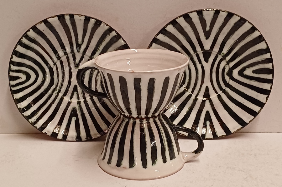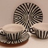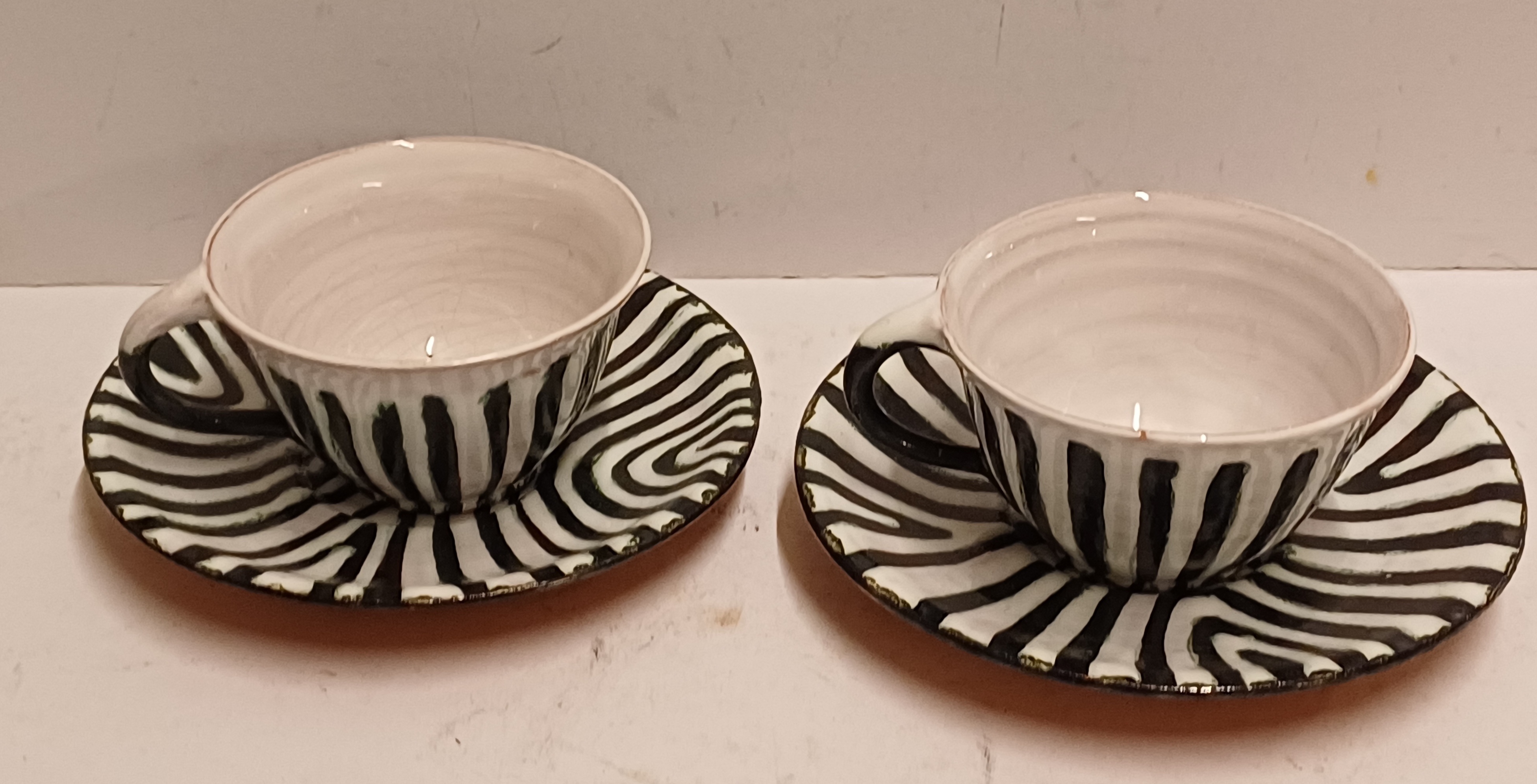 Een set met zwart witte zebra print gedecoreerde kop en schotels. Onderzijde met fabrieksmerk.