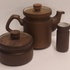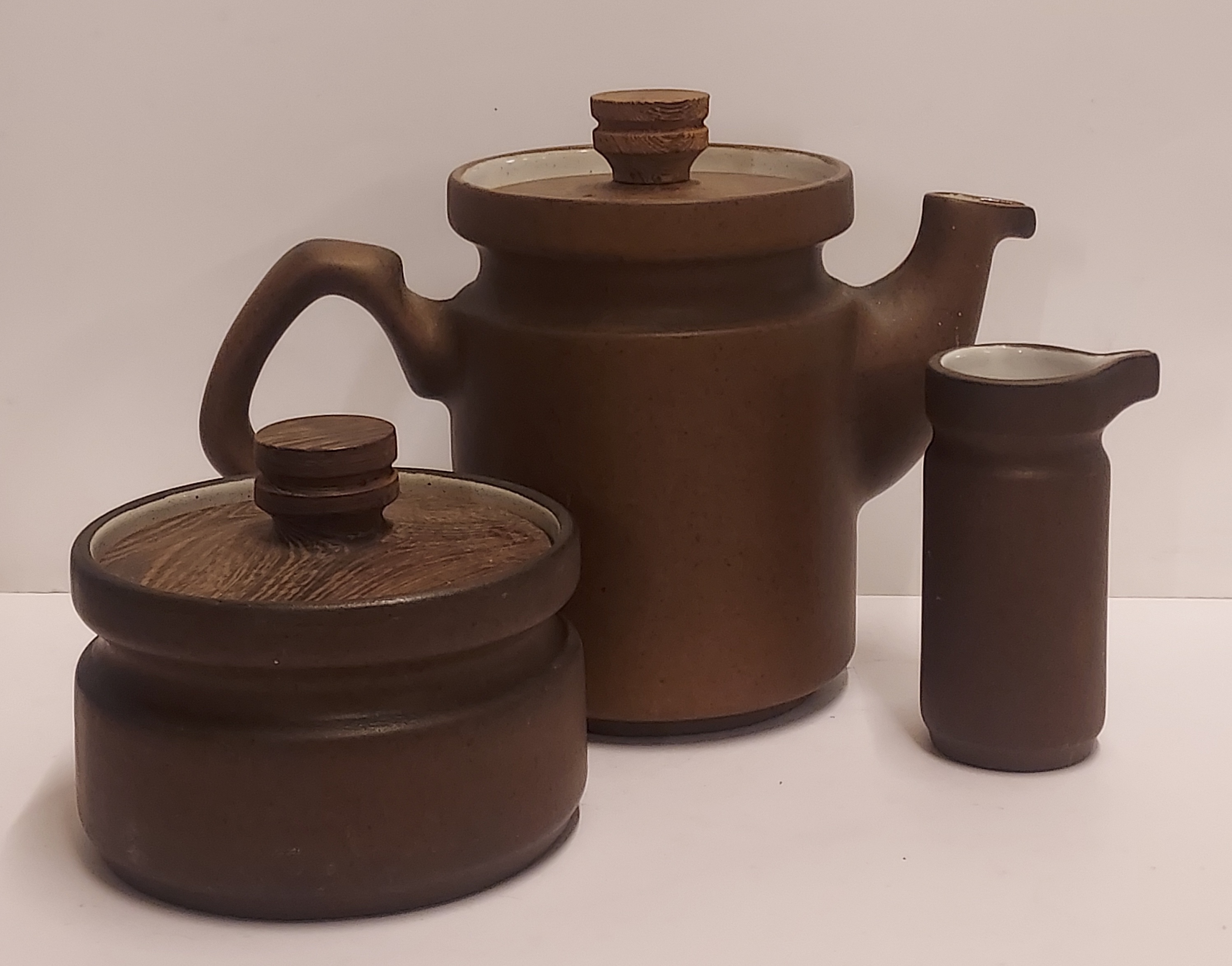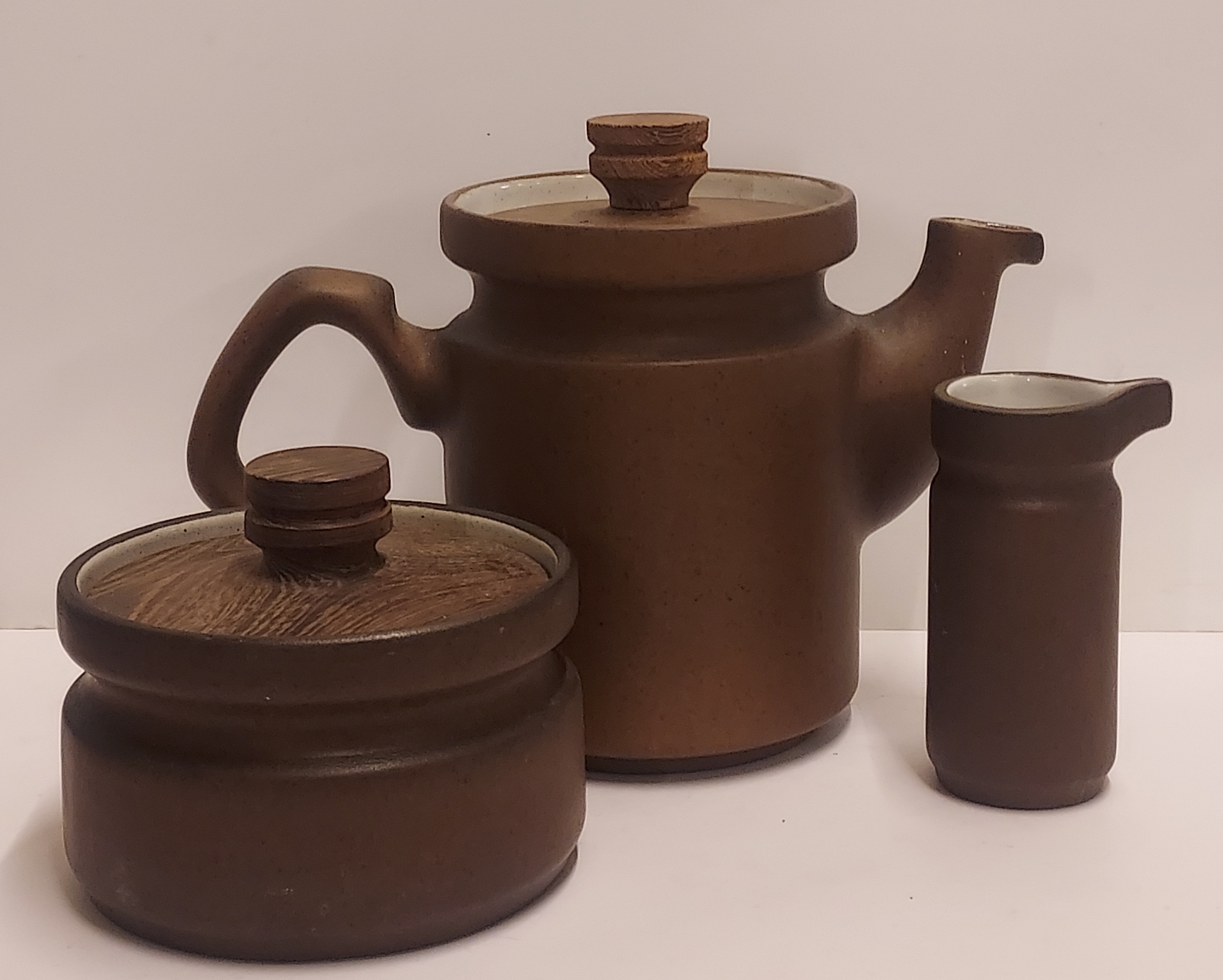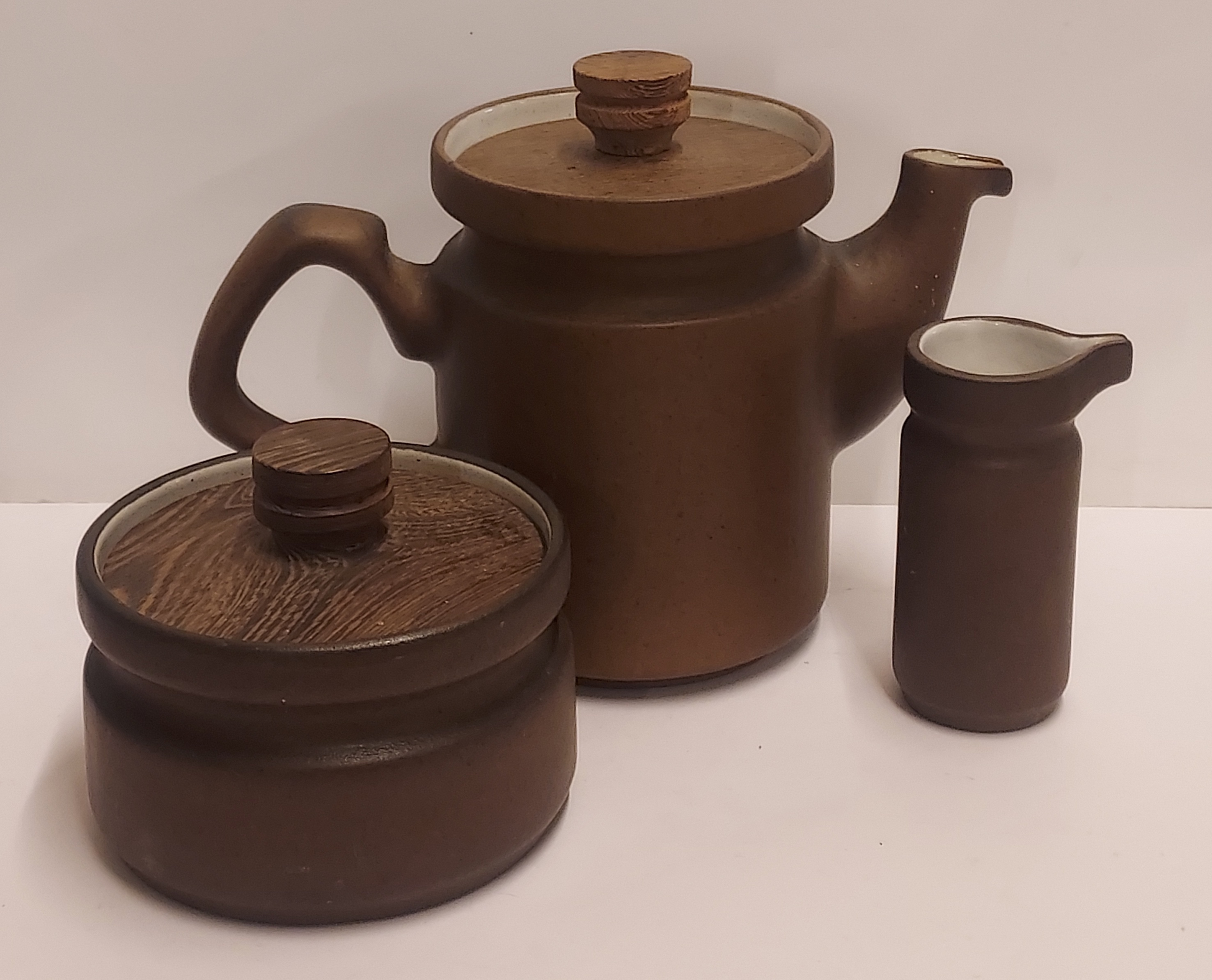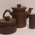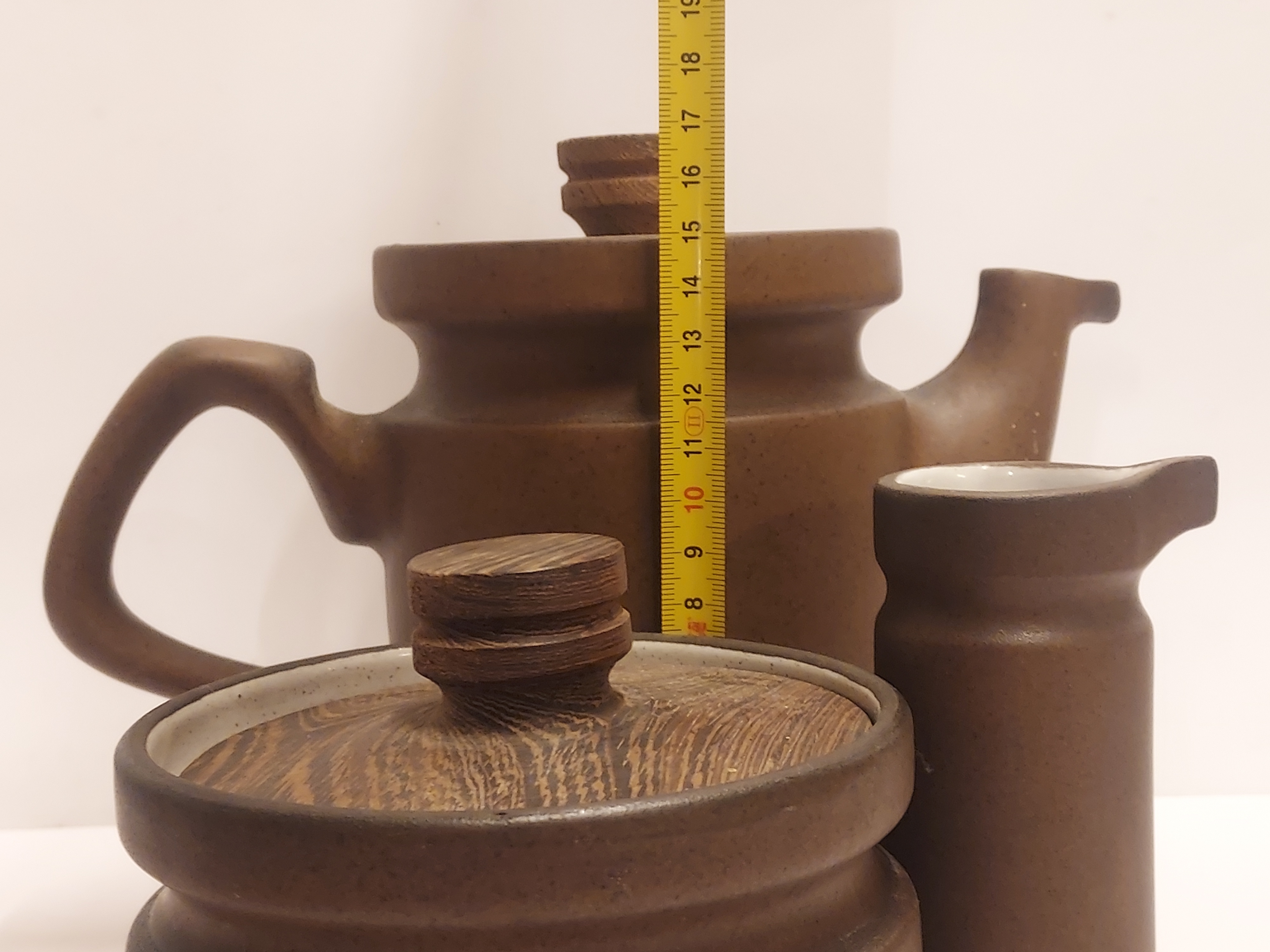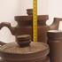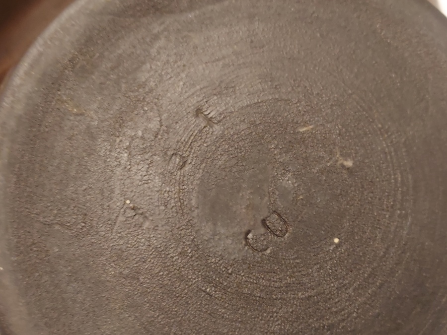 圆柱形模型,带有收紧设计和棕色釉面,配有相应的木盖。底部有 CU 品牌的印章。