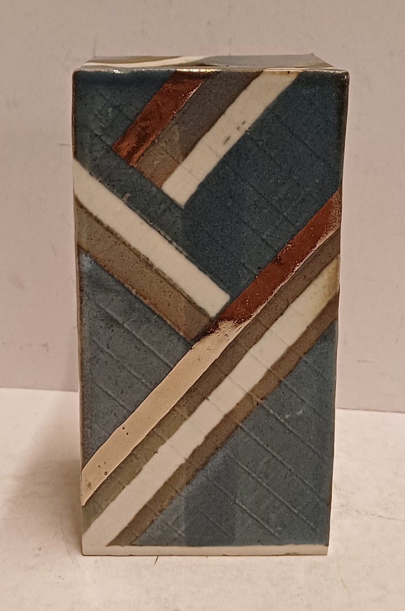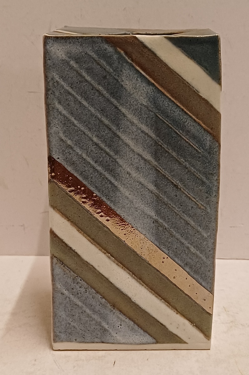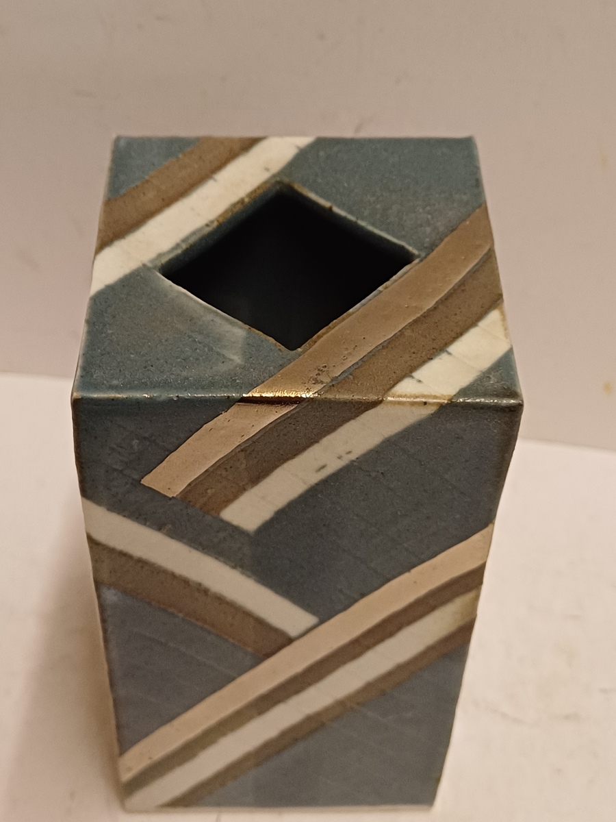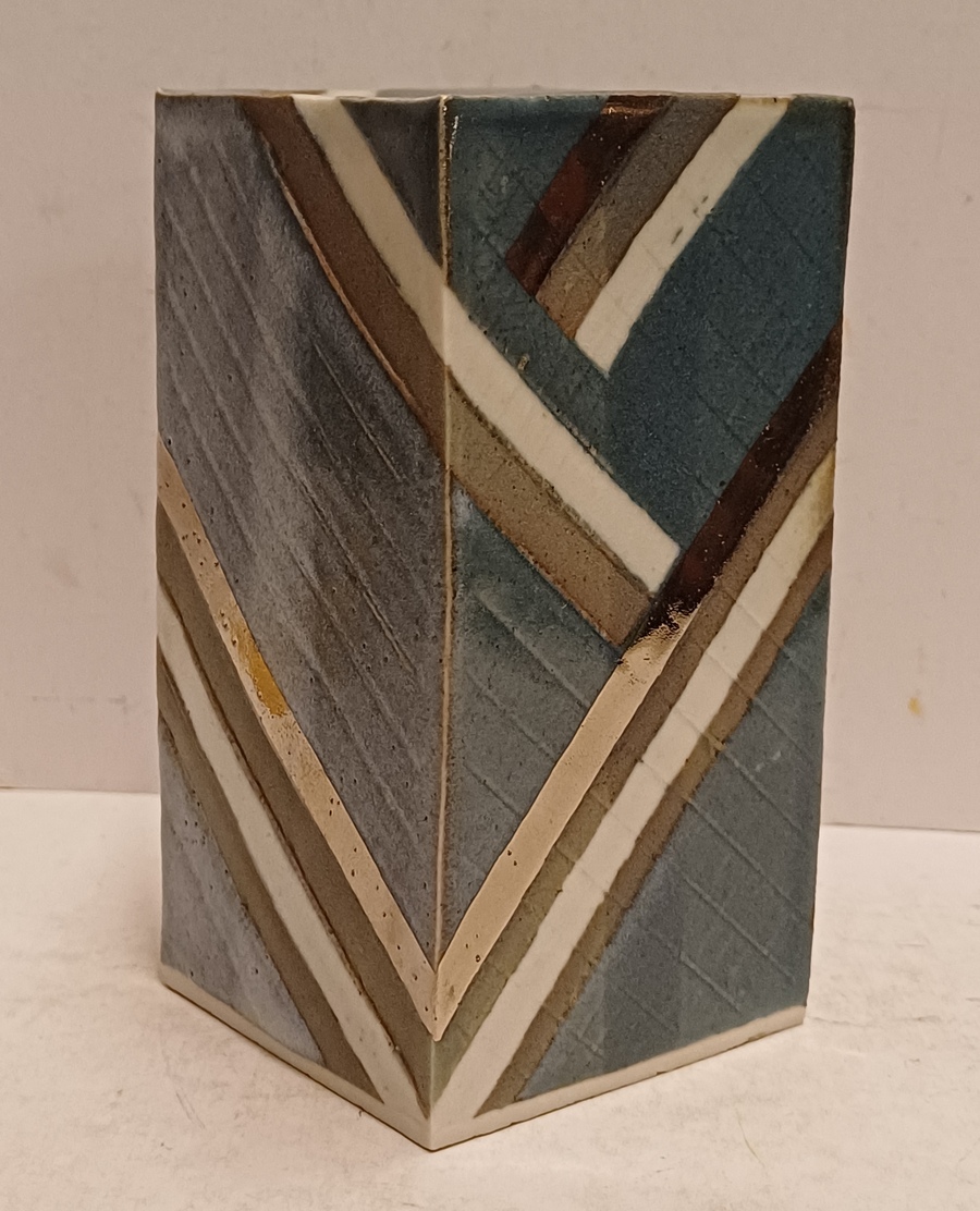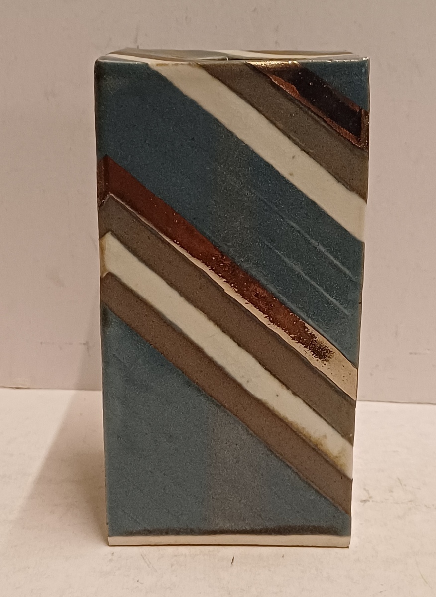 Vierkante uit platen opgebouwde vaas . Met blauw grijs en zilveren decoratie. Niet gesigneerd