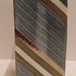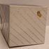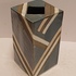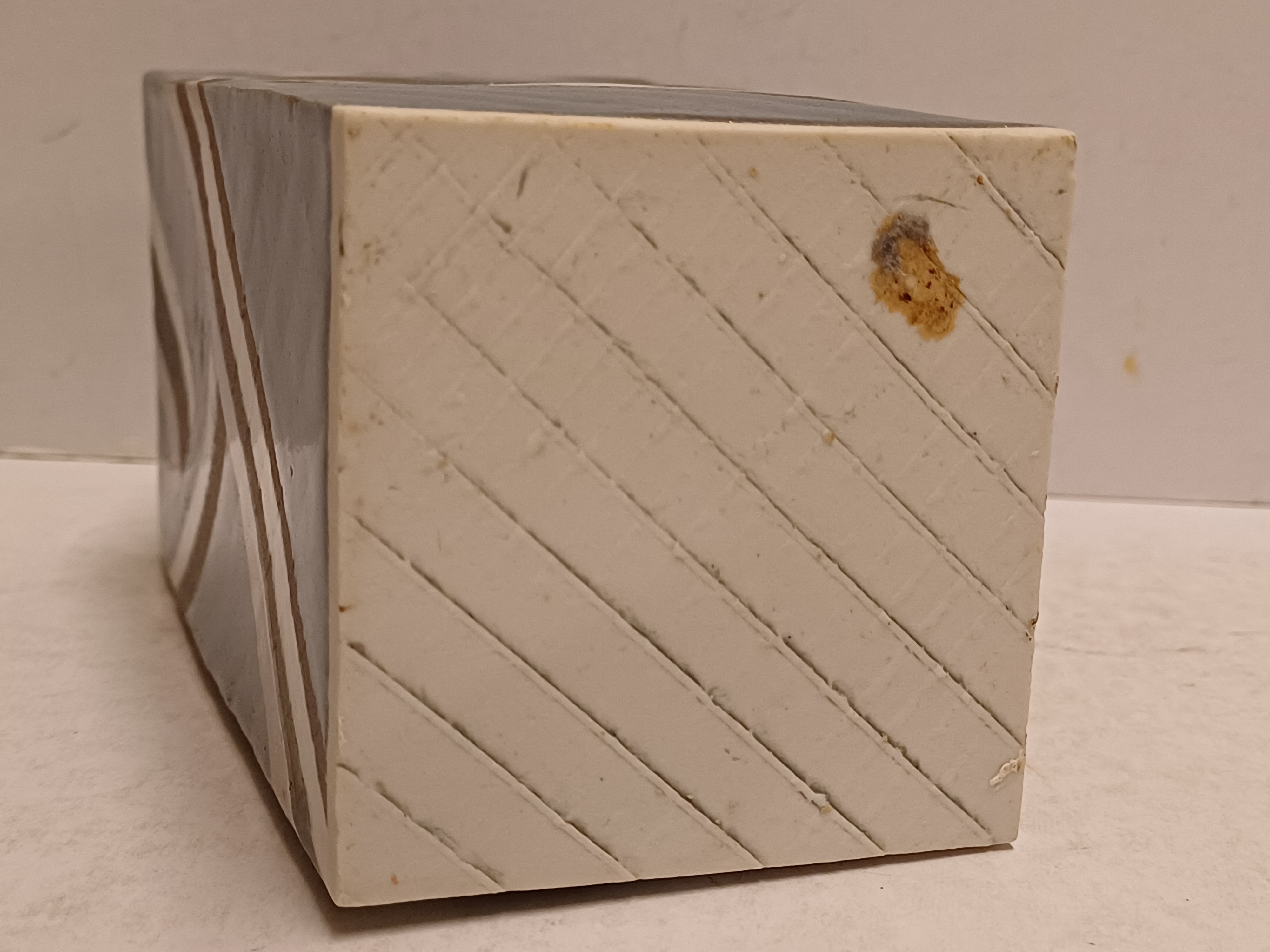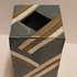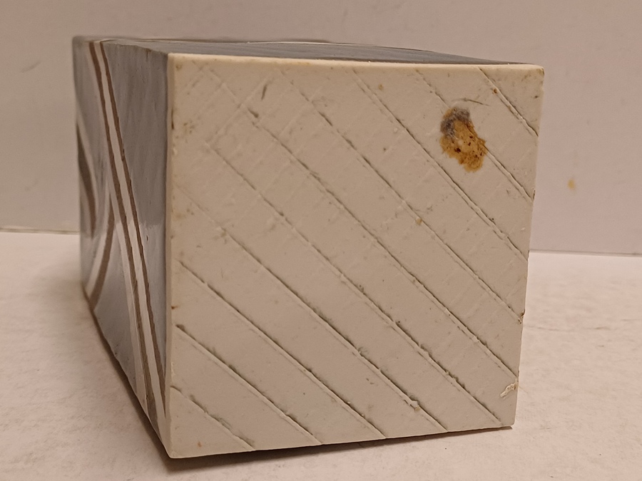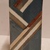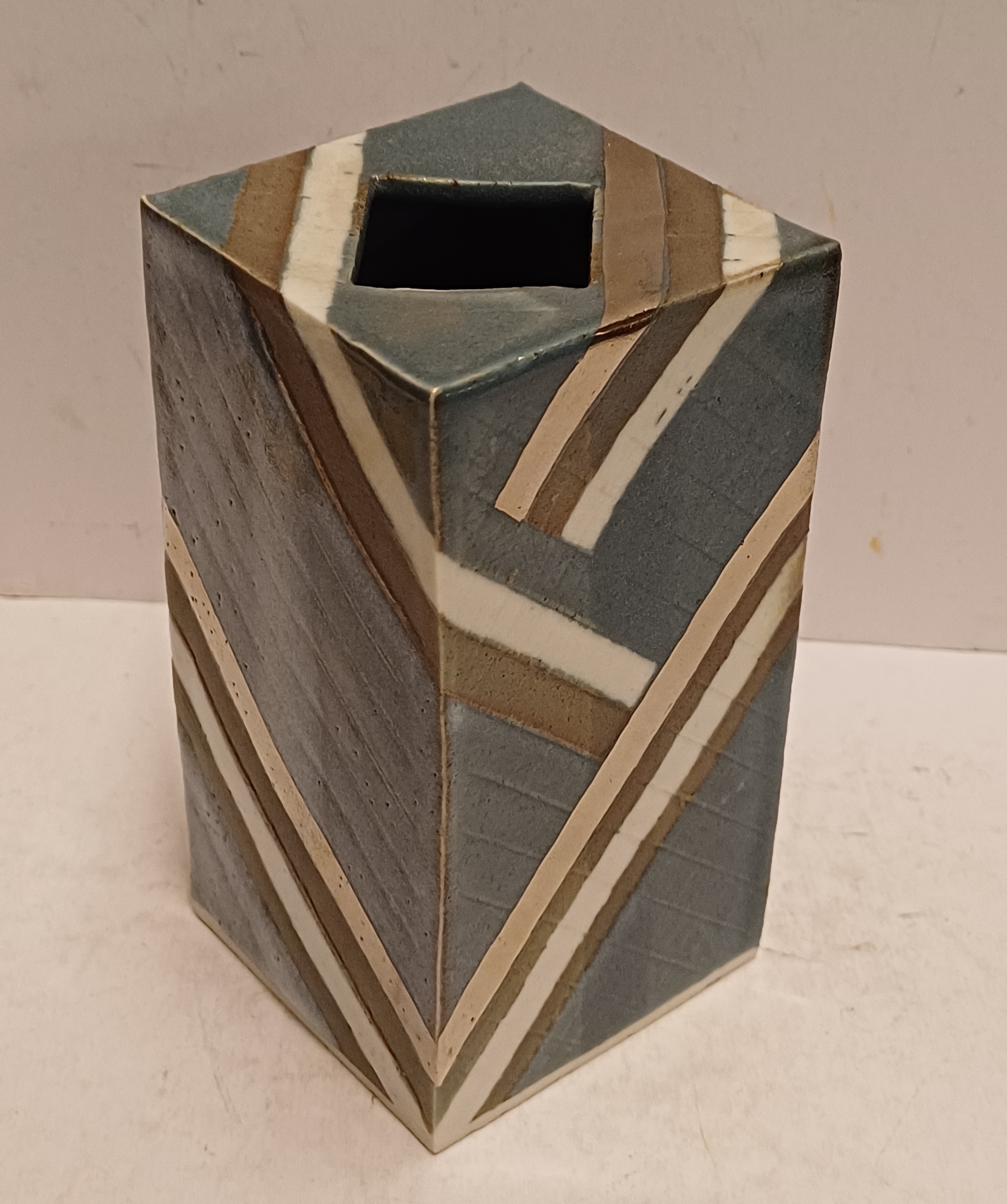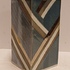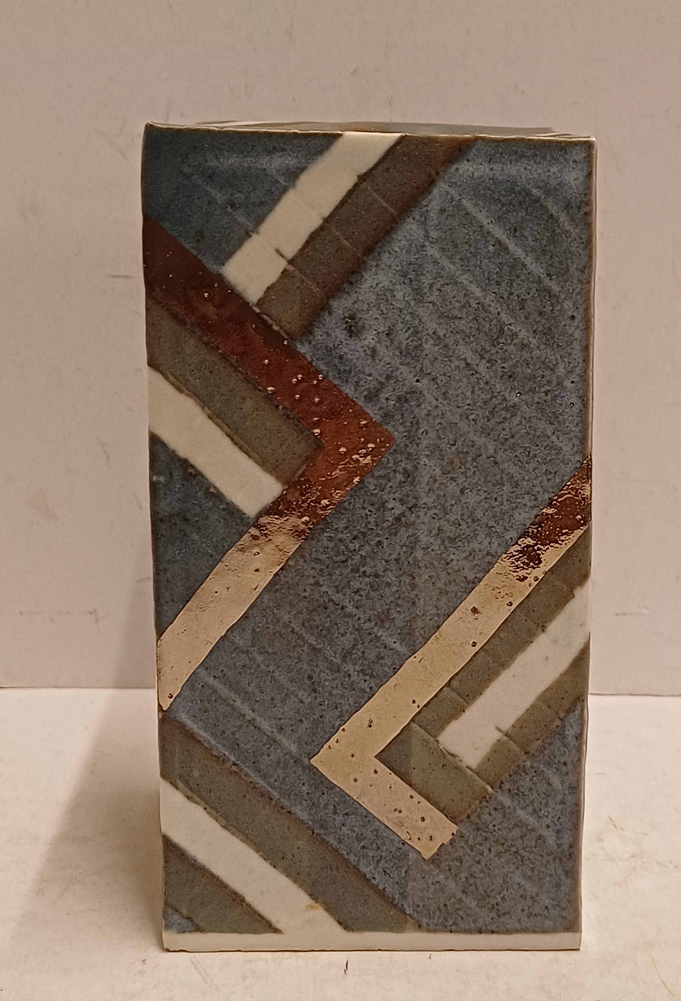 Vierkante uit platen opgebouwde vaas . Met blauw grijs en zilveren decoratie. Niet gesigneerd
