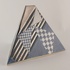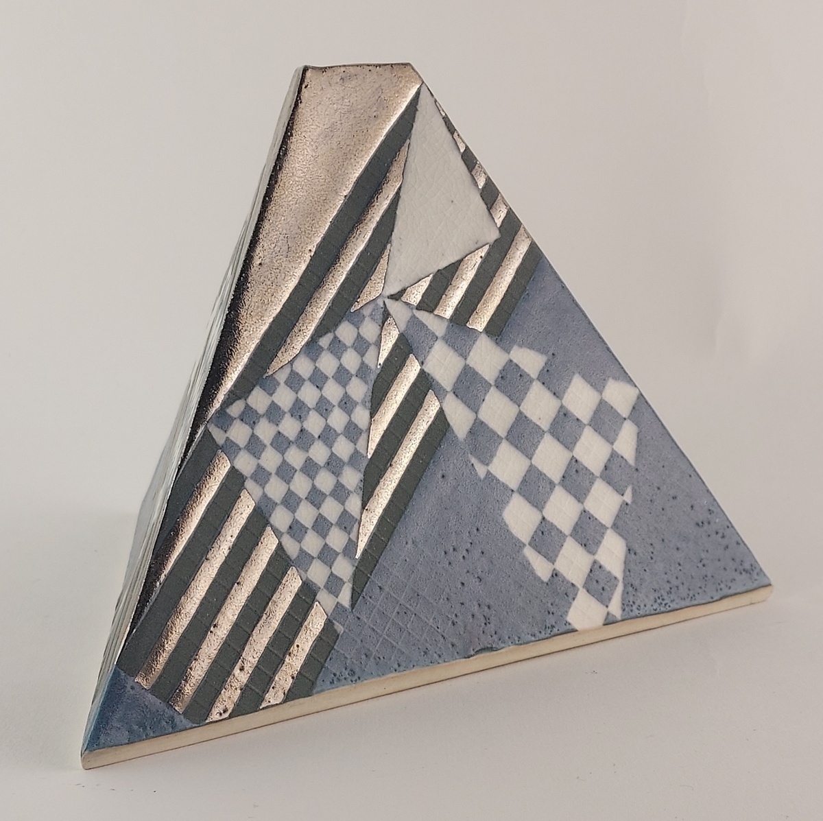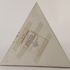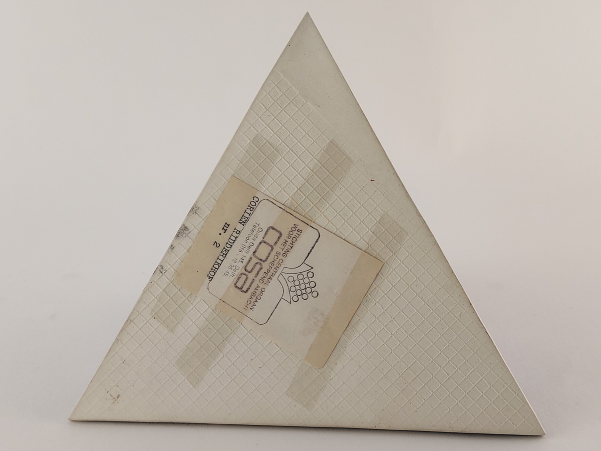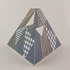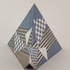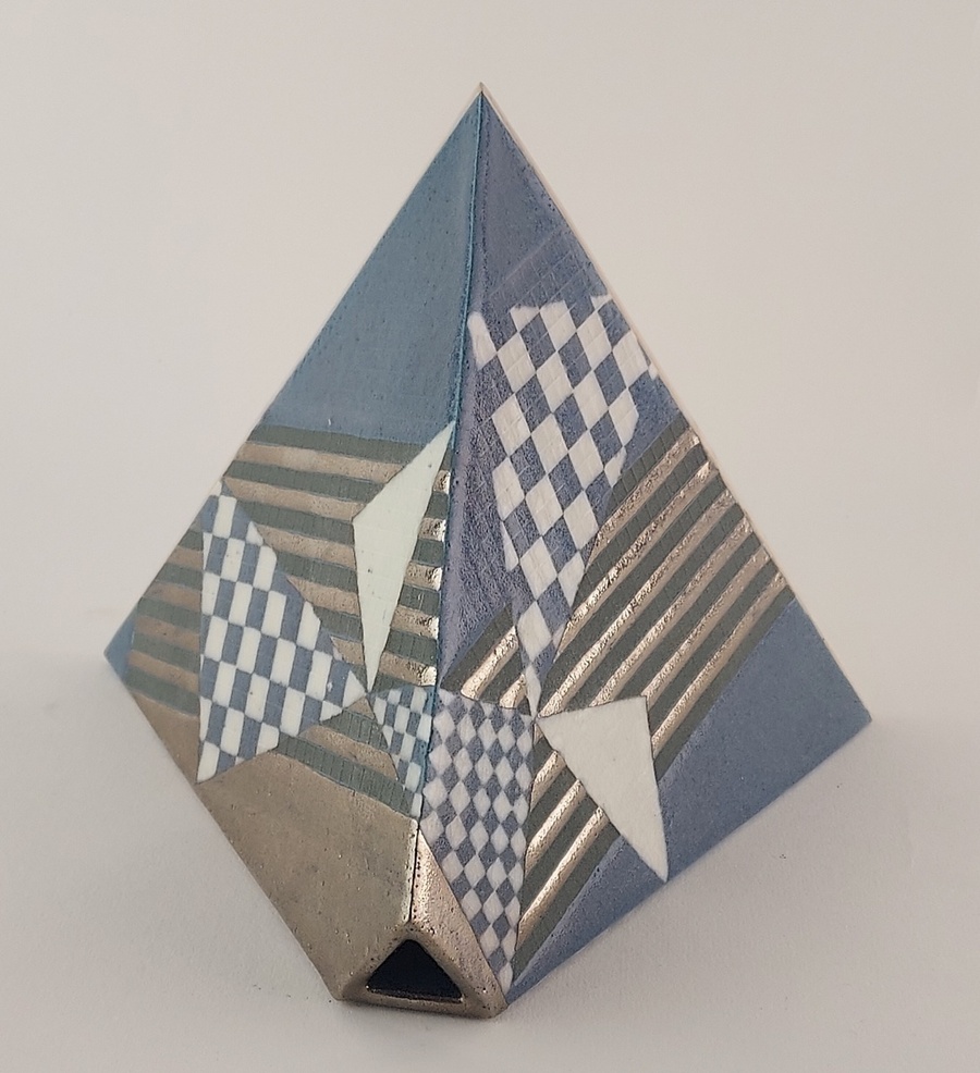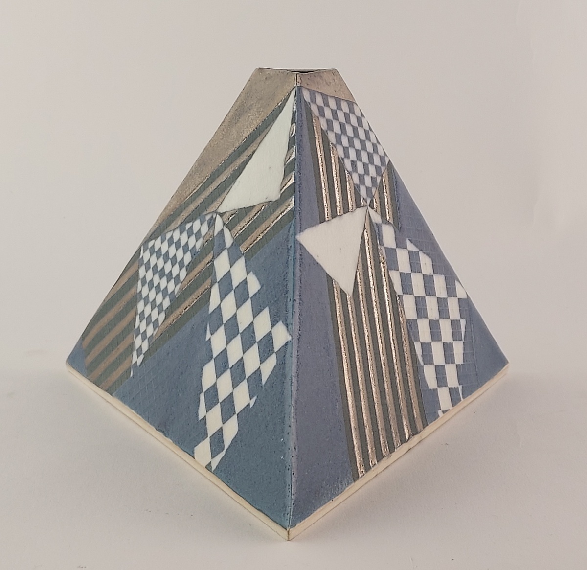 金字塔形状的花瓶,带有方块装饰。底部带有标签。