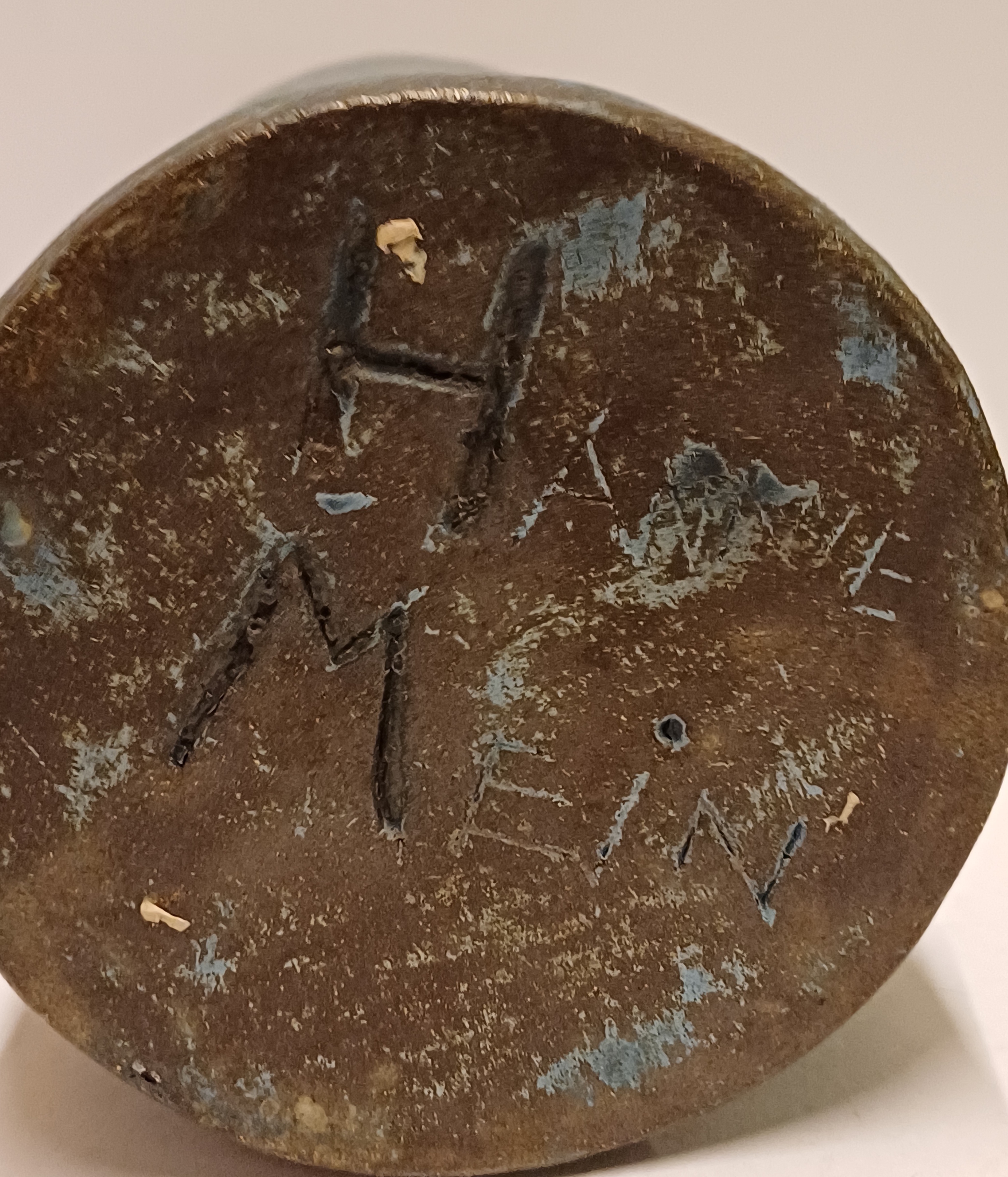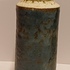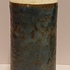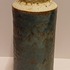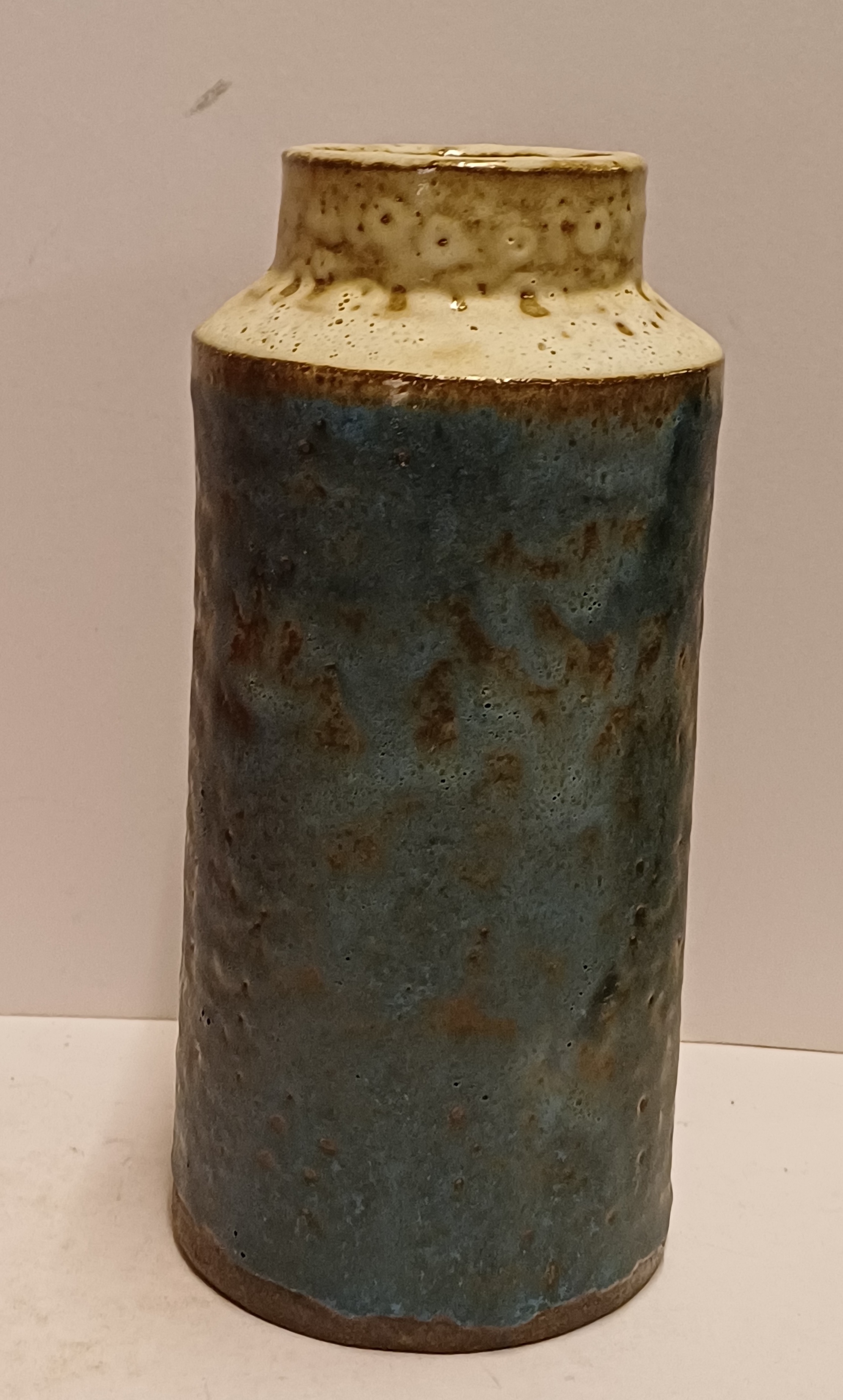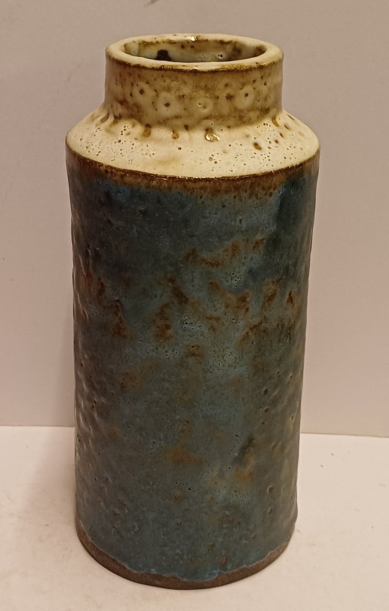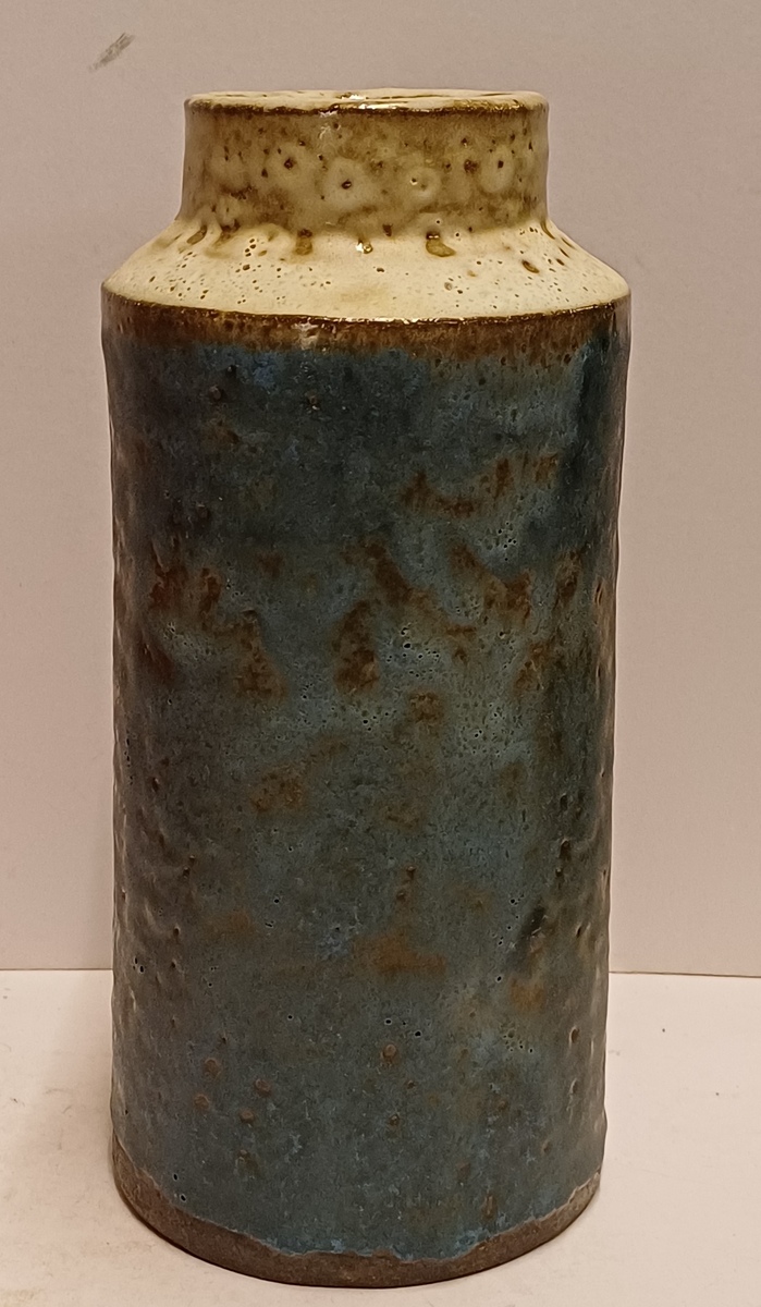 Cilindrische vaas met blauw groene glazuur en de hals met creme glazuur. Onderzijde voluit gesigneerd.