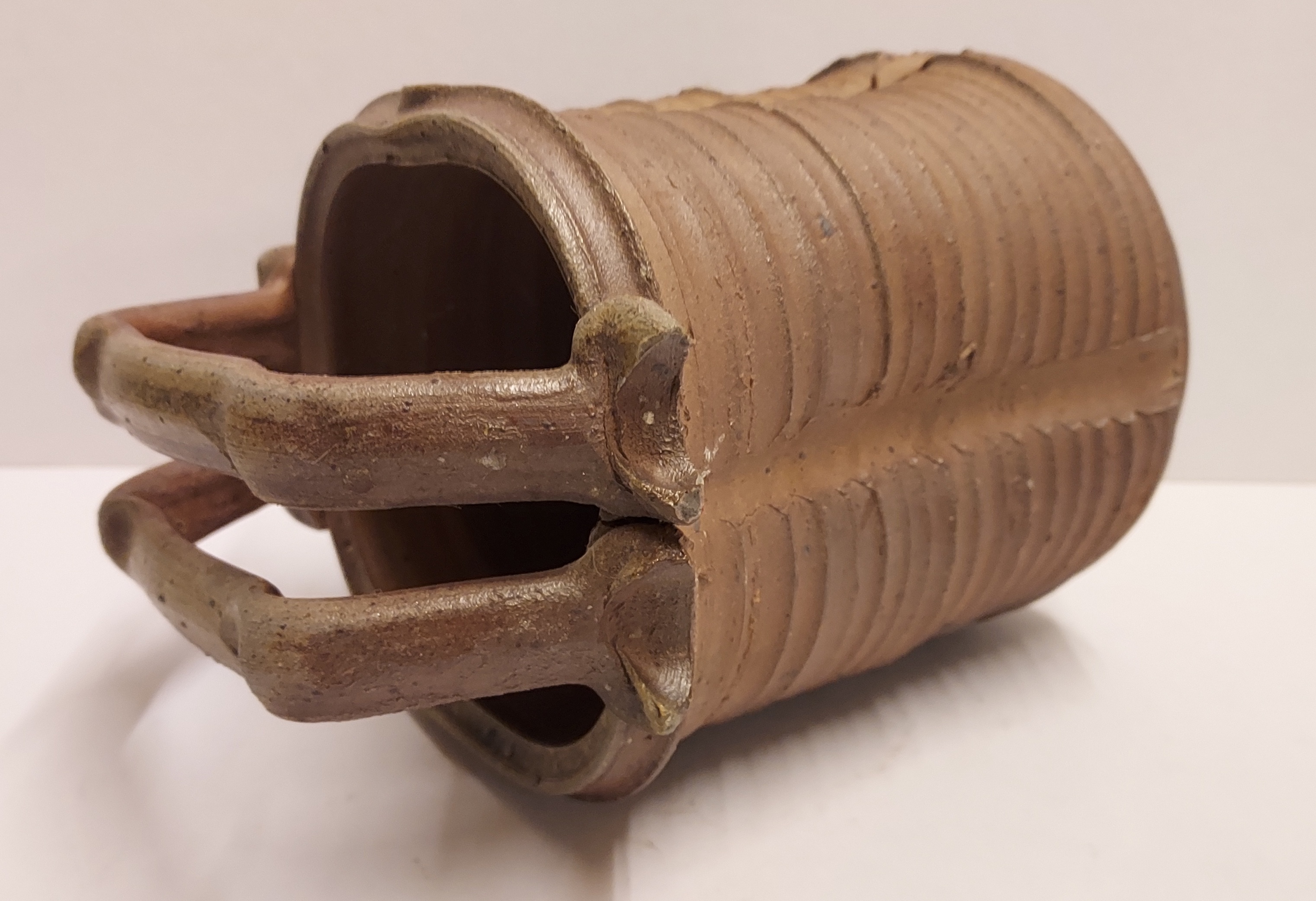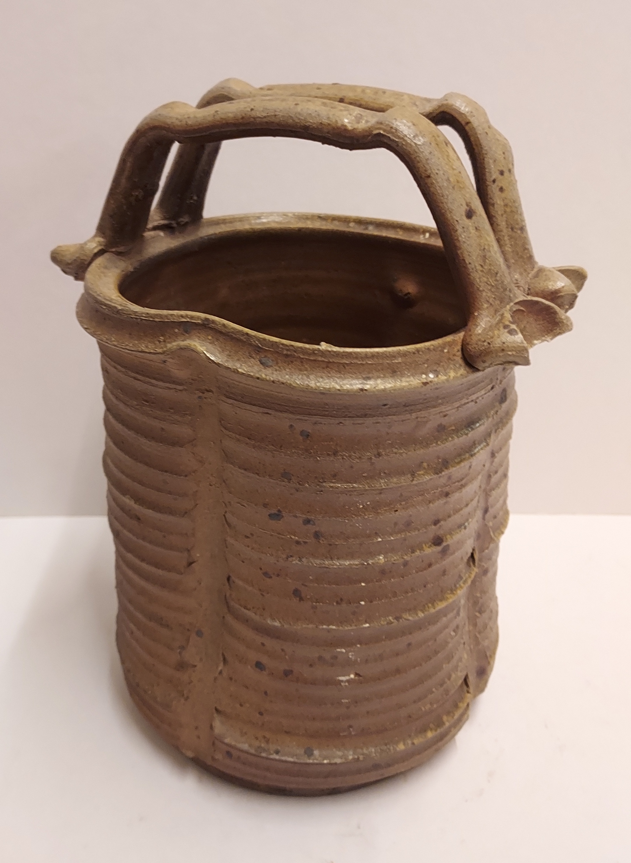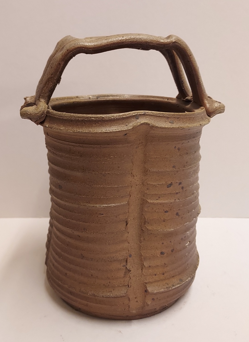 带有垂直肋骨和高手柄的花瓶,采用棕色盐釉。底部带有字母组合标志。