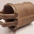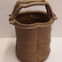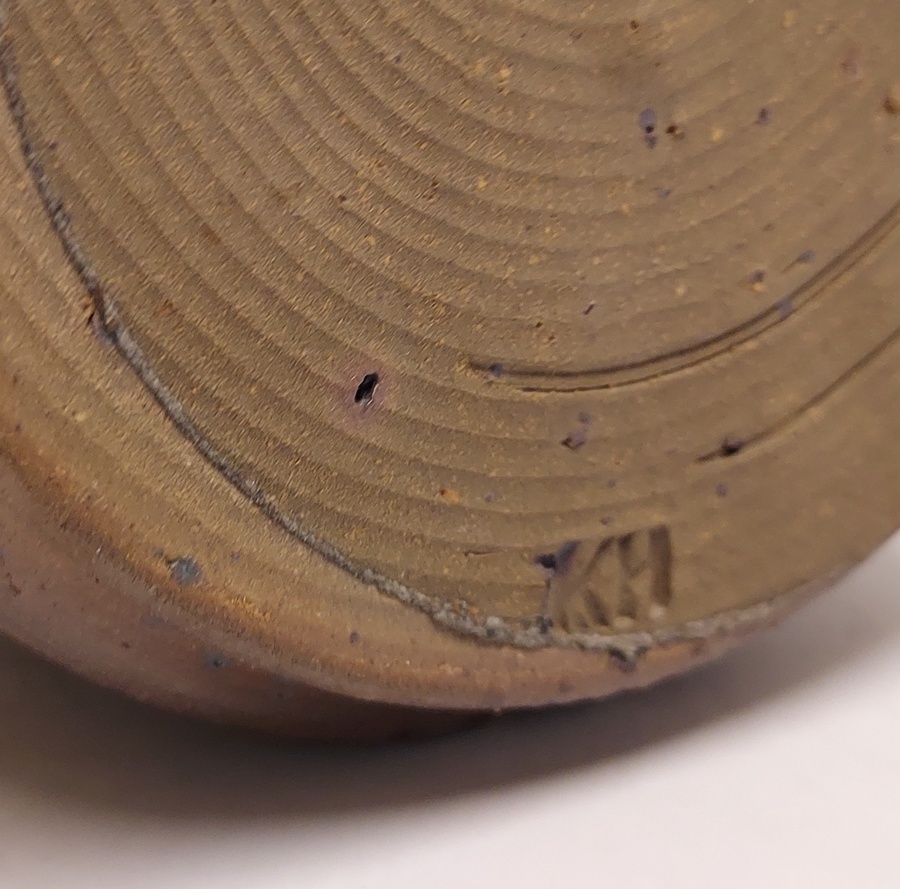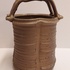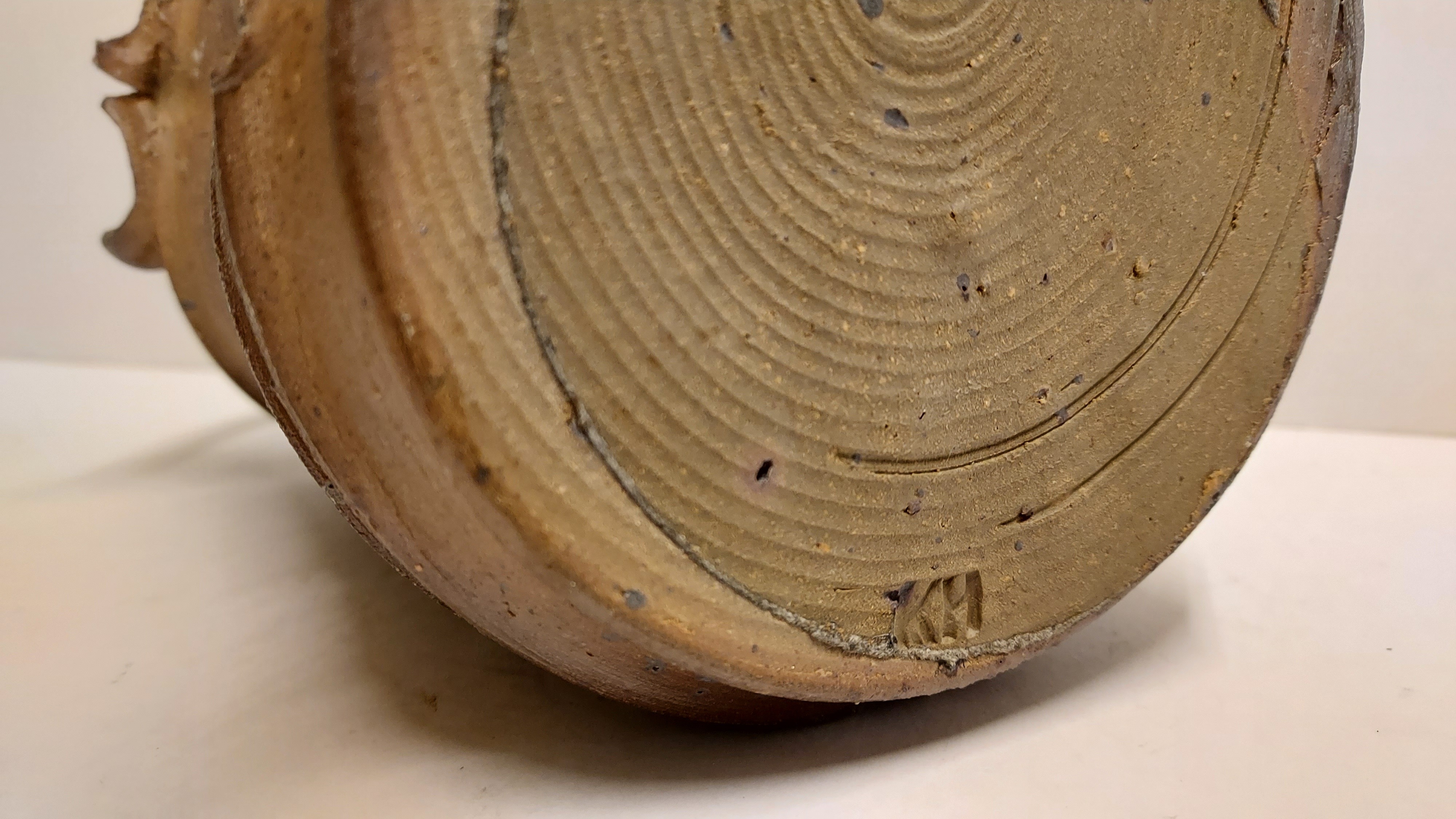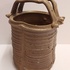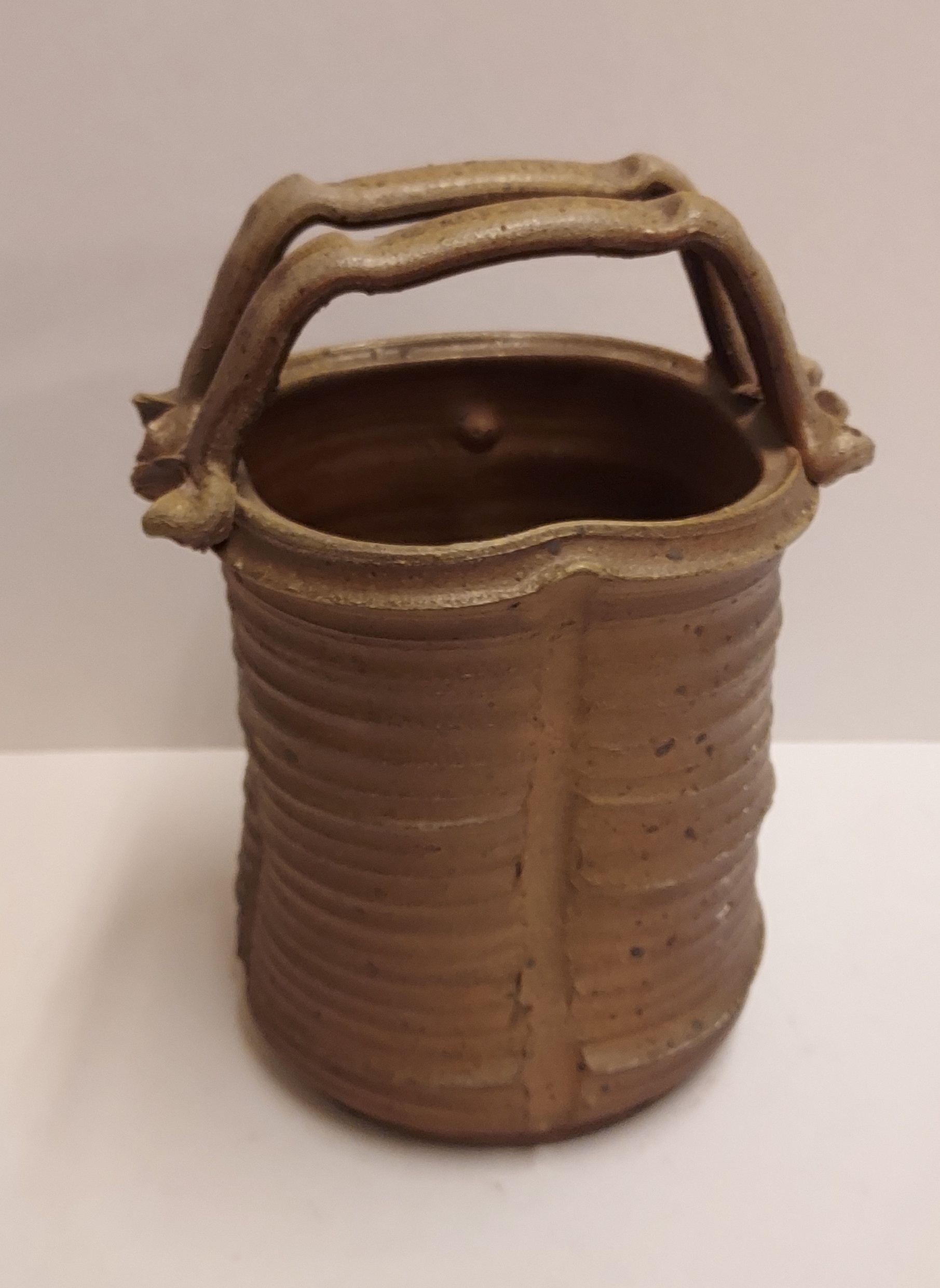 带有垂直肋骨和高手柄的花瓶,采用棕色盐釉。底部带有字母组合标志。