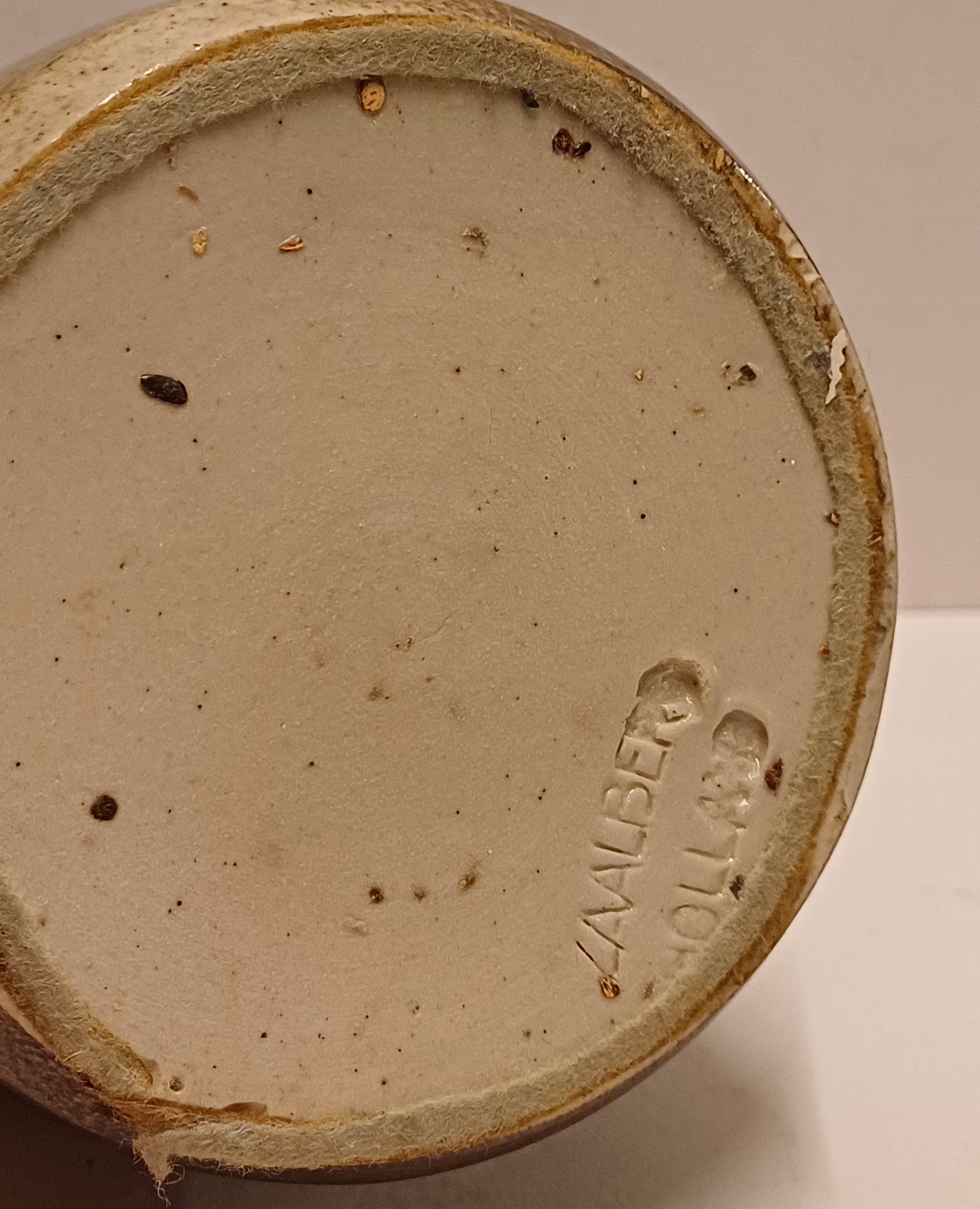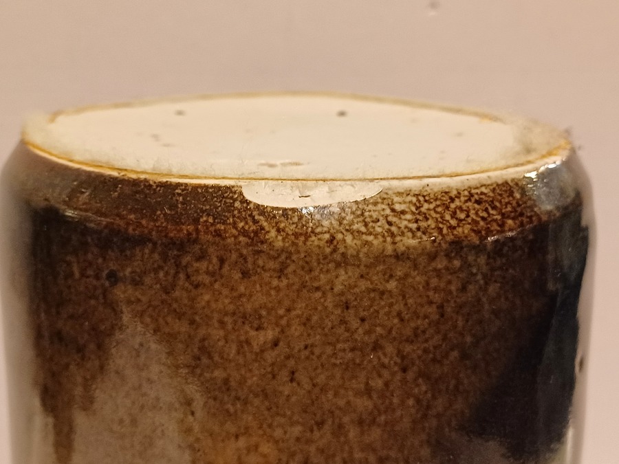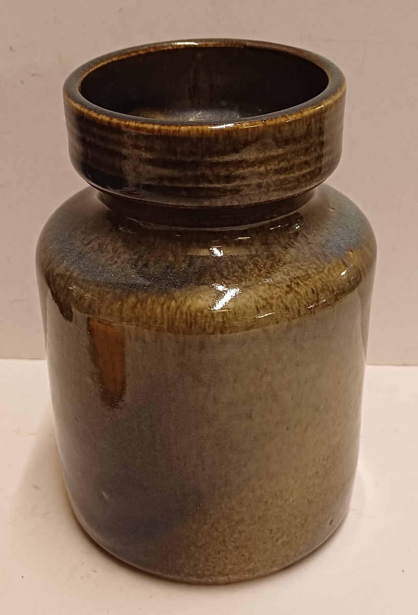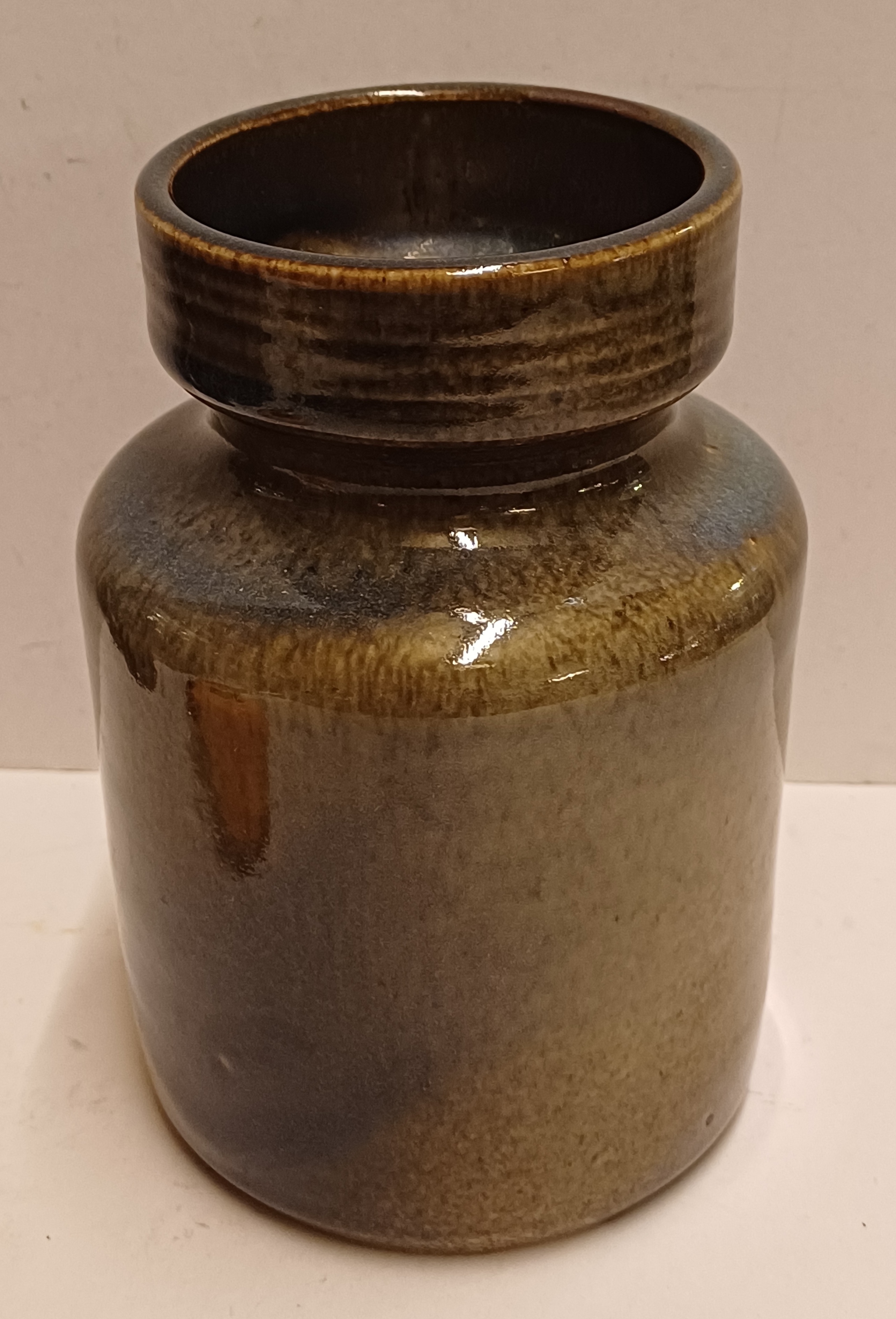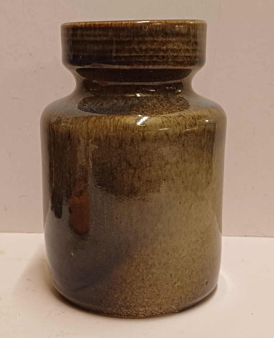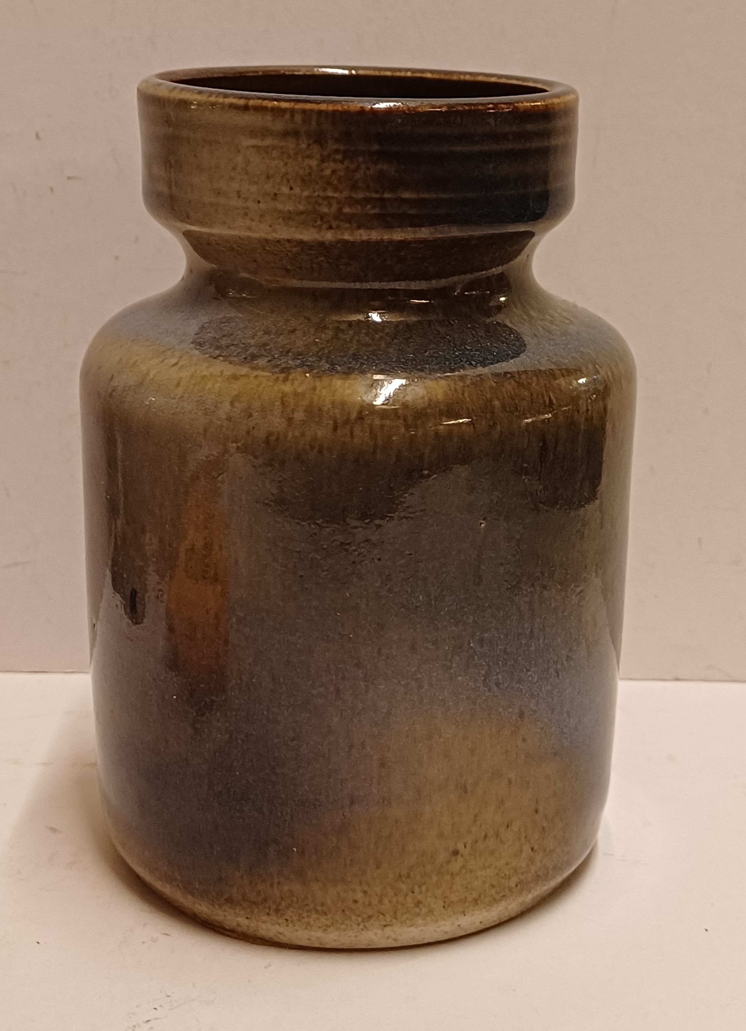 Aardewerken cilindrische vaas met met insnoering aan de bovenzijde met grijs bruine glazuur. Onderzijde met fabrieksmerk.