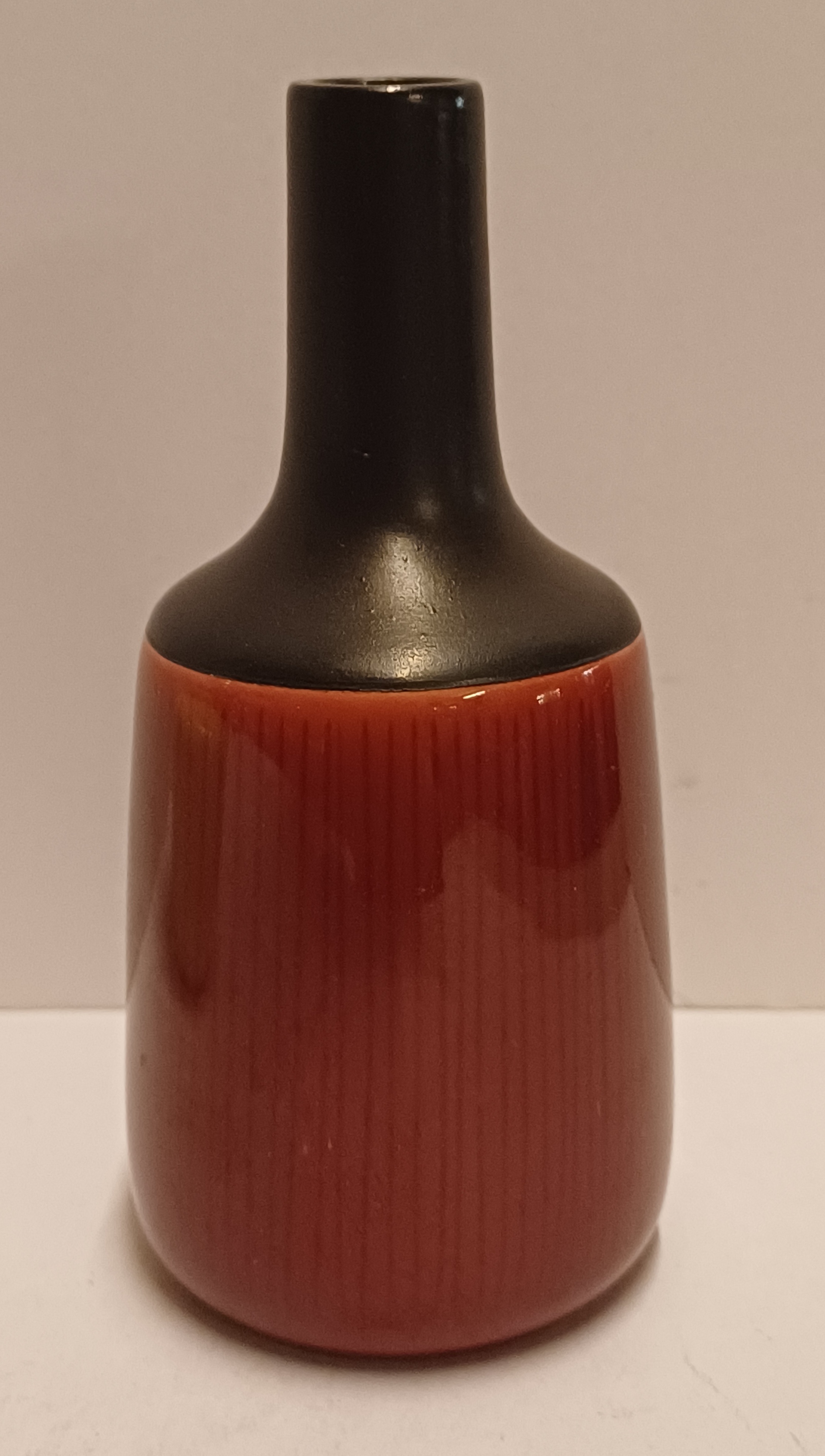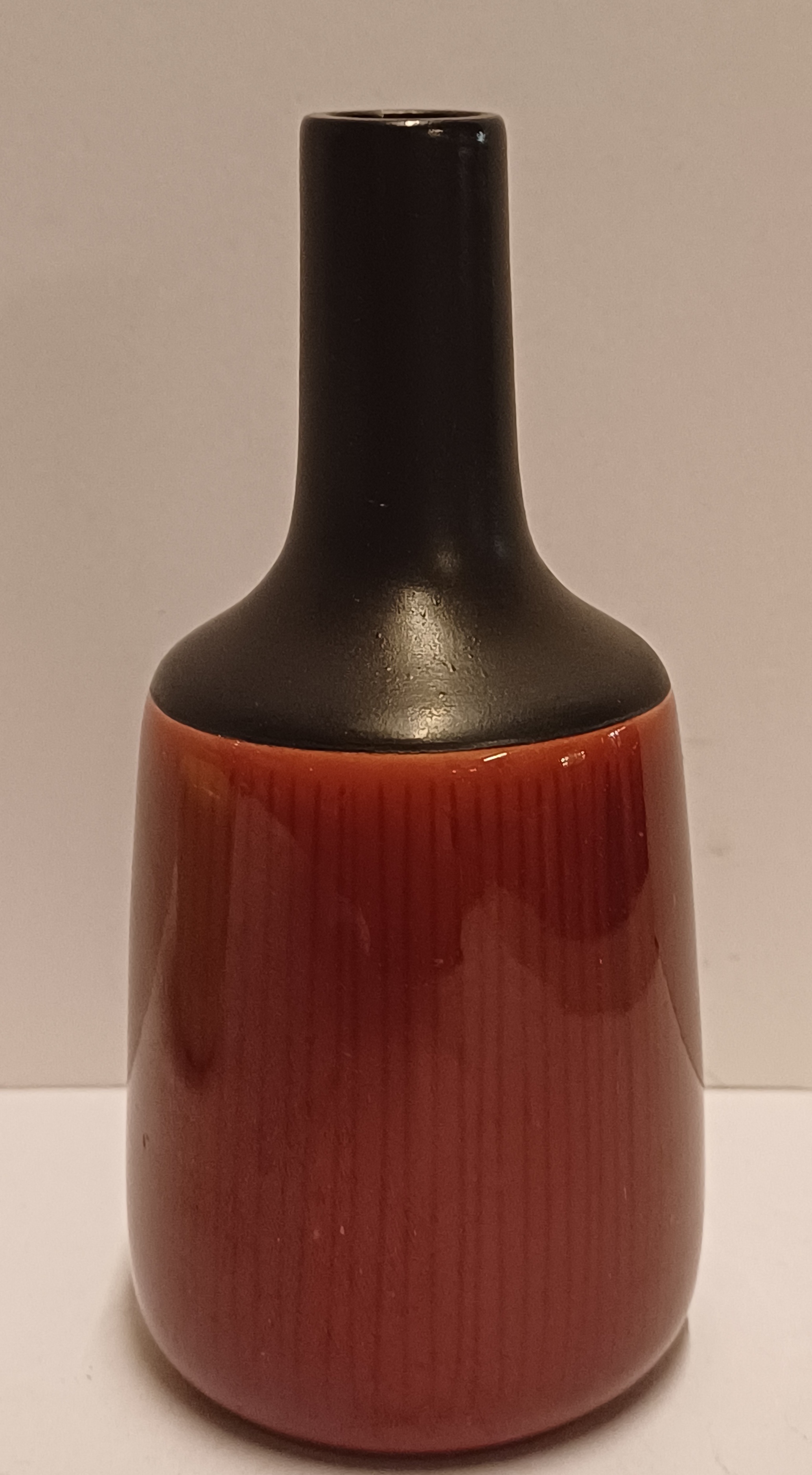 带有红色釉肚和细垂直线条的小花瓶,颈部和口部为哑黑釉。底部带有工厂标志。
