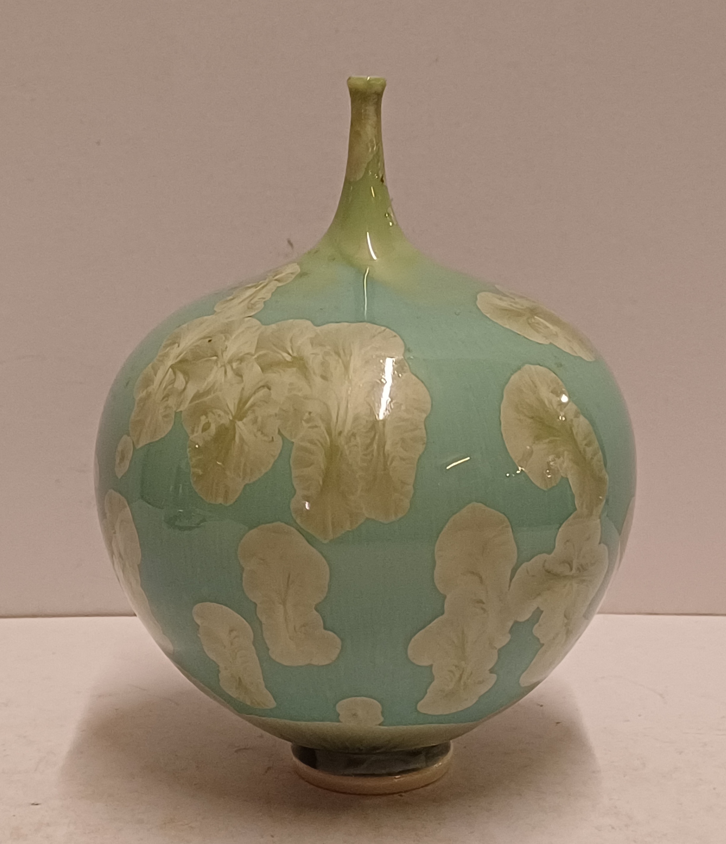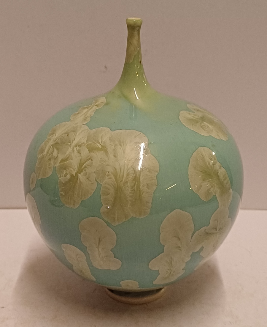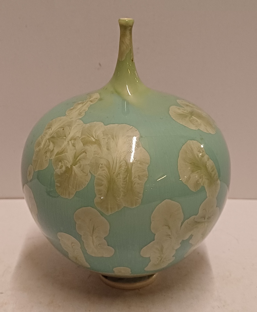 Aardewerken vaas met fijn klein halsje. Met kristalglazuur op groen fond. Onderzijde gesigneerd met kunstenaars signatuur.