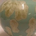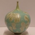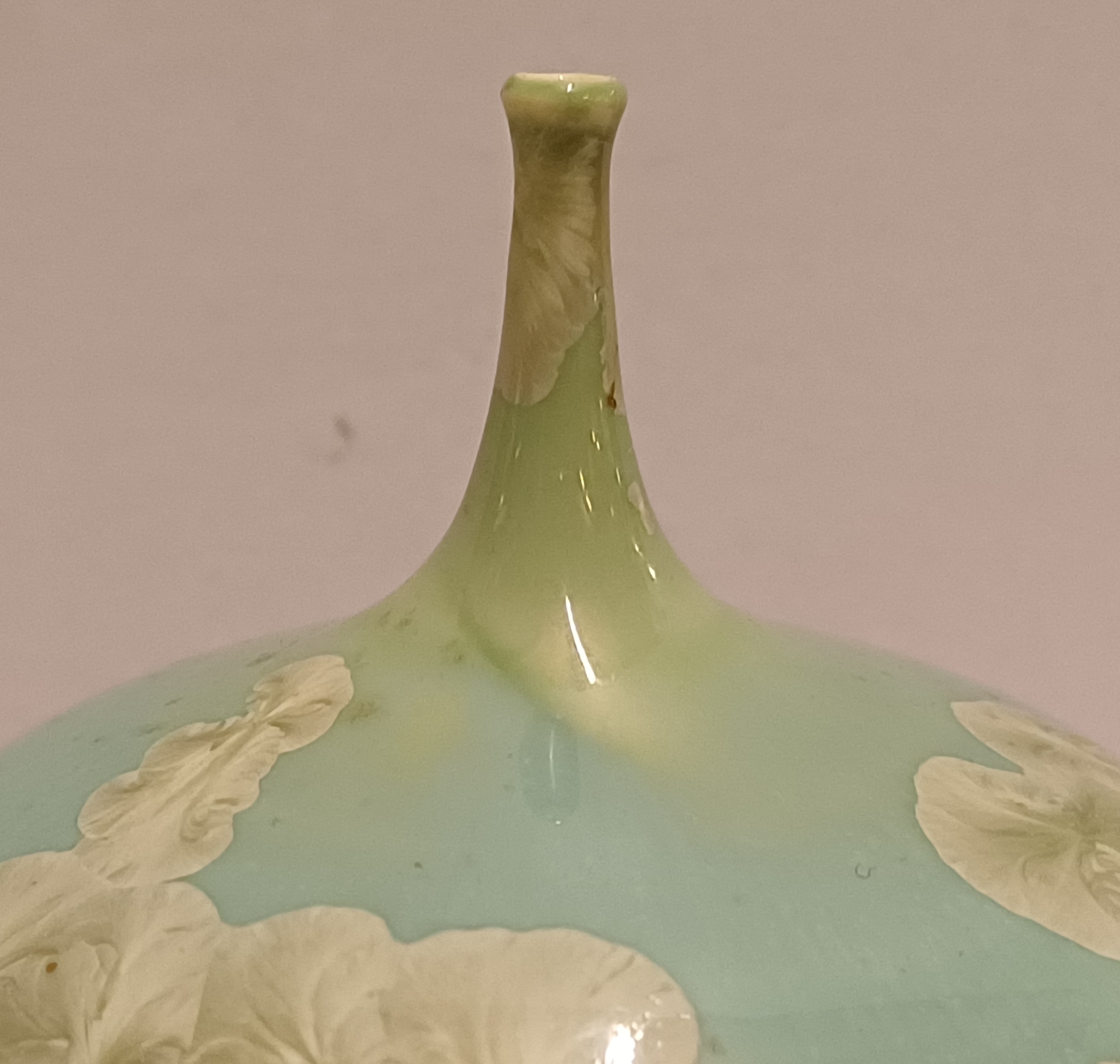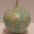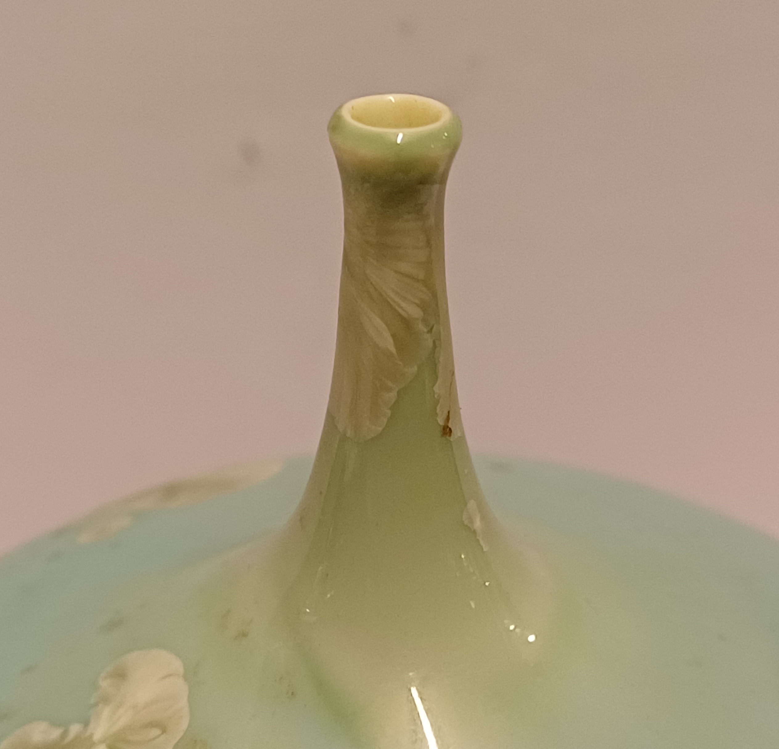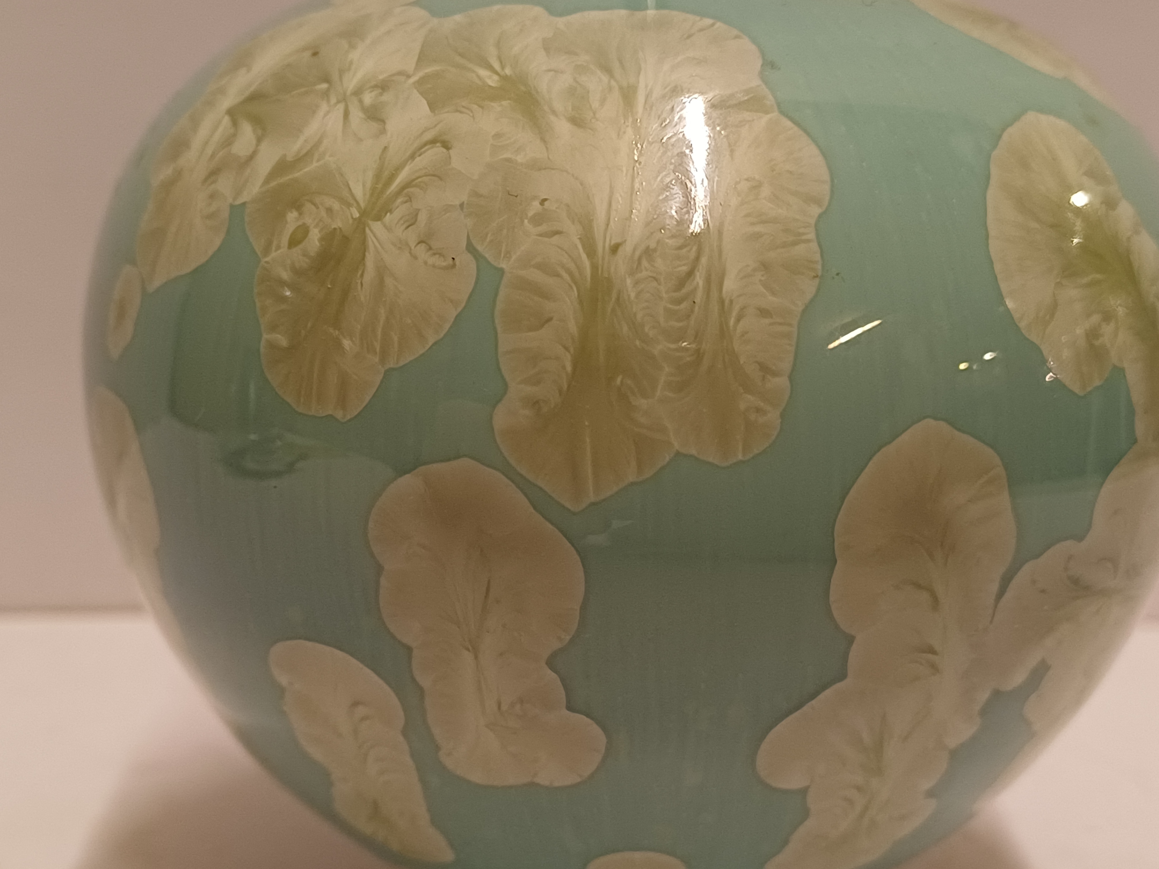 Aardewerken vaas met fijn klein halsje. Met kristalglazuur op groen fond. Onderzijde gesigneerd met kunstenaars signatuur.