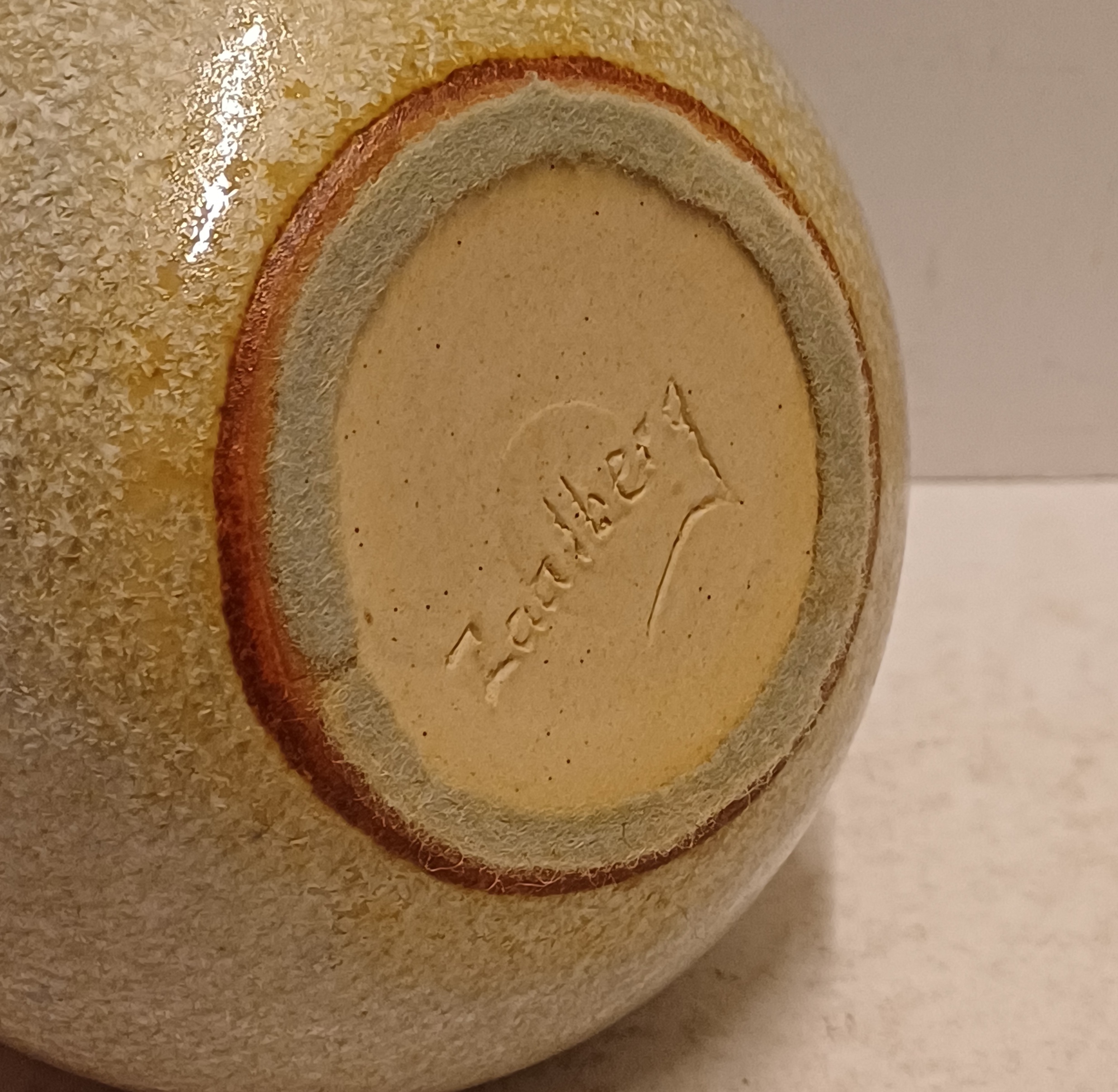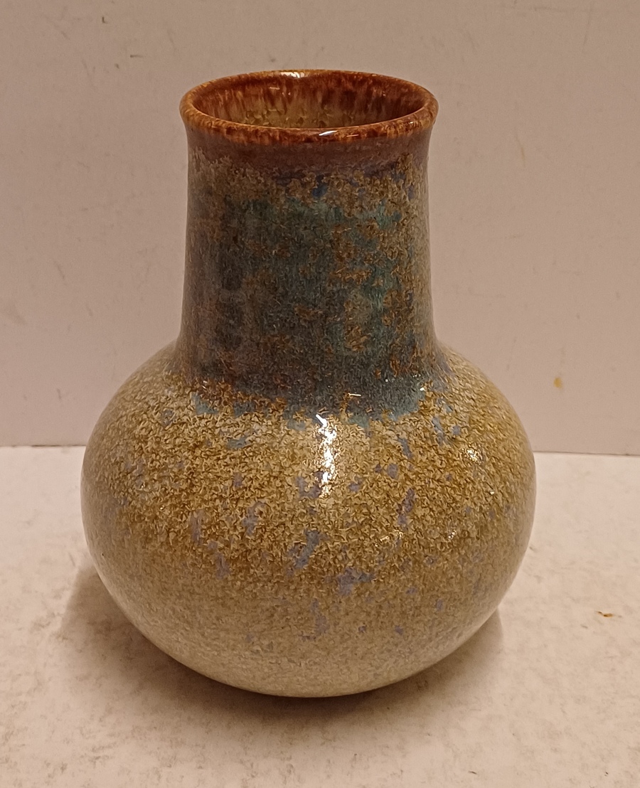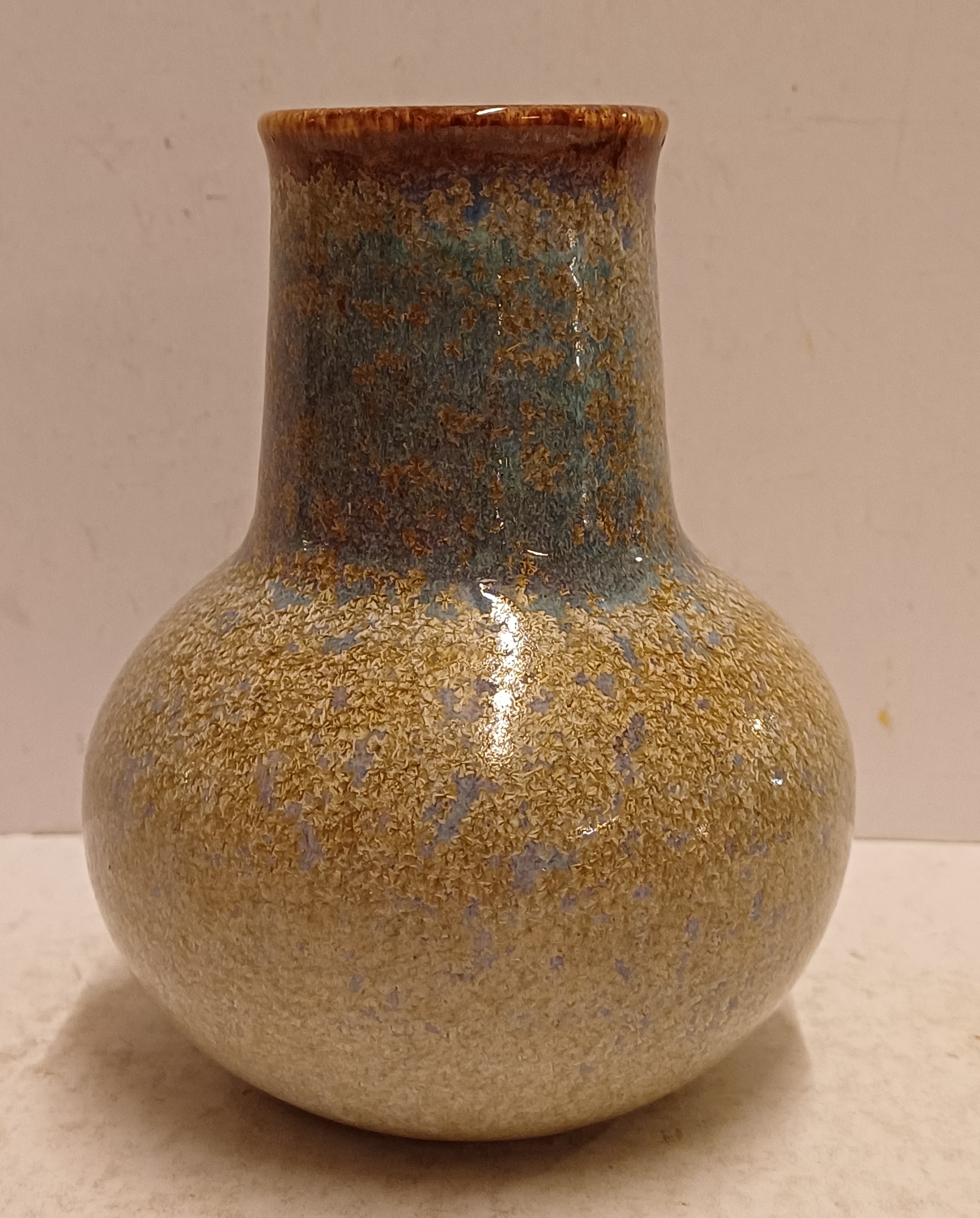 Aardewerken vaasje met gespikkelde glazuur. Onderzijde gesigneerd.